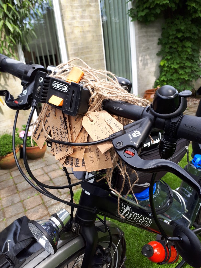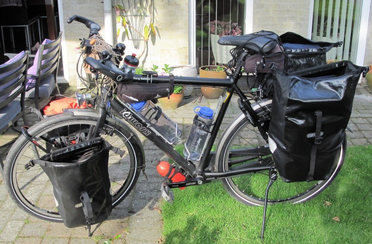 Ik ben nog druk bezig met het voorbereiden van mijn afscheidsfeestje dat Peet georganiseerd heeft in de Cultuurboerderij in Westelbeers. Mijn fiets wil ik daar bepakt en gezakt neerzetten. Alle bij elkaar vergaarde spullen moeten nu hun plaatsje krijgen in de beschikbare ruimtes van 2 Ortliebtassen voor, 2 achter plus nog een Rack Pack. En verder nog een stuurtas, een frametasje en een zadeltasje. Zelfs de indeling van de tassen heb ik met een paklijst zorgvuldig voorbereid.