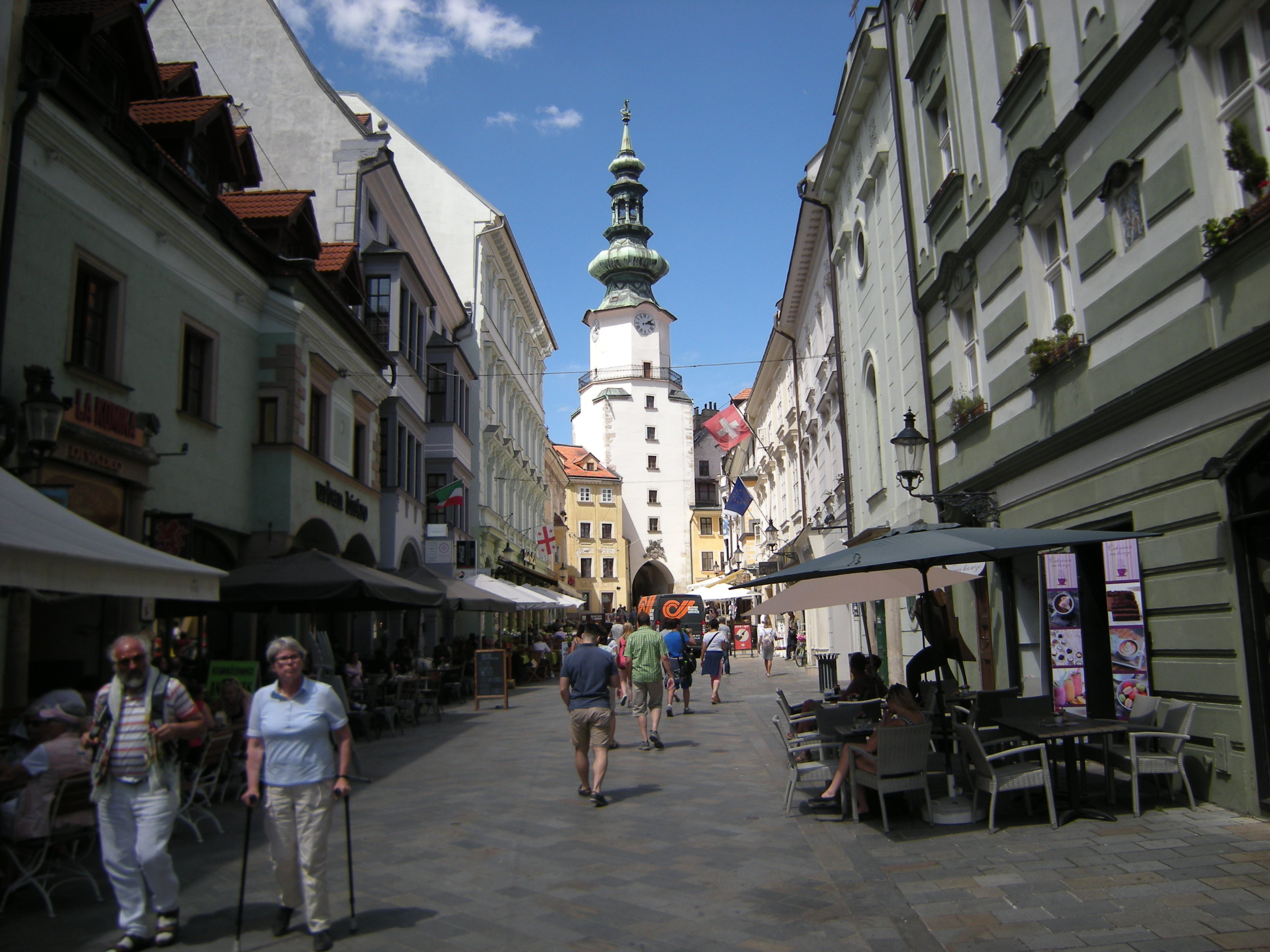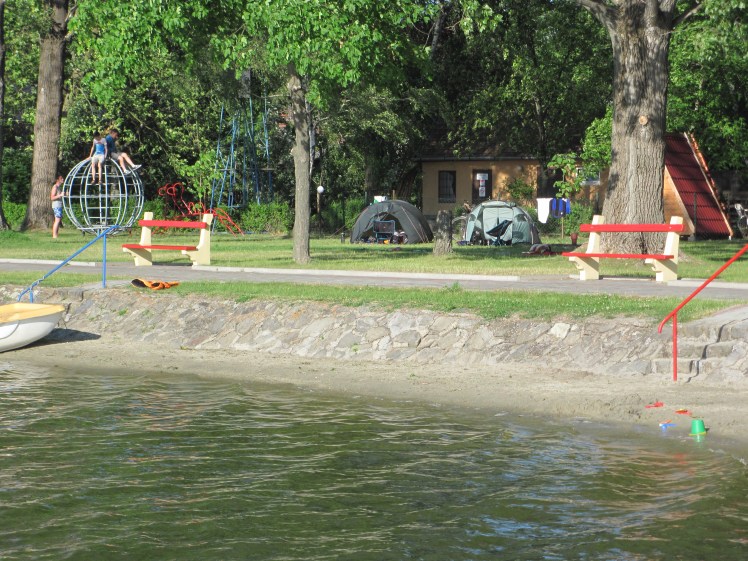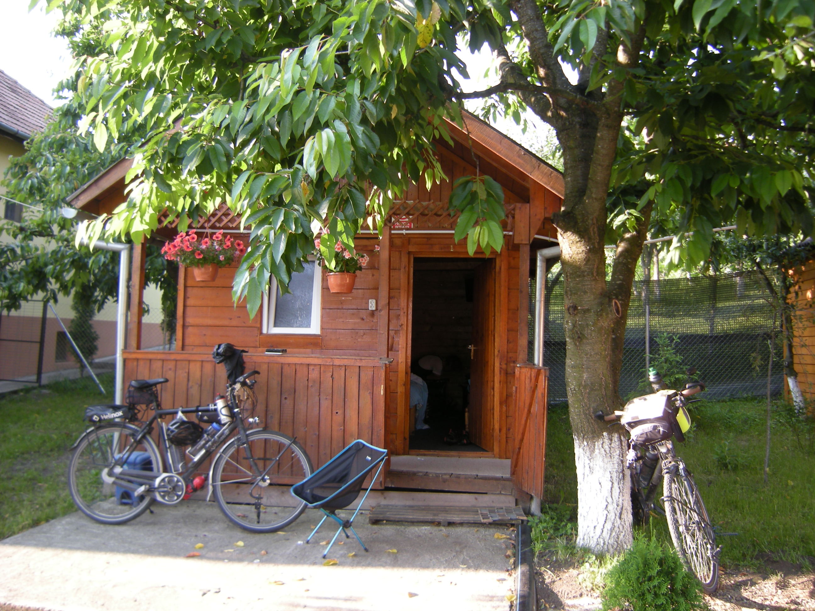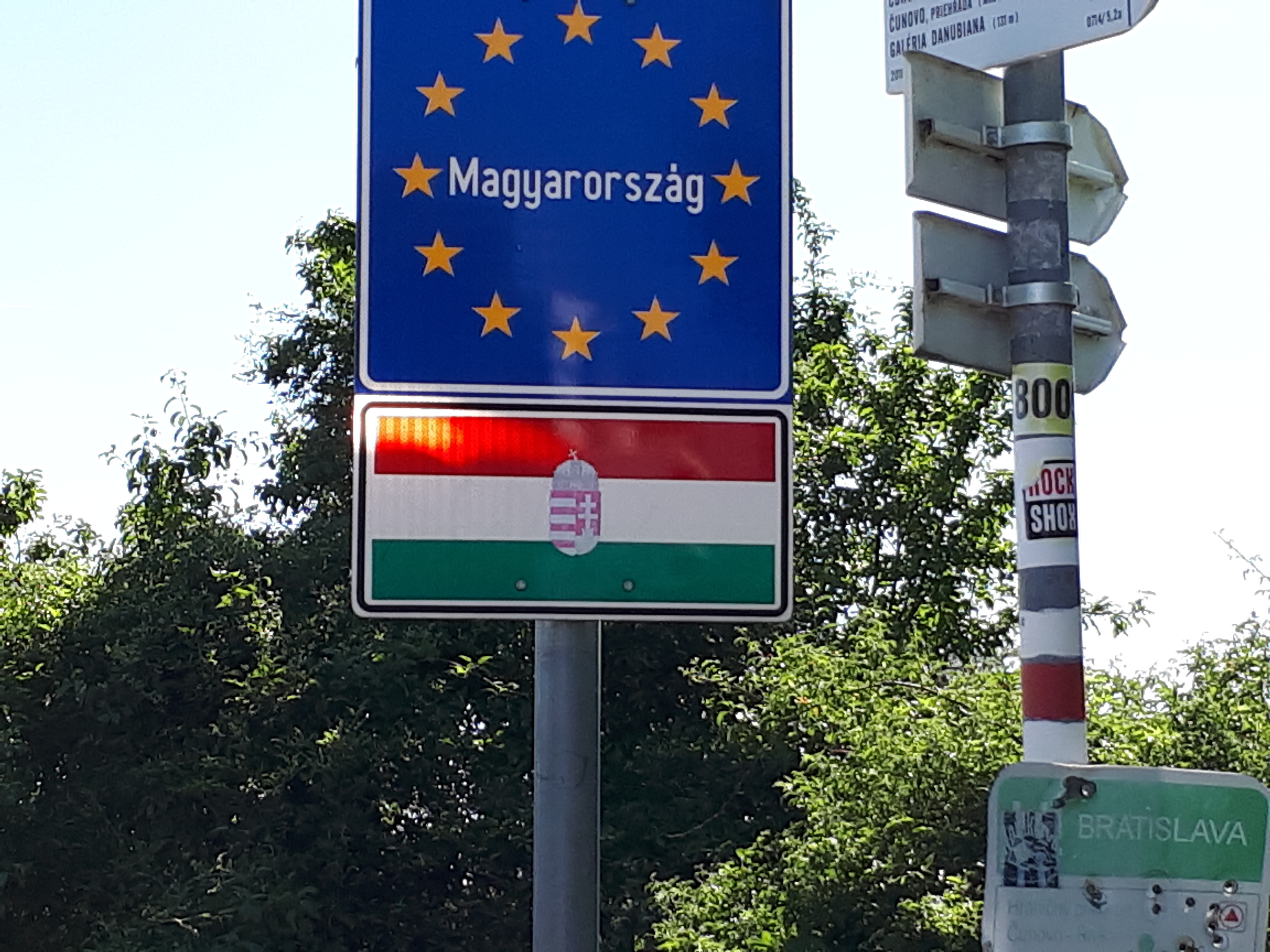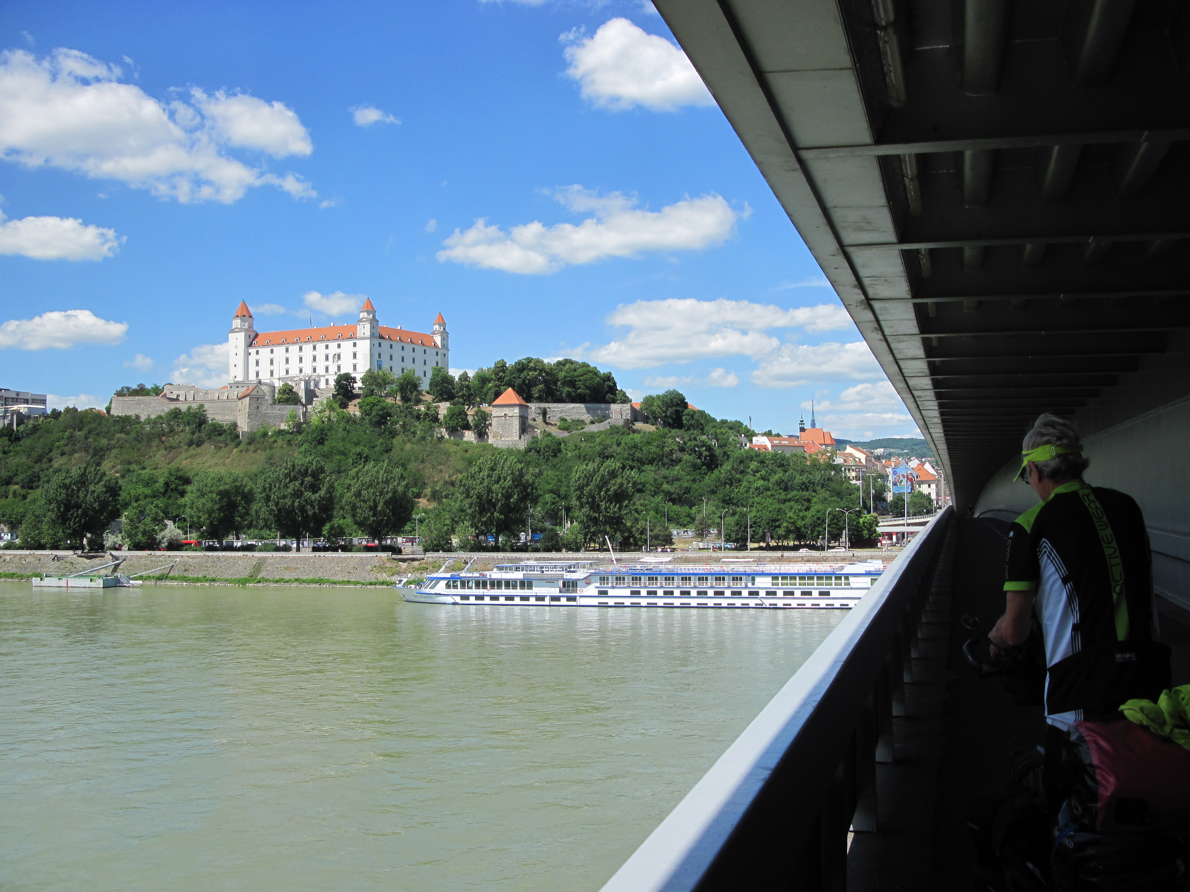 Hoewel er tussen de Weense verkeerspleinen toch wel veel verkeerslawaai geweest moet zijn heb ik toch wel weer aardig geslapen. Onze fietsroute blijkt dichterbij dan we dachten. Vanwege het mooie zomerse weer is het al vroeg druk op de naturistenstranden langs de Donau. Na een industriegebied vol met olievaten doorkruist te hebben komen we op een kilometerslange dijk te fietsen. Vorig jaar vonden we dit vanwege de hitte een heel zwaar traject, nu met de wind in de rug en zo’n 24 ° is het veel mooier en hebben we ook oog voor de best wel mooie natuur. Onze koffiepauze is er pas na zo’n 36 km. We beginnen Slowakije te naderen. Bratislava zien we al van verre liggen. Over de brug gaan we aan de verkeerde kant van de weg de stad in. Met de fiets aan de hand maken we er een wandelingetje doorheen. Mooi stadje, waar we in een parkje onze lunch opeten. Slowakije is voor ons maar 10 km lang. Daarna zijn we al in Hongarije. In het eerste dorpje Rajka kopen we bij de kruidenier ons avondeten in. Het aanbod is er niet uitgebreid maar het lukt toch wel om een aanvaardbaar menu samen te stellen. Het wordt macaroni met hamburgers uit blik en daarbij wat gemengde groenten. Als we op de camping gaan koken blijken er geen hamburgers in het blik te zitten, maar hamburgercrème. Wat je daarmee moet is voor ons niet duidelijk. Gelukkig hebben we toch voldoende gegeten als we de macaroni en de groenten weggewerkt hebben. Op de camping, ook weer dezelfde als die van vorig jaar, is het een drukte van belang vanwege een schoolkamp. De kinderen worden tot na elven goed bezig gehouden door de juffen. Wij liggen er dan al in. Gelukkig zijn de kinderen ook moe en is de hele camping weldra in diepe rust.