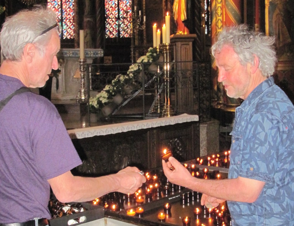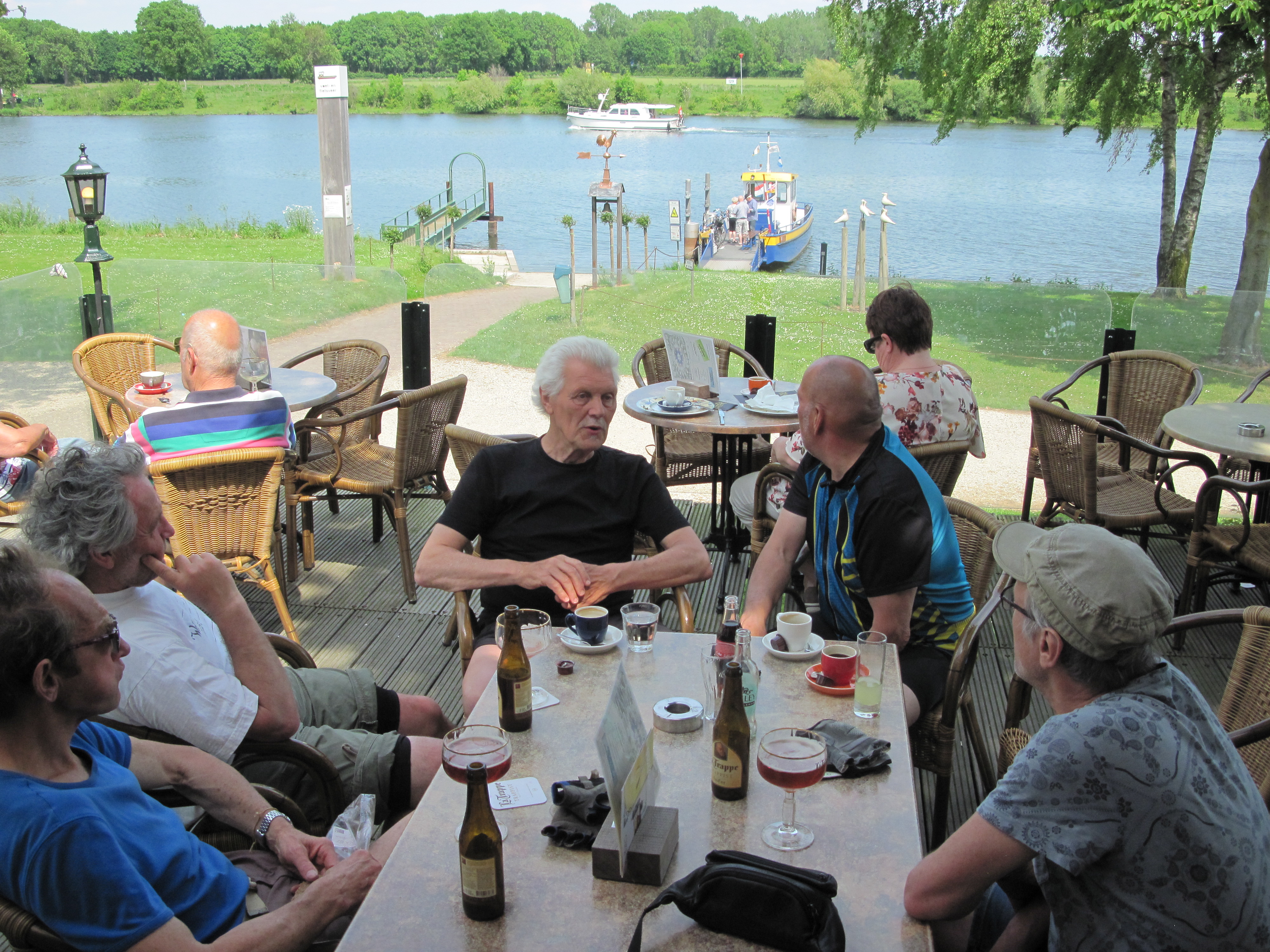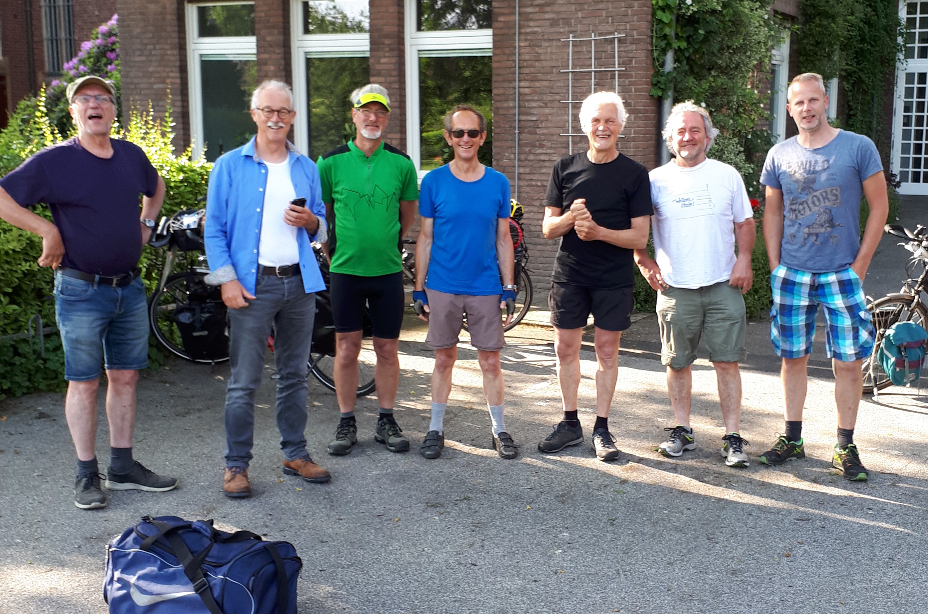 De grote dag van mijn vertrek is aangebroken. Zoon Faas moet gaan werken dus sta ik om half 8 op zodat we nog afscheid van elkaar kunnen nemen. Daarna is het haasten want de Broeders van de Heeren van Liefde komen om half negen en ik moet nog eten, een lunchpakketje maken en nog vlug ’n keer douchen nu het nog kan. De eerste Broeders zijn er al als ik nog onder de douche sta. Het huis loopt in rap tempo vol met familie, vrienden en buren. De spanning loopt op. Nog even een laatste kopje koffie. Van Broeder Matsonius krijg ik in een rood fluwelen zakje zijn bijzondere Franciscus kruisje mee. Peet stopt me ter bescherming een hangertje van mijn moeder toe. En dan … dan is het zover! Nog een laatste knuffel met dochters Sanne en Reinou en een innig afscheid van Peet en dan fiets ik met de Heeren de Margrietstraat in. “Tot oktober als het blad eraf is” roep ik nog naar de uitzwaaiers op de inrit. Het is 09.00 uur mijn droomreis is begonnen.”China here I come!” Langs het Wilhelminakanaal fietsen we via Best,Son & Breugel naar Lieshout waar we voor een koffiepauze aanleggen bij het Dorpshuis. In Gemert leggen we bij zwager Doi, iets later dan afgesproken, aanvoor de tweede koffiepauze. Zwagerin Mariet komt wat later nog net op tijd om ons daar uit te zwaaien. D’n Doi rijdt met ons mee naar Kevelaer en zal daarna weer terugfietsen. Het is prachtig fietsweer en het schiet goed op. Door Venray heen komen we bij het pontje van Blitterswijk waar we op het terras van Tante Jet nog wat drinken. Het is dan nog maar 15 km naar Kevelaer. Om goed 16.00 uur melden we ons bij de receptie van Das Priesterhaus. De kamerindeling is al gemaakt en ik kom bij Broeder Matsonius op de kamer te liggen. Als we daarna een plekje gaan zoeken voor onze fietsen blijkt dat Wytze en Ewoud er ook al zijn. Ze hebben zich nog niet bij de receptie gemeld maar zitten op de trappen van de basiliek op ons te wachten en hebben vanaf daar onze ongetwijfeld‘rumoerige’ aankomst gadegeslagen. Na het inkwartieren en het douchen is het tijd om Kevelaer ’n beetje te bekijken en een eettentje te gaan zoeken. Als oprechte Heeren van Liefde beginnen we met een bezoek aan de basiliek met haar opvallende kleurige behang en begeven we ons naar de kaarsenbak. We branden ’n kaarsje op de goede afloop van de velodroom en staan daarbij ook even stil bijhet droevige feit dat de moeder van Broeder Gerardus, in haar laatste levensfase is aangeland. Broeder Carpentarius die vanwege een liesbreuk niet kan fietsen sluit zich bij ons aan. Omdat we zowel dorstig als hongerig zijn zoeken we voor de warme hap ein Biergarten op waar de meeste Broeders de Erdingers, al dan niet gecombineerd met wat grappa’s, goed laten smaken. Op de kamer met Broeder Matsonius wordt niet lang meer nagebuurt. Het bier heeft zijn werk gedaan. Morgen gaan er 2 verder en 6 terug.
