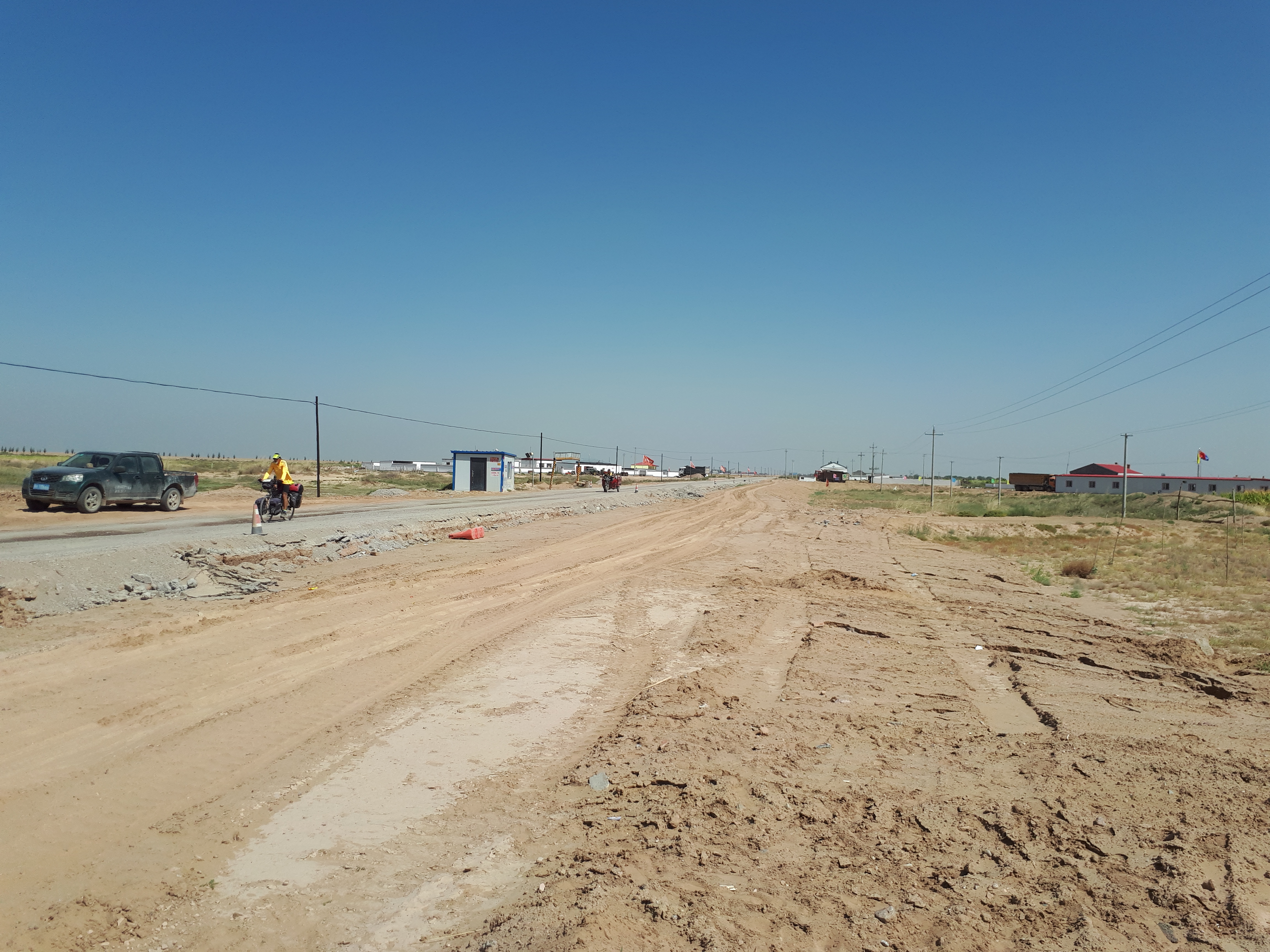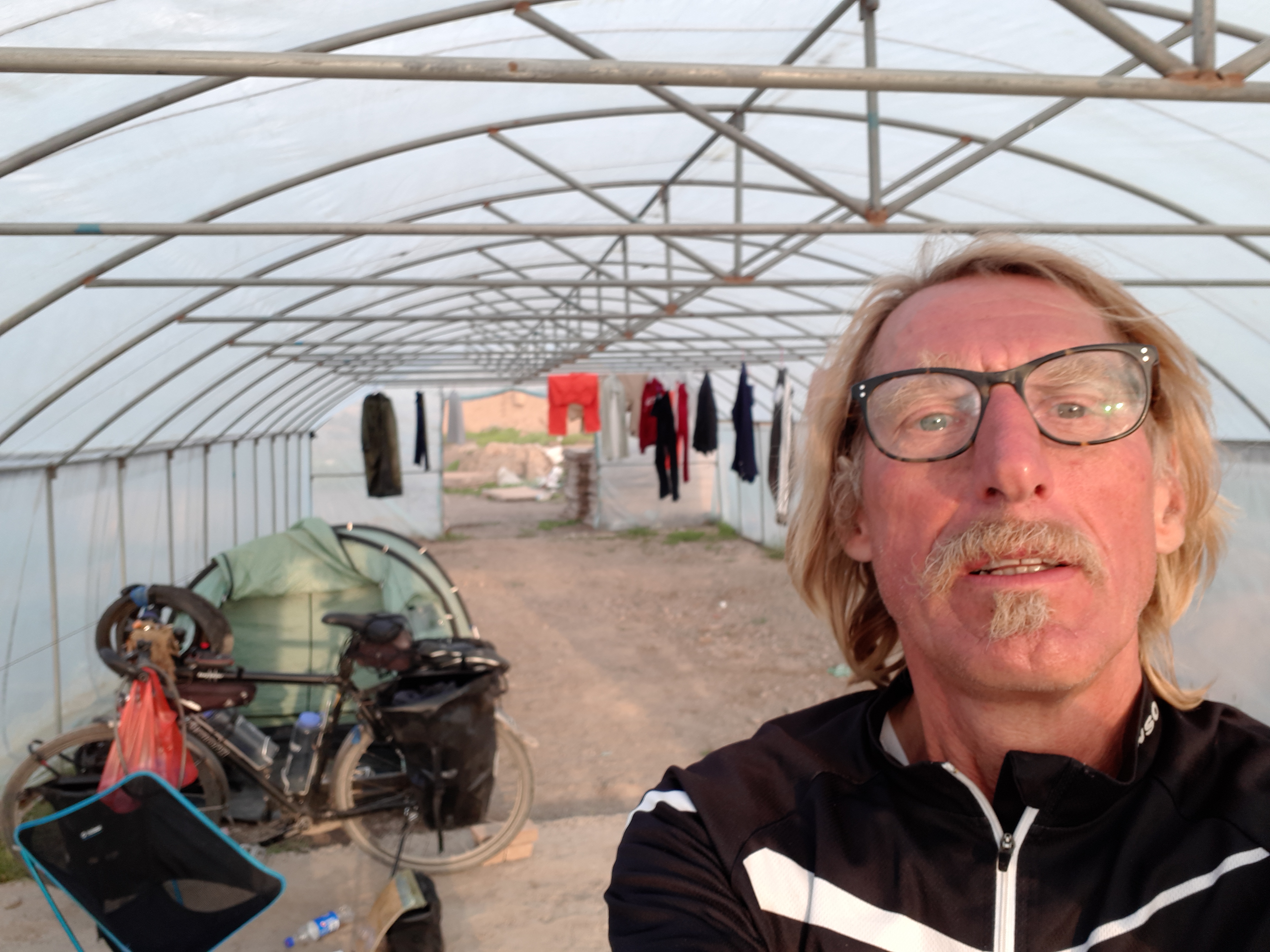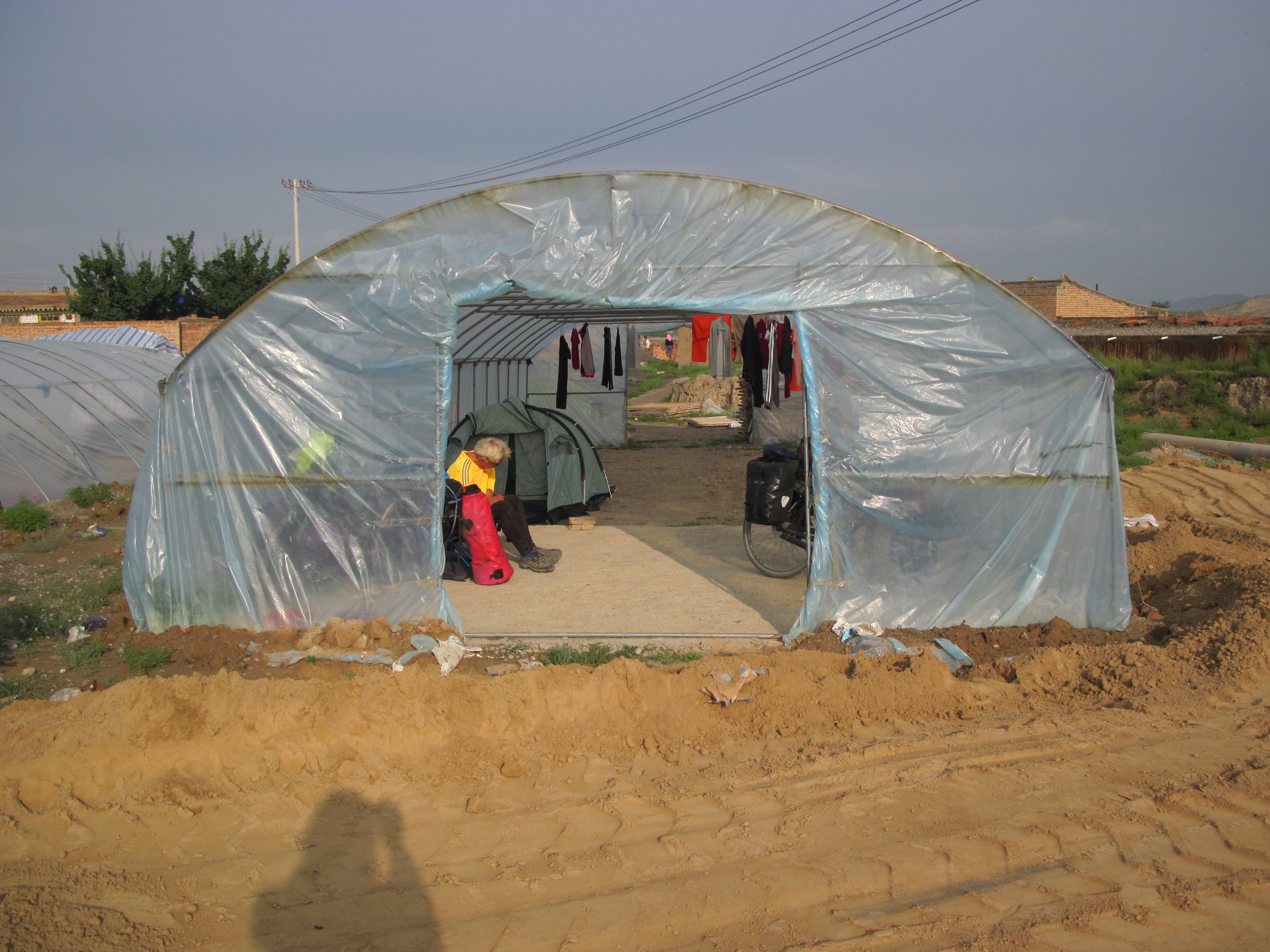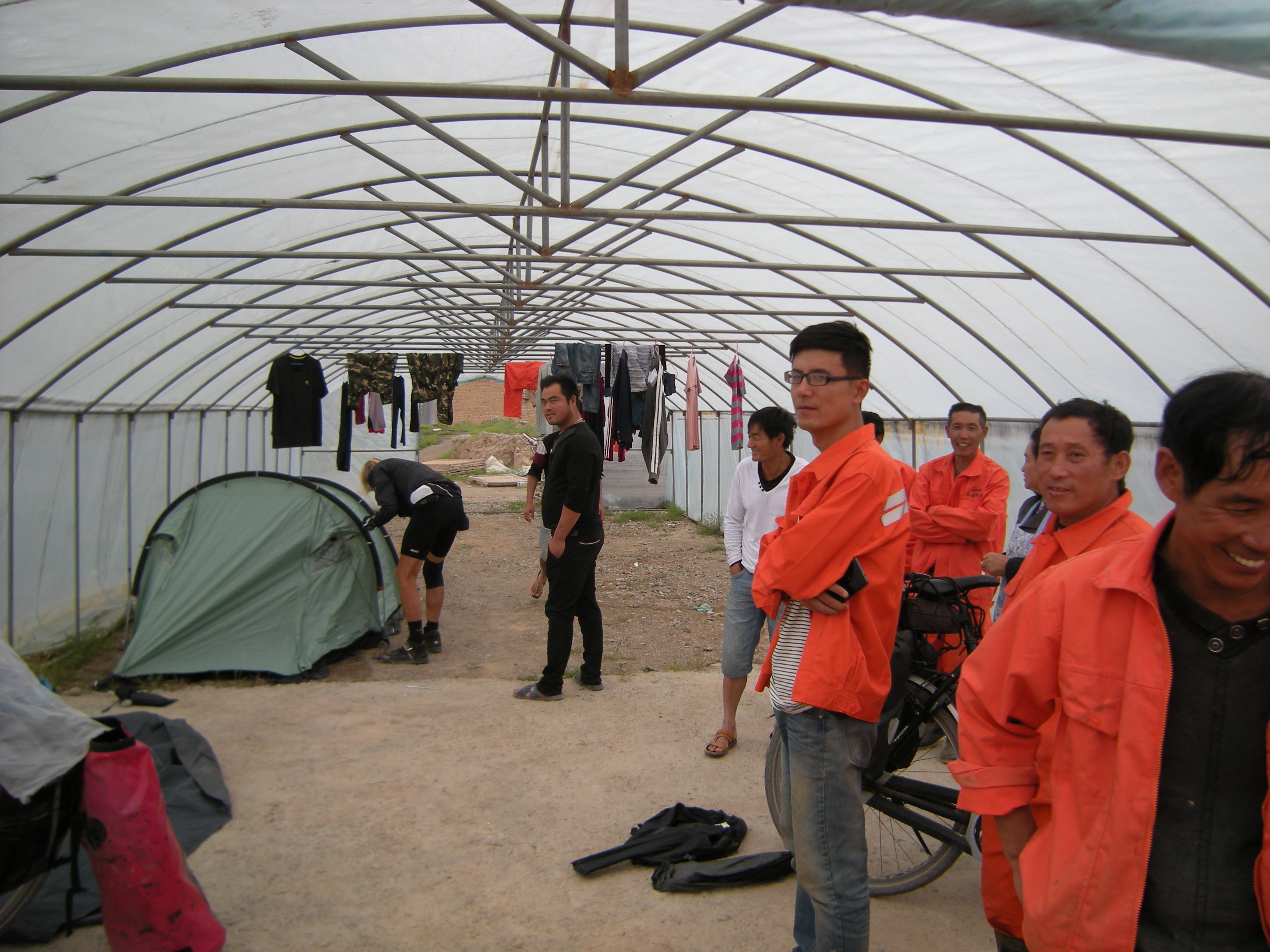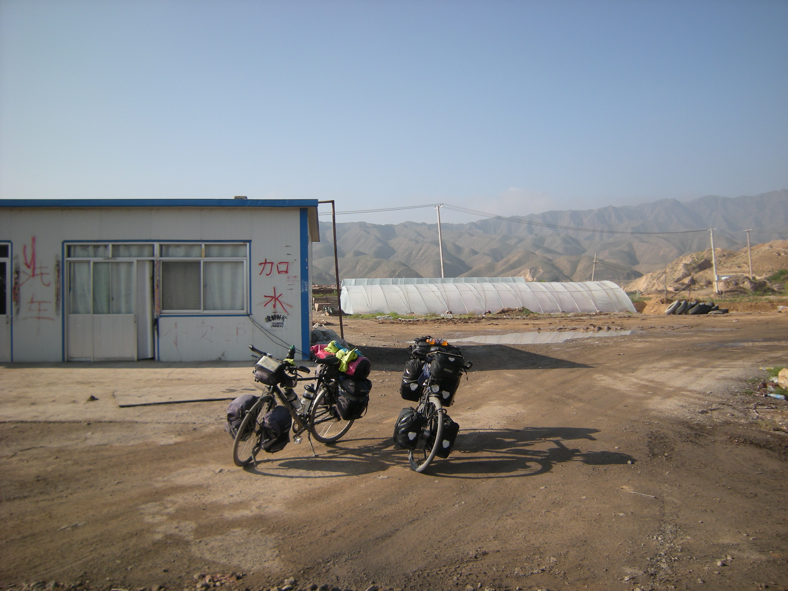 Hoewel ik wakker word met nog steeds hoofd- en keelpijn heb ik toch wel redelijk geslapen en voel ik me toch weer wat uitgerust. Wytze begint nu ook al te klagen dat hij zich niet lekker voelt. Met opnieuw wat paracetamol in het lijf gaan we toch maar op pad. We hebben voor vanavond nog geen onderdak geboekt dus we zien wel waar we uit gaan komen. Weg 109 hebben we vrij snel weer gevonden en daarna ook een winkeltje waar we weer ’n paar koekbroden kopen en die daar onder grote belangstelling opeten. Het weer is wat somber maar het blijft droog. Ook geen blubber vandaag maar wel stof!! Verschrikkelijk veel stof. Eerst fietsen we nog door een bergachtige omgeving maar daarna wordt het vlak en wordt het toch geen bijzonder mooie etappe. De vraag waar we kunnen overnachten wordt steeds nijpender. Als we een langgerekt dorp uitrijden vragen we of er een hotel is. Er moeten er wel 2 zijn dus moeten we terug. Als we het eerste hotel binnengaan kunnen we er niemand vinden. We kijken alvast wat rond. Wat een troep. Als we weer buiten zijn komen er wat mensen naar ons toe gelopen, die ons gelukkig snel duidelijk maken dat we er niet mogen blijven om te overnachten. Naar het tweede hotel zoeken we maar heel kort want het is ons snel duidelijk dat er in dit dorp geen hotel voor buitenlanders zal zijn. Ook in het volgende dorp kunnen we niet terecht. Wytze wil doorfietsen tot het donker is en dan ergens in een hut of schuur overnachten. Dat zie ik niet zo zitten. Ik wil liever proberen om bij mensen in de tuin te kamperen en denk dat we daarvoor al wel een mogelijkheid gepasseerd zijn. Wytze wil echter niet meer terug en dus fietsen we maar weer verder. We komen onverwacht toch nog bij een winkeltje waar we nog wat te eten en te drinken kopen. Ik grijp mijn kans en vraag aan de man of we onze tent bij de winkel op mogen zetten. Hij twijfelt even maar overlegt dan toch met zijn vrouw. We mogen meekomen en hij wijst ons een plek aan bij een bouwput achter het winkeltje waar ze bezig zijn met het aanleggen van een nieuwe weg. Maar we mogen ook slapen in een plastic bogentent waar wat was te drogen hangt. Nou dan kiezen we toch voor de bogentent. Ik zet er mijn tentje in op maar Wytze blijft bij zijn verlangen om zonder tent te slapen en rolt alleen zijn grondzeil en zijn slaapzak uit. Er staan nog 2 bogententen meer. 1 wordt gebruikt om gojibessen te drogen, in de andere slapen de wegwerkers. De wegwerkers zijn heel benieuwd naar hun nieuwe buren en komen natuurlijk de hele avond naar ons kijken en selfie’s maken. Ze komen zelfs heel attent een emmer water brengen zodat we ons wat kunnen wassen. Er is geen wifi dus hebben geen contact met het thuisfront. Na het eten van onze warme noedels is het vrij snel donker en dus tijd om te gaan slapen. Ben benieuwd wie er morgen het beste geslapen heeft.
