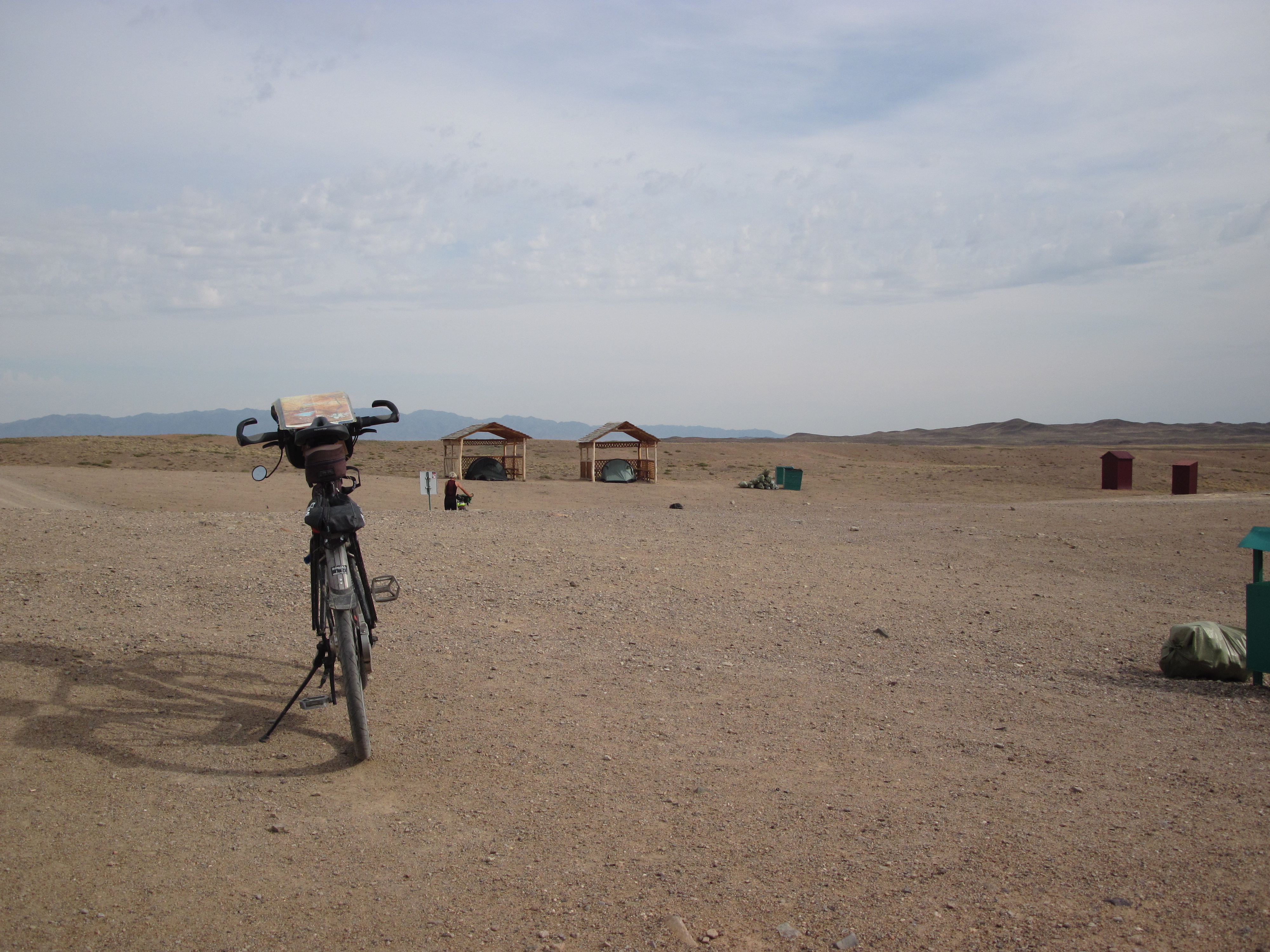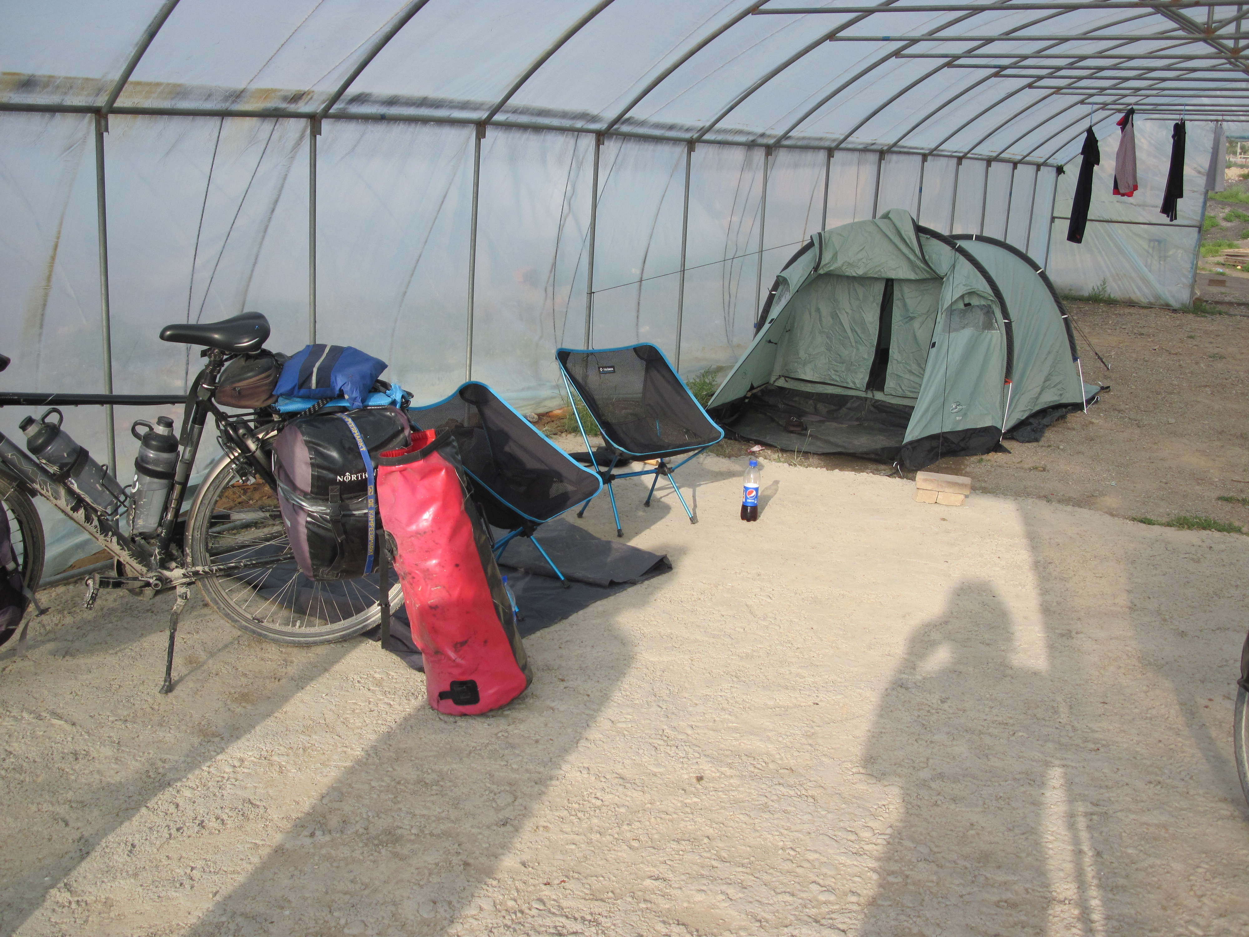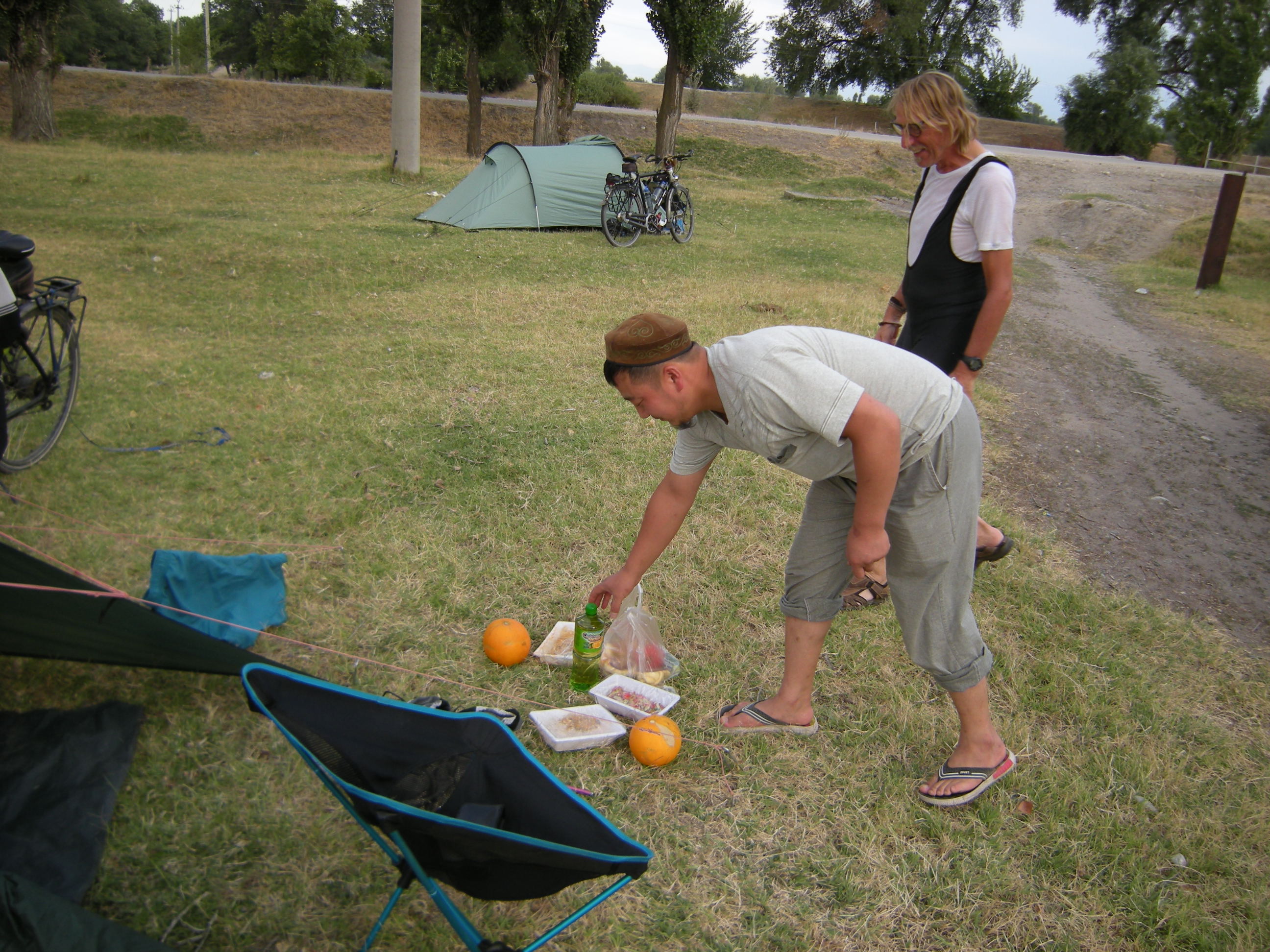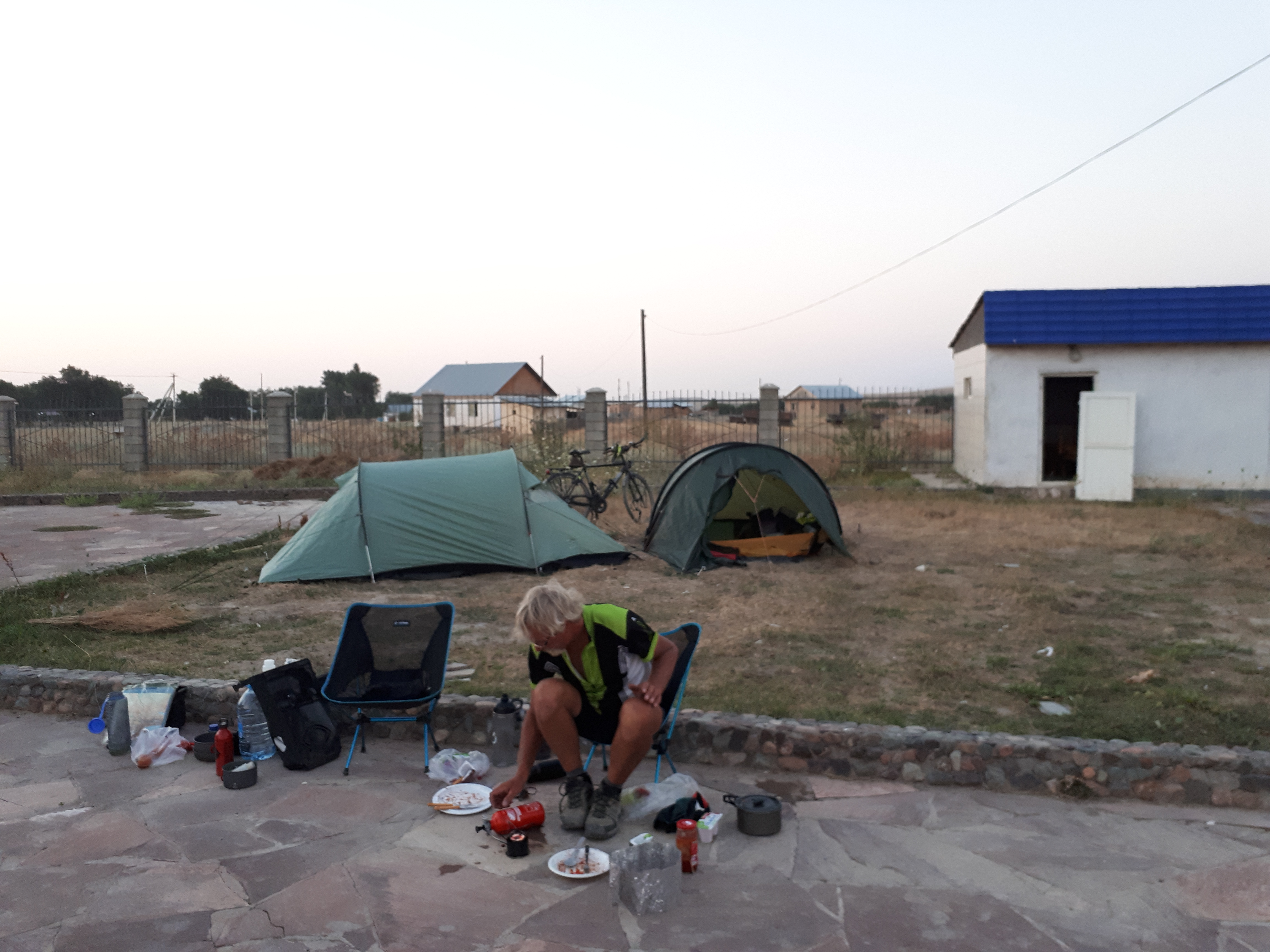 Hoewel ik wakker word met nog steeds hoofd- en keelpijn heb ik toch wel redelijk geslapen en voel ik me toch weer wat uitgerust. Wytze begint nu ook al te klagen dat hij zich niet lekker voelt. Met opnieuw wat paracetamol in het lijf gaan we toch maar op pad. We hebben voor vanavond nog geen onderdak geboekt dus we zien wel waar we uit gaan komen. Weg 109 hebben we vrij snel weer gevonden en daarna ook een winkeltje waar we weer ’n paar koekbroden kopen en die daar onder grote belangstelling opeten. Het weer is wat somber maar het blijft droog. Ook geen blubber vandaag maar wel stof!! Verschrikkelijk veel stof. Eerst fietsen we nog door een bergachtige omgeving maar daarna wordt het vlak en wordt het toch geen bijzonder mooie etappe. De vraag waar we kunnen overnachten wordt steeds nijpender. Als we een langgerekt dorp uitrijden vragen we of er een hotel is. Er moeten er wel 2 zijn dus moeten we terug. Als we het eerste hotel binnengaan kunnen we er niemand vinden. We kijken alvast wat rond. Wat een troep. Als we weer buiten zijn komen er wat mensen naar ons toe gelopen, die ons gelukkig snel duidelijk maken dat we er niet mogen blijven om te overnachten. Naar het tweede hotel zoeken we maar heel kort want het is ons snel duidelijk dat er in dit dorp geen hotel voor buitenlanders zal zijn. Ook in het volgende dorp kunnen we niet terecht. Wytze wil doorfietsen tot het donker is en dan ergens in een hut of schuur overnachten. Dat zie ik niet zo zitten. Ik wil liever proberen om bij mensen in de tuin te kamperen en denk dat we daarvoor al wel een mogelijkheid gepasseerd zijn. Wytze wil echter niet meer terug en dus fietsen we maar weer verder. We komen onverwacht toch nog bij een winkeltje waar we nog wat te eten en te drinken kopen. Ik grijp mijn kans en vraag aan de man of we onze tent bij de winkel op mogen zetten. Hij twijfelt even maar overlegt dan toch met zijn vrouw. We mogen meekomen en hij wijst ons een plek aan bij een bouwput achter het winkeltje waar ze bezig zijn met het aanleggen van een nieuwe weg. Maar we mogen ook slapen in een plastic bogentent waar wat was te drogen hangt. Nou dan kiezen we toch voor de bogentent. Ik zet er mijn tentje in op maar Wytze blijft bij zijn verlangen om zonder tent te slapen en rolt alleen zijn grondzeil en zijn slaapzak uit. Er staan nog 2 bogententen meer. 1 wordt gebruikt om gojibessen te drogen, in de andere slapen de wegwerkers. De wegwerkers zijn heel benieuwd naar hun nieuwe buren en komen natuurlijk de hele avond naar ons kijken en selfie’s maken. Ze komen zelfs heel attent een emmer water brengen zodat we ons wat kunnen wassen. Er is geen wifi dus hebben geen contact met het thuisfront. Na het eten van onze warme noedels is het vrij snel donker en dus tijd om te gaan slapen. Ben benieuwd wie er morgen het beste geslapen heeft.