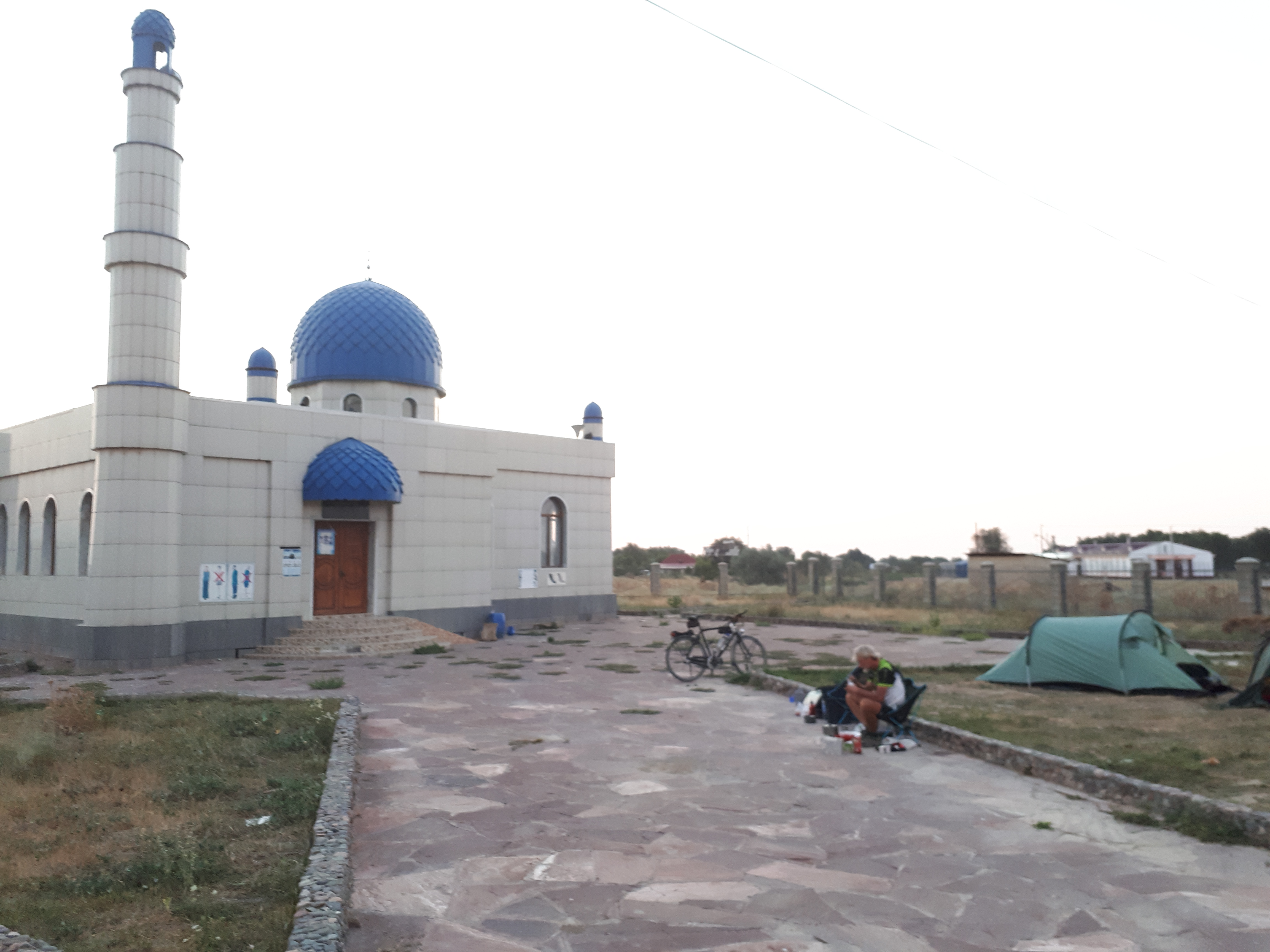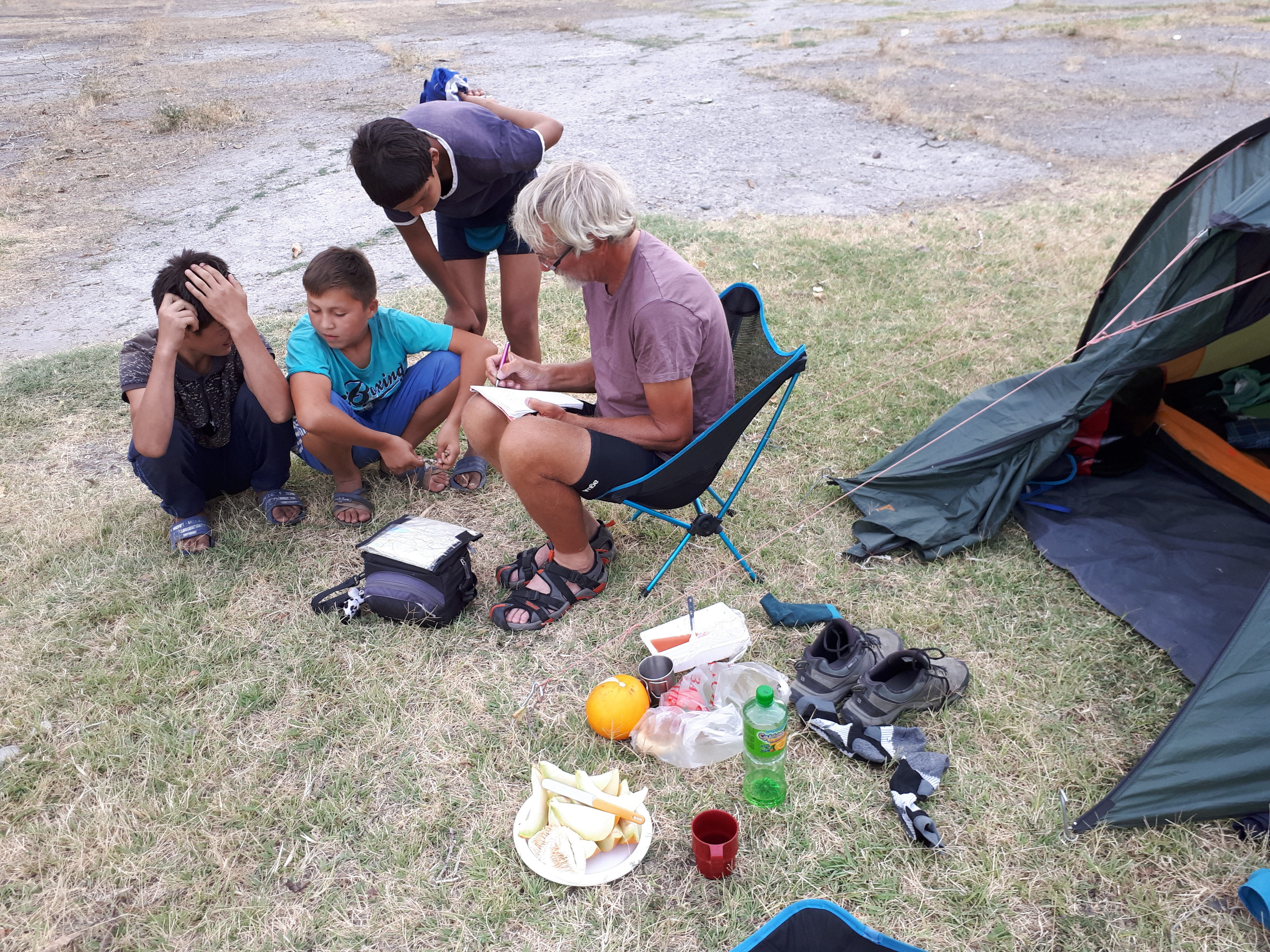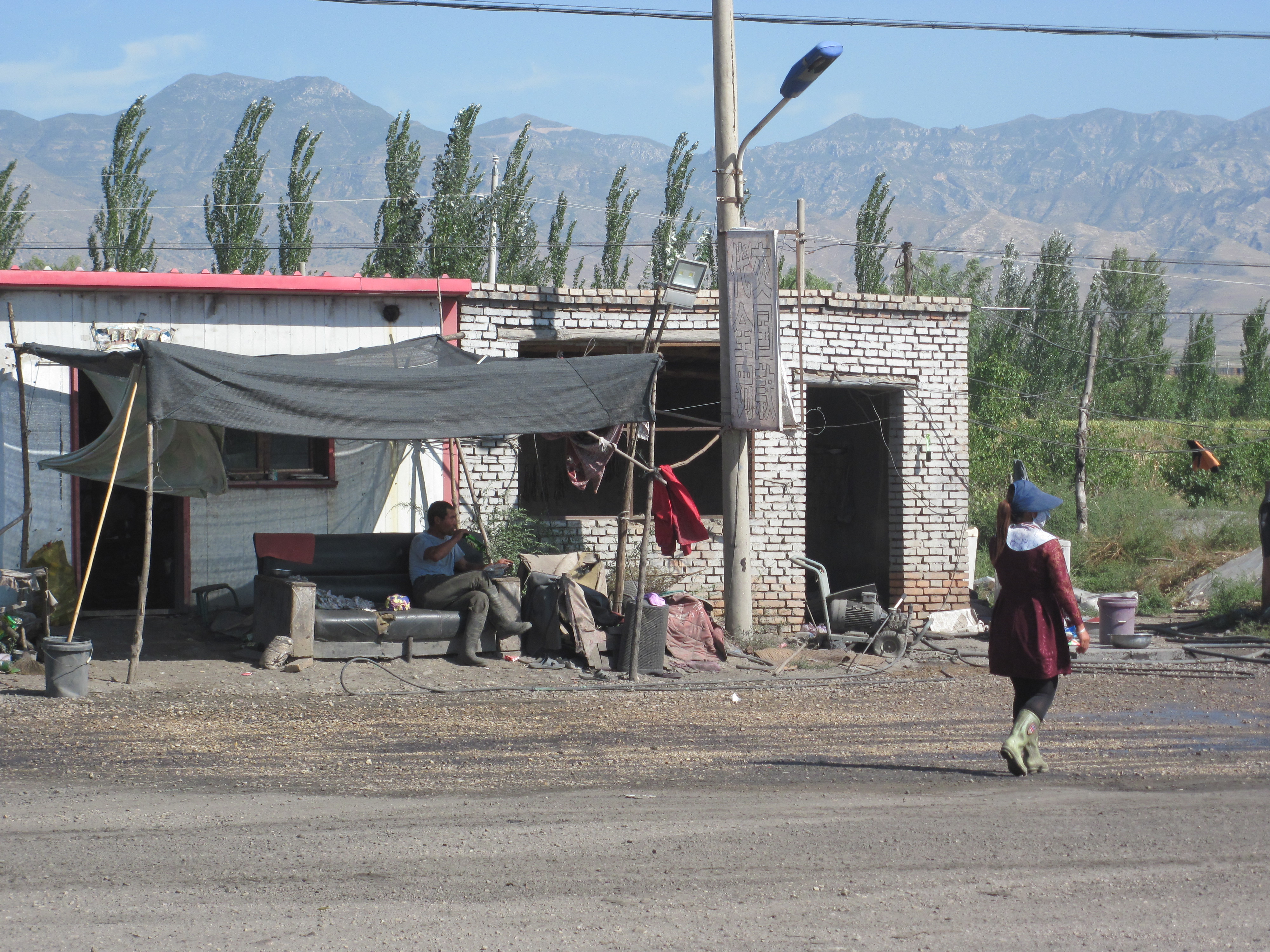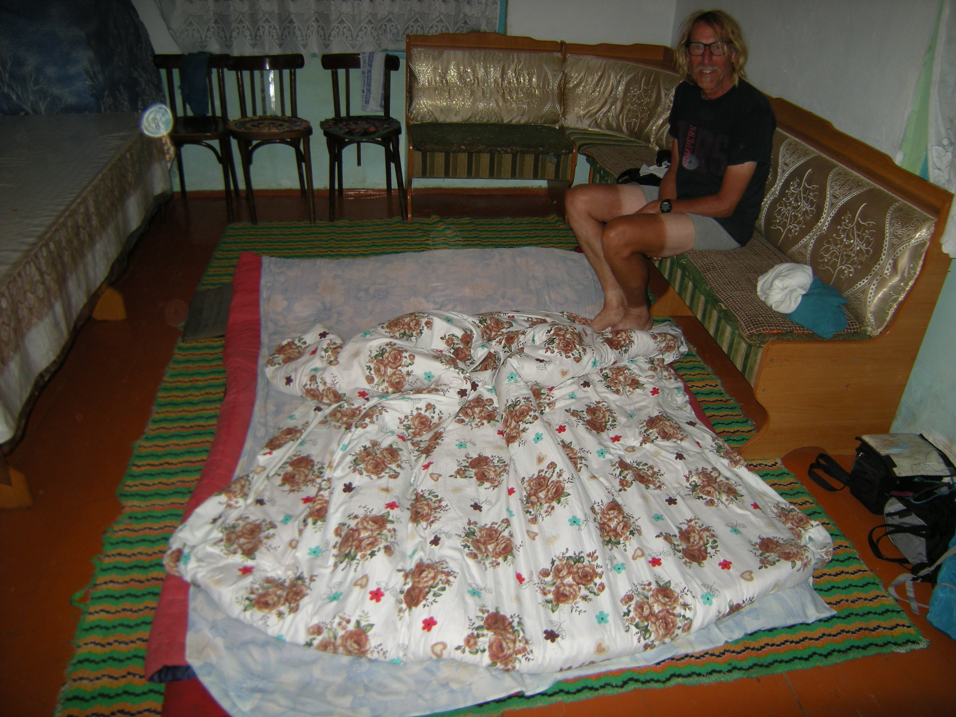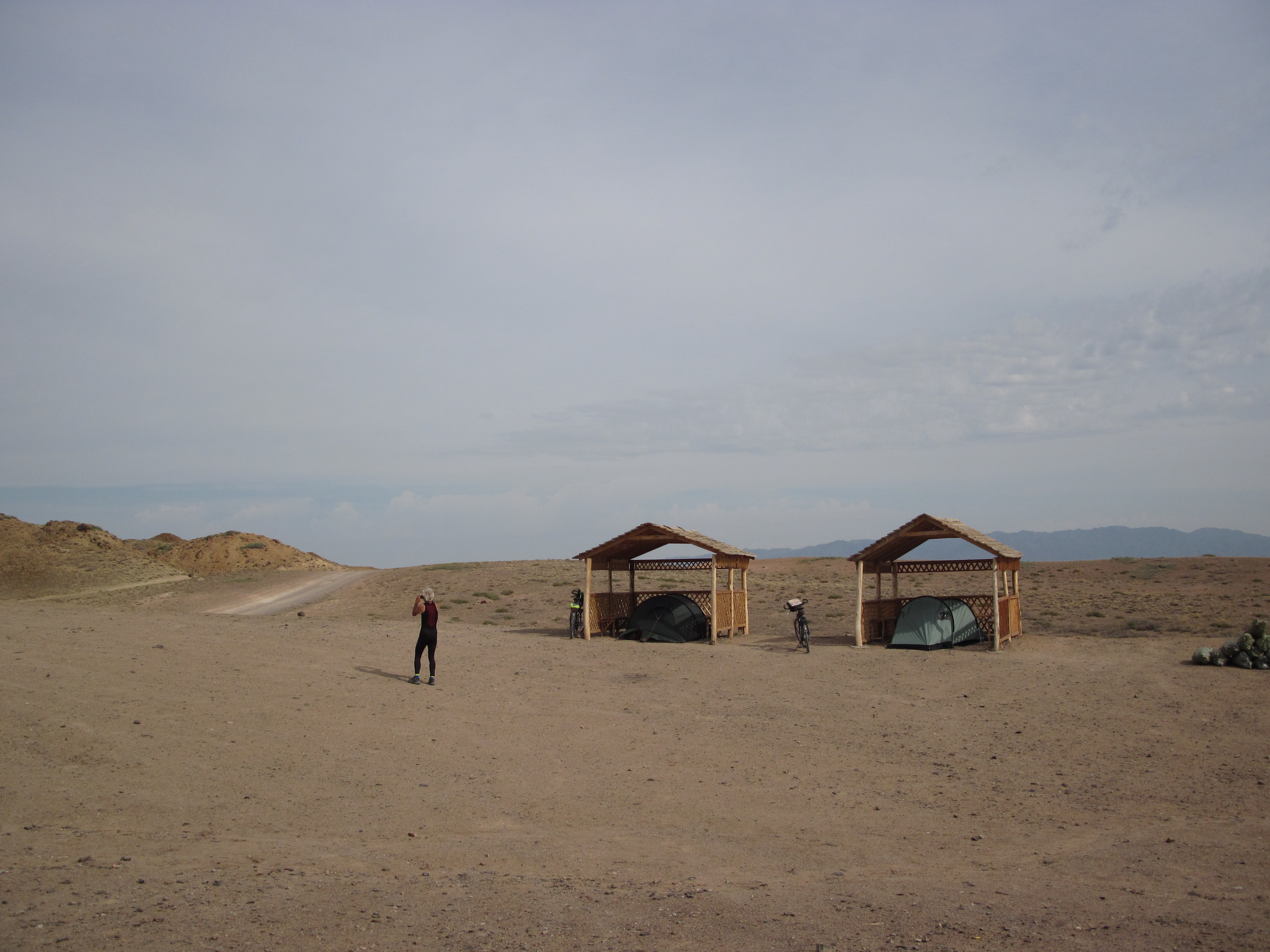 Hoewel ik wakker word met nog steeds hoofd- en keelpijn heb ik toch wel redelijk geslapen en voel ik me toch weer wat uitgerust. Wytze begint nu ook al te klagen dat hij zich niet lekker voelt. Met opnieuw wat paracetamol in het lijf gaan we toch maar op pad. We hebben voor vanavond nog geen onderdak geboekt dus we zien wel waar we uit gaan komen. Weg 109 hebben we vrij snel weer gevonden en daarna ook een winkeltje waar we weer ’n paar koekbroden kopen en die daar onder grote belangstelling opeten. Het weer is wat somber maar het blijft droog. Ook geen blubber vandaag maar wel stof!! Verschrikkelijk veel stof. Eerst fietsen we nog door een bergachtige omgeving maar daarna wordt het vlak en wordt het toch geen bijzonder mooie etappe. De vraag waar we kunnen overnachten wordt steeds nijpender. Als we een langgerekt dorp uitrijden vragen we of er een hotel is. Er moeten er wel 2 zijn dus moeten we terug. Als we het eerste hotel binnengaan kunnen we er niemand vinden. We kijken alvast wat rond. Wat een troep. Als we weer buiten zijn komen er wat mensen naar ons toe gelopen, die ons gelukkig snel duidelijk maken dat we er niet mogen blijven om te overnachten. Naar het tweede hotel zoeken we maar heel kort want het is ons snel duidelijk dat er in dit dorp geen hotel voor buitenlanders zal zijn. Ook in het volgende dorp kunnen we niet terecht. Wytze wil doorfietsen tot het donker is en dan ergens in een hut of schuur overnachten. Dat zie ik niet zo zitten. Ik wil liever proberen om bij mensen in de tuin te kamperen en denk dat we daarvoor al wel een mogelijkheid gepasseerd zijn. Wytze wil echter niet meer terug en dus fietsen we maar weer verder. We komen onverwacht toch nog bij een winkeltje waar we nog wat te eten en te drinken kopen. Ik grijp mijn kans en vraag aan de man of we onze tent bij de winkel op mogen zetten. Hij twijfelt even maar overlegt dan toch met zijn vrouw. We mogen meekomen en hij wijst ons een plek aan bij een bouwput achter het winkeltje waar ze bezig zijn met het aanleggen van een nieuwe weg. Maar we mogen ook slapen in een plastic bogentent waar wat was te drogen hangt. Nou dan kiezen we toch voor de bogentent. Ik zet er mijn tentje in op maar Wytze blijft bij zijn verlangen om zonder tent te slapen en rolt alleen zijn grondzeil en zijn slaapzak uit. Er staan nog 2 bogententen meer. 1 wordt gebruikt om gojibessen te drogen, in de andere slapen de wegwerkers. De wegwerkers zijn heel benieuwd naar hun nieuwe buren en komen natuurlijk de hele avond naar ons kijken en selfie’s maken. Ze komen zelfs heel attent een emmer water brengen zodat we ons wat kunnen wassen. Er is geen wifi dus hebben geen contact met het thuisfront. Na het eten van onze warme noedels is het vrij snel donker en dus tijd om te gaan slapen. Ben benieuwd wie er morgen het beste geslapen heeft.