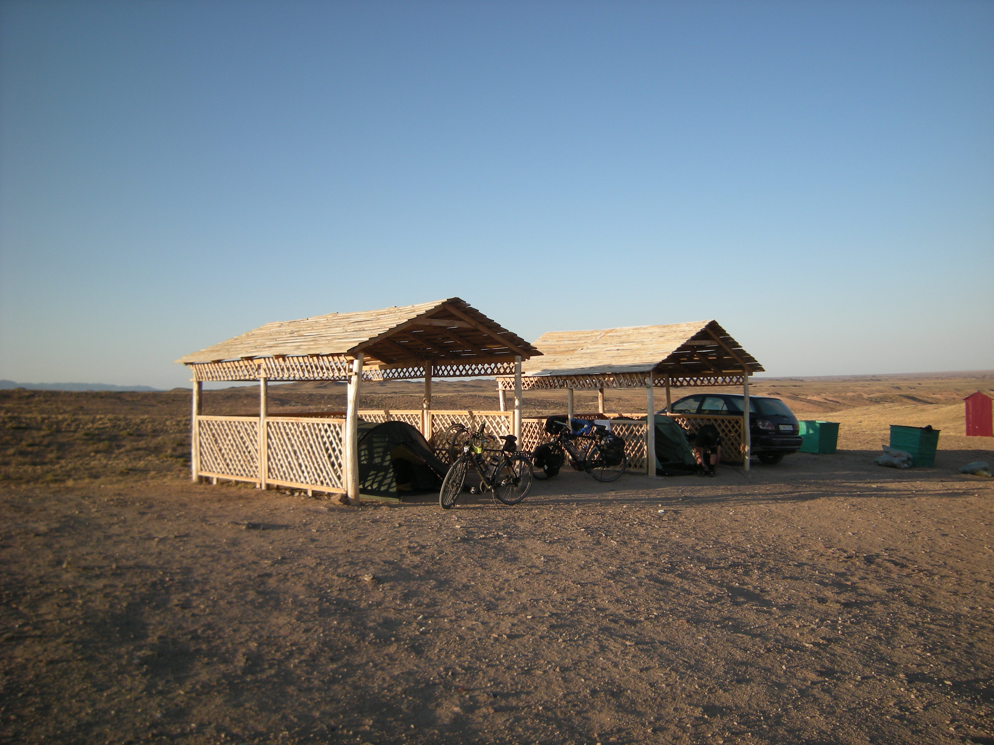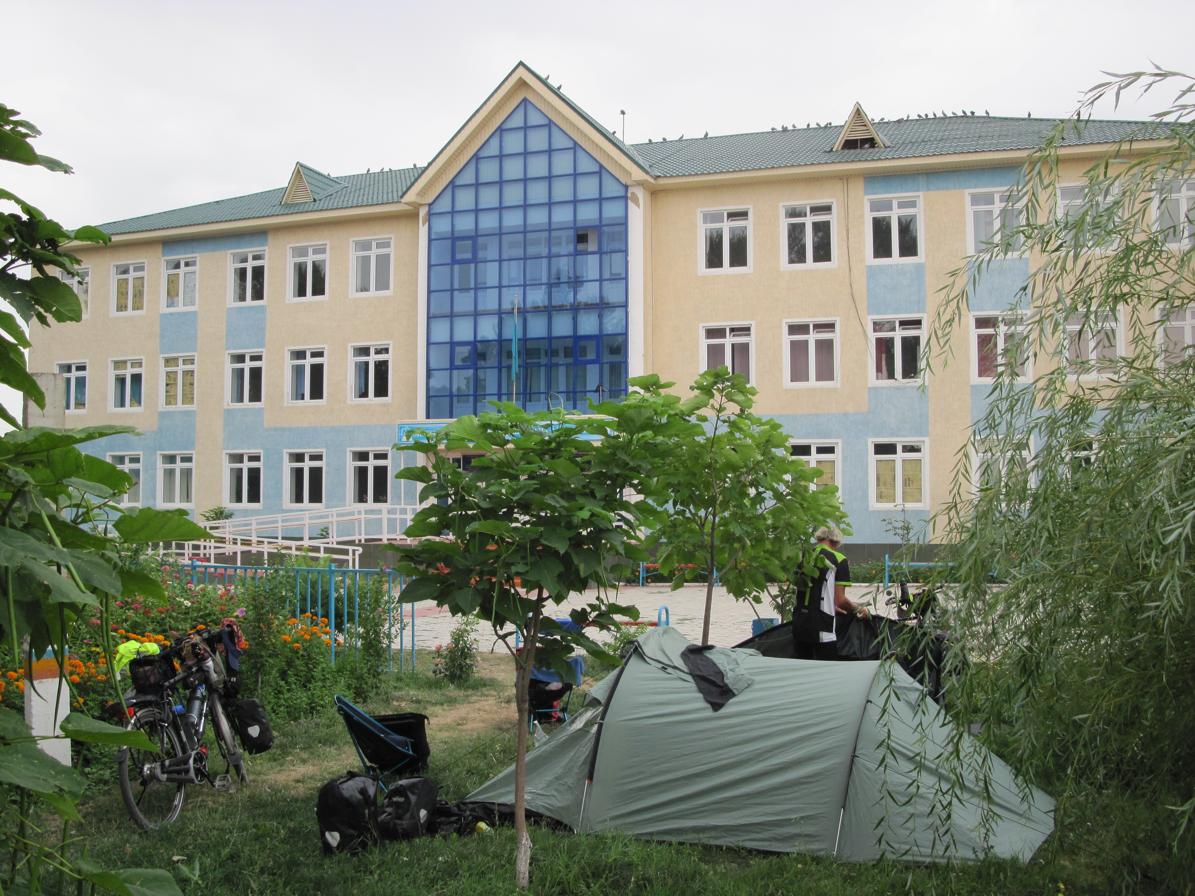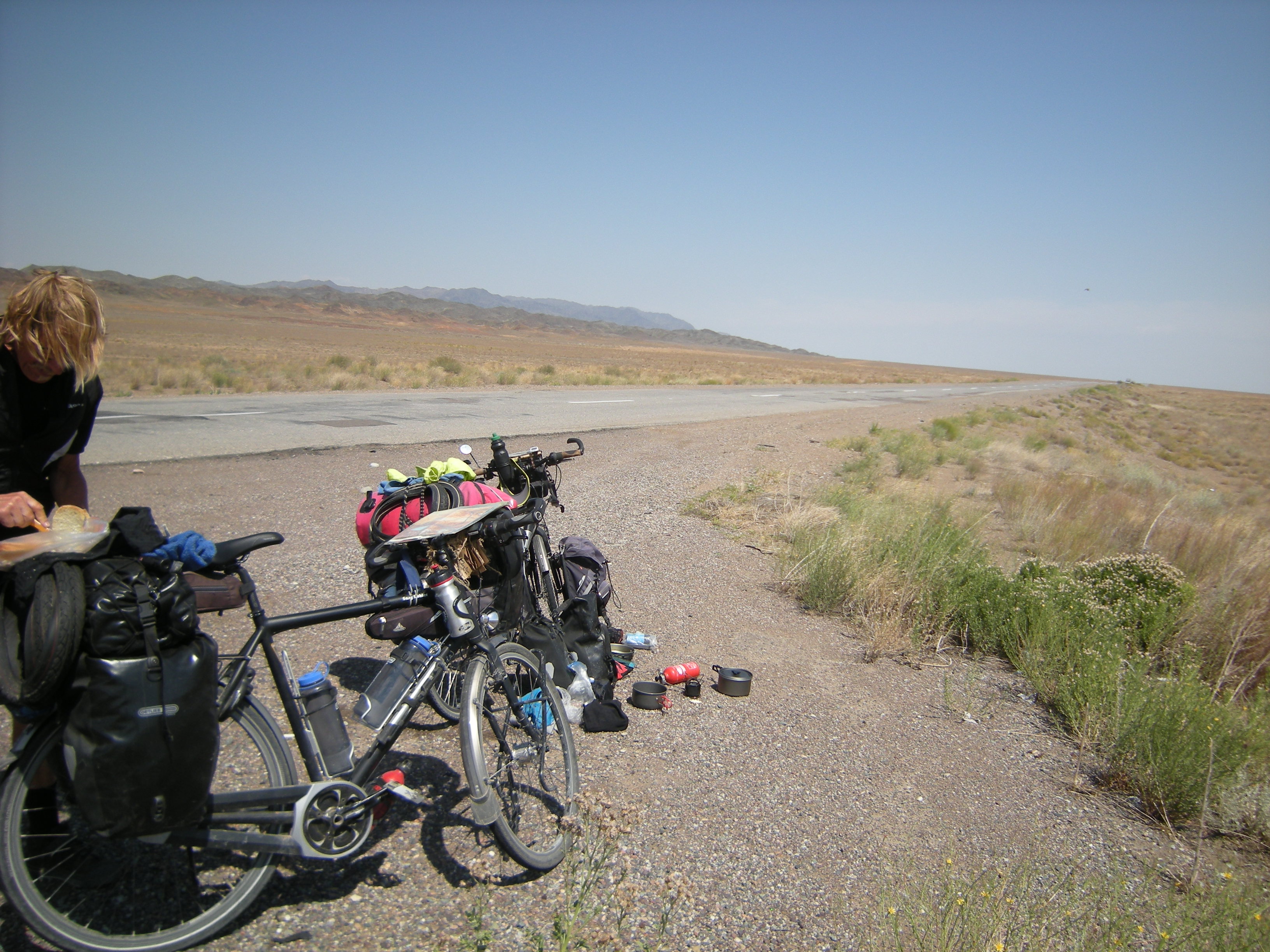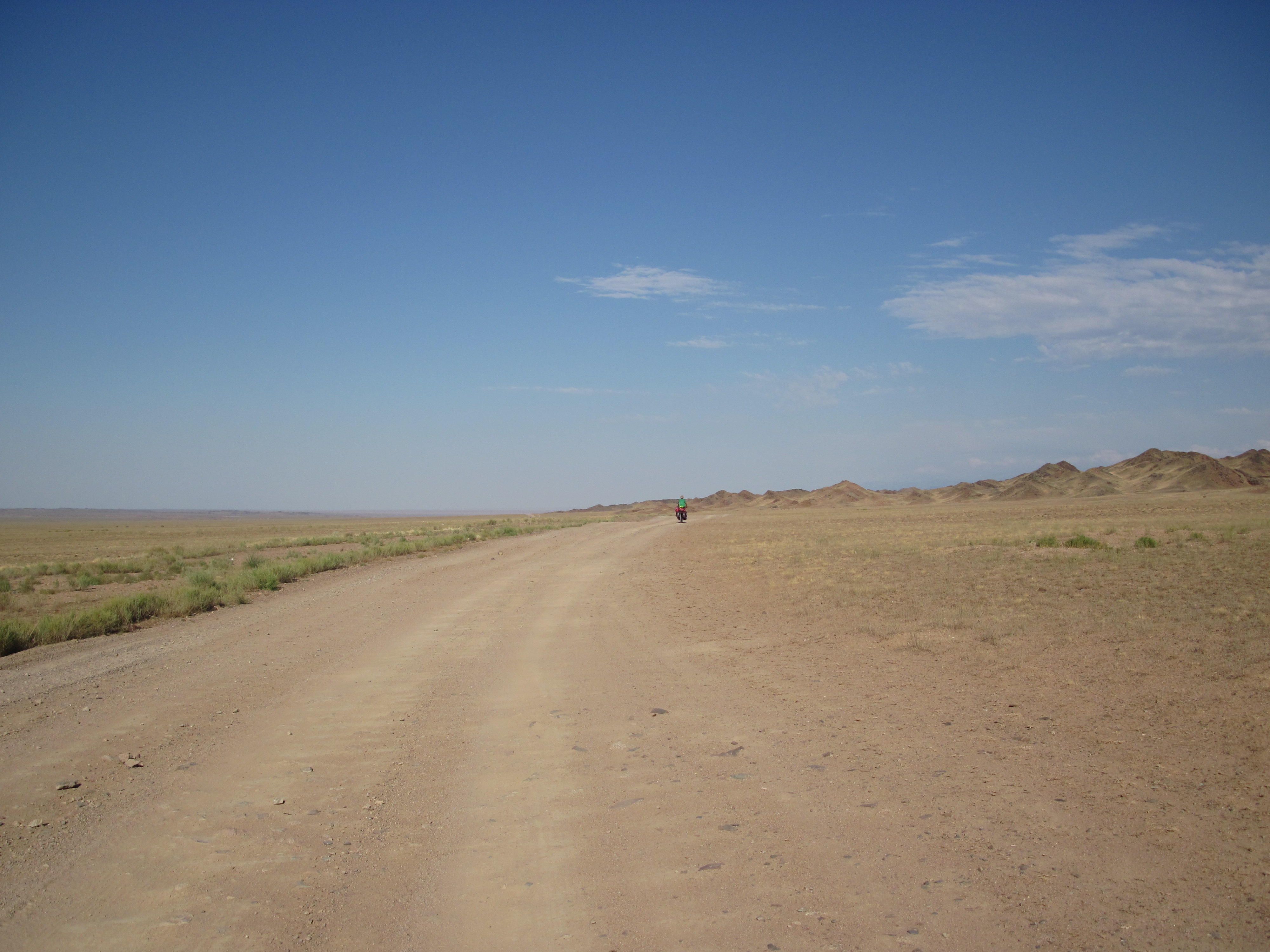 Hoewel ik wakker word met nog steeds hoofd- en keelpijn heb ik toch wel redelijk geslapen en voel ik me toch weer wat uitgerust. Wytze begint nu ook al te klagen dat hij zich niet lekker voelt. Met opnieuw wat paracetamol in het lijf gaan we toch maar op pad. We hebben voor vanavond nog geen onderdak geboekt dus we zien wel waar we uit gaan komen. Weg 109 hebben we vrij snel weer gevonden en daarna ook een winkeltje waar we weer ’n paar koekbroden kopen en die daar onder grote belangstelling opeten. Het weer is wat somber maar het blijft droog. Ook geen blubber vandaag maar wel stof!! Verschrikkelijk veel stof. Eerst fietsen we nog door een bergachtige omgeving maar daarna wordt het vlak en wordt het toch geen bijzonder mooie etappe. De vraag waar we kunnen overnachten wordt steeds nijpender. Als we een langgerekt dorp uitrijden vragen we of er een hotel is. Er moeten er wel 2 zijn dus moeten we terug. Als we het eerste hotel binnengaan kunnen we er niemand vinden. We kijken alvast wat rond. Wat een troep. Als we weer buiten zijn komen er wat mensen naar ons toe gelopen, die ons gelukkig snel duidelijk maken dat we er niet mogen blijven om te overnachten. Naar het tweede hotel zoeken we maar heel kort want het is ons snel duidelijk dat er in dit dorp geen hotel voor buitenlanders zal zijn. Ook in het volgende dorp kunnen we niet terecht. Wytze wil doorfietsen tot het donker is en dan ergens in een hut of schuur overnachten. Dat zie ik niet zo zitten. Ik wil liever proberen om bij mensen in de tuin te kamperen en denk dat we daarvoor al wel een mogelijkheid gepasseerd zijn. Wytze wil echter niet meer terug en dus fietsen we maar weer verder. We komen onverwacht toch nog bij een winkeltje waar we nog wat te eten en te drinken kopen. Ik grijp mijn kans en vraag aan de man of we onze tent bij de winkel op mogen zetten. Hij twijfelt even maar overlegt dan toch met zijn vrouw. We mogen meekomen en hij wijst ons een plek aan bij een bouwput achter het winkeltje waar ze bezig zijn met het aanleggen van een nieuwe weg. Maar we mogen ook slapen in een plastic bogentent waar wat was te drogen hangt. Nou dan kiezen we toch voor de bogentent. Ik zet er mijn tentje in op maar Wytze blijft bij zijn verlangen om zonder tent te slapen en rolt alleen zijn grondzeil en zijn slaapzak uit. Er staan nog 2 bogententen meer. 1 wordt gebruikt om gojibessen te drogen, in de andere slapen de wegwerkers. De wegwerkers zijn heel benieuwd naar hun nieuwe buren en komen natuurlijk de hele avond naar ons kijken en selfie’s maken. Ze komen zelfs heel attent een emmer water brengen zodat we ons wat kunnen wassen. Er is geen wifi dus hebben geen contact met het thuisfront. Na het eten van onze warme noedels is het vrij snel donker en dus tijd om te gaan slapen. Ben benieuwd wie er morgen het beste geslapen heeft.