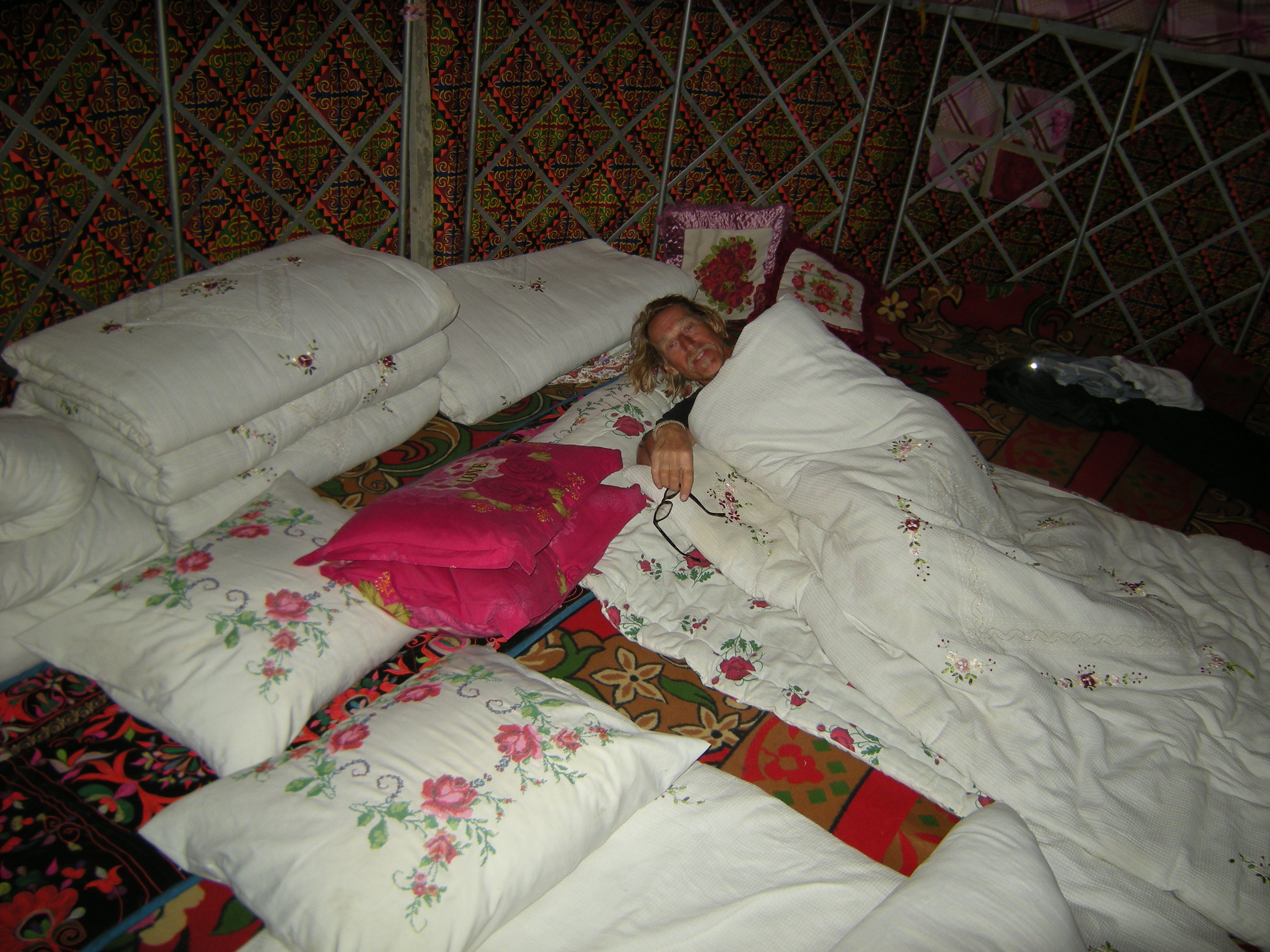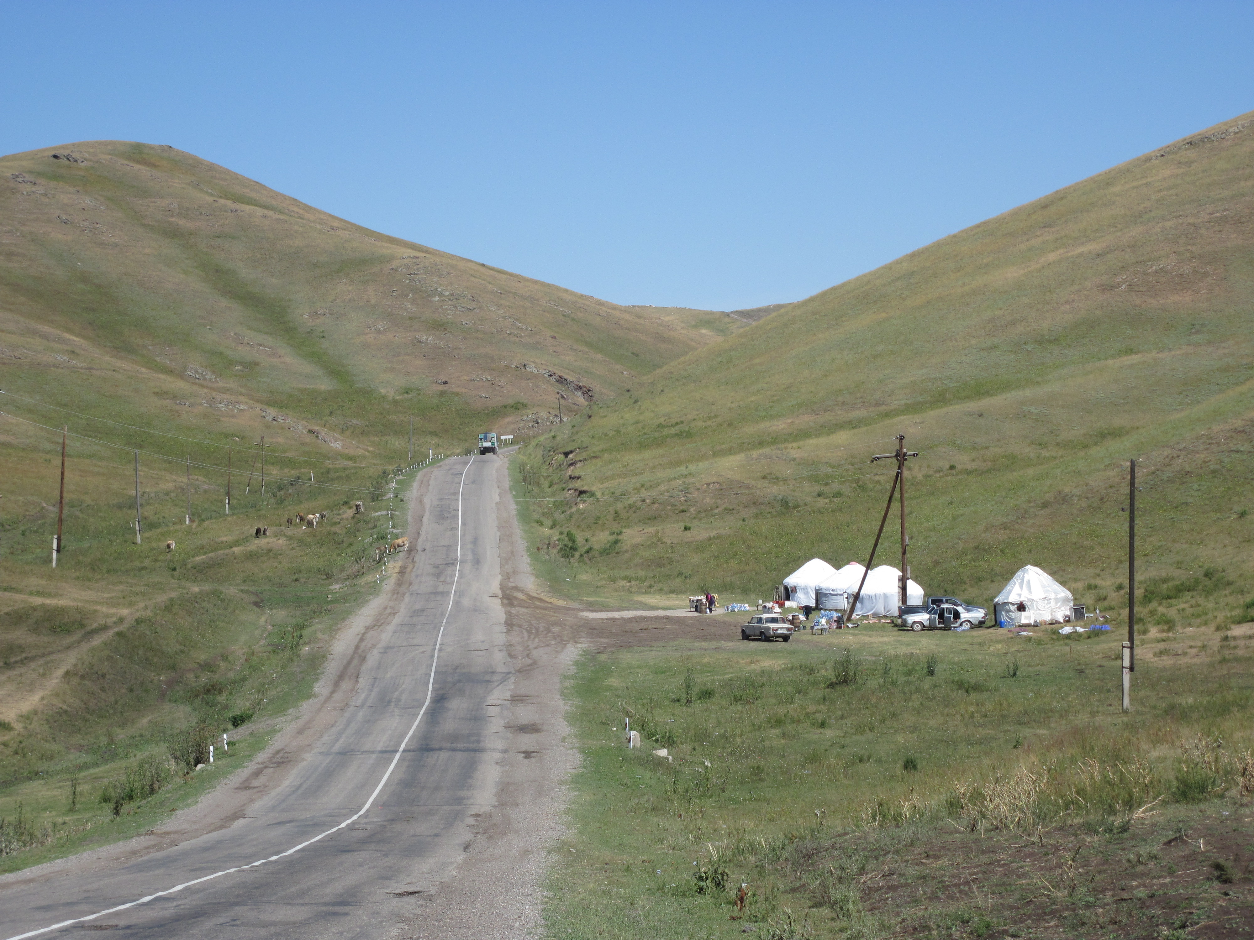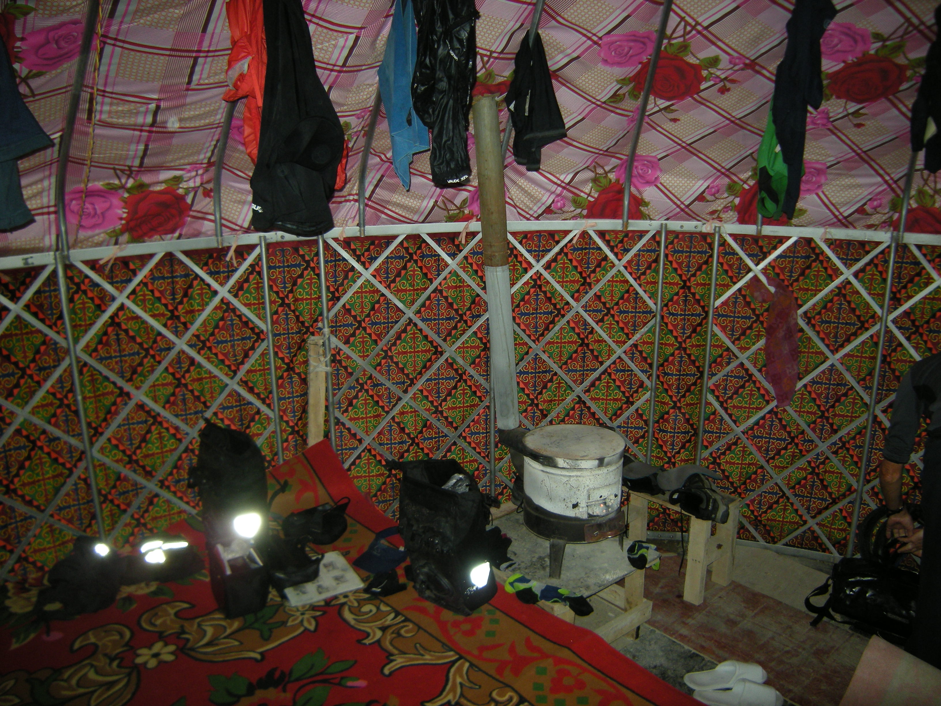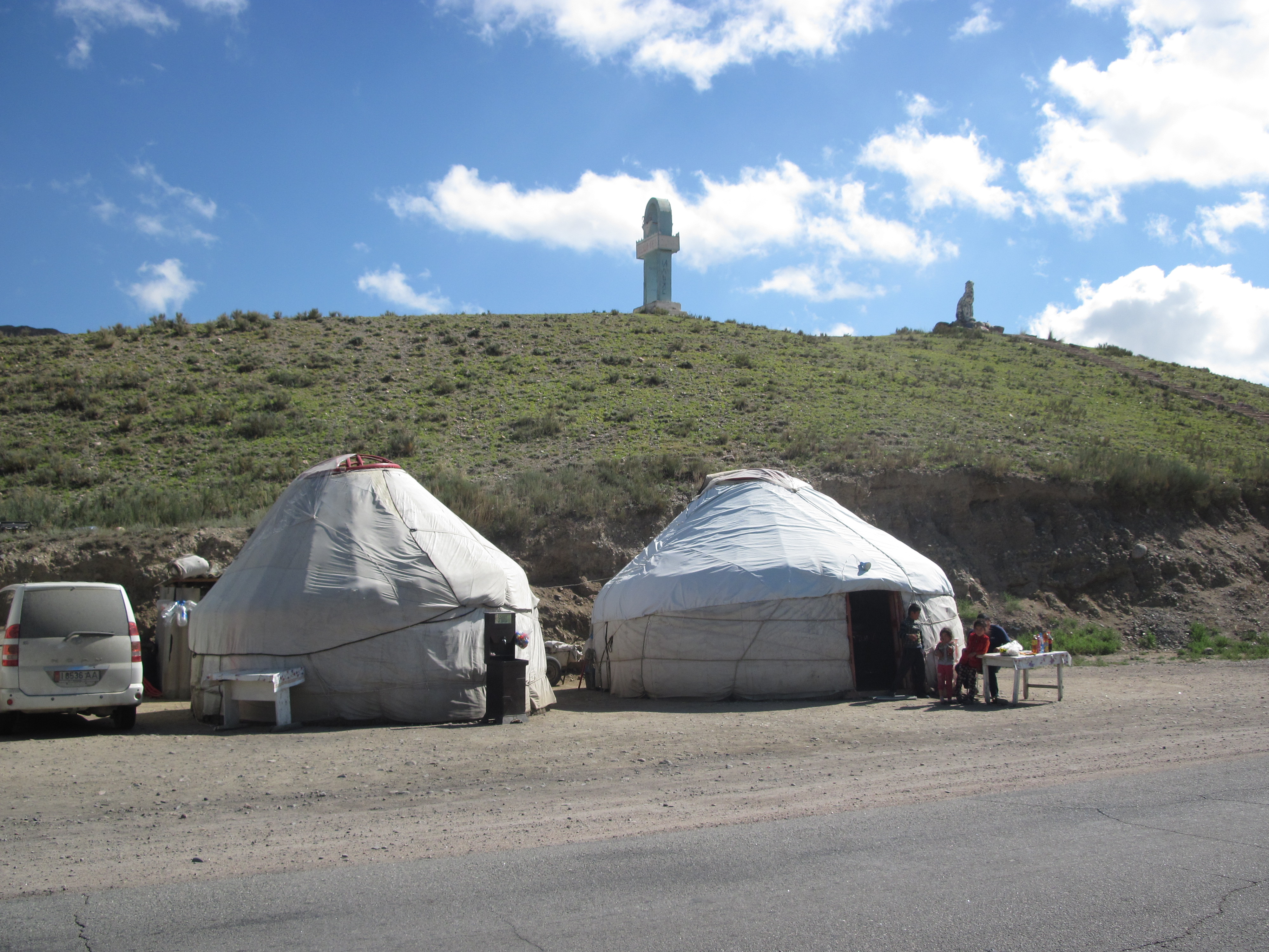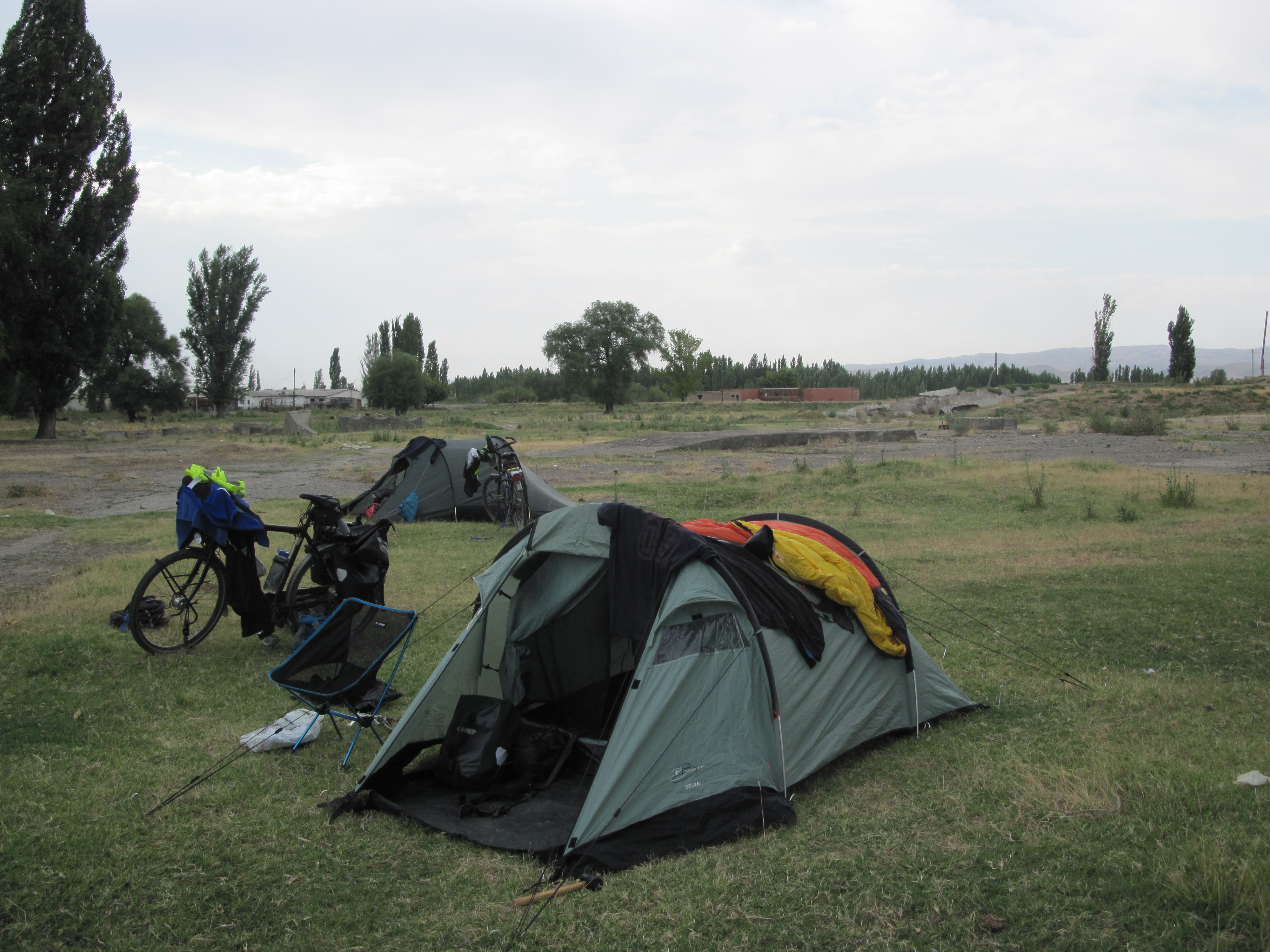 Hoewel ik wakker word met nog steeds hoofd- en keelpijn heb ik toch wel redelijk geslapen en voel ik me toch weer wat uitgerust. Wytze begint nu ook al te klagen dat hij zich niet lekker voelt. Met opnieuw wat paracetamol in het lijf gaan we toch maar op pad. We hebben voor vanavond nog geen onderdak geboekt dus we zien wel waar we uit gaan komen. Weg 109 hebben we vrij snel weer gevonden en daarna ook een winkeltje waar we weer ’n paar koekbroden kopen en die daar onder grote belangstelling opeten. Het weer is wat somber maar het blijft droog. Ook geen blubber vandaag maar wel stof!! Verschrikkelijk veel stof. Eerst fietsen we nog door een bergachtige omgeving maar daarna wordt het vlak en wordt het toch geen bijzonder mooie etappe. De vraag waar we kunnen overnachten wordt steeds nijpender. Als we een langgerekt dorp uitrijden vragen we of er een hotel is. Er moeten er wel 2 zijn dus moeten we terug. Als we het eerste hotel binnengaan kunnen we er niemand vinden. We kijken alvast wat rond. Wat een troep. Als we weer buiten zijn komen er wat mensen naar ons toe gelopen, die ons gelukkig snel duidelijk maken dat we er niet mogen blijven om te overnachten. Naar het tweede hotel zoeken we maar heel kort want het is ons snel duidelijk dat er in dit dorp geen hotel voor buitenlanders zal zijn. Ook in het volgende dorp kunnen we niet terecht. Wytze wil doorfietsen tot het donker is en dan ergens in een hut of schuur overnachten. Dat zie ik niet zo zitten. Ik wil liever proberen om bij mensen in de tuin te kamperen en denk dat we daarvoor al wel een mogelijkheid gepasseerd zijn. Wytze wil echter niet meer terug en dus fietsen we maar weer verder. We komen onverwacht toch nog bij een winkeltje waar we nog wat te eten en te drinken kopen. Ik grijp mijn kans en vraag aan de man of we onze tent bij de winkel op mogen zetten. Hij twijfelt even maar overlegt dan toch met zijn vrouw. We mogen meekomen en hij wijst ons een plek aan bij een bouwput achter het winkeltje waar ze bezig zijn met het aanleggen van een nieuwe weg. Maar we mogen ook slapen in een plastic bogentent waar wat was te drogen hangt. Nou dan kiezen we toch voor de bogentent. Ik zet er mijn tentje in op maar Wytze blijft bij zijn verlangen om zonder tent te slapen en rolt alleen zijn grondzeil en zijn slaapzak uit. Er staan nog 2 bogententen meer. 1 wordt gebruikt om gojibessen te drogen, in de andere slapen de wegwerkers. De wegwerkers zijn heel benieuwd naar hun nieuwe buren en komen natuurlijk de hele avond naar ons kijken en selfie’s maken. Ze komen zelfs heel attent een emmer water brengen zodat we ons wat kunnen wassen. Er is geen wifi dus hebben geen contact met het thuisfront. Na het eten van onze warme noedels is het vrij snel donker en dus tijd om te gaan slapen. Ben benieuwd wie er morgen het beste geslapen heeft.