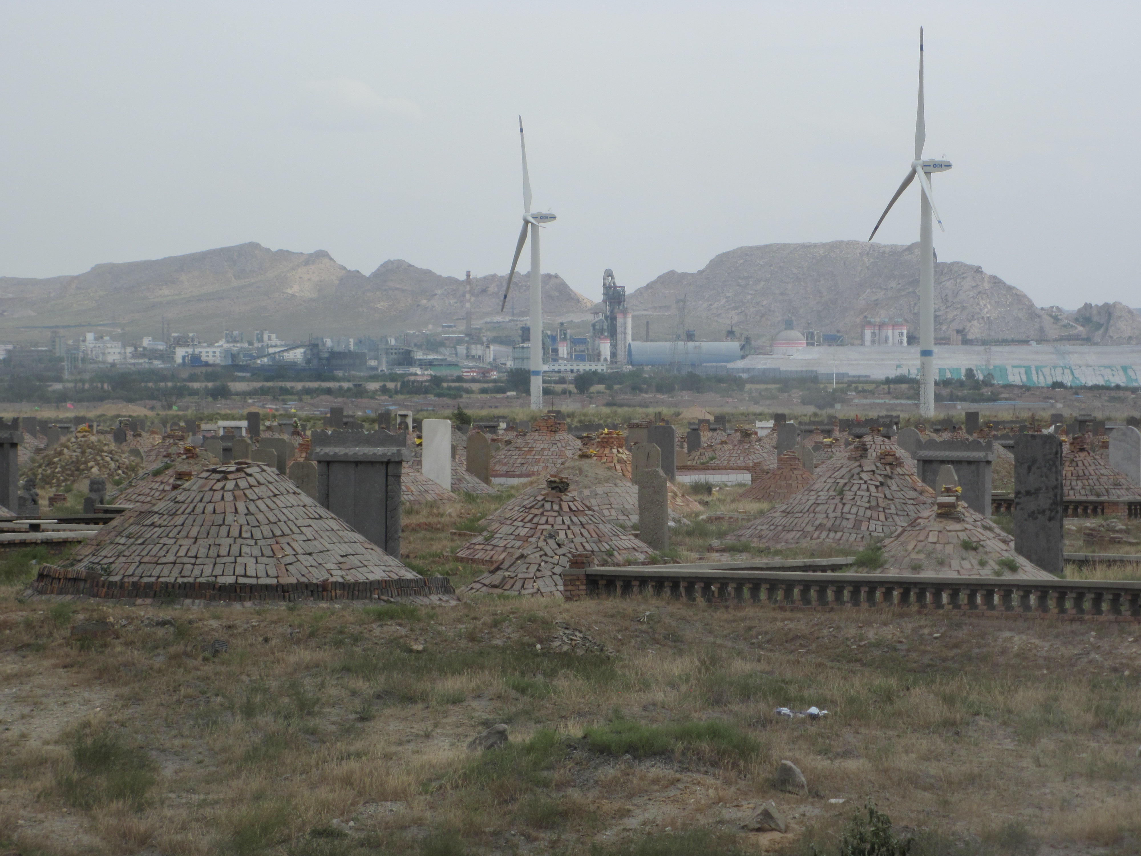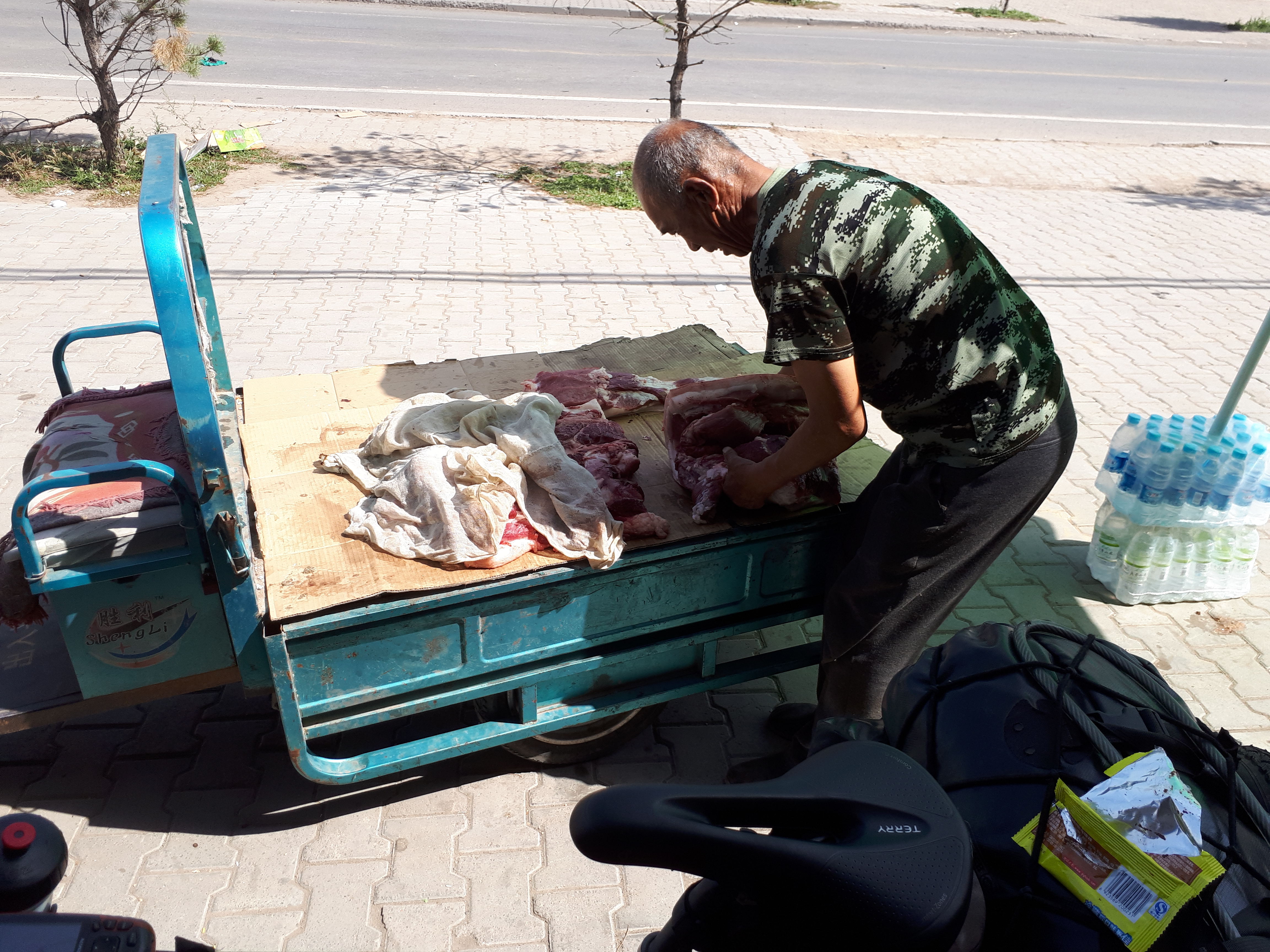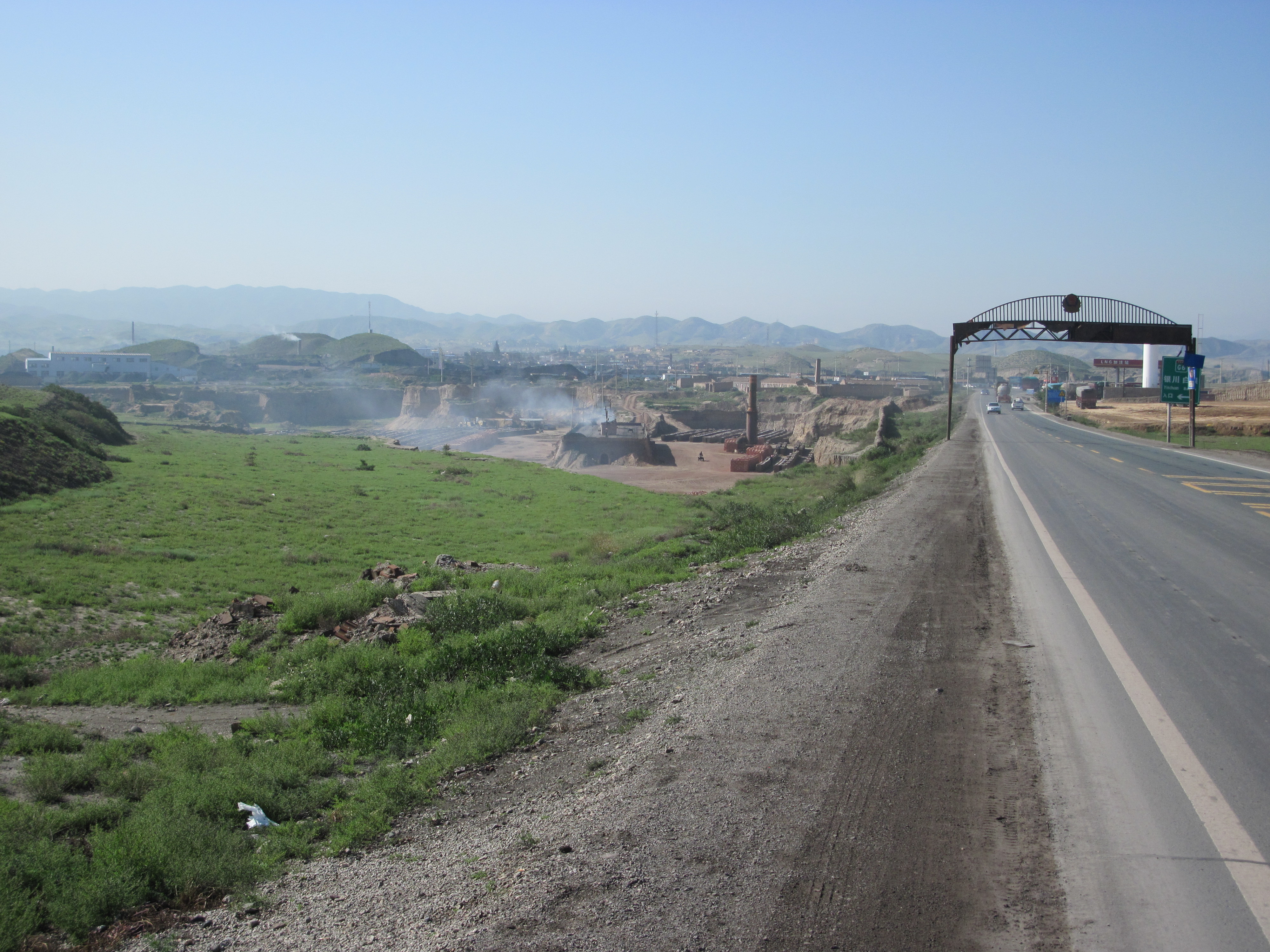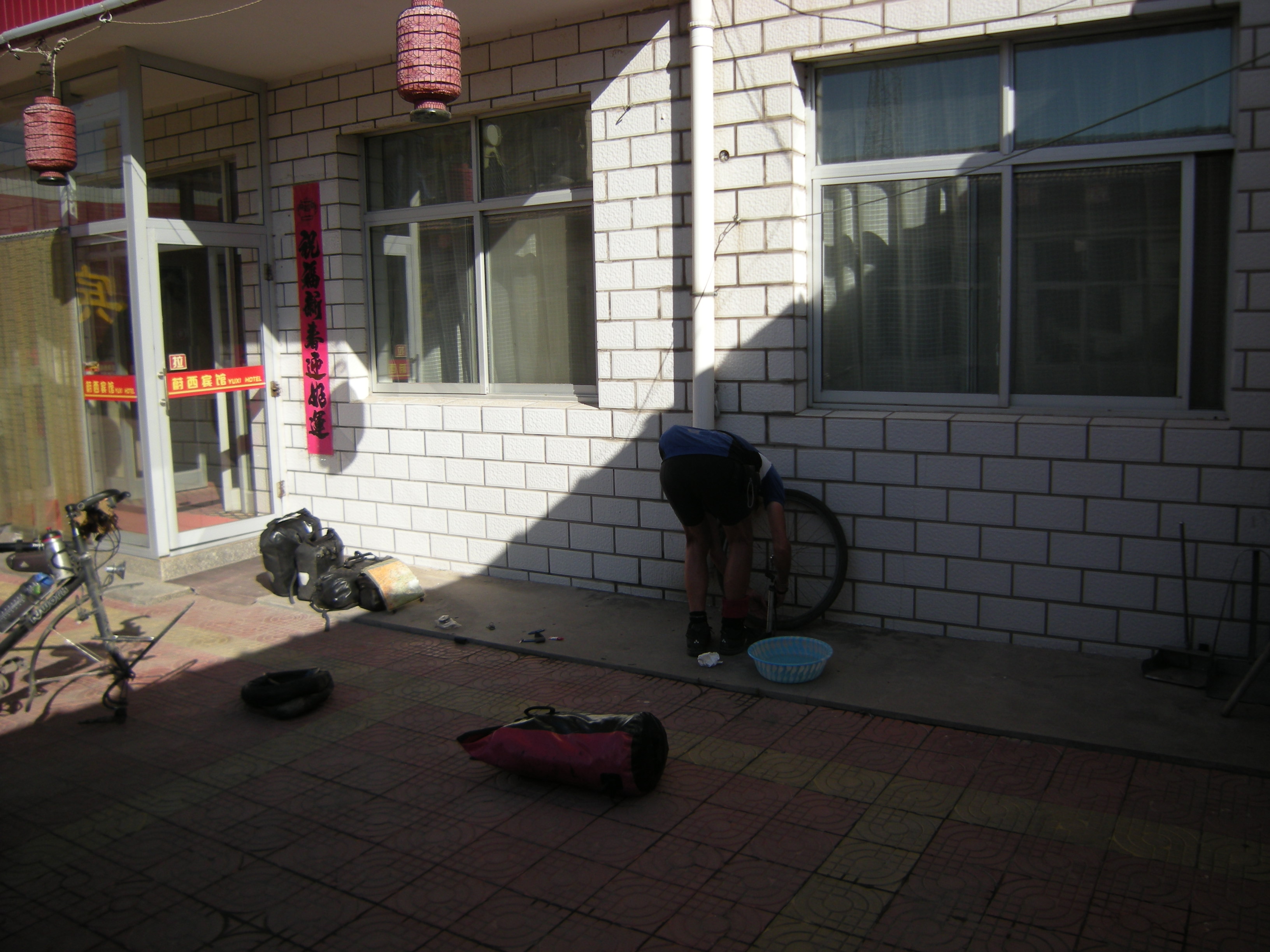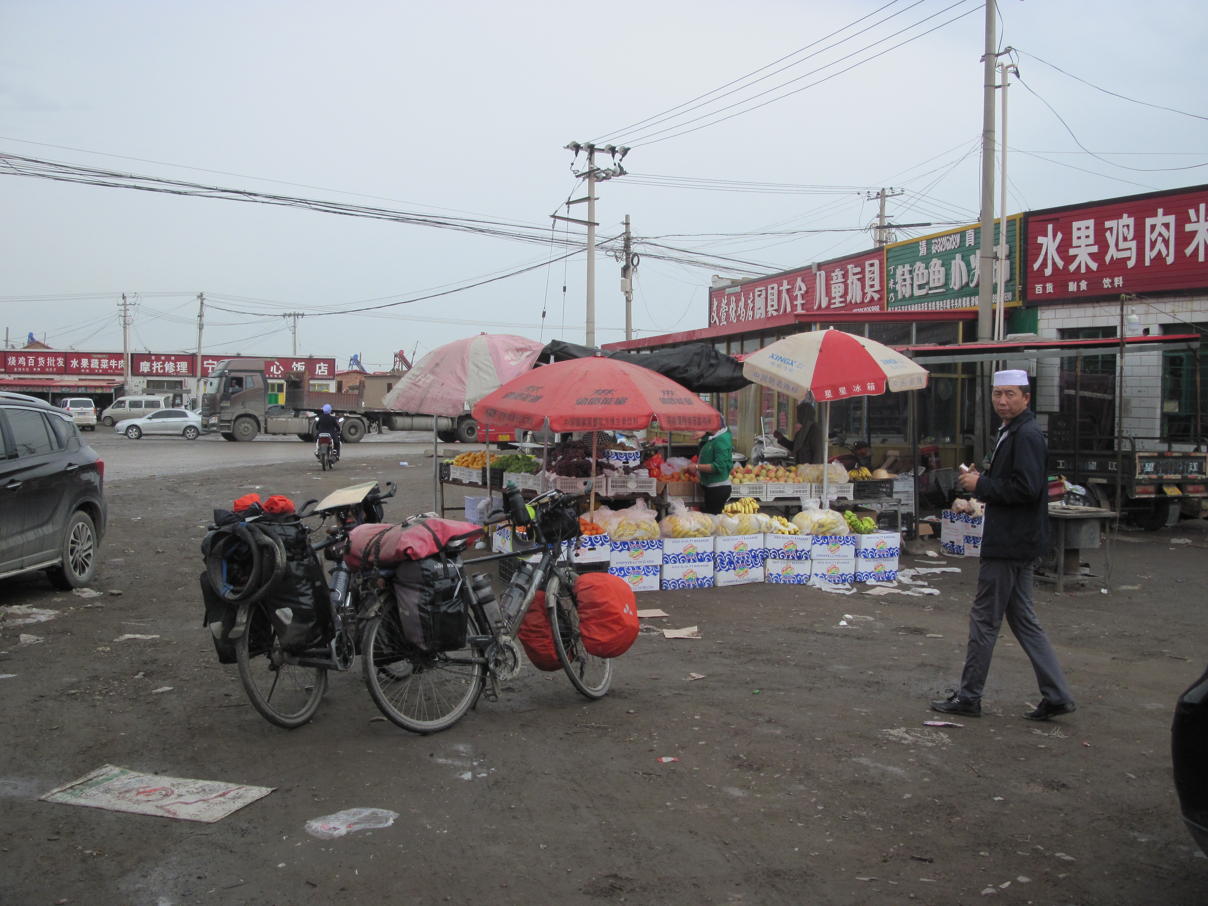 Ik heb redelijk geslapen in m’n tent in de bogentent. Het is in ieder geval rustig gebleven. De buitenkant van mijn slaapzak is wat nat en ik heb geen idee waar dat vandaan komt. Misschien heeft mijn bidon wat gelekt. Ik hang ‘m buiten op wat goji-droogrekken in de zon. Het droogt goed dus nemen we toch al vroeg afscheid van de winkeljuffrouw en nog wat andere vrouwen die een hakmes aan het slijpen zijn en in een teil vlees van het zojuist geslachte dier aan het wassen zijn. De zon schijnt er lekker op los en de eerste 20 km dalen we lekker door dorpjes met heel veel steenfabrieken. Het leem dat nodig is voor de stenen is overal in sleuven en gaten weggegraven wat een heel apart landschap oplevert. Voor de huizen liggen er ook grote hopen met grote brokken steenkool. Na zo’n 58 km komen we in Haojihai waar we wat eten. Er is daar zelfs een hotel. We twijfelen even omdat het er wel heel netjes uitziet maar als de eigenaresse zegt dat er 6 km verderop in Xingrenbu nog wel 5 slaapgelegenheden zijn fietsen we toch maar door. In Xingrenbu worden we naar een hotel verwezen maar als we eenmaal binnen zijn blijkt het toch niet veel soeps te zijn. Er is geen warm water. Het is er vies en de prullenbak in de kamer zit nog vol troep van de vorige gasten. Er zijn geen handdoeken maar als we er om vragen krijgen we dan toch 2 kleine harde lapjes. Waardeloos, maar voor 80 Yuan (ca. € 10,00) mag je natuurlijk ook niet veel verwachten. Op mijn Ziggo email-account krijg ik bericht dat ik waarschijnlijk gehackt ben en dat ze daarom mijn account maar geblokkeerd hebben. Ik wil ze laten weten dat dat waarschijnlijk te maken heeft met de VPS-app maar kan ze door de blokkade niet meer bereiken. Ik verander het wachtwoord maar ook dat helpt me niet verder. Ik vraag Peet of ze contact op wil nemen met Ziggo en activeer mijn Gmail-account zodat ik toch weer kan emailen. Ik stuur de gegevens van onze vliegtickets voor 27 oktober van Peking naar Amsterdam naar Sanne en Peet met de vraag of zij met D-reizen willen bespreken hoe we die kunnen annuleren of overboeken. We eten in het stadje en lopen nog wat rond door het vieze centrum.