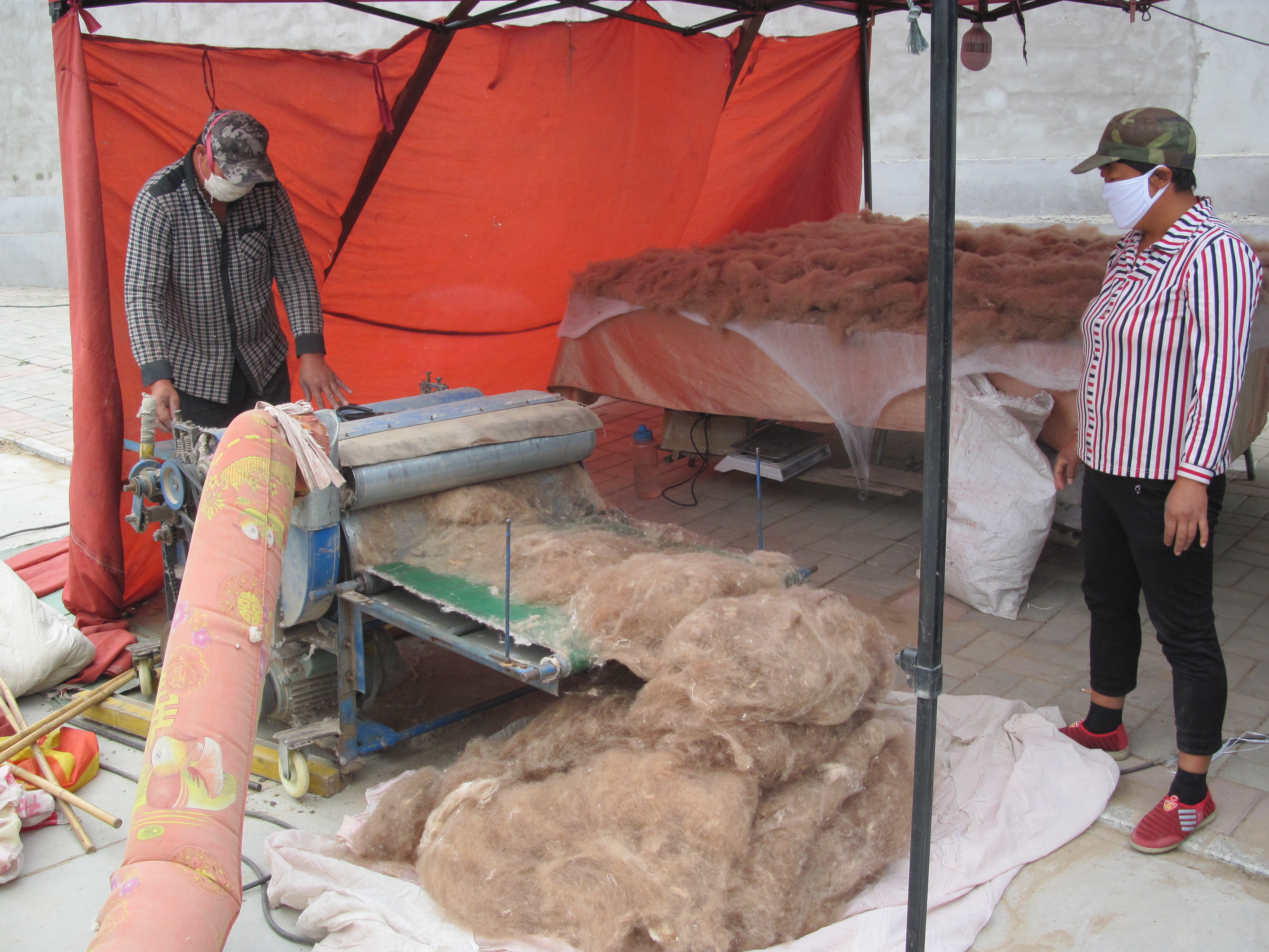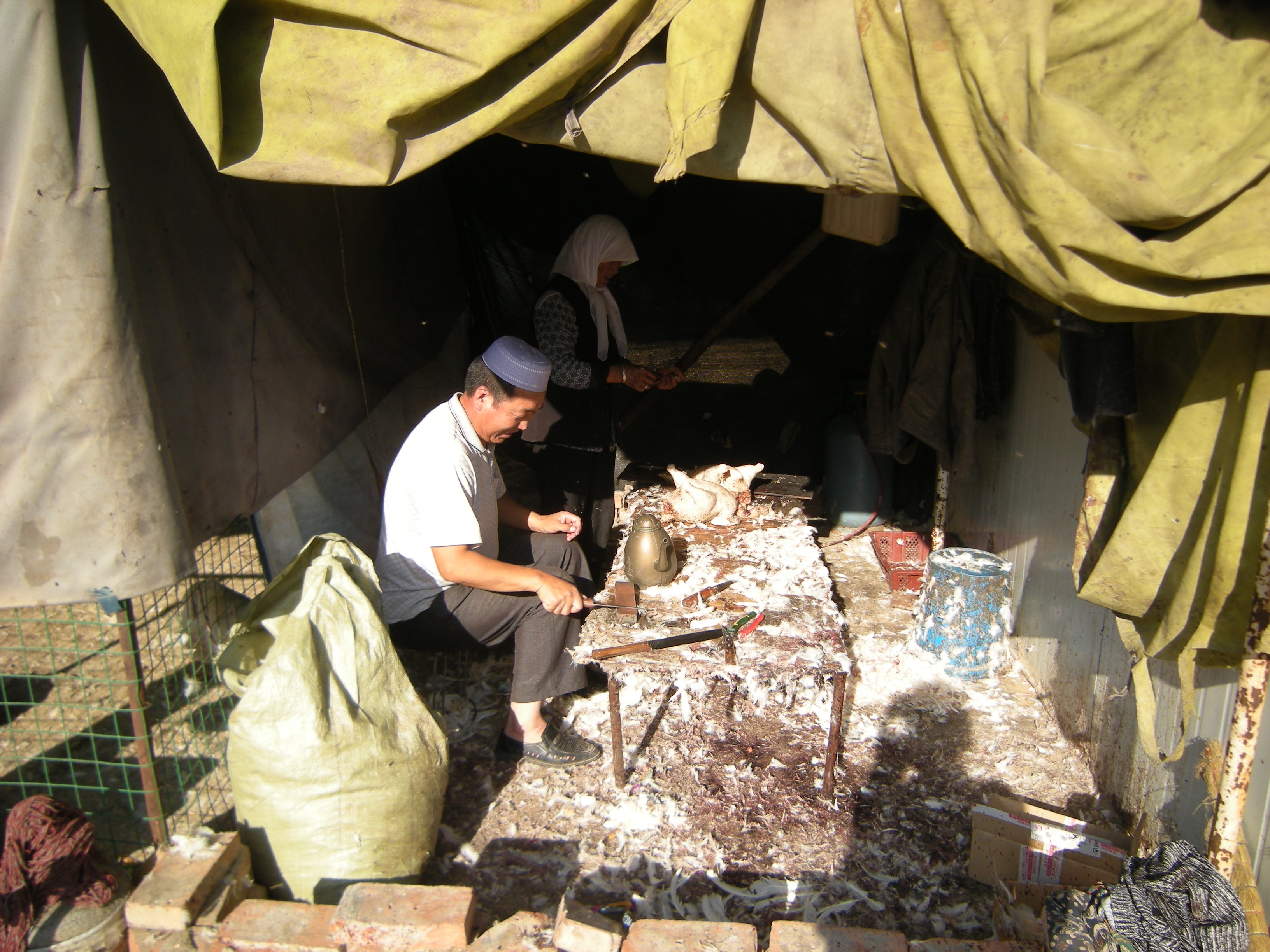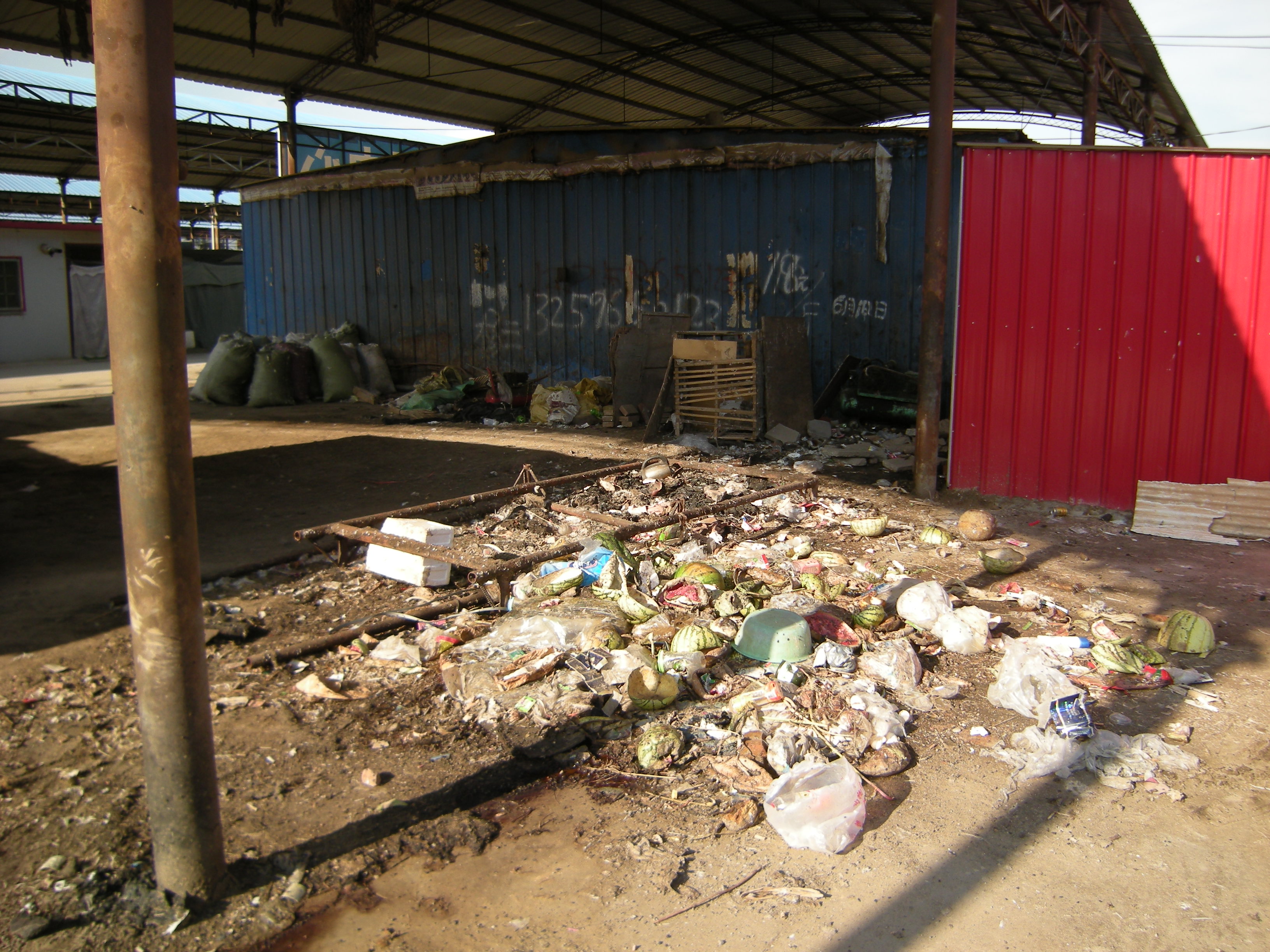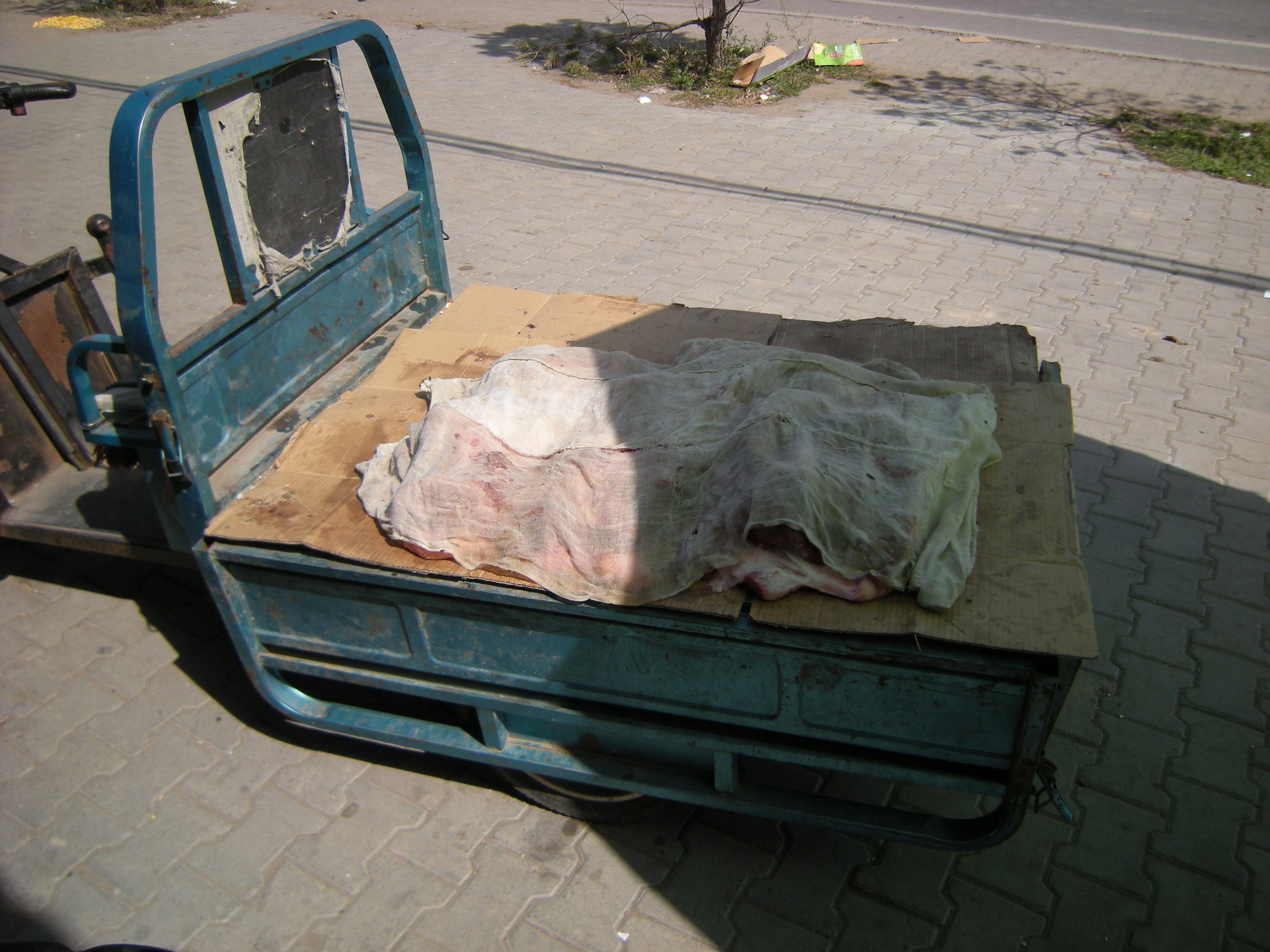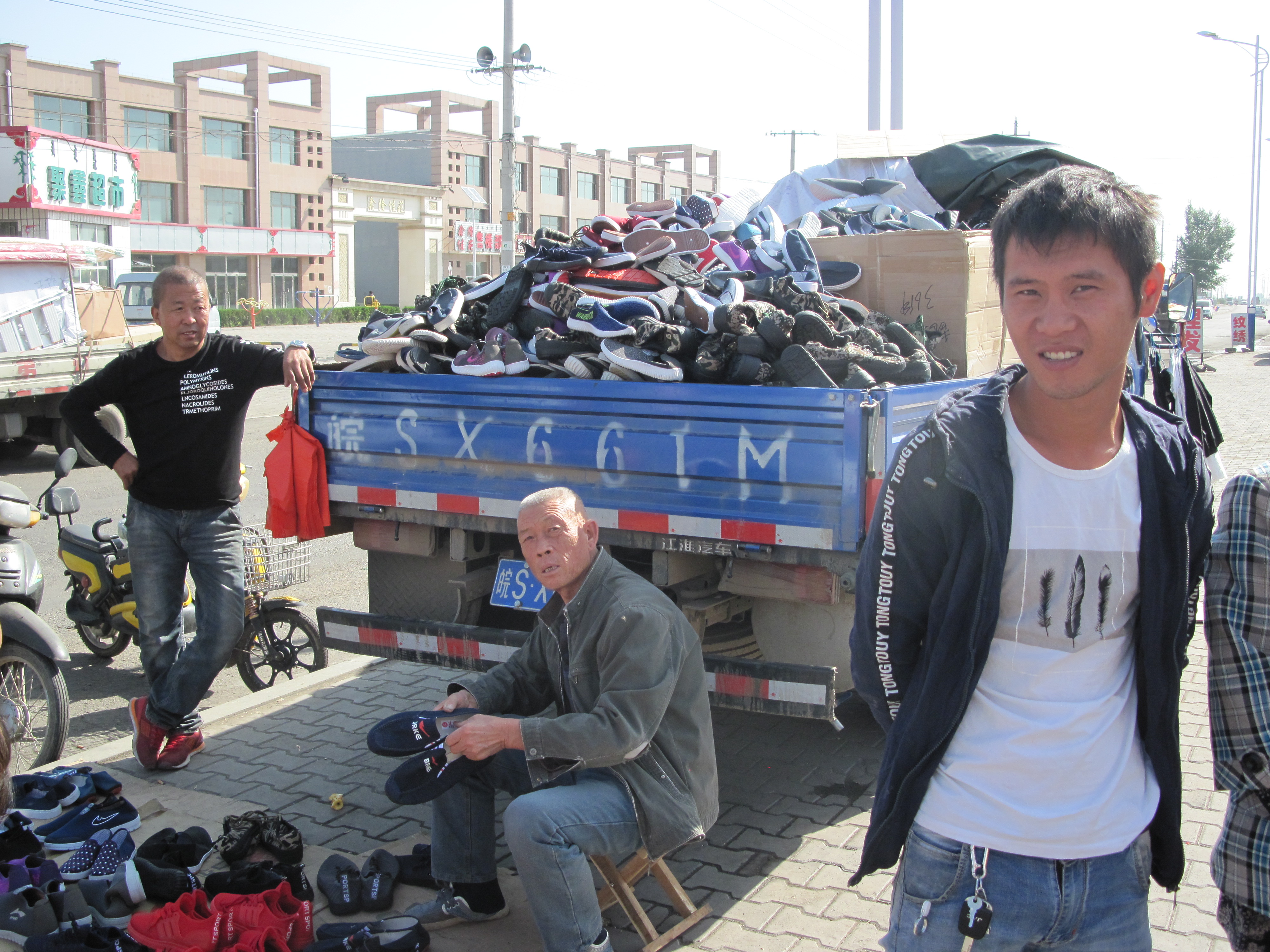 Ik heb redelijk geslapen in m’n tent in de bogentent. Het is in ieder geval rustig gebleven. De buitenkant van mijn slaapzak is wat nat en ik heb geen idee waar dat vandaan komt. Misschien heeft mijn bidon wat gelekt. Ik hang ‘m buiten op wat goji-droogrekken in de zon. Het droogt goed dus nemen we toch al vroeg afscheid van de winkeljuffrouw en nog wat andere vrouwen die een hakmes aan het slijpen zijn en in een teil vlees van het zojuist geslachte dier aan het wassen zijn. De zon schijnt er lekker op los en de eerste 20 km dalen we lekker door dorpjes met heel veel steenfabrieken. Het leem dat nodig is voor de stenen is overal in sleuven en gaten weggegraven wat een heel apart landschap oplevert. Voor de huizen liggen er ook grote hopen met grote brokken steenkool. Na zo’n 58 km komen we in Haojihai waar we wat eten. Er is daar zelfs een hotel. We twijfelen even omdat het er wel heel netjes uitziet maar als de eigenaresse zegt dat er 6 km verderop in Xingrenbu nog wel 5 slaapgelegenheden zijn fietsen we toch maar door. In Xingrenbu worden we naar een hotel verwezen maar als we eenmaal binnen zijn blijkt het toch niet veel soeps te zijn. Er is geen warm water. Het is er vies en de prullenbak in de kamer zit nog vol troep van de vorige gasten. Er zijn geen handdoeken maar als we er om vragen krijgen we dan toch 2 kleine harde lapjes. Waardeloos, maar voor 80 Yuan (ca. € 10,00) mag je natuurlijk ook niet veel verwachten. Op mijn Ziggo email-account krijg ik bericht dat ik waarschijnlijk gehackt ben en dat ze daarom mijn account maar geblokkeerd hebben. Ik wil ze laten weten dat dat waarschijnlijk te maken heeft met de VPS-app maar kan ze door de blokkade niet meer bereiken. Ik verander het wachtwoord maar ook dat helpt me niet verder. Ik vraag Peet of ze contact op wil nemen met Ziggo en activeer mijn Gmail-account zodat ik toch weer kan emailen. Ik stuur de gegevens van onze vliegtickets voor 27 oktober van Peking naar Amsterdam naar Sanne en Peet met de vraag of zij met D-reizen willen bespreken hoe we die kunnen annuleren of overboeken. We eten in het stadje en lopen nog wat rond door het vieze centrum.