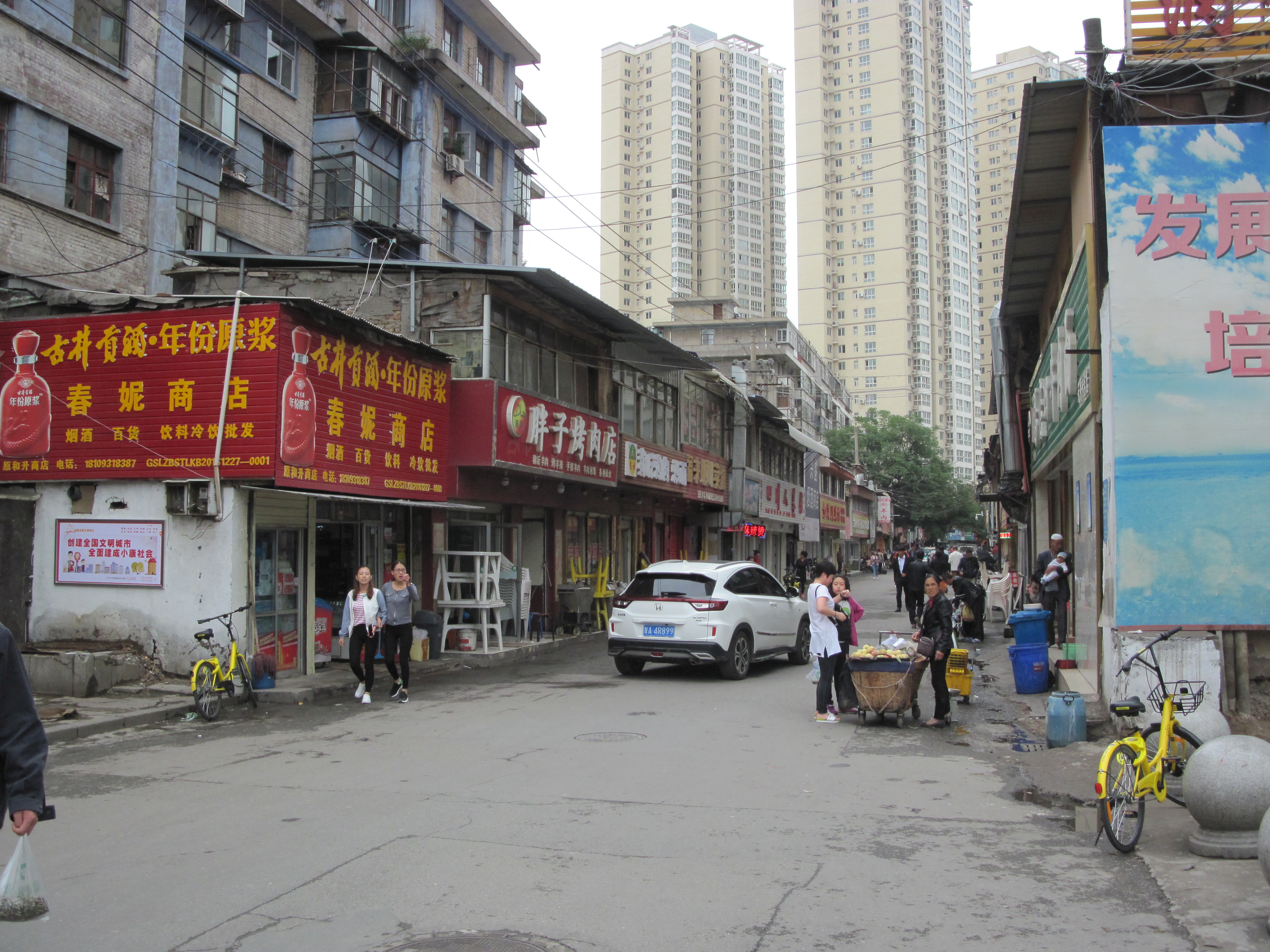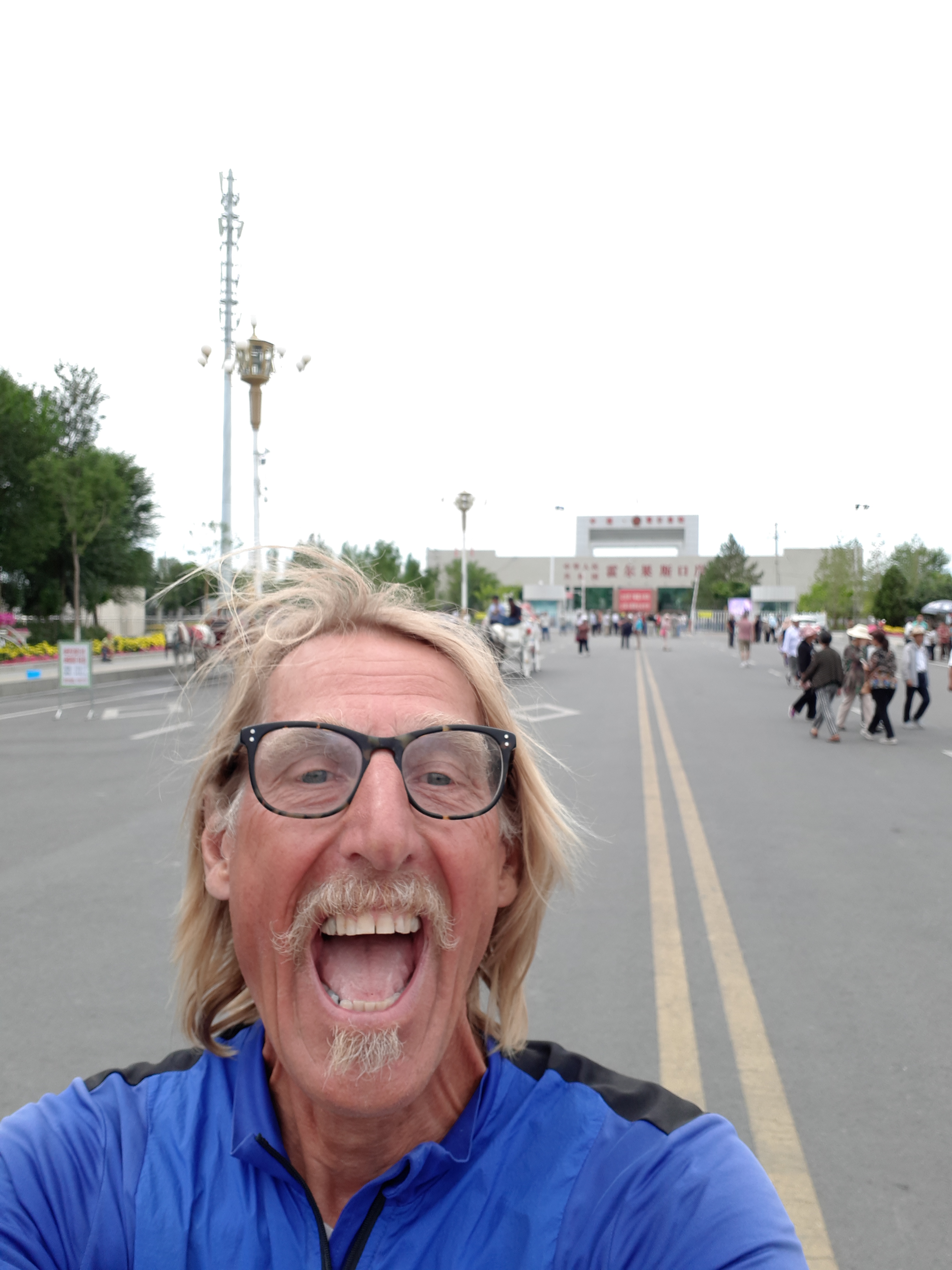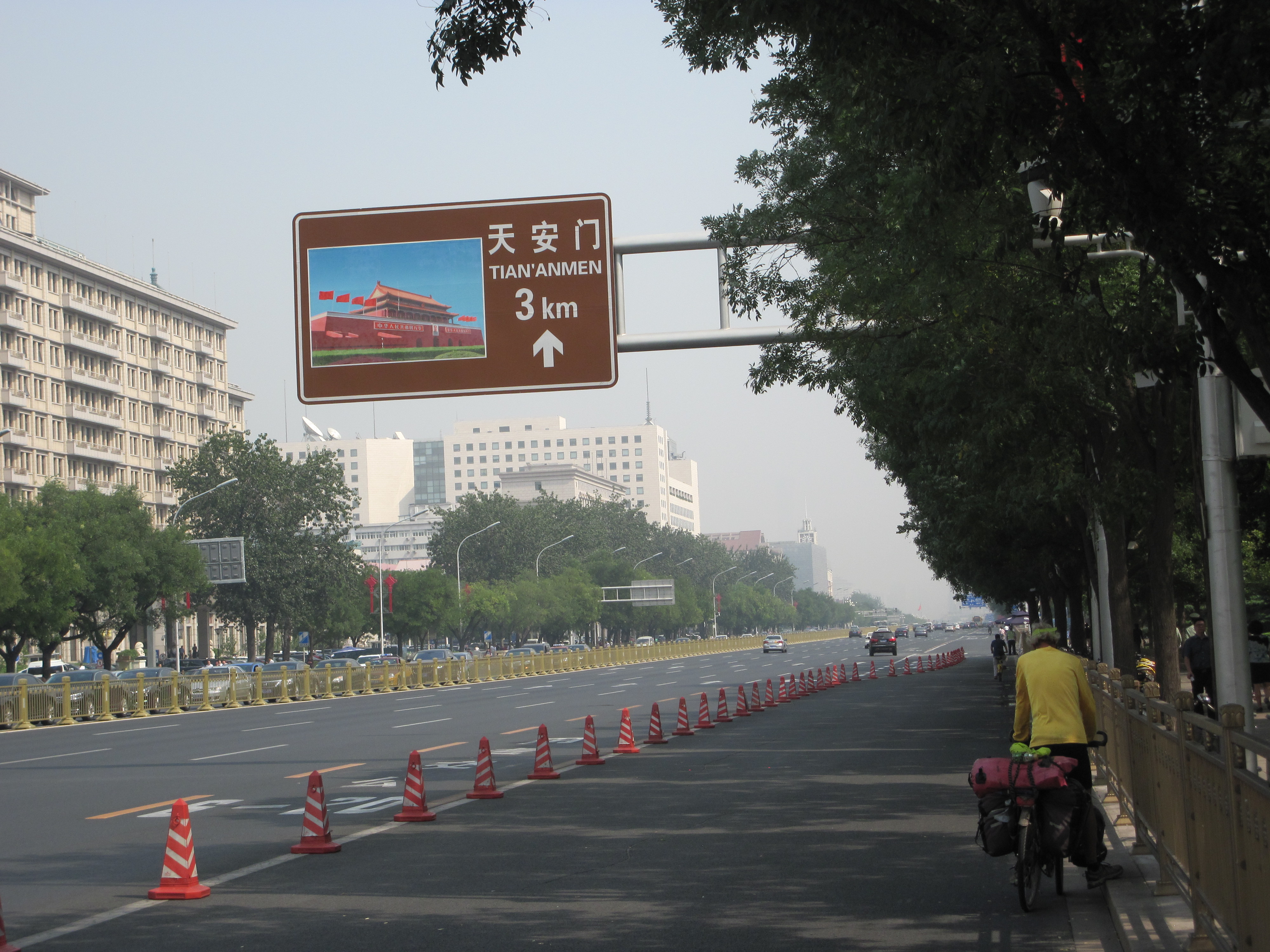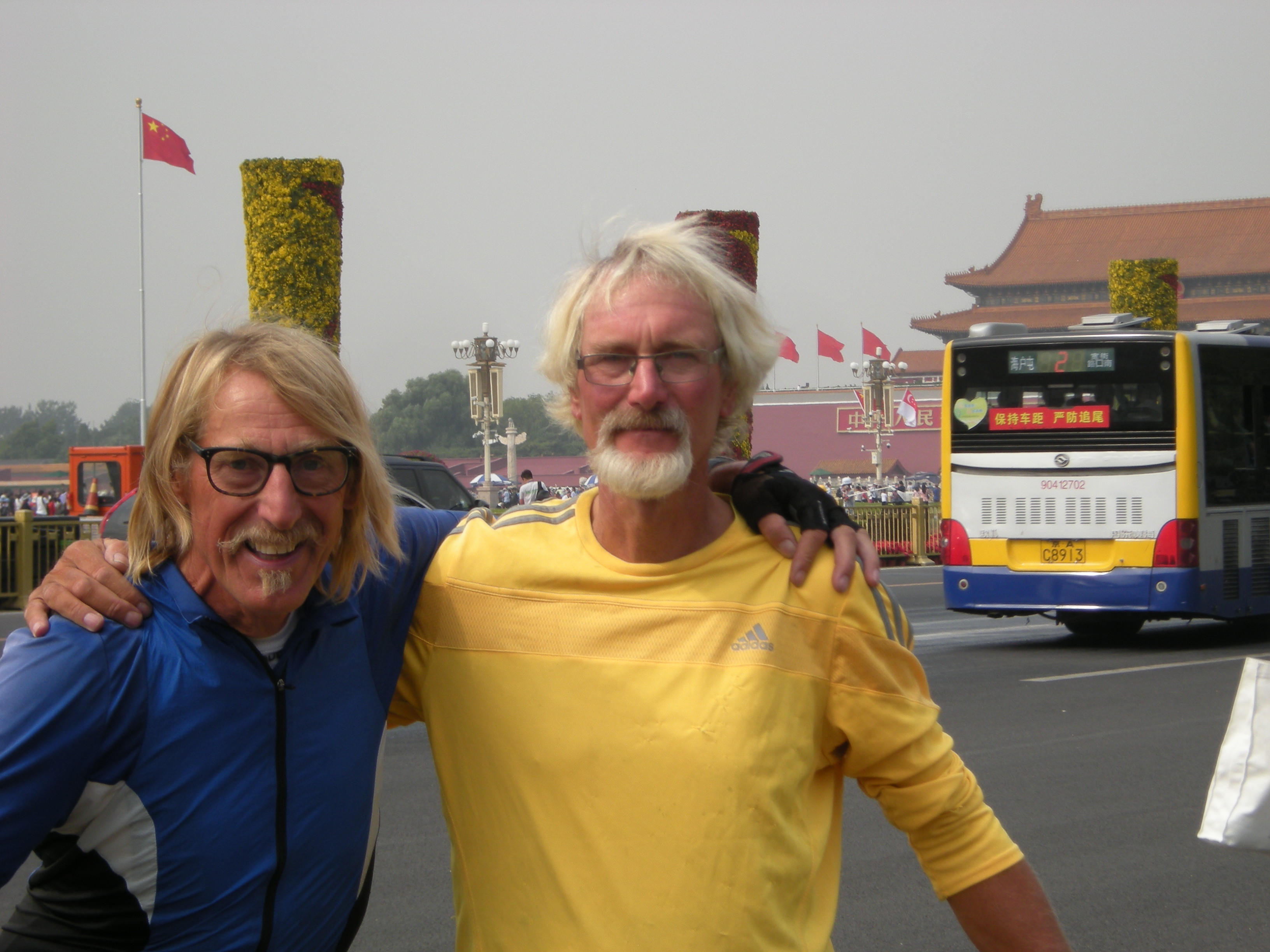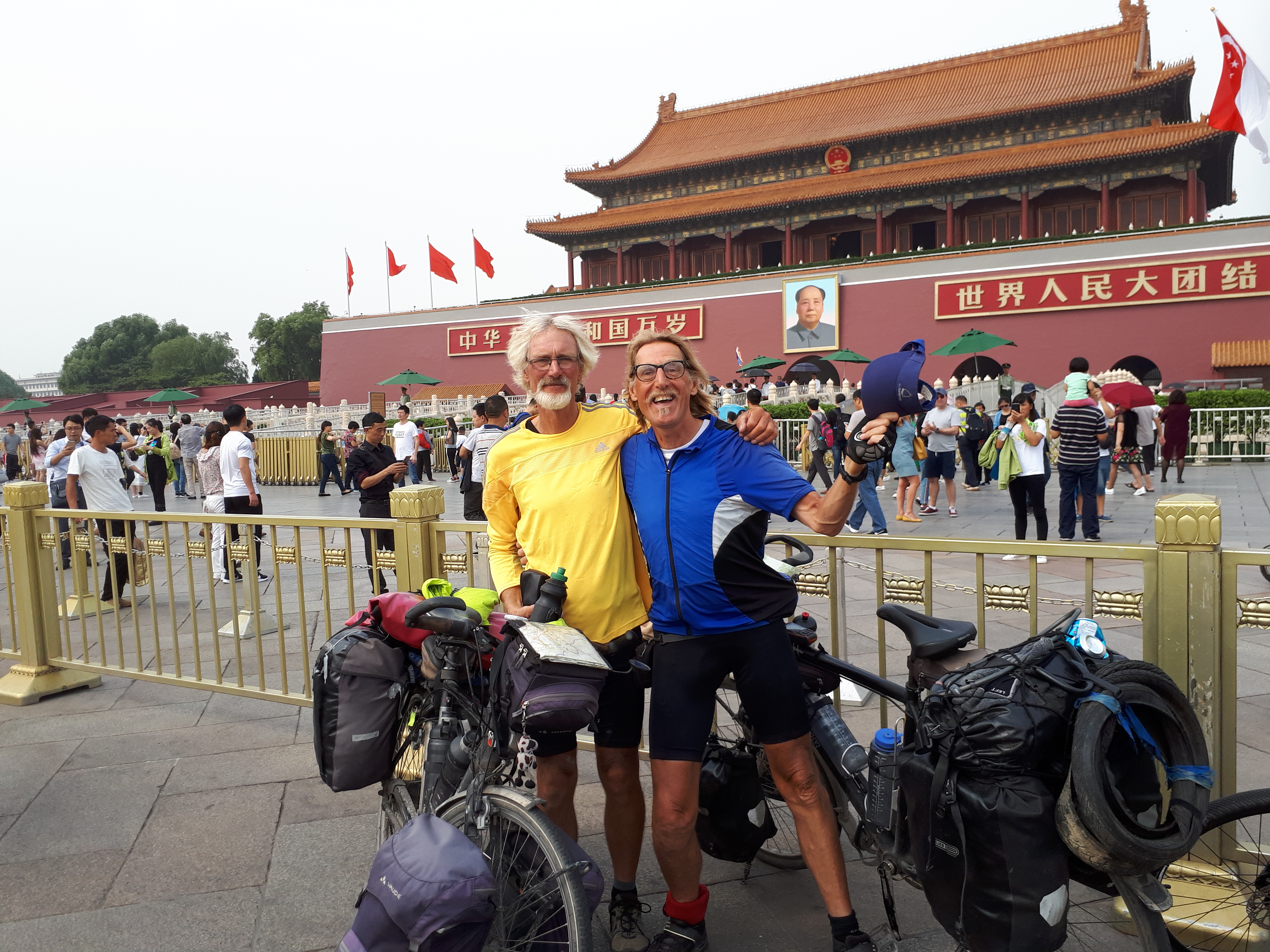 De tweede fles bier heb ik gisteravond waarschijnlijk toch iets te snel achterover gegoten want om half twee moet ik er uit om wat paracetamols te slikken. Daarna val ik gelukkig wel weer snel in slaap maar om 6 uur word ik weer met hoofdpijn wakkeren neem ik nog maar eens 2 tabletjes. Met een uitgebreid ontbijt beginnen we aan onze laatste fietsdag. Er zijn gebakken eieren en brood met jam en zelfs koffie. Het smaakt me prima. Ik mis eigenlijk alleen de boter nog. Op de kruising bij het hotel moeten we linksaf om weer op de 109 uit te komen. Onder het viaduct wordt al druk gedanst. Omdat we met de fiets soms niet op kruispunten mogen oversteken hebben we in het begin nog wat moeite om de 109 te volgen maar dan komen we er met de GPS toch wel weer uit. Ook valt het met de drukte wel mee omdat we als fietser op een fietsstrook rijden. Hoewel we vrij snel in stadse bebouwing komen te fietsen hebben we er geen idee van wanneer we Peking binnenfietsen. We hebben na 25 km, als we stoppen voor een drankje, nog geen plaatsnaambord gezien. Wytze is meteen van de kaart als hij bij de kassa hoort hoe duur de drankjes in Peking zijn. Ook de kosten van het hotel van afgelopen nacht ca. €80,00 zit ‘m nog steeds niet lekker. Als we op maps.me kijken zien we dat we al op de kruising zijn waar we rechtsaf moeten om op de 108 uit te komen. We zitten dus al in de buurt van het centrum en dat valt ons een beetje tegen. Peking is tot dusver geen stad met de allure of uitstraling van een oude Europese hoofdstad. Geen mooie oude of indrukwekkende gebouwen maar wel heel brede wegen. Via de 108 fietsen we over een hele brede met veel smog gevulde weg naar het Plein van de Hemelse Vrede. We zijn er! Maar de euforie is er eigenlijk nog niet. Ik mis nu toch wel het ontvangst van Peet en de kinderen. Zeker als Wytze zich hardop afvraagt of dit het nou is? Het is een groot leeg plein met er tegenover een hele grote tribune waar de zitplaatsen zijn van de hoge heren als er een defilé afgenomen wordt. We willen met de fiets op het plein rijden maar dat wordt helaas niet toegestaan. Als we bij een agent onze teleurstelling laten blijken mogen we een stukje verder maar dan houdt het toch echt wel op en wordt ons de doorgang onverbiddelijk geweigerd. Gelukkig wil een passerende toerist ons er wel nog even op de foto zetten. We fietsen terug naar het hek bij de tribune waar achter de ingang is van De Verboden Stad en waaraan de muur een grote foto van Mao ons toekijkt. Eigenlijk mogen we er niet stoppen maar we doen natuurlijk net of we de aanwijzingen niet begrijpen en weten er toch nog een paar foto’s te maken. Daarna gaan we op zoek naar het gereserveerde hotel en dat is toch wel wat verder dan we op de kaart ingeschat hebben. De straten met luxe hotels en grote winkels laten we achter ons en we komen steeds meer in een volkswijk terecht. Het duurt ook even voordat we in de gaten hebben dat ons hotel niet aan de hoofdweg maar in een van de smalle zijstraatjes ligt. Onze eerste indruk van de omgeving is niet best. In de zijstraatjes staan kleine huisjes en er ligt nogal wat rommel. Het hotel valt gelukkig wel mee. We hebben een kleine kamer maar het is er wel netjes en het heeft een gezellige binnenplaats met wat zitjes. Ik Wechat met Sheng dat we gearriveerd zijn en maak met haar een afspraak voor een ontmoeting en etentje voor morgenavond. Wytze gaat ondertussen de wijk in om ergens wat Nescafe te kopen. Mijn hoofdpijn is nu gelukkig eindelijk toch wat weggezakt. Om 7 uur gaan we de wijk in op zoek naar een restaurantje. Vlakbij vinden we een Koreaans restaurant waar we op de foto zien dat ze er onze favoriete voedsel rijst met tomaat/ei verkopen. Het smaakt ons prima. Na het eten verkennen we de buurt en brengen nog een bezoek aan een pagode met een tuin en winkeltje waar ze oude stadskaarten verkopen. Op de terugweg naar het hotel kopen we eten voor het ontbijt en lunch van morgen. Ik durf geen bier meer te kopen want mijn hoofdpijn zeurt nog steeds.