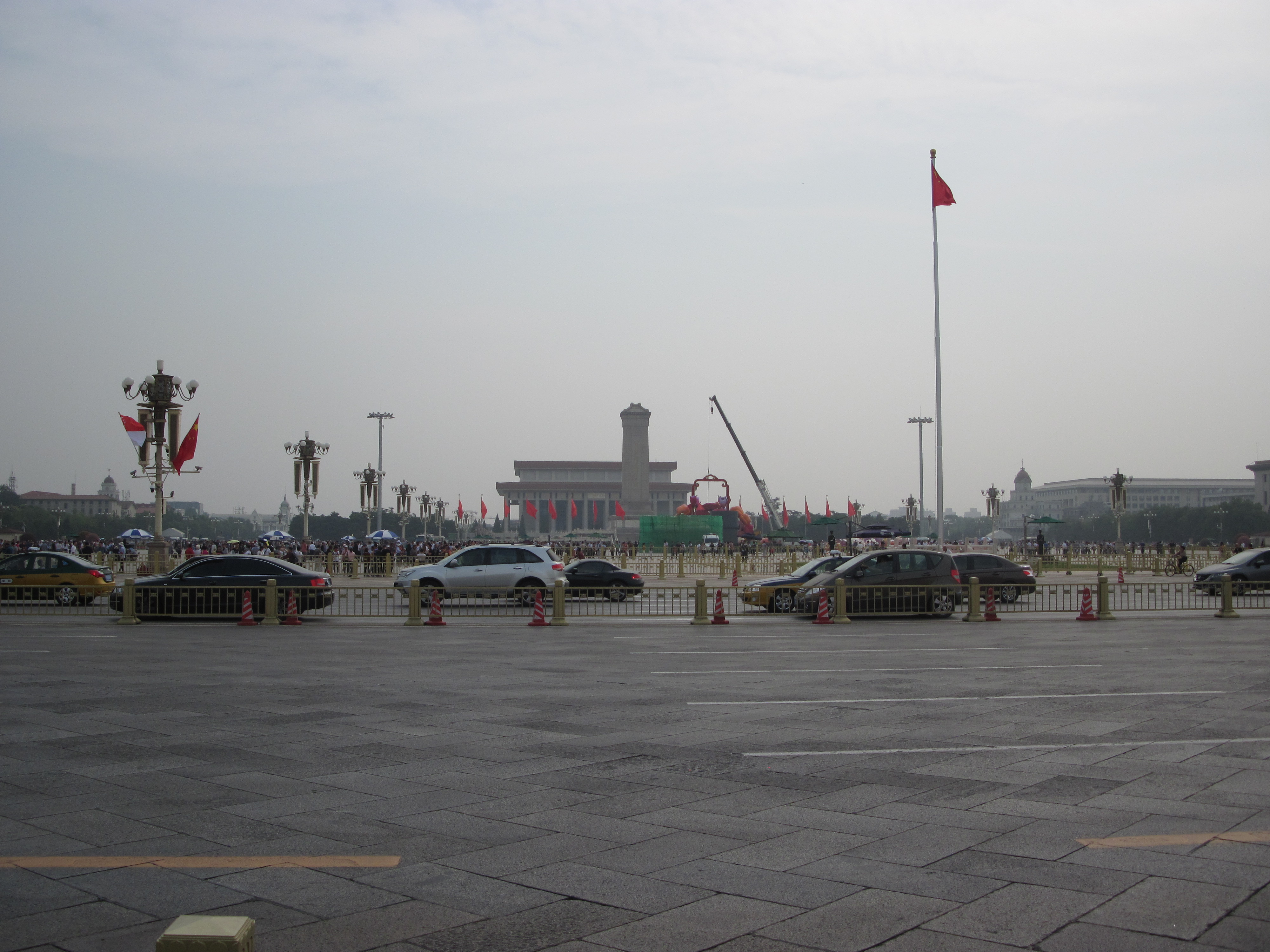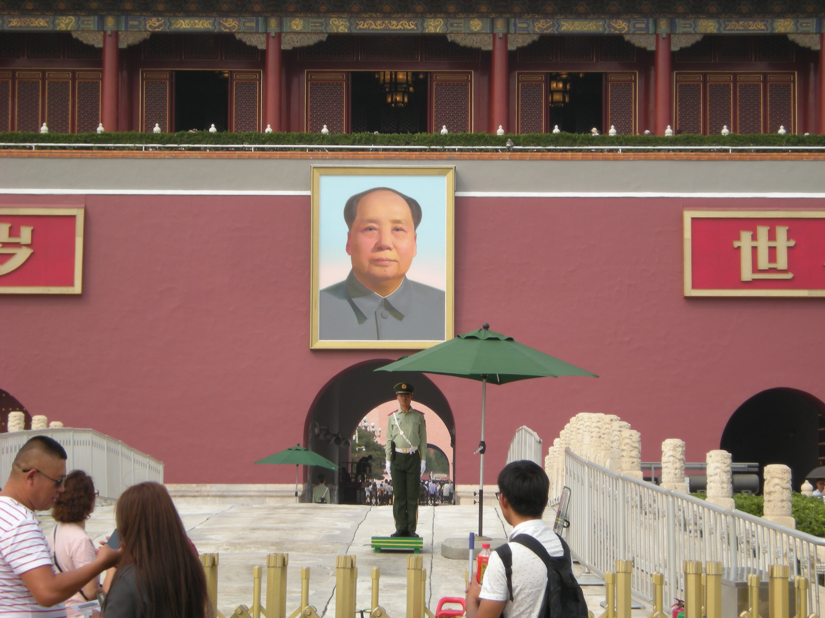 Rond 10.00 uur fietsen we naar het plein en parkeren onze fietsen aan de kant van de Verboden Stad. We gaan eerst naar de overkant naar het Plein van de Hemelse Vrede en moeten daarvoor eerst aansluiten in de rij om onze paspoorten en bagage te laten checken. Het is al heet als we naar het grote gebouw op het plein wandelen. We hebben geen idee wat er te doen is maar er staat wel een lange rij mensen voor te wachten. We lopen naar de andere kant van het gebouw om te kijken of we er van die kant ook in kunnen. Dat blijkt niet mogelijk. Het gebouw heeft maar 1 ingang en 1 uitgang dus lopen we weer terug naar wat de voorkant van het gebouw blijkt te zijn. We sluiten aan in de rij en worden opnieuw gecontroleerd. Het is verboden om rugzakjes en cameratassen mee naar binnen te nemen. Er zit niets anders op dan dat we dan maar om de beurt gaan. Wytze gaat eerst en ik blijf bij de bagage de wacht houden. Er is geen schaduwplekje te vinden en de zon brandt zo op mijn vel dat ik maar een jasje met lange mouwen aan doe. Als Wytze terug is mag ik. Hij vertelt niets over wat hij gezien heeft. Ik loop tussen de dranghekken naar de trappen van het gebouw. Onder bij de trappen staat een grote kiosk waar men bosjes met witte snijbloemen verkoopt en om de meter staat er wel een militair de wacht te houden. Ik voel dat er iets bijzonders in het gebouw moet zijn en sluit aan bij de mensen die naar binnen schuifelen. Bij mijn eerste blik naar binnen realiseer ik me pas dat ik het mausoleum van Mao aan het binnen lopen ben . Ik zie hem dan zelfs opgebaard liggen. Veel tijd om te kijken krijg ik niet want als ik even stil sta om beter zicht op de grote kleine leider te krijgen en om dit toch wel bijzondere moment een plaats te geven wordt me duidelijk gemaakt dat stilstaan verboden is en dat ik door moet lopen. Mensen die onderaan de trap bloemen gekocht hebben mogen ze bovenaan weer inleveren bij mensen die ze bij de tombe neerleggen. Er liggen toch wel heel veel bosjes dus als dat een afspiegeling is van zijn populariteit dan is het maar de vraag of iedereen op de hoogte is van wat er onder zijn bewind allemaal gebeurd is. Bij de uitgang worden er in kraampjes Mao souvenirs verkocht. Het werpt bij mij het beeld van Scherpenheuvel en Lourdes op. Terug bij Wytze blijkt dat we toevallig net op tijd zijn geweest omdat het mausoleum om 12.00 uur gesloten werd. We slenteren nog wat over het hete plein maar heel veel bijzonders is er eigenlijk niet te zien. Er wordt nog wel gewerkt aan een grote bloemenstruik die daar in verband met een of andere manifestatie gebouwd wordt. Het is zo’n kolossale struik dat er zelfs een hijskraan aan te pas moet komen. Onder de drukke weg door lopen we dan naar de overkant waar de entree is naar de Verboden Stad. Voor we binnen mogen moeten we natuurlijk eerst weer door de scans. Eenmaal binnen klimmen we eerst naar boven de toegangspoort op. Wel weer om de beurt want de rugzak mag weer niet mee. Vanaf het balkon op de toegangspoort hebben we een prachtig zicht over het plein der Hemelse Vrede dat zich vanwege het scherpe tegenlicht toch nog moeilijk laat fotograferen. Onze tocht door de Verboden Stad kan beginnen. Ik huur nog een headsetje waar een Engelse stem de geschiedenis van het complex aan mij uitlegt. Wytze wil geen headset huren want dat kost geld en hij is nou eenmaal allergisch voor alles wat geld kost. Omdat ik er wel een huur raakt hij wat geïrriteerd en loopt hij alle kanten op. Samen optrekken en op ons gemak de stad bekijken gaat dus niet lukken. Om hem niet kwijt te raken kan ik de uitleg op de headset niet volledig volgen waardoor ik toch wel veel interessante informatie moet missen en de waarde van het hebben van de headset minder wordt. De hoeveelheid aan tempels en pleinen is indrukwekkend maar dat ze nou echt mooi zijn kan ik ook weer niet zeggen. Mijn kennis van de Chinese geschiedenis is niet voldoende om er meer kleur en inhoud aan te geven en helaas komt de info van de headset nu door de haast van Wytze ook niet tot zijn recht. Ook even relaxed uit puffen op een terrasje zit er niet in. Een drankje mag wel maar dan van een winkeltje of kiosk want dat zal wel goedkoper zijn als op een terras. Ik moet af en toe wel glimlachen als ik merk hoe Wytze me bij de voor mij zo verleidelijke terrasjes weg weet te houden. Hoewel we het kopen van de souvenirs voor morgen op het programma hebben staan duiken we om even uit de hete zon te zijn af en toe even een souvenirwinkeltje in. We voelen beiden wel dat dat nog een vervelende klus gaat worden. Nog een kort bezoek aan de tuin en dan is het tijd om weer terug te wandelen naar onze fietsen. Om 6 uur moeten we terug zijn bij het hotel want dan heb ik afgesproken met Sheng. Na eerst nog wat geld gepind te hebben lukt dat net op tijd. Ik ben er zelfs een beetje zenuwachtig van. Ik heb nog net voldoende tijd om me wat op te frissen voordat Sheng via de App meldt dat ze bij de receptie van het hotel is. Ik haast me ernaar toe en ontmoet een mooie jonge vrouw met opgestoken haar die onmiskenbaar oudstudente Sheng is. Na een korte wat onwennige docent/student omhelzing blijkt dat ze haar ID vergeten is en dus niet verder mee mag naar het hotel of de binnenplaats. We kletsen even en dan ga ik Wytze vragen om naar de receptie te komen en met Sheng kennis te maken en haal ik meteen de fles bier op die ik haar beloofd heb. Het is meteen gezellig. We moeten veel buurten. Om half acht ga ik met Sheng uit eten. Wytze gaat zoals hij al eerder aangegeven heeft niet mee. We gaan naar een restaurant om de hoek dat Sheng al op internet gevonden heeft. We eten er lekker en hebben vooral een heel gezellige avond. Er is zoveel te vertellen dat we af en toe gewoon vergeten om te eten. We vragen aan gasten langs ons of ze een mooie foto van ons willen maken. Als ik om de rekening vraag staat Sheng erop dat zij betaalt en dat doet ze dan heel modern met het scannen van een QR–code met haar mobieltje. Om half 10 breng ik Sheng naar het me