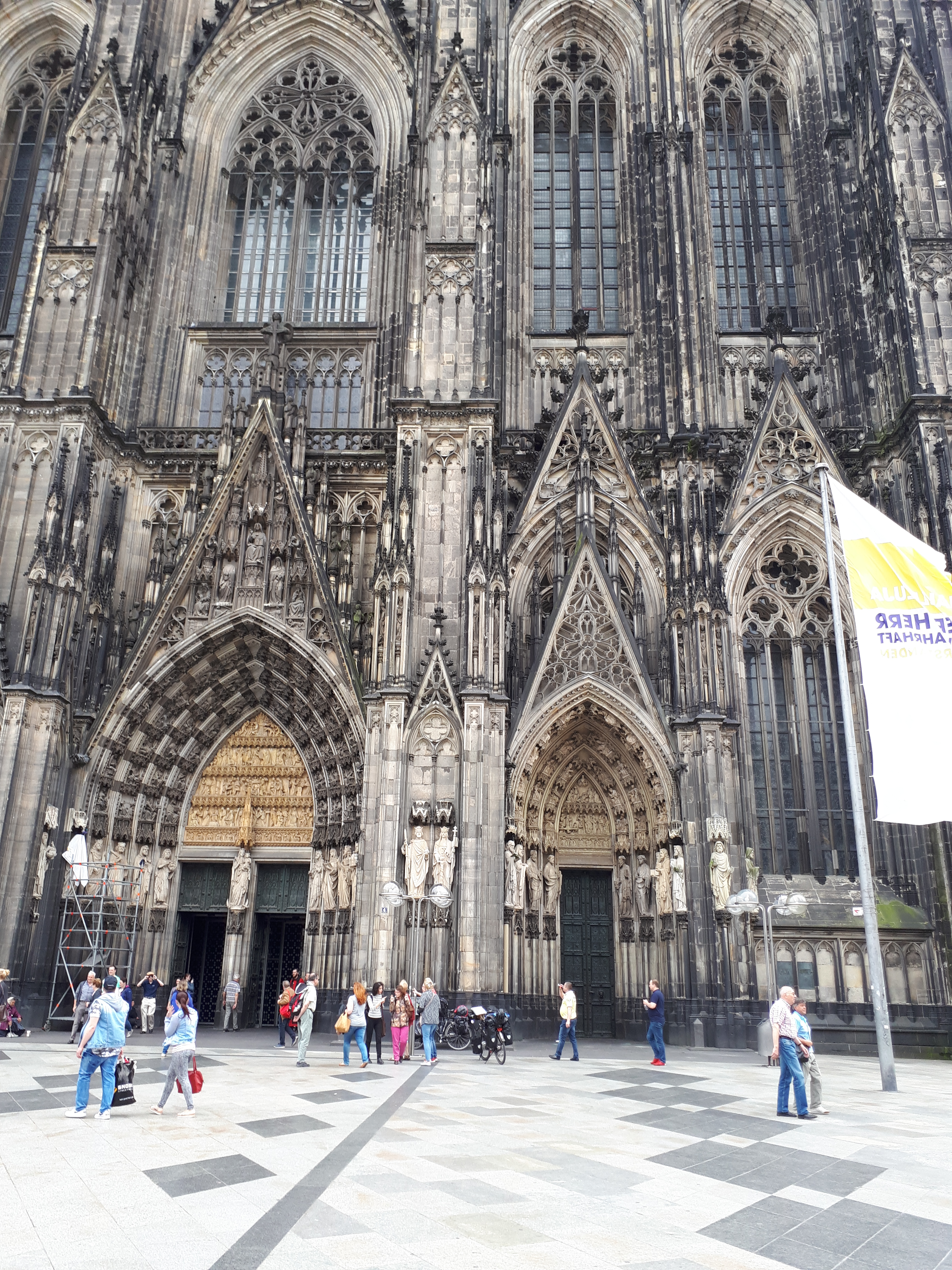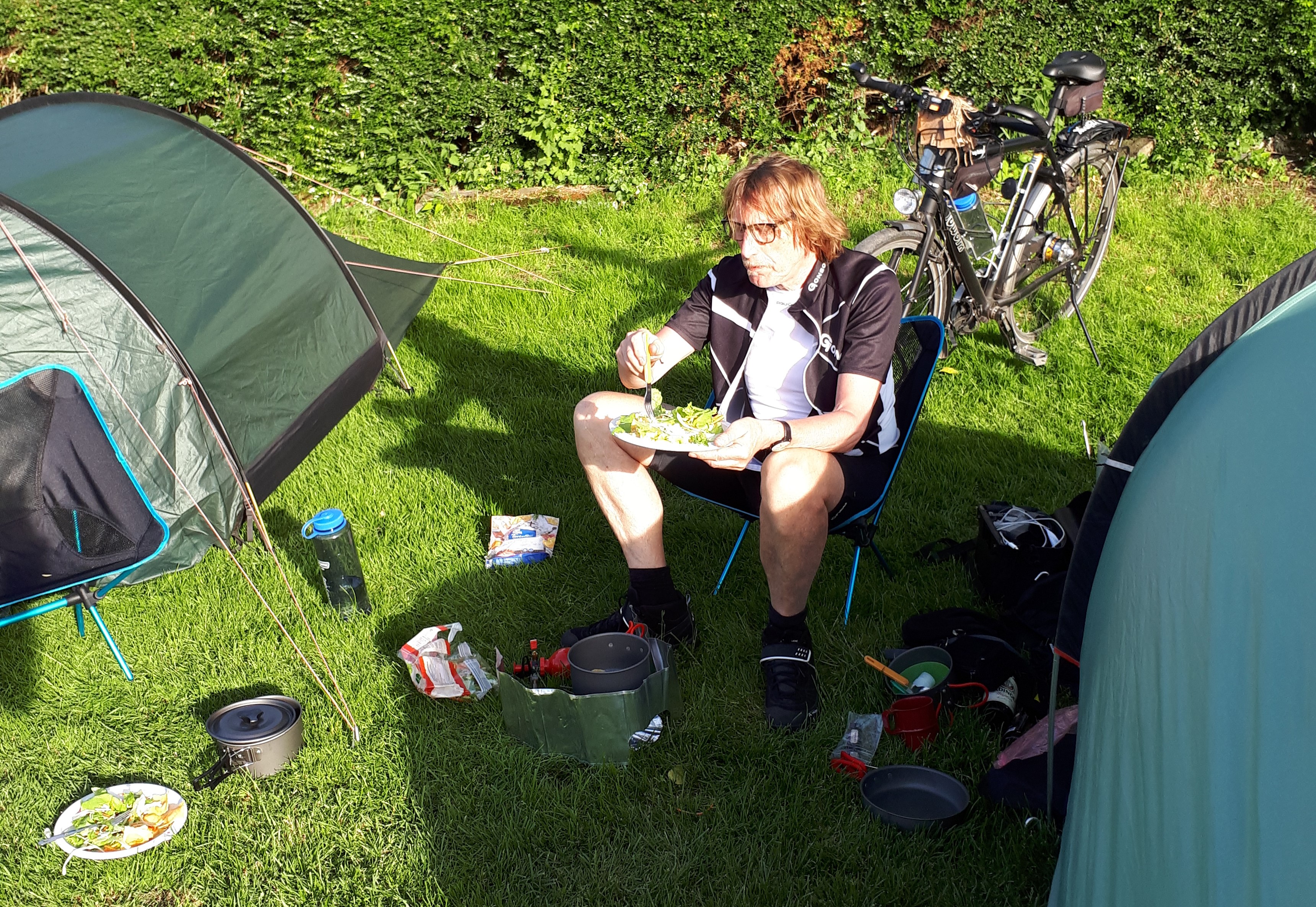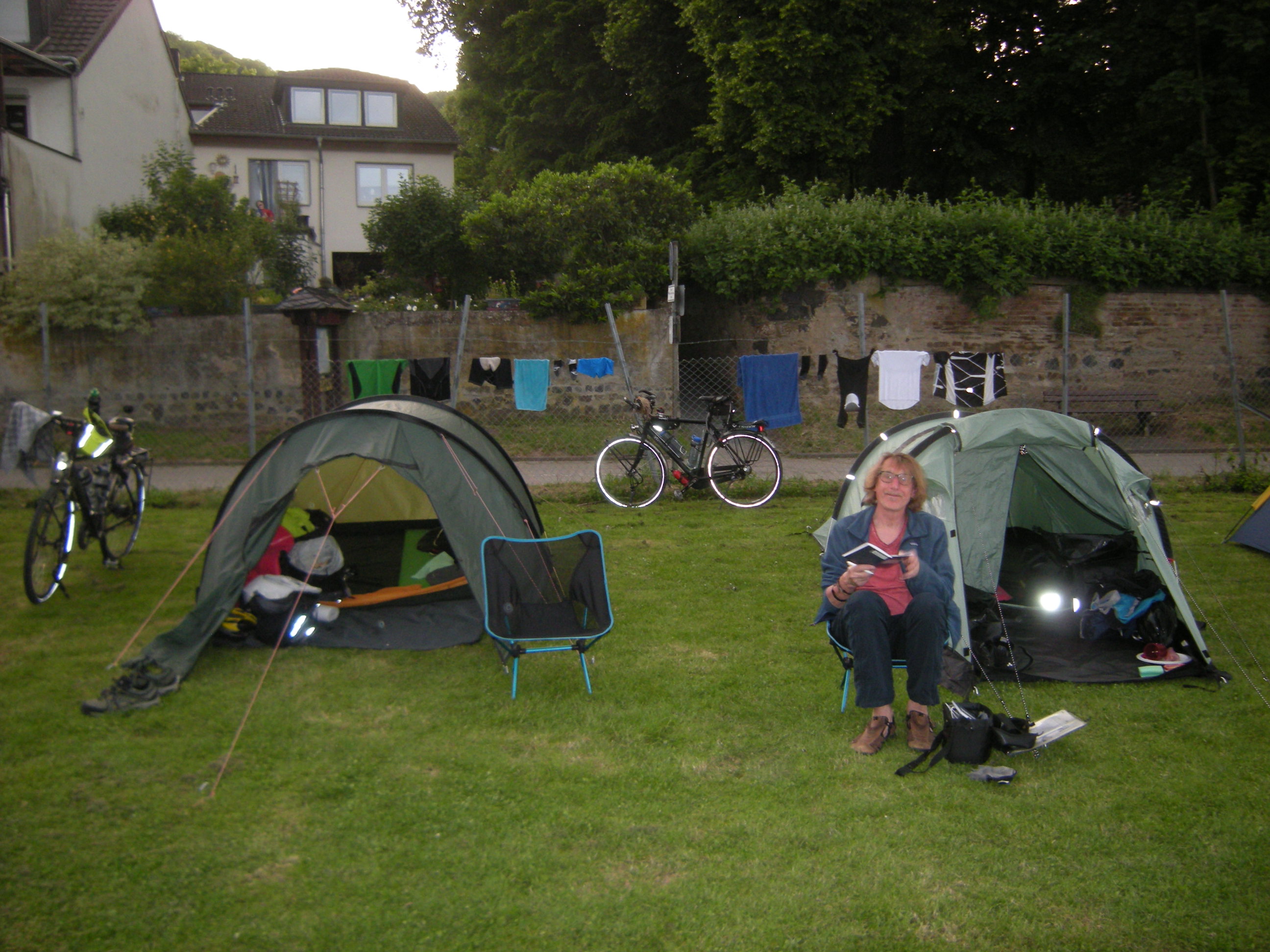 Mijn eerste tentovernachting is goed gelukt. Het is altijd wel weer even wennen om op een dun matrasje te slapen en dus ben ik wel een paar keer wakker geworden. Om half acht als we opstaan ben ik toch redelijk goed uitgerust. Het in- en bepakken is nog geen automatisme. Om kwart voor 10 zijn we op pad. We spreken af tussendoor wat vaker te stoppen voor een drankje of wat te eten. Onze eerste stop is bij de dom in Keulen waar we koffie gaan drinken en even de Dom gaan bekijken. Even voorbij Keulen doen we onze inkopen voor de lunch en ook al voor het avondeten. Er is helaas nog steeds veel industrie. Af en toe fietsen we wat dichter tegen de rijn aan. Bij Bonn eten we nog een banaantje en zijn daarna eindelijk het Ruhrgebied uit en gaan we het Siebengebirge in. Het landschap begint al een beetje te glooien en is dus meteen veel mooier. In Rolandswerth vinden we onze camping. Met de in Keulen gekochte spullen proberen we een goede maaltijd te koken maar dat valt een beetje tegen. Morgen beter opletten wat we kopen tenminste als de winkels open zijn, want morgen is het, jawohl, Himmelfahrtstag !!