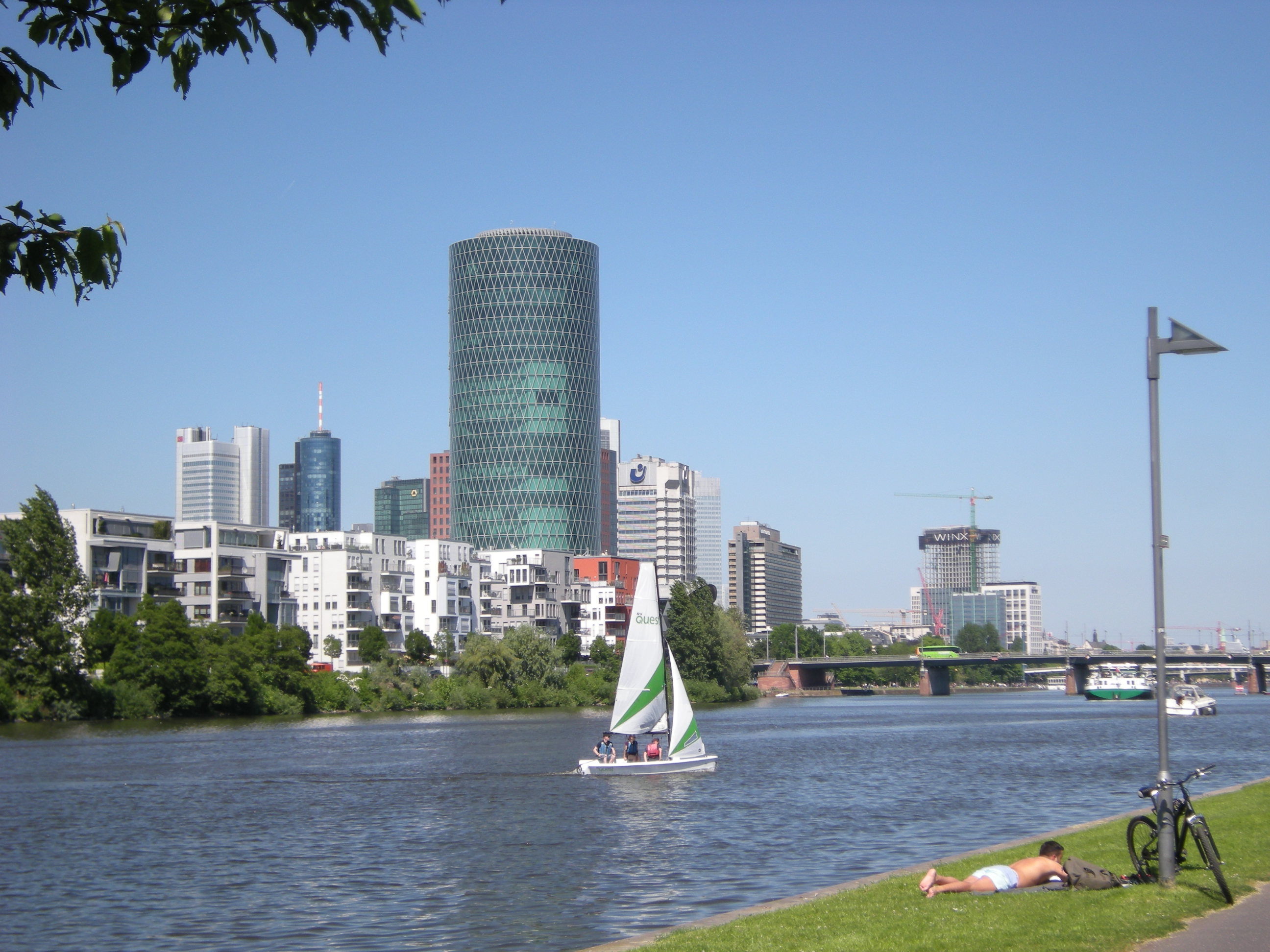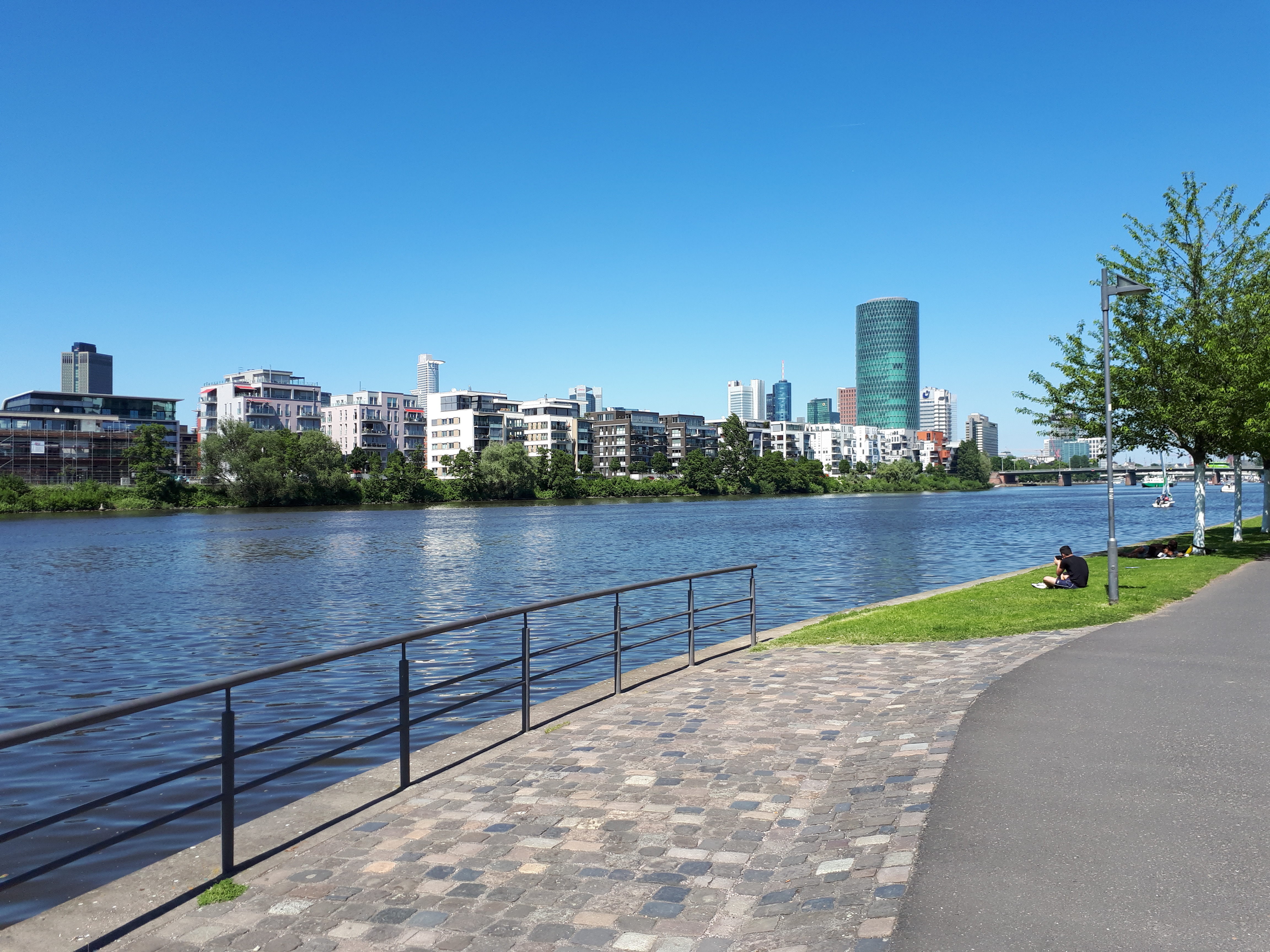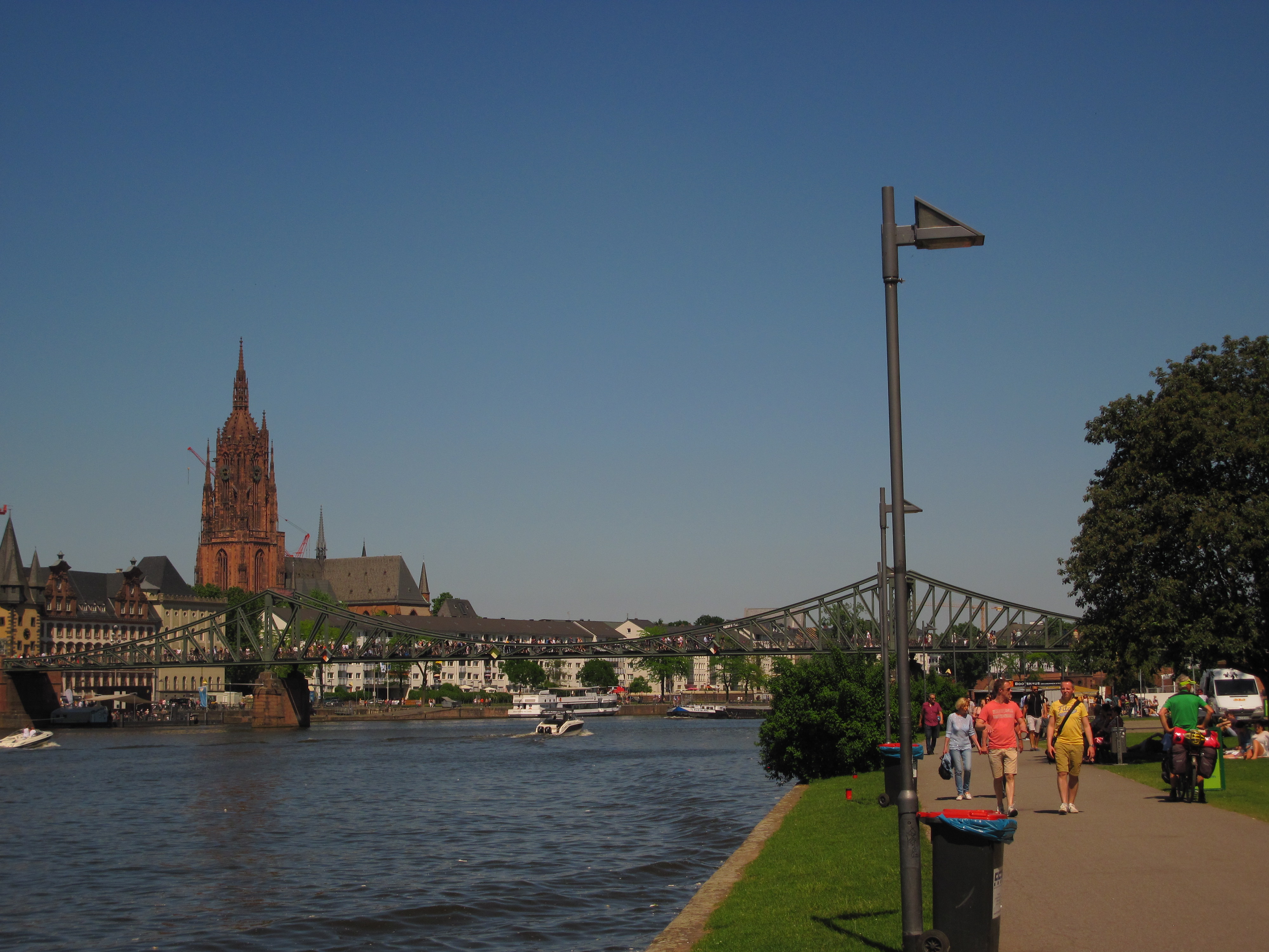 We fietsen vandaag weer veel langs het water. Eerst nog tot Mainz langs de Rein en vanaf Mainz langs de Main. Het is opnieuw een hele mooie route die gelukkig, omdat de zon er weer flink zin in heeft, voor een groot gedeelte door een bosrijke omgeving gaat. We fietsen langs Frankfurt maar wel aan de overkant van de Main. Het is er heel druk op het fietspad in verband met Bundesliga roeiwedstrijden op de Main. Er liggen veel grote 8- persoons roeiboten in het water en op de oever zijn er veel terrasjes en eettentjes. Het leek wel wat op een openluchtbeurs. Op onze volbepakte fietsen slingeren we ons door het rondwandelende publiek. Even voorbij de drukte komen we in Offenbach waar we in de wijk Bürgel gaan kamperen. Terwijl we nog druk bezig zijn met het opzetten van de tentjes is erbij de buren ineens een hoopgedoe. Een jongen die behoorlijk onder invloed is van waarschijnlijk drugs en/of alcohol valt voor hun kampeerbusjes op de grond. Hij kan niet meer op zijn benen staan. Tegen de buren brabbelt hij dat hij “unser Freund ist”!! Zij kijken ons vragend aan maar merken dan toch wel dat wij de jongeman absoluut niet kennen en roepen er de eigenaresse van de camping bij. Die stuurt de jongeman weg en dat wil hij wel doen maar hij kan niet meer op zijn benen staan en valt met zijn fiets midden op de straat hard tegen de grond.Uiteindelijk moet de Notdienst er aan te pas komen en wordt hij met een busje afgevoerd. Voor onze boodschappen hoeven we maar even via een houten brug de Main over te steken en dan zijn we al bij een supermarkt. Omdat er morgen,zondag, geen winkels open zijn slaan we voor 2 dagen in. Na het eten gaan we nog even naar het campingterras voor een biertje en een Radler. We horen een gezelschap Nederlands praten. Ze hebben onze volgepakte fietsen gezien en zijn nieuwsgierig naar onze plannen. We schuiven bij ze aan en praten over hun en onze bezigheden. De schippersvrouw, een oud-Hulselse vertelt dat ze in een caravan op de camping wonen en van daaruit als schipper en kok op een party- rondvaartboot in Frankfurt werken. Wij vertellen over onze fietsplannen. Ze zijn onder de indruk en willen daar onder het genot van nog meer bier nog wel even met ons over kletsen. Voor ons is het echter al weer bedtijd dus bedanken we vriendelijk voor het aanbod en zoeken onze slaapzakken op.