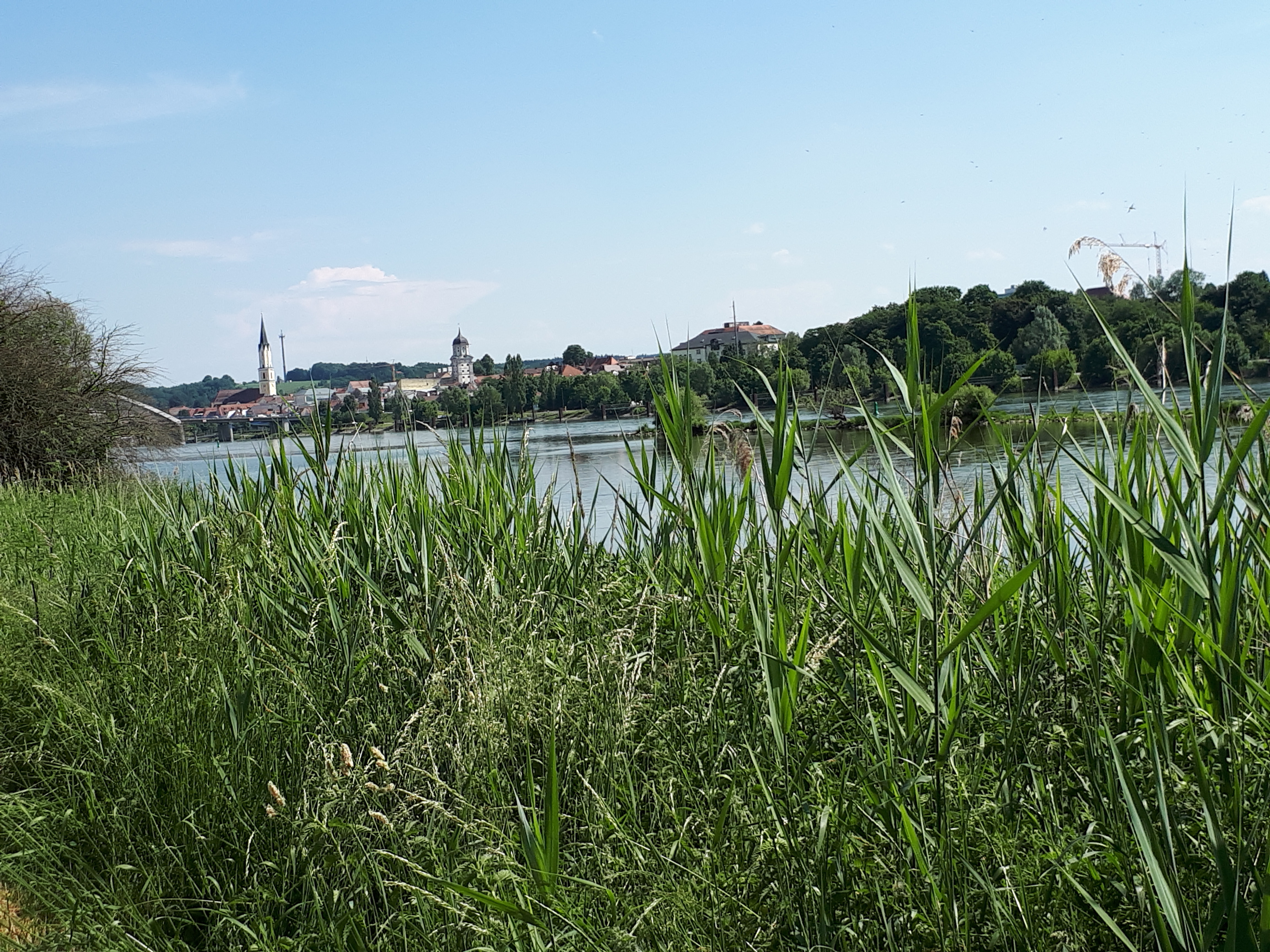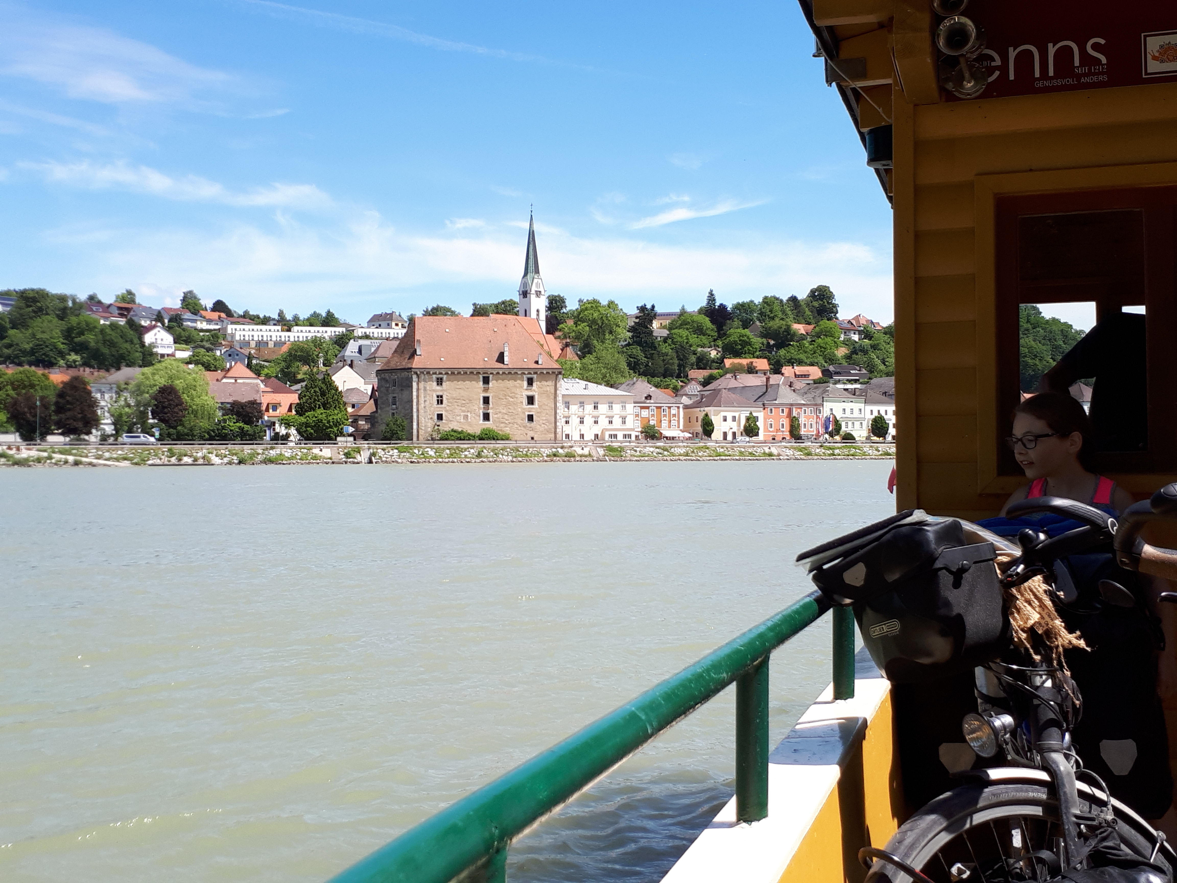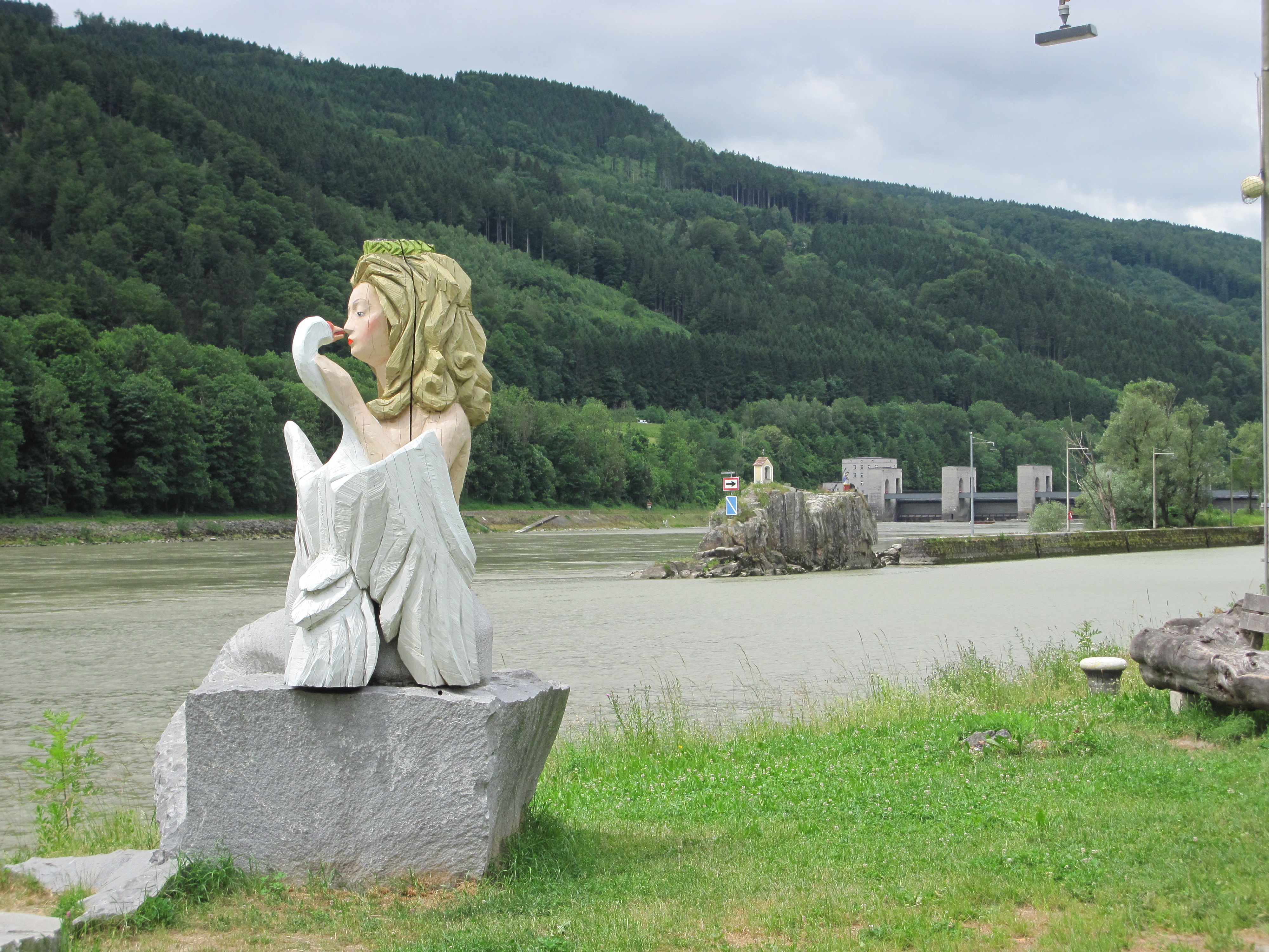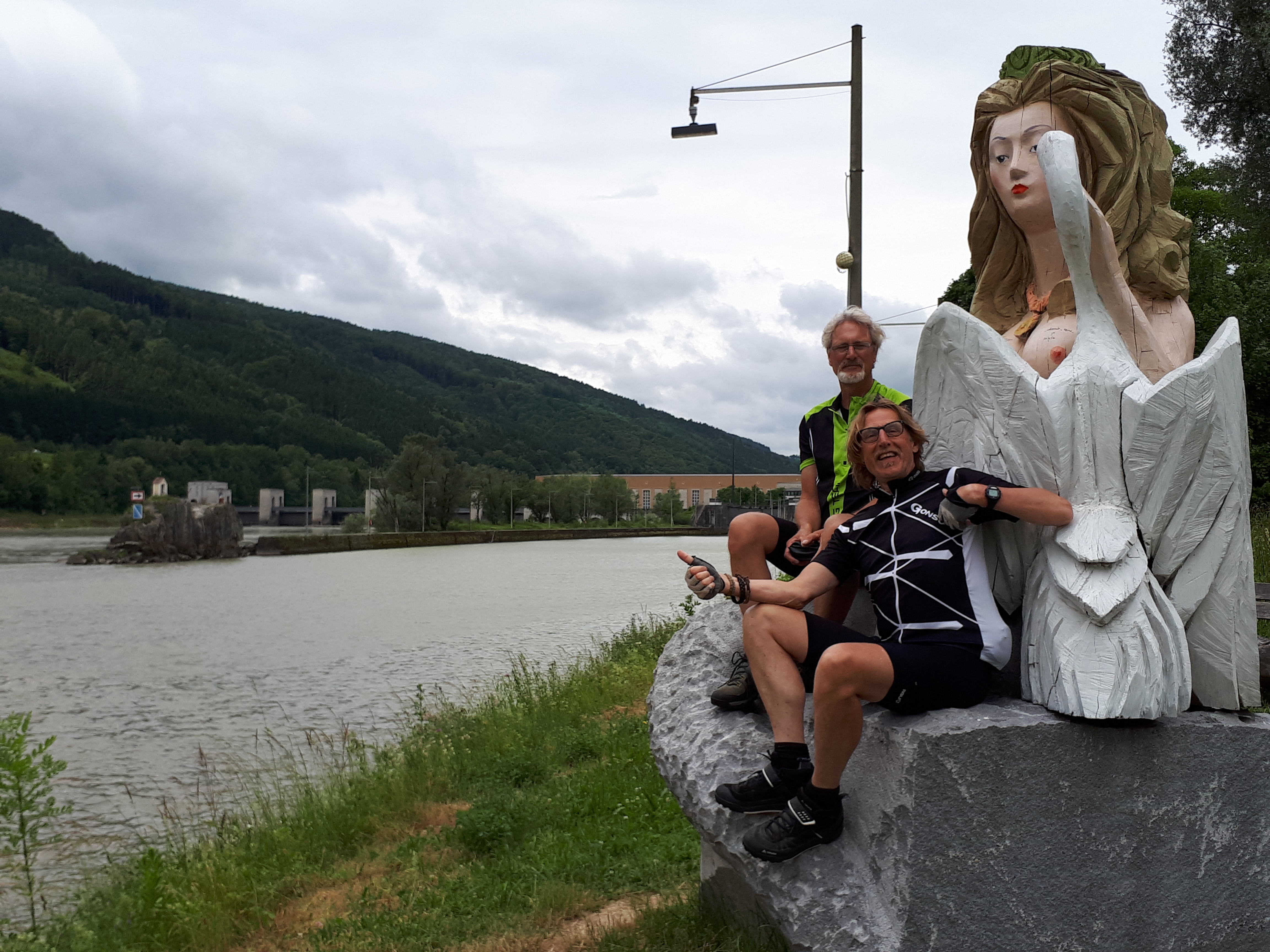 Wytze heeft niet lekker geslapen op zijn nieuwe bedje. Hij moet nog wennen aan het nieuwe ding en was bovendien al vroeg wakker omdat de buren al vroeg aan het inpakken waren. Hij hoort elk geluidje en raakt daardoor zo geïrriteerd dat hij niet meer aan slapen toekomt.Ook wij staan dan maar vroeg op en zijn dus mooi op tijd weg. De buurman zwaait ons hoofdschuddend na en roept: “Respect, respect!!! Na zo’n 13 km komen we in Passau aan. Omdat we gisteren Regensburg ook al niet bezocht hebben en we dacht ik afgesproken hadden dat we wel even naar het centrum van Passau zouden fietsen, fiets ik de weg naar het centrum in. De bestrating van die weg is echter van kinderkopjes gemaakt en dat is voor Wytze in combinatie met zijn slechte nachtrust toch iets te veel van het slechte. Hij wil zo snel mogelijk terug naar het fietspad bij de Donau en niet meer naar het centrum. Okay! Jammer! Ik had graag even door het centrum gefietst en daar wat rondgekeken en op een terrasje een kopje koffie gedronken, maar het humeur van mijn fietsmaatje staat het helaas niet toe. Dus dan maar zo snel mogelijk naar de brug om de Donau over te steken. Even lijkt het oversteken niet mogelijk vanwege werkzaamheden aan de brug maar gelukkig is er voor fietsers toch nog een smal paadje vrijgehouden. Ik herken de weg nog wel van vorig jaar toen ik er met Peet aan de fietsvakantie naar Hongarije begon, maar dat we zo lang langs een drukke weg moesten fietsen ben ik alweer vergeten. Omdat er geen koffie was in Passau proberen we die ergens langs de route op te doen. Helaas valt dat nog niet zo mee omdat de terrassen nog niet open zijn. Het is vandaag Pinksteren dus daarom zijn ze wellicht wat later open? We fietsen een nog niet open terras op. Gelukkig zijn ze bereid om voor ons de openingstijd wat aan te passen en de koffie aan te zetten. “Waarom zijn er toch zo weinig fietsers op de route?” vragen we aan de serveerster. Ze wijdt het aan de harde wind. Het waait wel wat maar voor ons is het mooi fietsweer. Onderweg naar de Oostenrijkse grens die verder van Passau ligt dan ik dacht passeren we Sisi, de waternimf. We gaan op het beeld zitten en zijn selfie’s aan het maken als er een jong Australisch stel naar ons toe komt lopen. Ze zien onze fietsen en zijn heel benieuwd naar onze fietsplannen. Het meisje vindt alles awsome en zet ons samen met de nimf op de foto. En dan zijn we ineens in Oostenrijk. Een klein opeen boom gespijkerd bordje is alles wat de landswisseling kenbaar maakt. Na het passeren van de grens loopt de prachtige route vlak langs de Donau. Bij Schlögen steken we met een klein pontje de Donau over en eten daar op een bankje onder het genot van een prachtig uitzicht onze lunch op. De lucht betrekt echter vrij snel en even later voelen we de eerste druppels van onze tocht. De regenjassen moeten aan. We fietsen nog wel even verder maar dan schuilen we toch maar even onder het overstek van een boerderij. Daarna blijft het nog een hele tijd druilerig. De omgeving is er echter zo mooi dat daar geen regenbuitje iets aan kan bederven. Bij Ottensheim steken we met een hele oude Kabeldrahtboot de Donau weer over. Ik herken de overkant meteen. “Daar hebben we vorig jaar gegeten” en “ik weet nu ook de weg naar de camping”. We rijden recht naar de camping toe. Er is niets veranderd en ook nu is er niemand bij de boerderij om ons aan te melden, dus doen we dat morgenvroeg wel. We zetten onze tentjes precies op dezelfde plaats neer als waar ik vorig jaar met Peet kampeerde. Alles wat we nog aan etenswaren bij ons hebben eten we op.