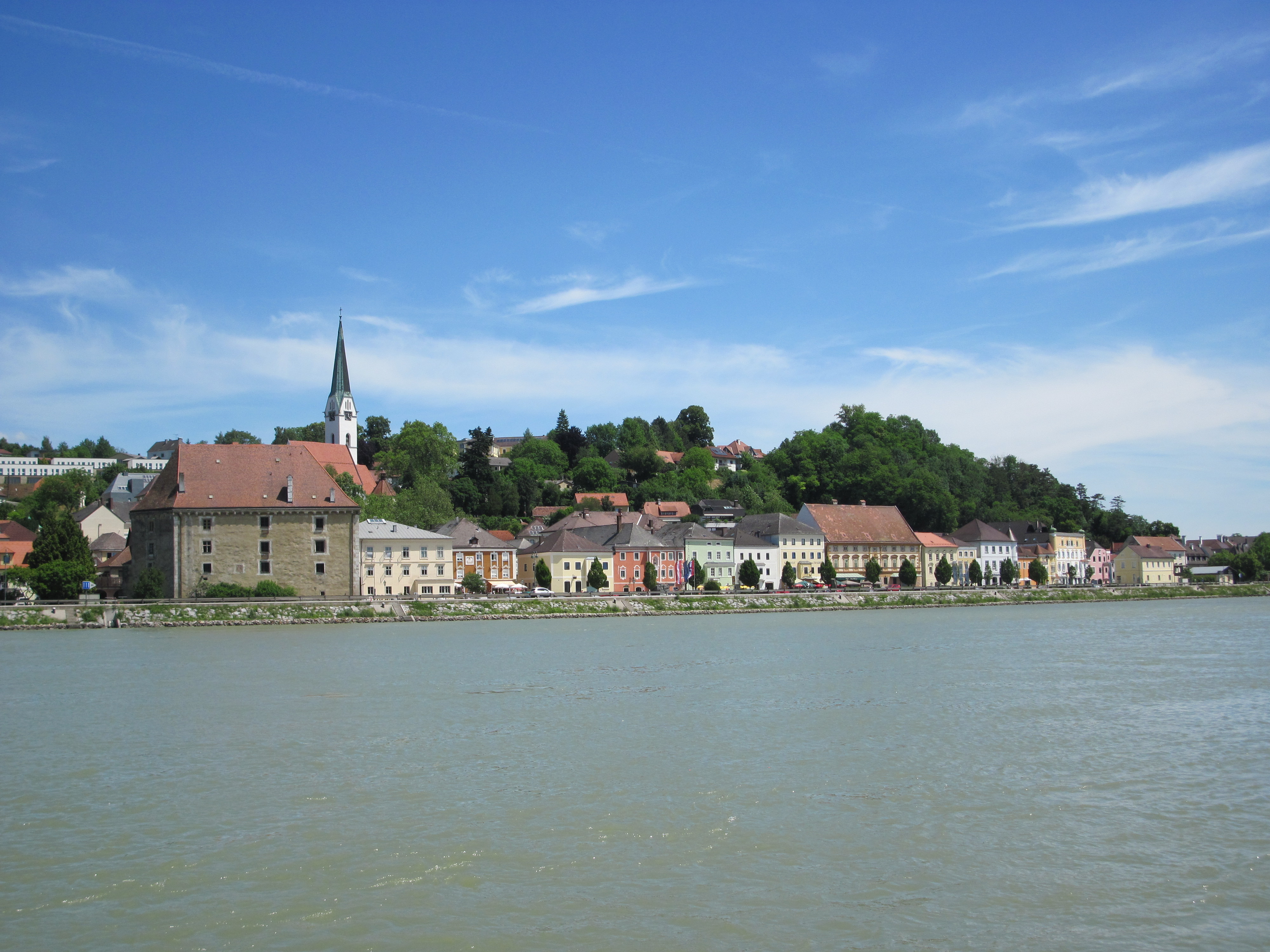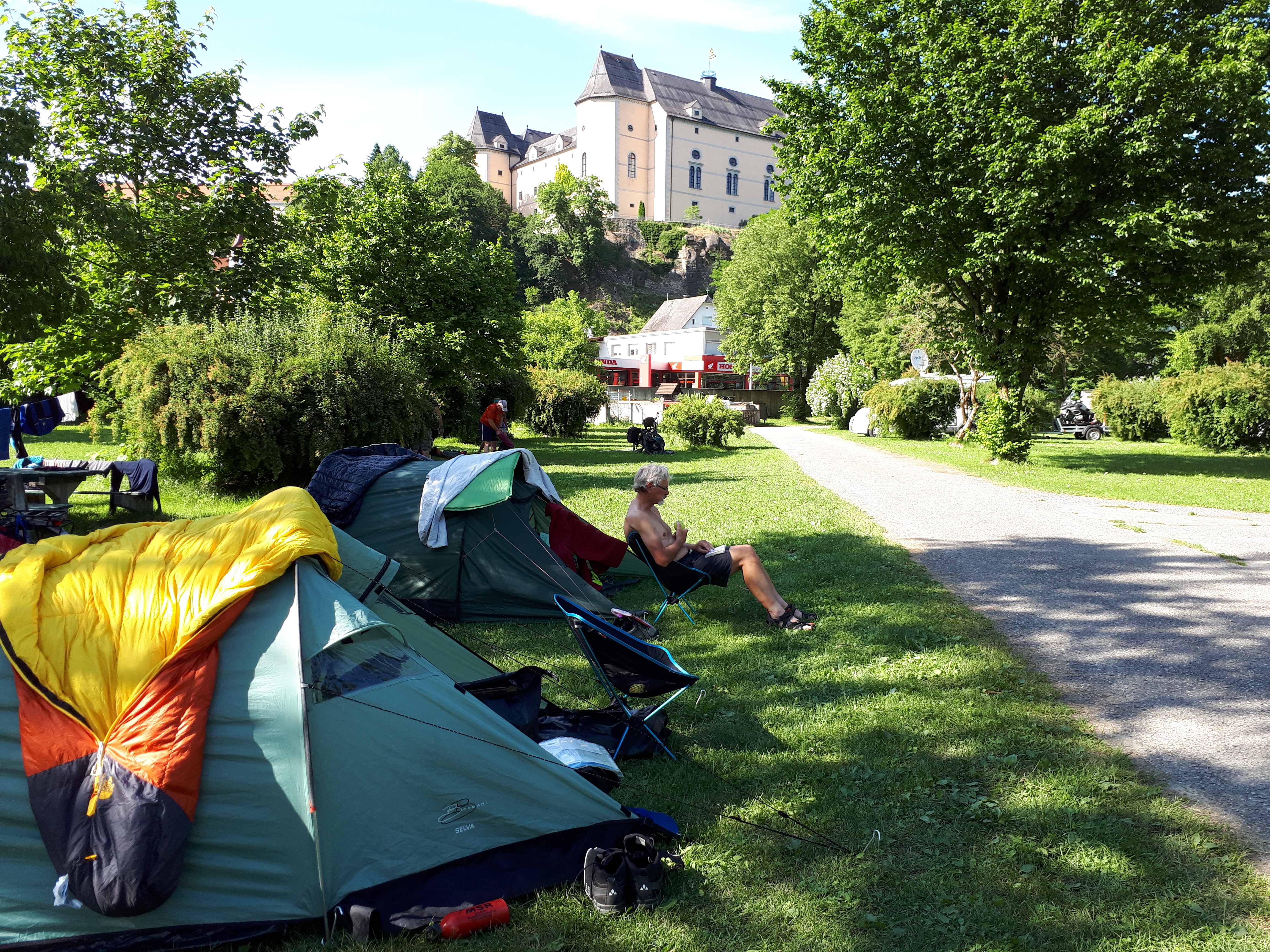 Ook vandaag zijn we alweer vroeg wakker. We hebben gisteren alles opgegeten dus is er geen ontbijt en ook op de camping is er niets te koop. Het meisje op de receptie waar we de overnachting mee afrekenen denkt dat er in het dorp ook niets open zal zijn en stuurt ons door naar een pompstation iets voorbij het dorp. Met een lege maag fietsen we dus het kampeerterrein af. Als we bij de kerk in het dorp aankomen zitten er warempel al mensen op het terraswaar ik vorig jaar met Peet ontbeten heb te eten. Ik parkeer meteen mijn fietsen we bestellen daar dan een heerlijk ontbijt met broodjes, kaas, ham, jam,honing, ei en nog wat rauwkost. Zo luxe hebben we het al een tijdje niet meer gehad. We lopen nog even de kerk in en beginnen dan aan de tocht voor vandaag. Na een half uur komen we langs de benzinepomp waar het meisje van de receptie het over had met daarbij een Sparwinkel. Alles wat we maar nodig hebben voor een goede lunch slaan we daar in. Terwijl we de heuvels uitrijden zien we de volgende heuvelrug al dichterbij komen. Bij een kiosk eten we onze lunch op en leggen even later nog bij een kapelletje aan voor een daar verkrijgbare “verlängerte” koffie. Wytze wil niet over Mauthausen dus nemen we de alternatieve route over Enns. We komen echter ook niet in Enns maar pakken een binnendoortje naar Enghagen en komen dan weer bij het pontje uit dat ons over de Donau toch weer naar Mauthausen brengt. Om half 4 zijn we al op de camping in Grein waar ik vorig jaar met Peet ook gekampeerd heb. Het is wasdag vandaag.Met een beetje hulp van zon en wind, en beide zijn er vandaag, hebben we dan voor de donker alles nog droog en gestreken. We slapen vandaag in Grein onder het kasteel.