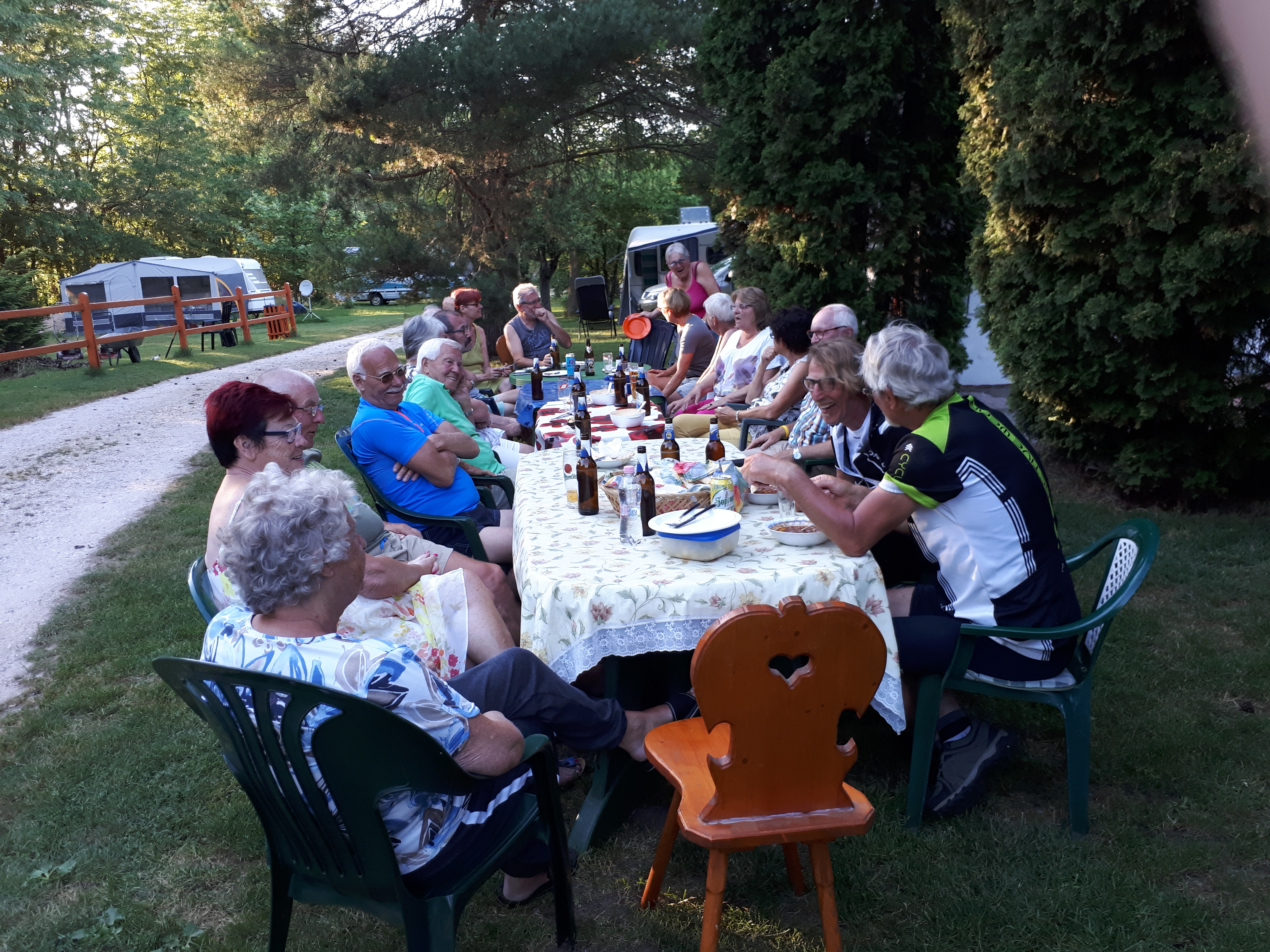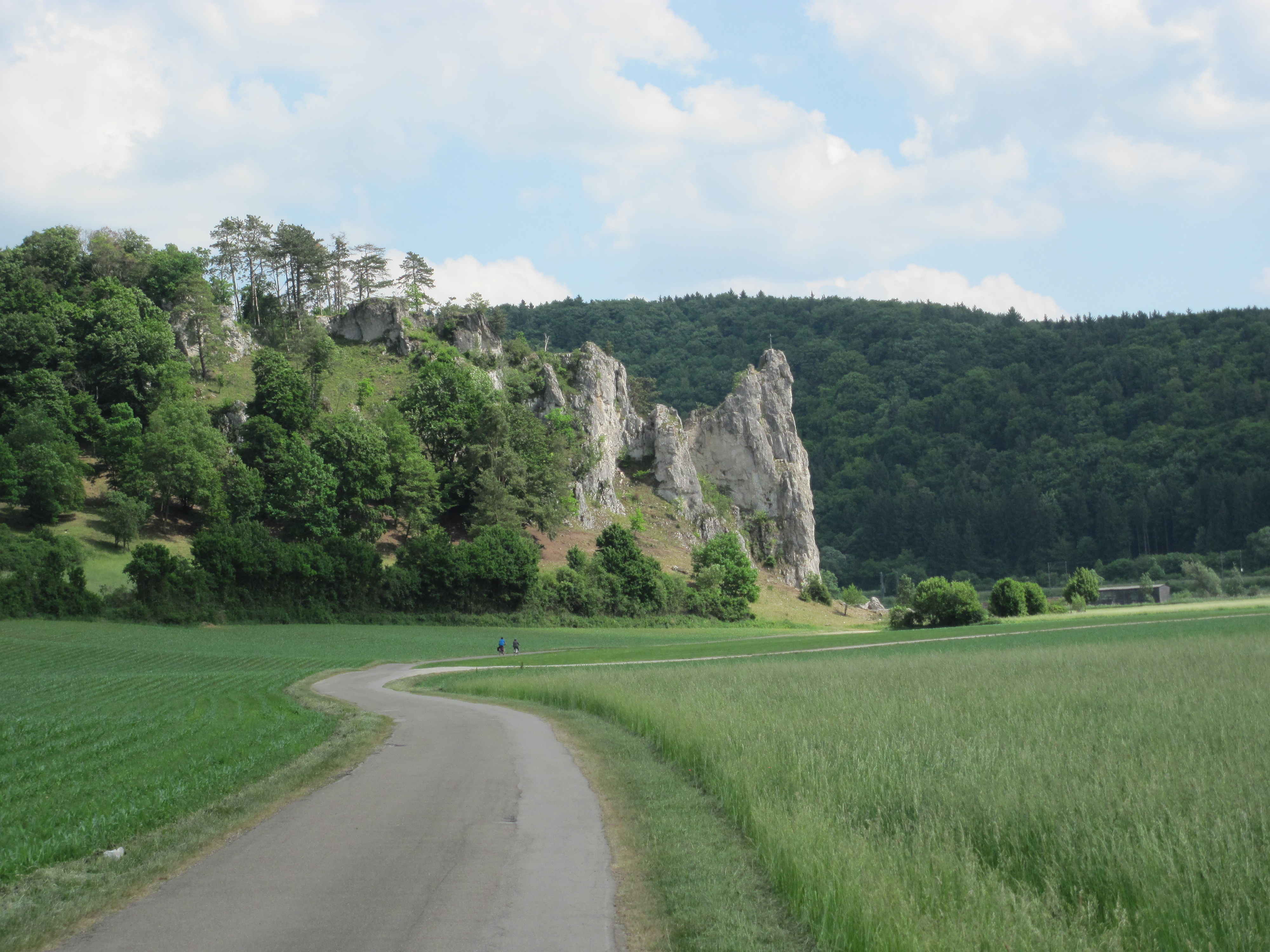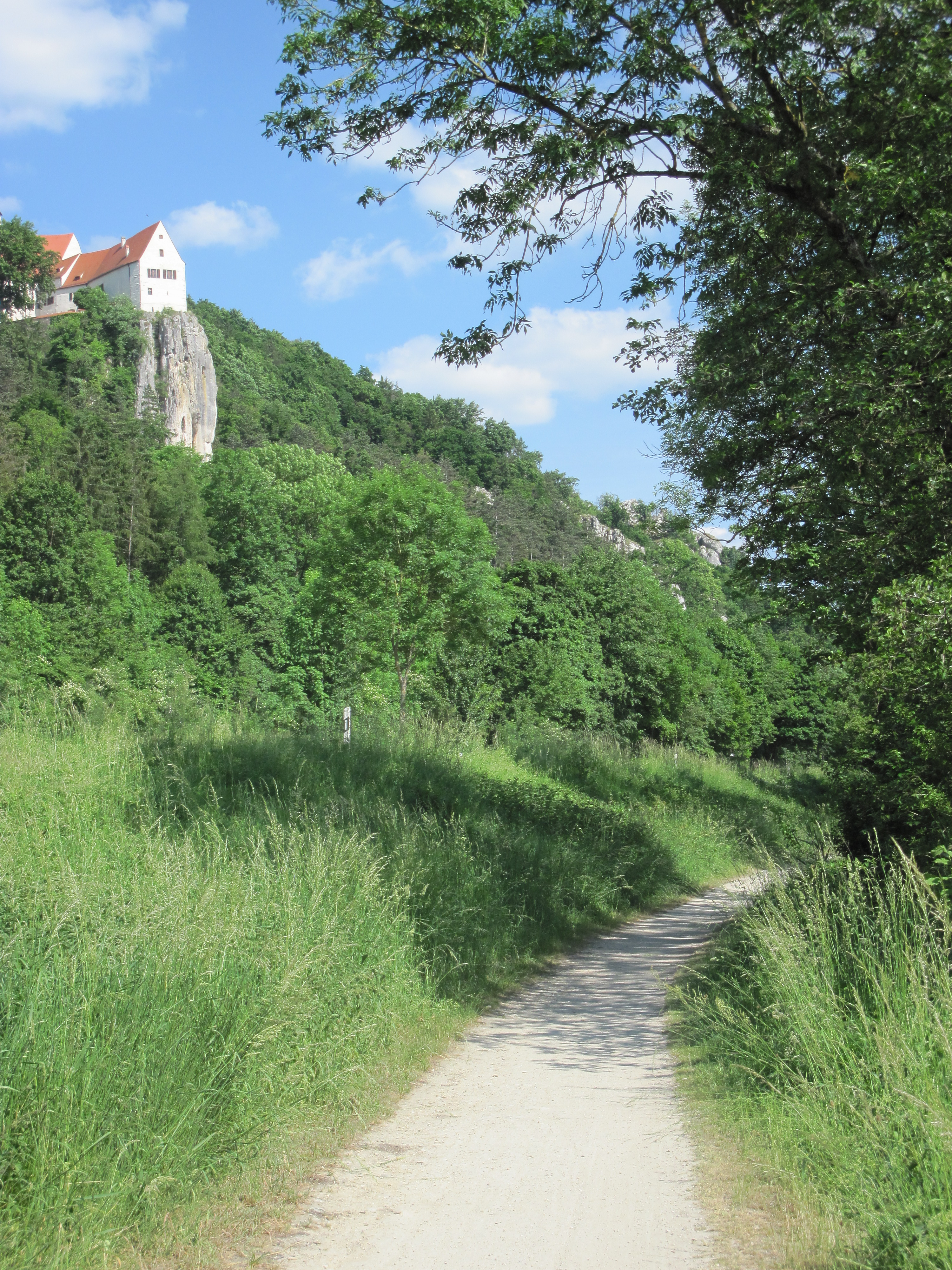 Lekker geslapen vannacht. We zijn al vroeg wakker maar toch is het al half 10 voor we onze route langs de Altmühl weer voortzetten. We fietsen veel over gravelpaden en klimmen af en toe over korte steile klimmetjes. Het is feest vandaag! Wytze en Catrien zijn vandaag precies 44 jaar getrouwd en dat gaan we vieren. Om elf uur zitten we op een terrasje met een warme Apfelstrudel, bolletje ijs en grote tassen koffie. Lekker! Alles is lekker vandaag. We sturen een foto van deze traktatie vergezeld van de felicitaties op naar Catrien. We rijden daarna de hele dag door een breed dal dat zich tussen de heuvelruggen door slingert. De natuur wordt iets ruiger met hier en daar mooie uitstekende rotspunten waarop dan een oude burcht prijkt. Zo ook in Prunn, dat voor vandaag onze eindbestemming is. We kamperen zowat onder de burcht op een boerderijcamping. Qua sanitair een beetje oude meuk allemaal, maar wel heel mooi gelegen aan het kanaal dat de Altmühl verbindt met de Donau. Bij het douchen laat ik mijn horloge van de wastafel vallen waardoor het glas volledig versplintert. Het horloge kan direct de prullenbak in. Na het eten drinken we nog een lekker pilsje op het 44-jarig huwelijksjubileum van Wytze en Catrien en krijgen we er nog 2 Duitse buren bij die een oefenrondje doen op een tandemtoerfiets. Over het kanaal vaart er af en toe een luidruchtige partyboot. Het Duitse stel sluit onze feestelijke dag af door ons met een mooi accent “Slaap lekker” te wensen.