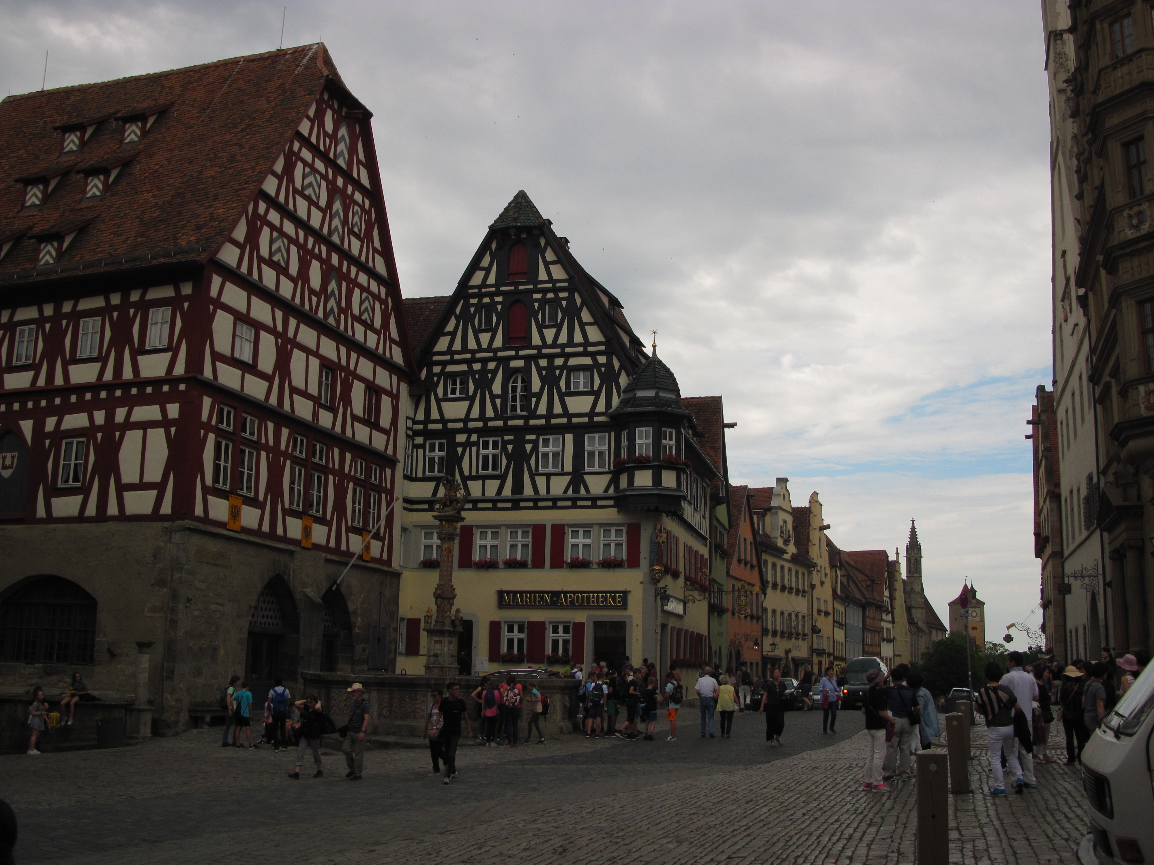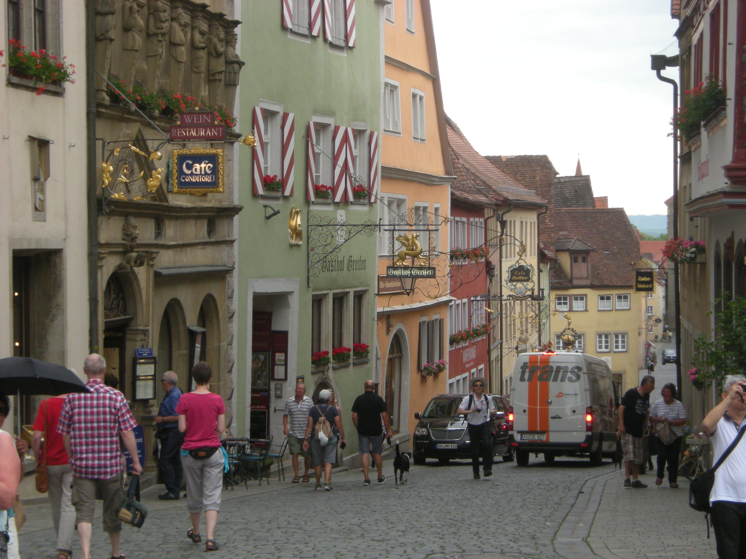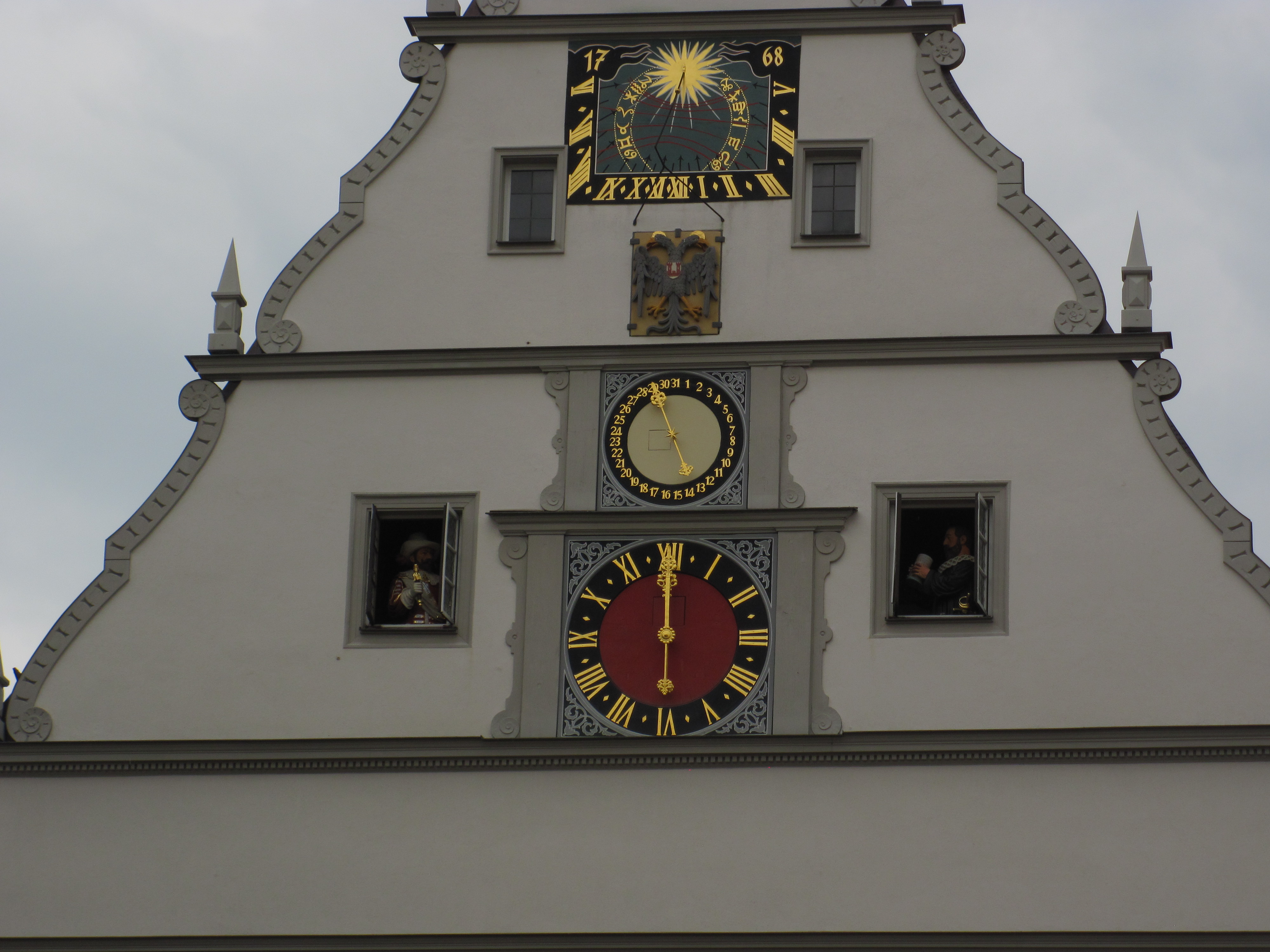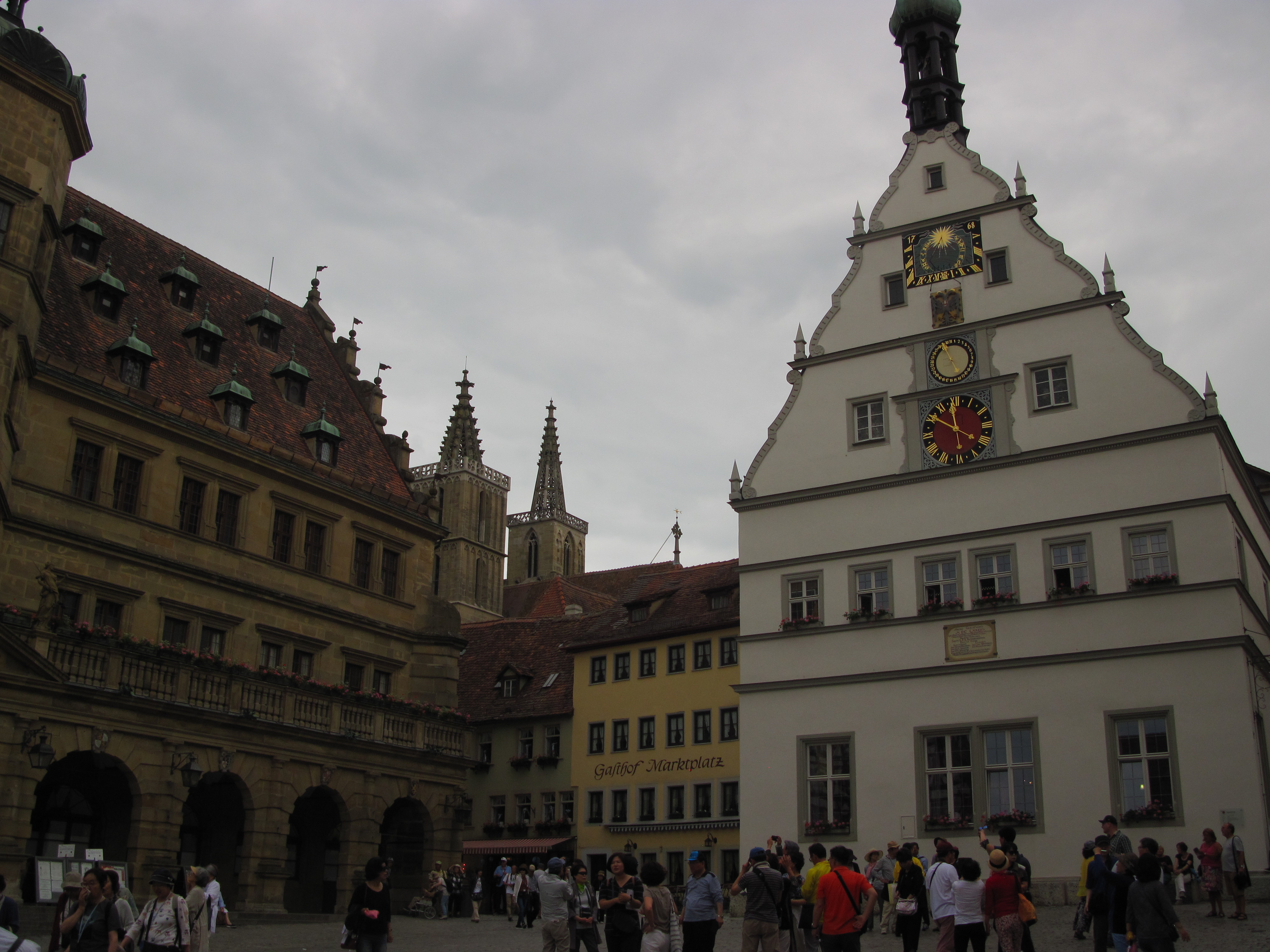 Vannacht hebben we ons eerste buitje op het tentdak en de was gehad. De waterdichtheid van de tenten is goed, maar onze was is dus niet droog. Voor een droge outfit moeten we dus even dieper onze tas in. De dagetappe begint met een aantal flinke klimmen die ons uiteindelijk naar een hoogte van 750 m brengen. In het mooie plaatsje Rothenburg zitten we na wat stevig klimwerk weer op de Limesroute. Het is vandaag gelukkig niet zo warm als de afgelopen dagen. Als we op de Marktplatz in Rothenburg aan de koffie zitten wordt het ineens steeds drukker. Hordes Chinezen met selfiesticks posteren zich op de markt en lijken ergens op te wachten. Om 12 uur weten we wat dat is. De klok slaat en .. dan gaan er links en rechts van de klok ramen open waar een pop achter staat. Wat er achter het linker raam stond weet ik niet meer maar de figuur achter het rechter raam dronk een grote pul bier leeg. Als het schouwspel voorbij is gaande ramen dicht en gaat iedereen weer verder met het bezichtigen van de stad. Wij ook nog even, maar zitten ook alweer snel op onze fietsen. Ondersteund door een lekker rugwindje fietsen we heerlijk door een glooiend landschap langs de mooie groene velden. En zo arriveren we mooi op tijd na 84 km op Camping Herzog aan de Altmühlsee in Günzenhausen,.