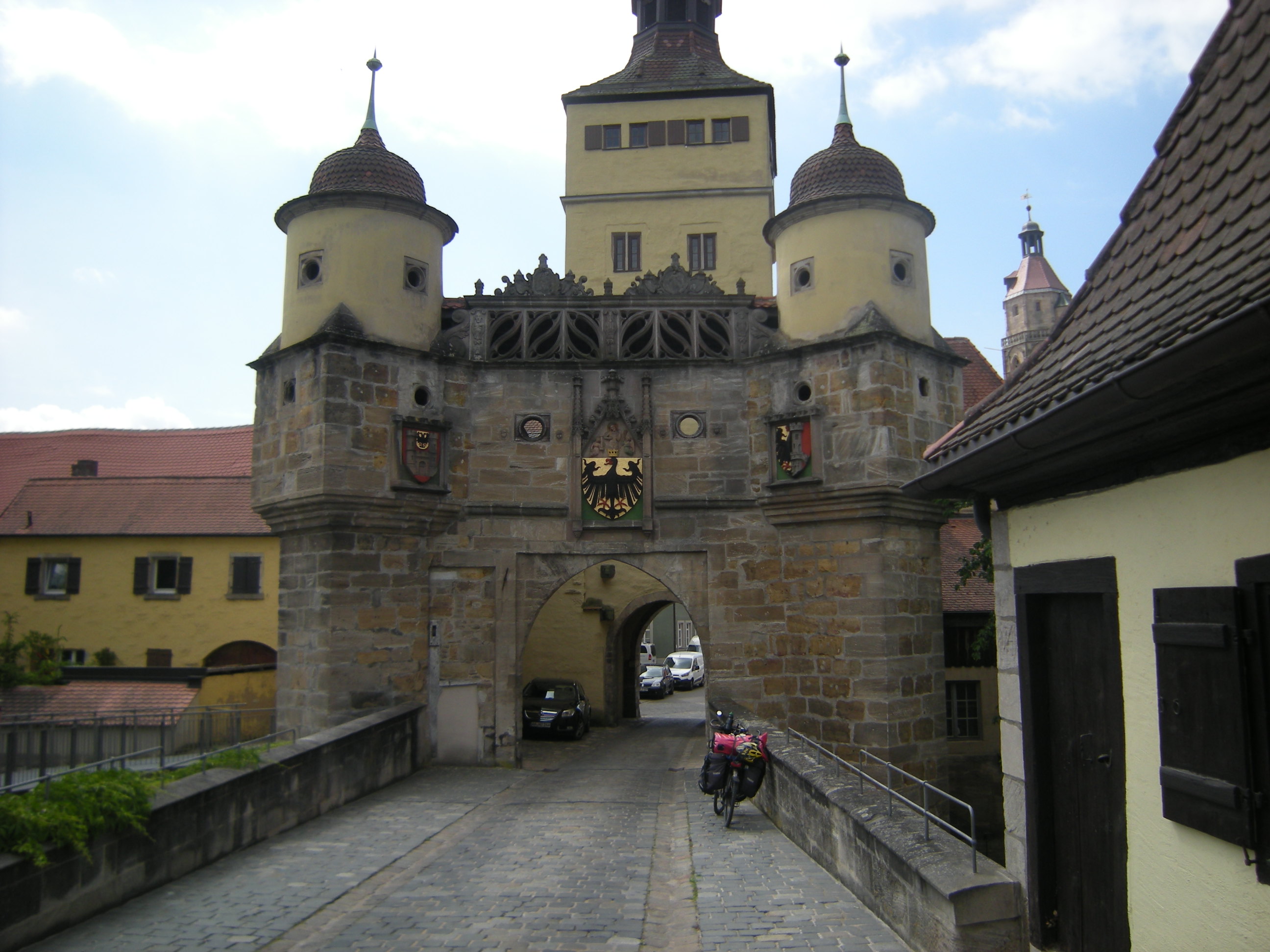 Voor we bij de iets verderop gelegen Lidl ons ontbijt gaan kopen fietsen we nog even terug naar de Altstadt van Miltenberg om nog wat foto’s te maken. Miltenberg is een aardig stadje met oude vakwerkgevels maar de honger naar eten is zo vroeg op de dag toch groter dan die naar cultuur. 1-0 voor de Lidl zullen we maar zeggen. Het Lidl ontbijteten we op een bankje langs de weg op. Na Miltenberg volgen we het dal van de Erfa en krijgen we tot Hardheim onze eerste serieuze klim van 20 km. Wytze klimt duidelijk veel sneller dan ik. Hij probeert tijdens de klim de snelheid erin te houden terwijl ik meer vasthoud aan het trap tempo. Ik lig dan ook al vrij snel zo’n 50m achter. Niet leuk, maar ik beloof mezelf om niet te gaan forceren en mijn zwakke rechter knie niet te zwaar te gaan belasten. Ieder rijdt dus op z’n eigen tempo naar boven. Opnieuw is het weer een hele mooie route. Veel groen koren, maar ook hellingen vol druiven. Om echt van het landschap te kunnen genieten is het echter veel te warm. De 4 liter water die we standaard op de fiets meezeulen, blijken niet genoeg om onze dorst te stillen. De bidons moeten regelmatig bijgevuld worden. Na 92 km eindigt deze warme etappe op een camping in Münster, 3 km voorbij Creglingen dat gelegen is aan de Romantische Straße. Omdat de brander van Wytze niet goed werkt koken we onze avondmaaltijd op 1 pitje. Gaat ook wel maar we zijn wel pas om half 10 als het al donker aan het worden is klaar met eten en afwassen. De lucht betrekt! Zullen we het droog houden vannacht? We nemen ons voor om ’s morgens voortaan eerder te vertrekken.