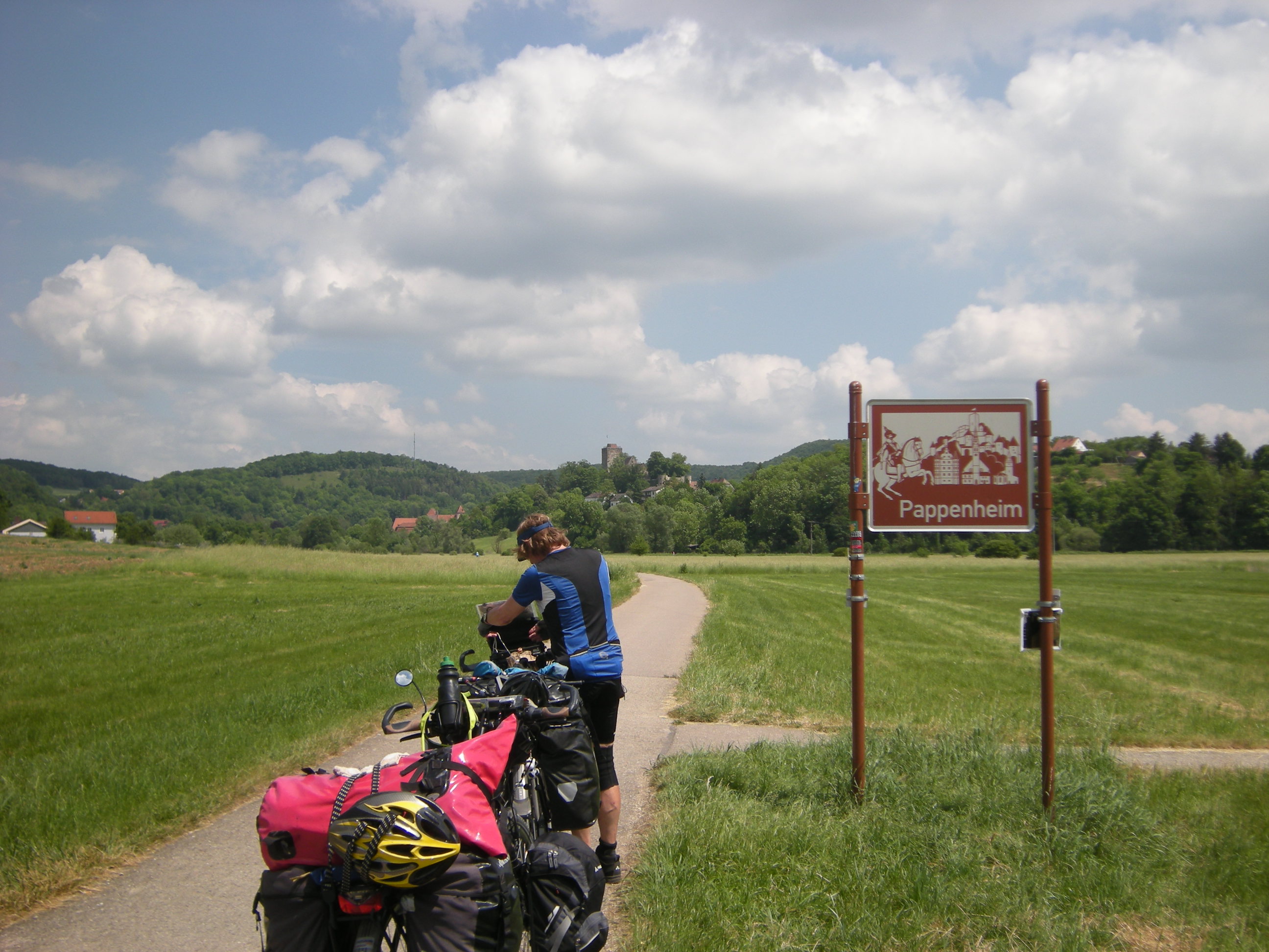 De buren met hun E-fietsen zijn al vroeg aan het rommelen dus ook wij zijn alle twee al vroeg wakker. Om kwart over negen fietsen we de camping al af. Even wat draaien en keren om de route te vinden en te beginnen aan zoals we dachten een vlakke etappe. Maar dat valt toch anders uit. We krijgen meteen 2 stevige klimmetjes voor de wielen en ook een paar ferme afdalingen die ons een snelheid van over de 55 km/uur opleveren. We beginnen de dag met bewolkte luchten. Later op de dag komt de zon weer tevoorschijn. Bij een Aral pompstation proberen we wasbenzine te kopen voor onze brander maar dat kennen en hebben ze niet. Wytze noemt het “Kochbenzin”maar als ik dit in het D-N online woordenboek intype blijkt dat geen Duits woord te zijn. Het is gewoon Waschbenzin. Geen wonder dus. Ik tank daarom maar wat Euro 95 in mijn benzinekruikje. Er kan voor € 0,54 in. Als ik die af ga rekenen kijkt de kassamevrouw verbaasd op. “Wo haben Sie die Benzin eingetan?” “In eine Flasche”: zeg ik. En toen kreeg ik me toch een preek mee. UNVERANTWORTLICH!!! Dat is verboden! Dat mag helemaal niet! U bent zeer onverantwoord bezig! Wat als er kinderen uit die fles gaan drinken?? Sie sind UNVERANTWORTLICH!!! Oei , ze is echt boos op mij. Ik probeer de grote onschuld uit te hangen maar dat heeft geen vat op haar. Blijkbaar is het in Duitsland bij de wet verboden om benzine in een fles te vervoeren. Ik probeer nog te zeggen dat het om een officiële goedgekeurde benzinefles gaat maar dan blijkt mijn Duits toch te zwak om dat goed uit te leggen. Unverantwortlich!! blijft ze maar herhalen. Ik verontschuldig me maar ook dat helpt niet! UNVERANTWORTLICH bin ich und bleib ich. Ik bied nogmaals mijn ongemeend excuus aan en betaal de 54 eurocent. Zo, we kunnen in elk geval weer koken. Door vele mooie, oude goed bewaard gebleven stadjes vervolgen we onze tocht. Er is in Duitsland toch wel veel moois bewaard gebleven. Prachtig. Het laatste deel van de route volgt het riviertje de Altmühl en brengt ons naar Eichstätt. Er is daar aan de oever van het riviertje een simpele camping. Het contrast met de camping van gisteren is groot. De prijs voor een overnachting zowat gelijk. Het zelf gekookte eten smaakt goed al zijn onze pannen wel wat aangekoekt en daardoor voor de rest van hun leven getekend. Tja, …. dat krijg je nou als je je onverantwoord gedraagt.