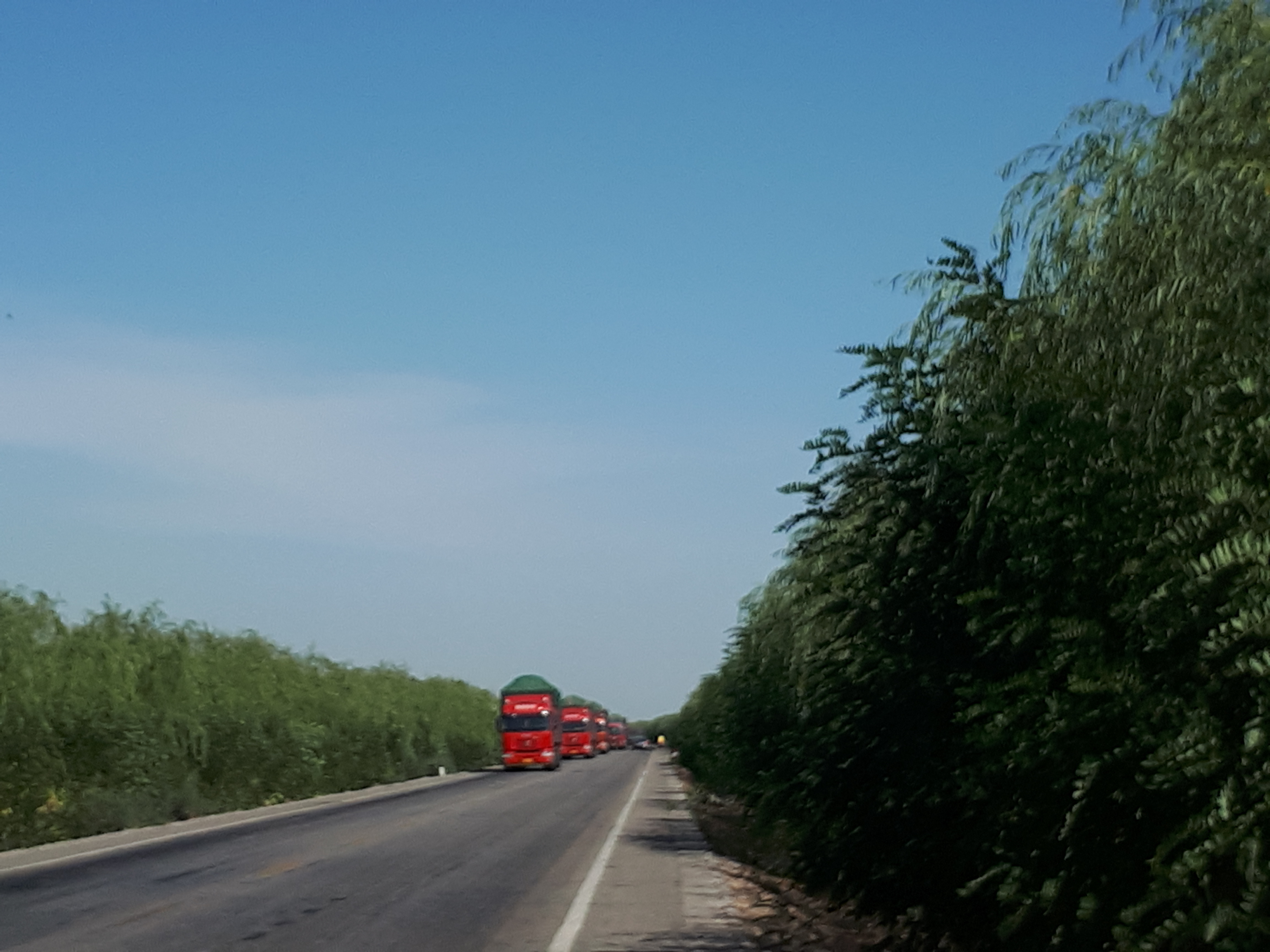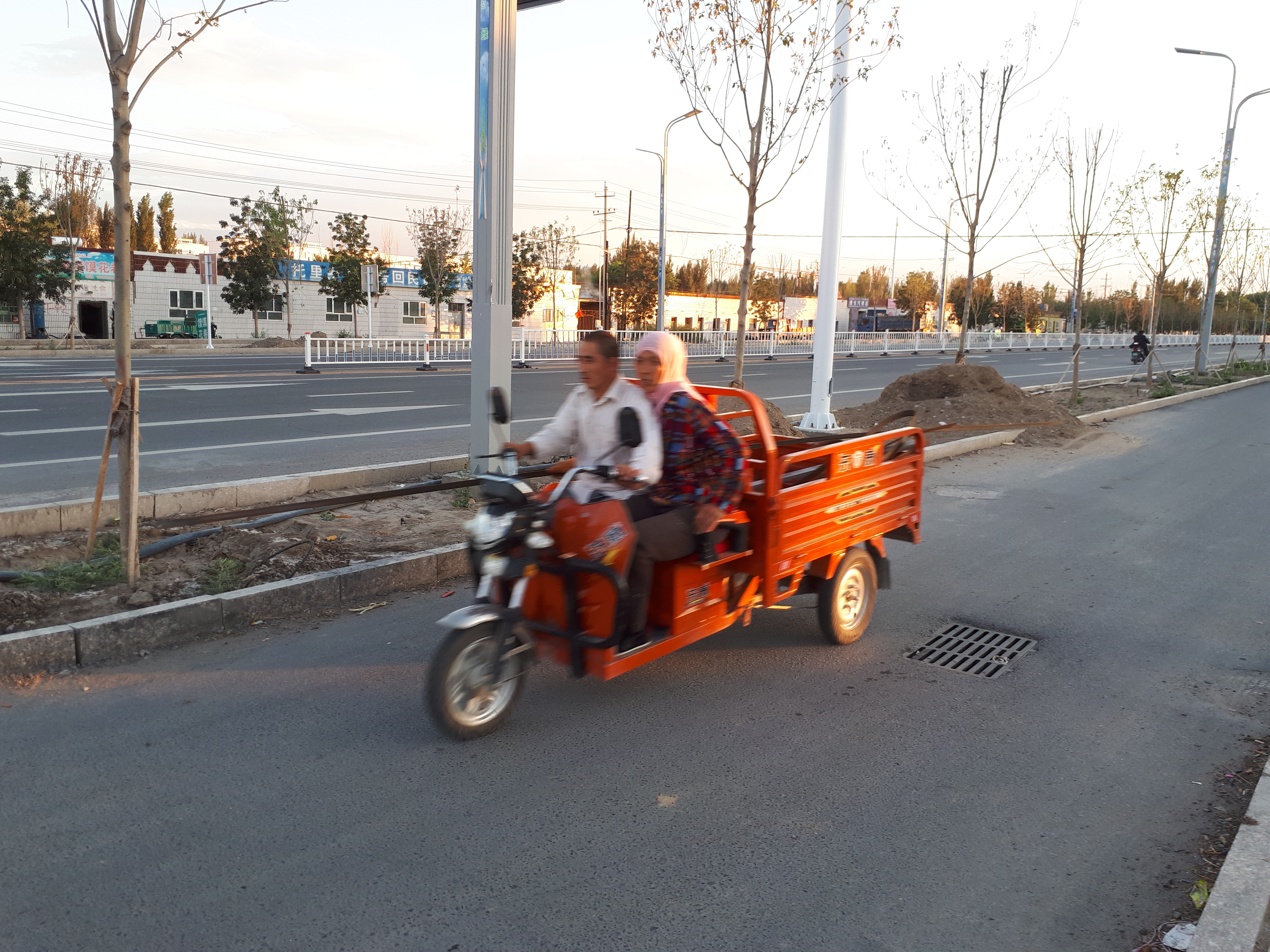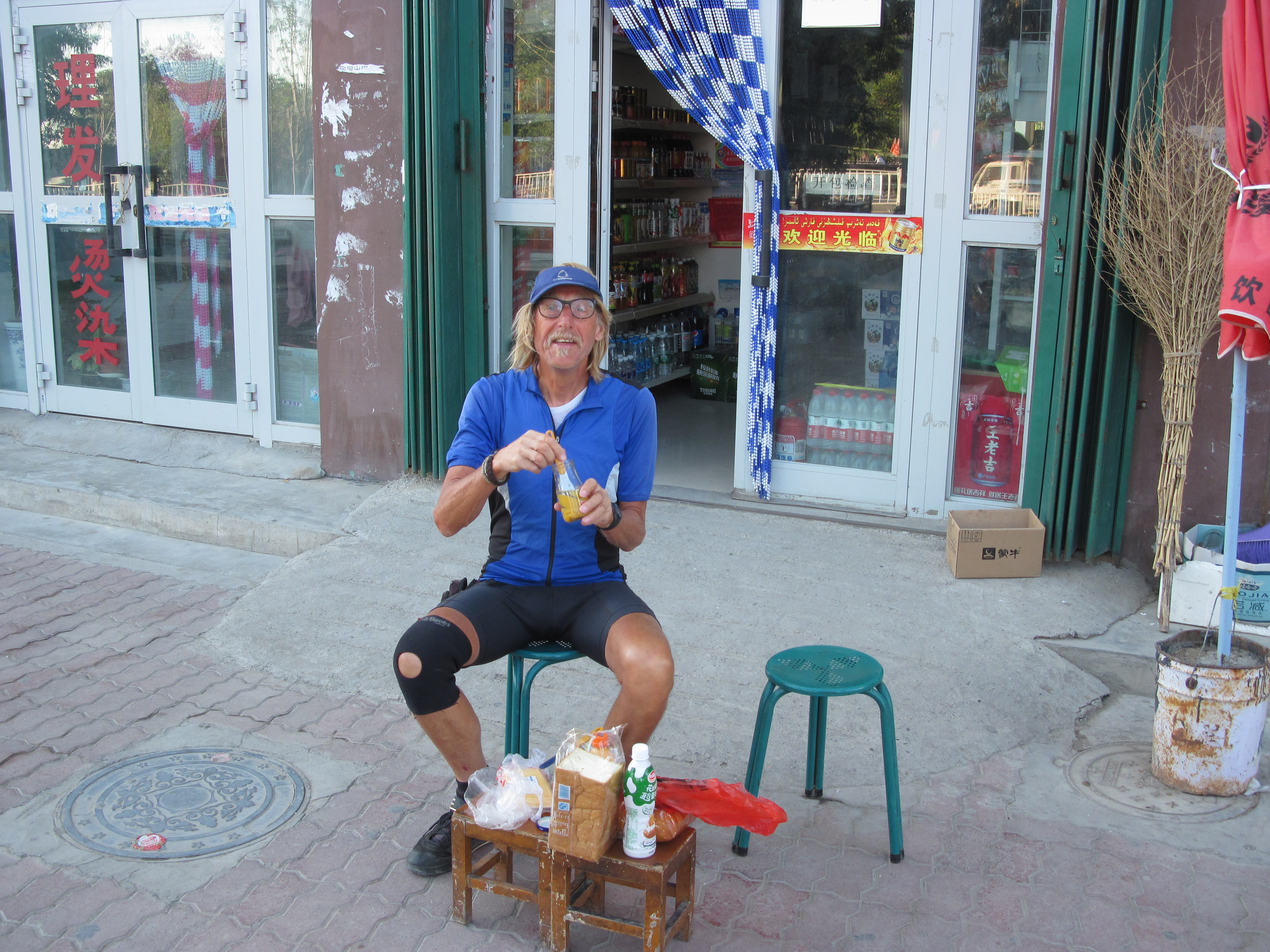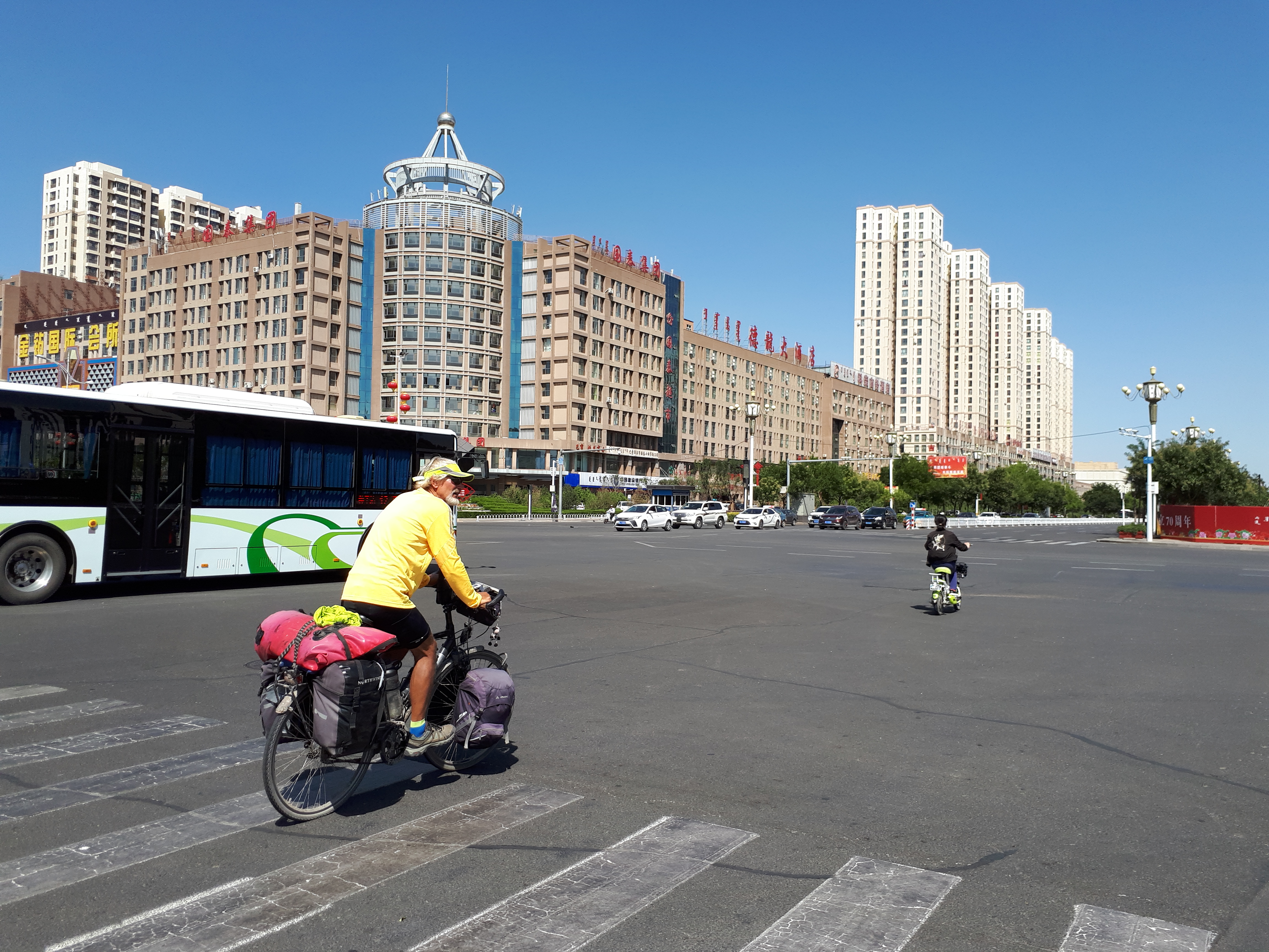 Tot 8 uur slapen we uit. We hebben maar een korte route op de planning staan. De achterband is nog hard we kunnen vertrekken. Voor we de grote stad uitfietsen kopen we in een winkeltje zoals gebruikelijk water. Als we de bidons aan het vullen zijn ontstaat er een toeloop van mensen. Ze hangen krom gebogen over de landkaart dus vertellen we maar weer eens waar we vandaan komen en waar we naar toe gaan. Ze vinden het allemaal prachtig. Vol bewondering gaan de duimen de lucht in. Wij zwaaien ze toe als we verder fietsen. Het duurt een hele tijd voordat we de stad uit zijn. Eigenlijk rijden we de hele dag door de bewoonde wereld. De bergen in het noorden lichten door de hete zon oranje op. De hele dag hebben we wel wat te bekijken en daar nemen we dan ook wel de tijd voor. We stoppen bij een groot kassencomplex om die glastuinbouw wat nader te bekijken. We komen langs een winkel die E-scooters en E-driewielers verkoopt. We hebben er nu al zoveel gezien dat we wel eens willen weten wat die hier dan kosten. Een E-scooter kost 1900 Yuan ( € 243,00) een driewieler 4600 Yuan ( € 587,00). Wytze raakt zo enthousiast over de prijs dat hij met zijn zwager, een ex Philips medewerker een handeltje op wil gaan zetten. Dan is het onderhand tijd om de 110 te gaan verlaten en over de gele weg te gaan. Met maps.me lukt dat goed. De GPS werkt hier niet omdat hij geen satelliet kan vinden. In Tumd Youqi staan we op de plaats waar het geboekte hotel zou moeten staan maar het is er niet dus vragen we het aan een paar meiden die via het vertaalprogramma op hun mobieltje laten weten dat we op ‘the second intersection to the right’ moeten. Dit wordt nog bevestigd door een man op een E-driewieler die tot de afslag met ons meerijdt. We vinden wel een hotel maar niet die waar we gereserveerd hebben. We vragen het nog een keer aan een man van dat het hotel die de route voor ons uittekent en ons daarna ook nog een groot stuk voorrijdt. Ja , daar is ons Jinjiang Hotel, een keten waar we al wel vaker geslapen hebben. Bij binnenkomst logged mijn telefoon meteen in op de Wifi omdat de code in al die hotels hetzelfde is. Omdat we in de wijk rondom het hotel geen fatsoenlijke eettent kunnen vinden eten we in het restaurant van het hotel. We laten de ‘kippenpoep’ met de gestoomde bladgroente en de nasi goed smaken. Bij de receptie kopen we nog een lekker ijsje en een flesje Tsingtao bier voor op de kamer.