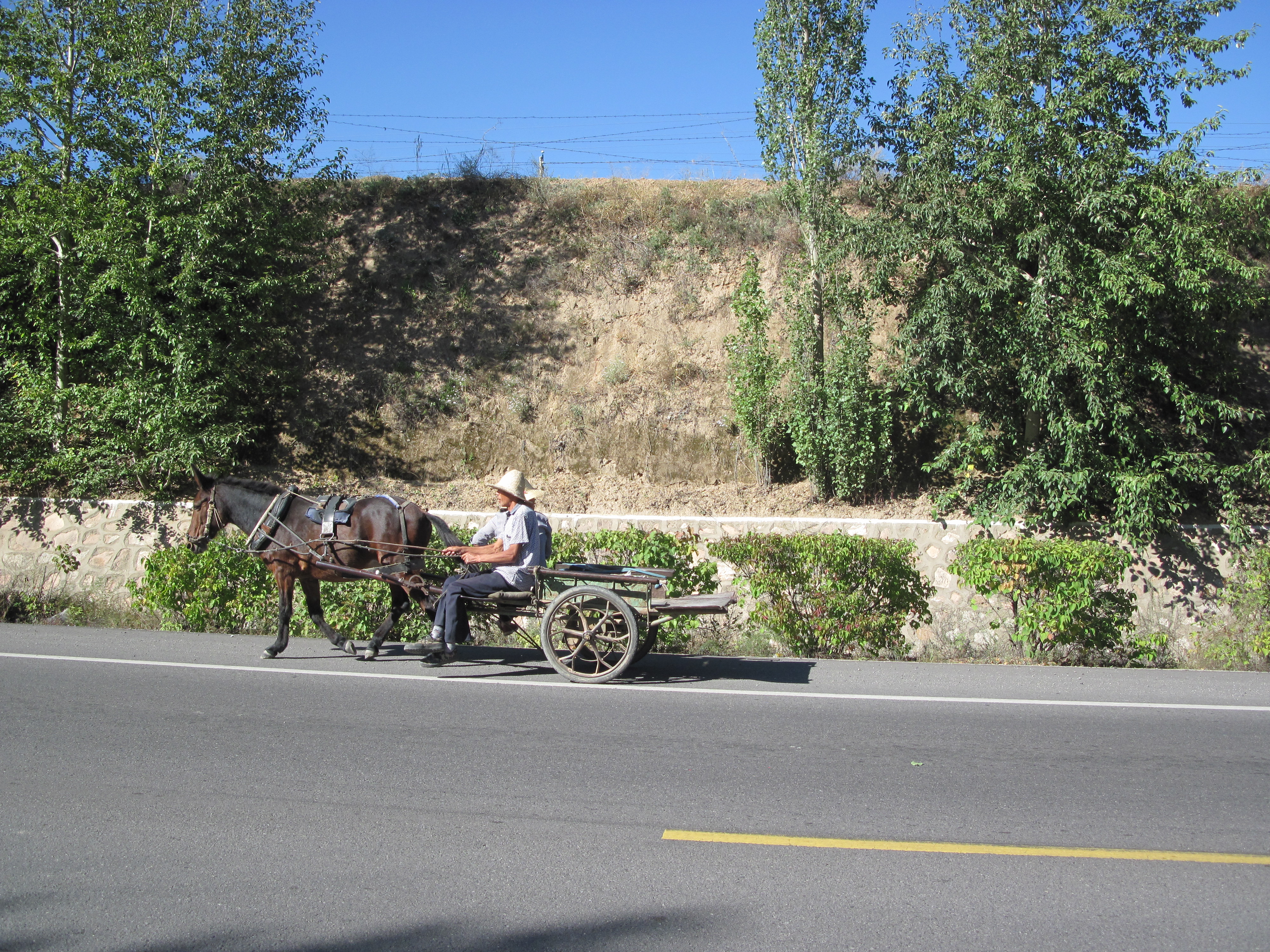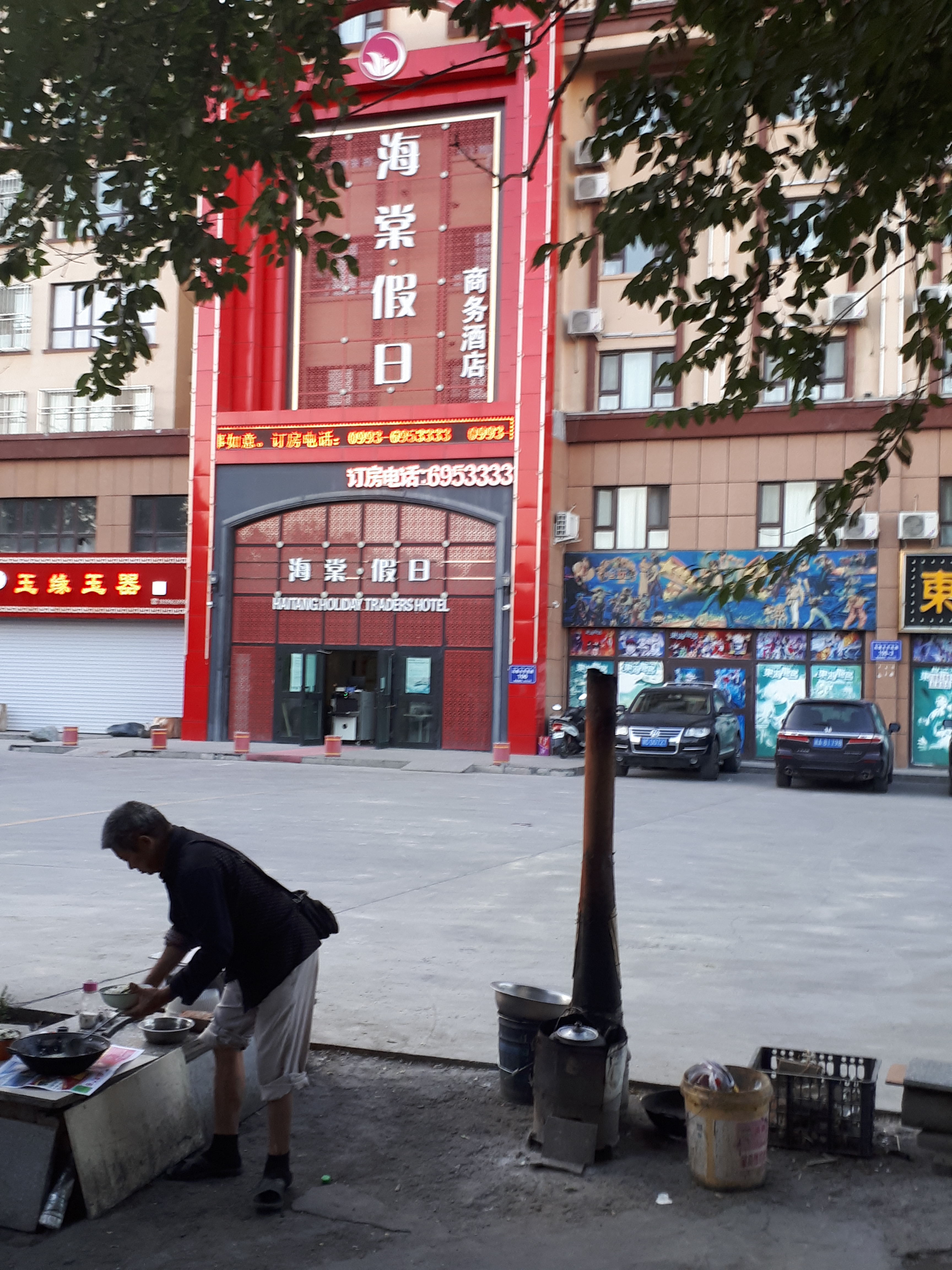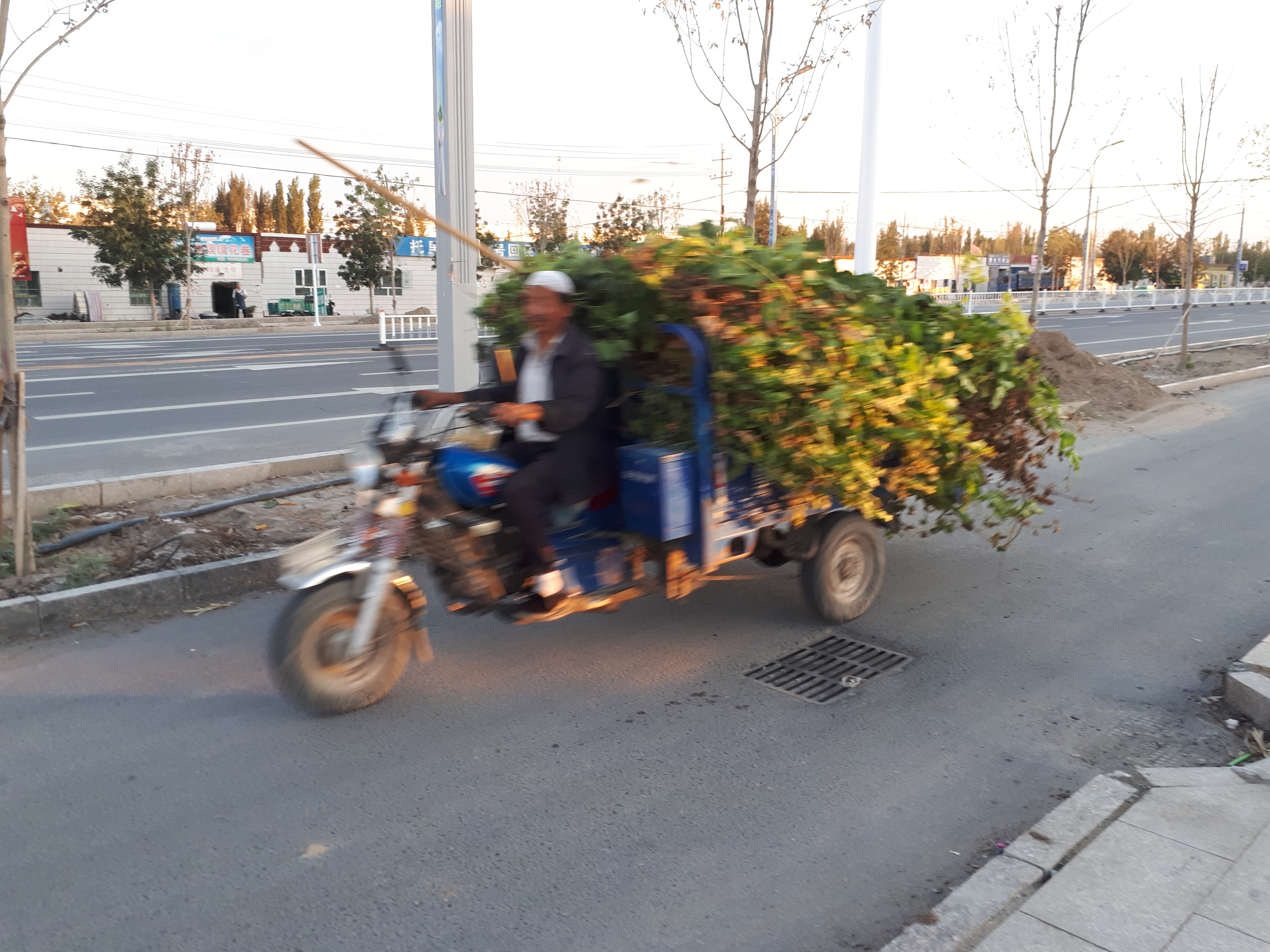 Tot 8 uur slapen we uit. We hebben maar een korte route op de planning staan. De achterband is nog hard we kunnen vertrekken. Voor we de grote stad uitfietsen kopen we in een winkeltje zoals gebruikelijk water. Als we de bidons aan het vullen zijn ontstaat er een toeloop van mensen. Ze hangen krom gebogen over de landkaart dus vertellen we maar weer eens waar we vandaan komen en waar we naar toe gaan. Ze vinden het allemaal prachtig. Vol bewondering gaan de duimen de lucht in. Wij zwaaien ze toe als we verder fietsen. Het duurt een hele tijd voordat we de stad uit zijn. Eigenlijk rijden we de hele dag door de bewoonde wereld. De bergen in het noorden lichten door de hete zon oranje op. De hele dag hebben we wel wat te bekijken en daar nemen we dan ook wel de tijd voor. We stoppen bij een groot kassencomplex om die glastuinbouw wat nader te bekijken. We komen langs een winkel die E-scooters en E-driewielers verkoopt. We hebben er nu al zoveel gezien dat we wel eens willen weten wat die hier dan kosten. Een E-scooter kost 1900 Yuan ( € 243,00) een driewieler 4600 Yuan ( € 587,00). Wytze raakt zo enthousiast over de prijs dat hij met zijn zwager, een ex Philips medewerker een handeltje op wil gaan zetten. Dan is het onderhand tijd om de 110 te gaan verlaten en over de gele weg te gaan. Met maps.me lukt dat goed. De GPS werkt hier niet omdat hij geen satelliet kan vinden. In Tumd Youqi staan we op de plaats waar het geboekte hotel zou moeten staan maar het is er niet dus vragen we het aan een paar meiden die via het vertaalprogramma op hun mobieltje laten weten dat we op ‘the second intersection to the right’ moeten. Dit wordt nog bevestigd door een man op een E-driewieler die tot de afslag met ons meerijdt. We vinden wel een hotel maar niet die waar we gereserveerd hebben. We vragen het nog een keer aan een man van dat het hotel die de route voor ons uittekent en ons daarna ook nog een groot stuk voorrijdt. Ja , daar is ons Jinjiang Hotel, een keten waar we al wel vaker geslapen hebben. Bij binnenkomst logged mijn telefoon meteen in op de Wifi omdat de code in al die hotels hetzelfde is. Omdat we in de wijk rondom het hotel geen fatsoenlijke eettent kunnen vinden eten we in het restaurant van het hotel. We laten de ‘kippenpoep’ met de gestoomde bladgroente en de nasi goed smaken. Bij de receptie kopen we nog een lekker ijsje en een flesje Tsingtao bier voor op de kamer.