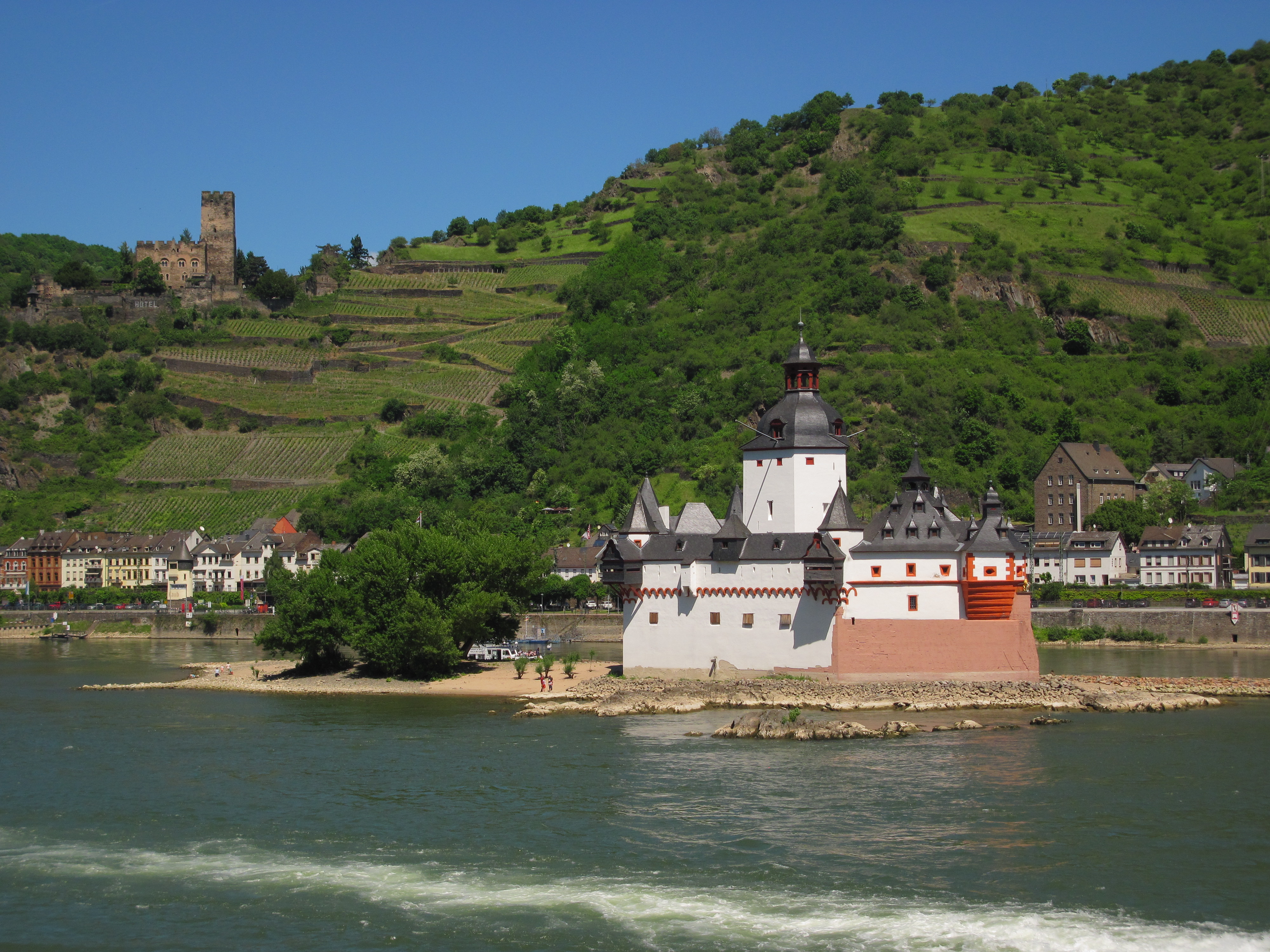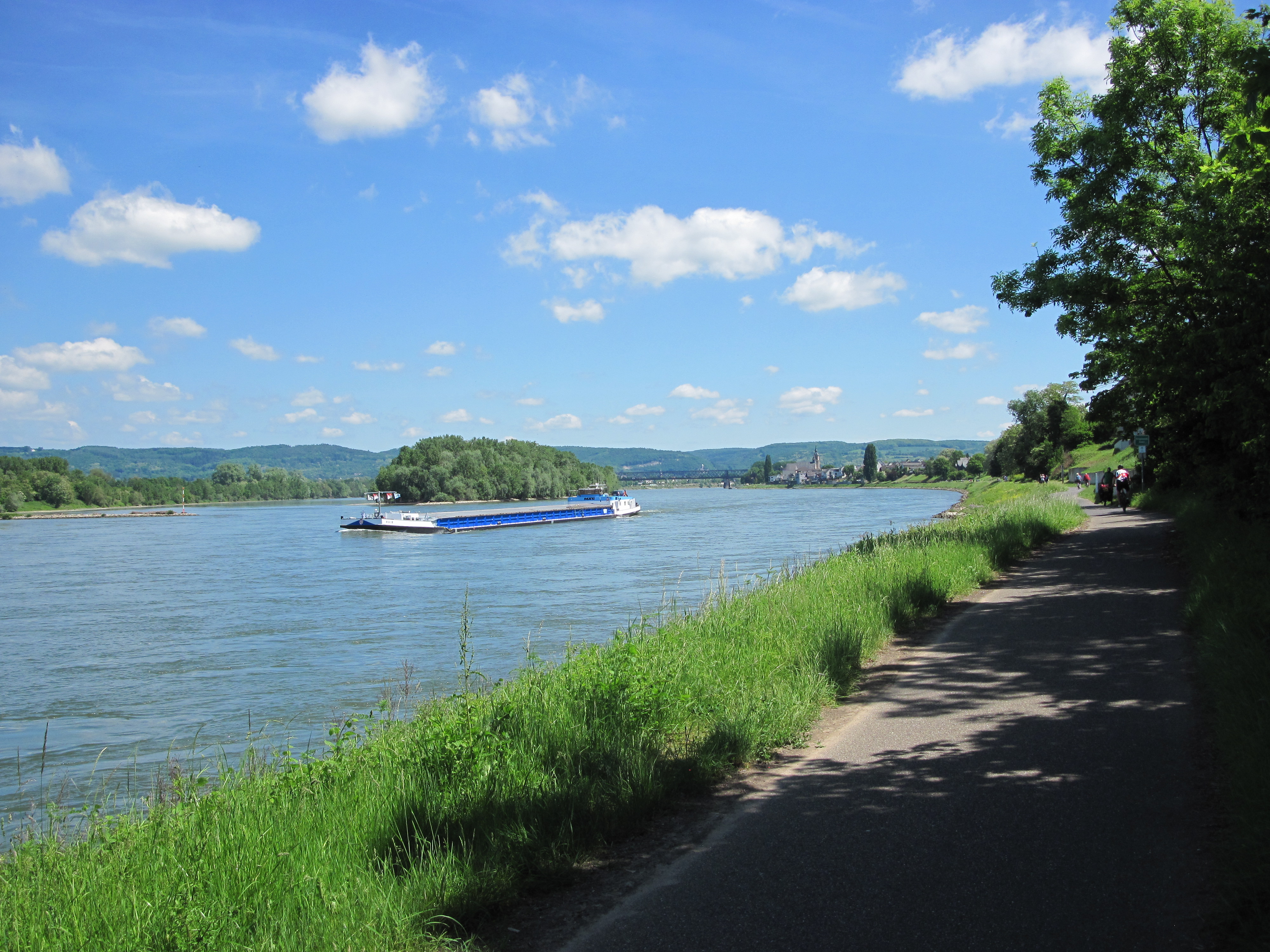 Omdat de winkels gisteren op Hemelvaartsdag gesloten waren hebben we ook geen ontbijt kunnen kopen. Gelukkig is er tegenover de camping een supermarkt en kunnen we de dag toch beginnen meteen goed ontbijt. Ook voor de lunch doen we dan meteen onze inkopen. Het is al vroeg warm, maar de route, die dicht tegen de Rijn aan loopt is prachtig. Mooie bergen met oude kastelen aan de overkant en vele kleine dorpjes. Op de Rijn varen veel vracht- en rondvaartboten waarmee we in gelijke snelheid stroomopwaarts fietsen. Als we pauzeren wordt er belangstellend naar onze fietsen met zoveel bagage gekeken. “Waar gaan jullie toch naartoe?” “Naar Peking” zeggen we dan in koor. De belangstelling slaat om in verontwaardiging en boos lopen de mensen weg. “Stellen we een geïnteresseerde vraag en dan krijg je zo’n stom antwoord!” zien we ze denken. We kijken elkaar aan met een blik van: “Ze geloven ons niet of ze geloven niet dat wij daartoe in staat zijn”. Nou wij wel!!!