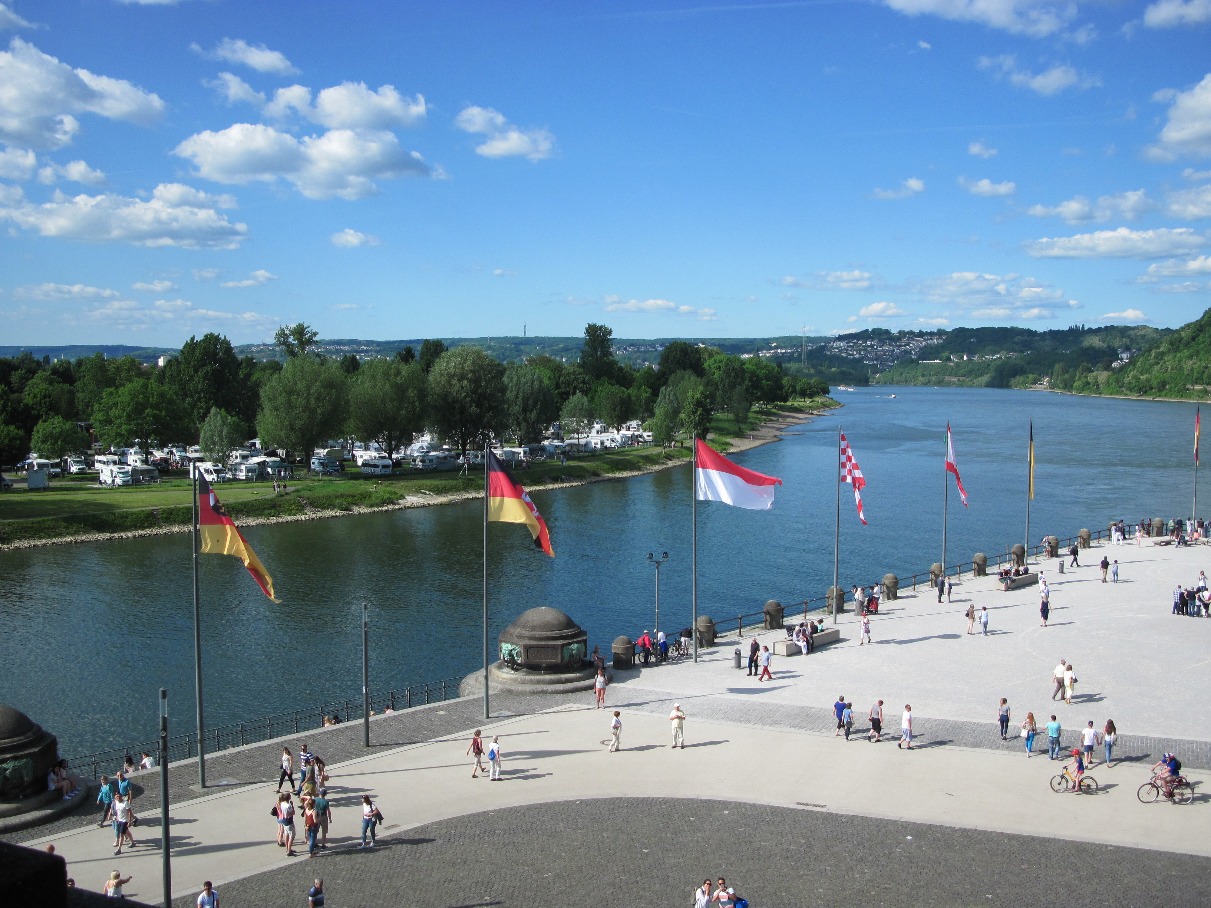Alle twee hebben we slecht geslapen. Er was veel rumoer op de camping. Wytze is er zelfs een paar keer uit geweest om bij de tent tegenover ons te vragen of het niet wat stiller kan. Hij heeft zich zo geërgerd dat hij er ‘s nachts nog een Engelstalig gedicht over gemaakt heeft en dat hij ’s morgens voor we vertrekken nog aan de tent van de ‘herrieschoppers’ hangt. Maar ook de vele passerende treinen hebben ons voortdurend wakker gehouden. Om half zeven is er plotseling een heleboel kabaal. Onze tent staat vlakbij het fietspad waar een vrouw dooreen hond wordt aangevallen. Ze schrikt zo dat ze valt en zich lelijk bezeert.Een man die onmiddellijk te hulp schiet belt zelfs der Notartz. Gelukkig constateert die vrij snel dat de schade wel meevalt en de vrouw zelfstandig verder kan. Om half 10 zijn we weg. Ons einddoel voor vandaag is Koblenz. Geen lange etappe zodat we tijd genoeg hebben om de Deutsche Ecke te gaan bekijken. Om goed halftwee zijn we bij de camping en hoewel die vol is mogen we met onze kleine tentjes gelukkig toch blijven. Als we de tentjes hebben staan gaan we te voet naar de overkant van de Moezel naar het oude centrum van Koblenz. Koblenz is een aardig stadje waar we enkele kerken bekijken en natuurlijk ook het potsierlijke en zeer lelijke gedenkteken van Kaiser Wilhelm, symbool voor de Duitse eenheid. Dit monument staat precies tussen de Rijn en de Moezel in. Deze plek wordt ook wel de Deutsche Eck genoemd. Zoals al verwacht zijn de winkels vanwege Hemelvaartsdag gesloten en kunnen we dus geen avondeten kopen. Gelukkig is het restaurant bij de camping wel open. Ik eet er prima en drink er nog een lekker biertje bij.Wytze is minder enthousiast en vindt de kosten van het restauranteten niet terug in de kwaliteit en de hoeveelheid en klaagt erover dat hij niet “zat” is.“Niet zat zijn” is Fries voor niet genoeg gegeten te hebben. Als we bij de tent komen komt er net een groep motorrijders aan die in de trekkershutten pal achter onze tenten hun intrek nemen. Als ze met bierflessen in de hand even later naar de kantine wandelen vrezen we voor onze nachtrust maar dat blijkt de volgende morgen dus nergens voor nodig te zijn geweest.