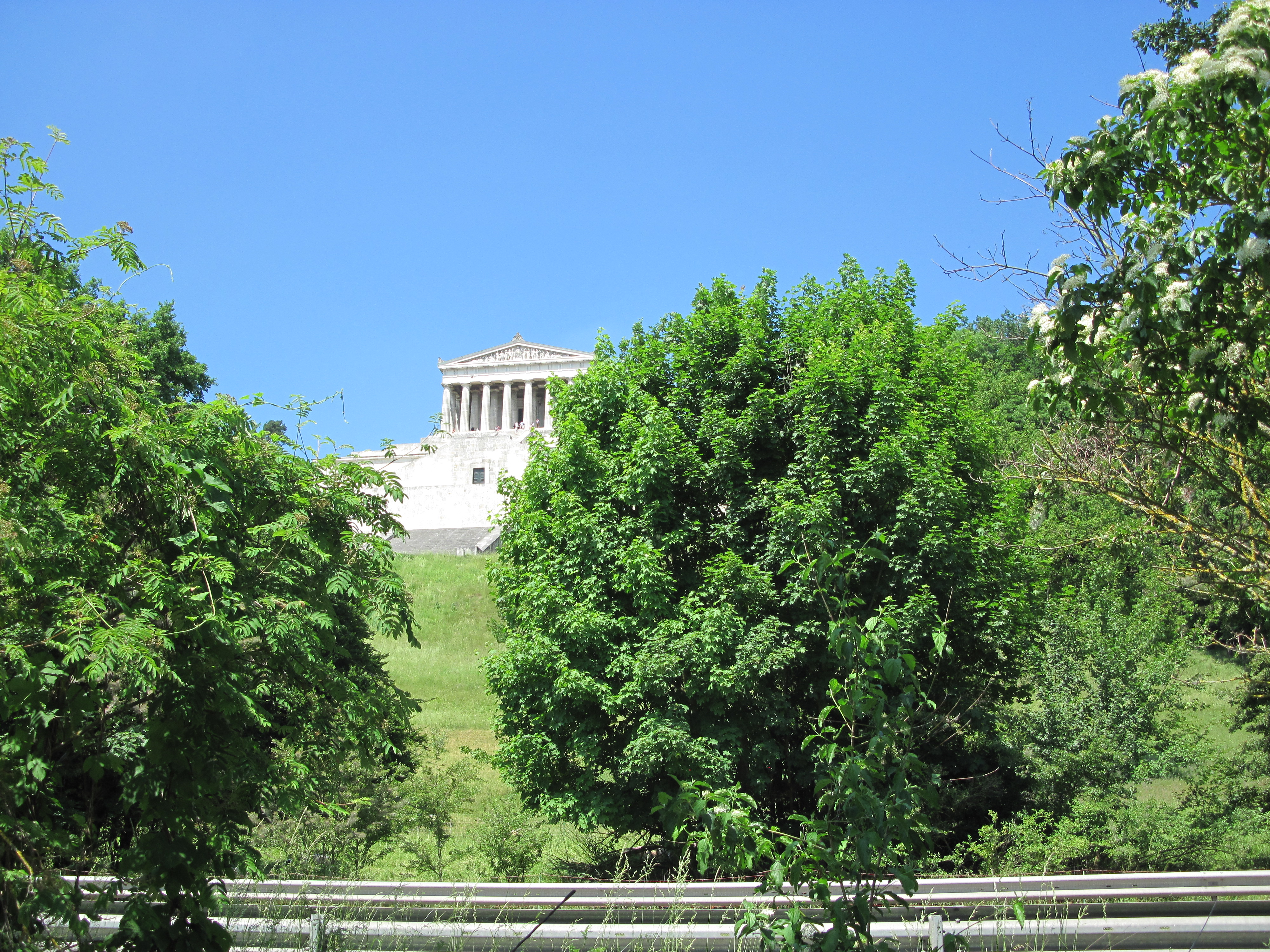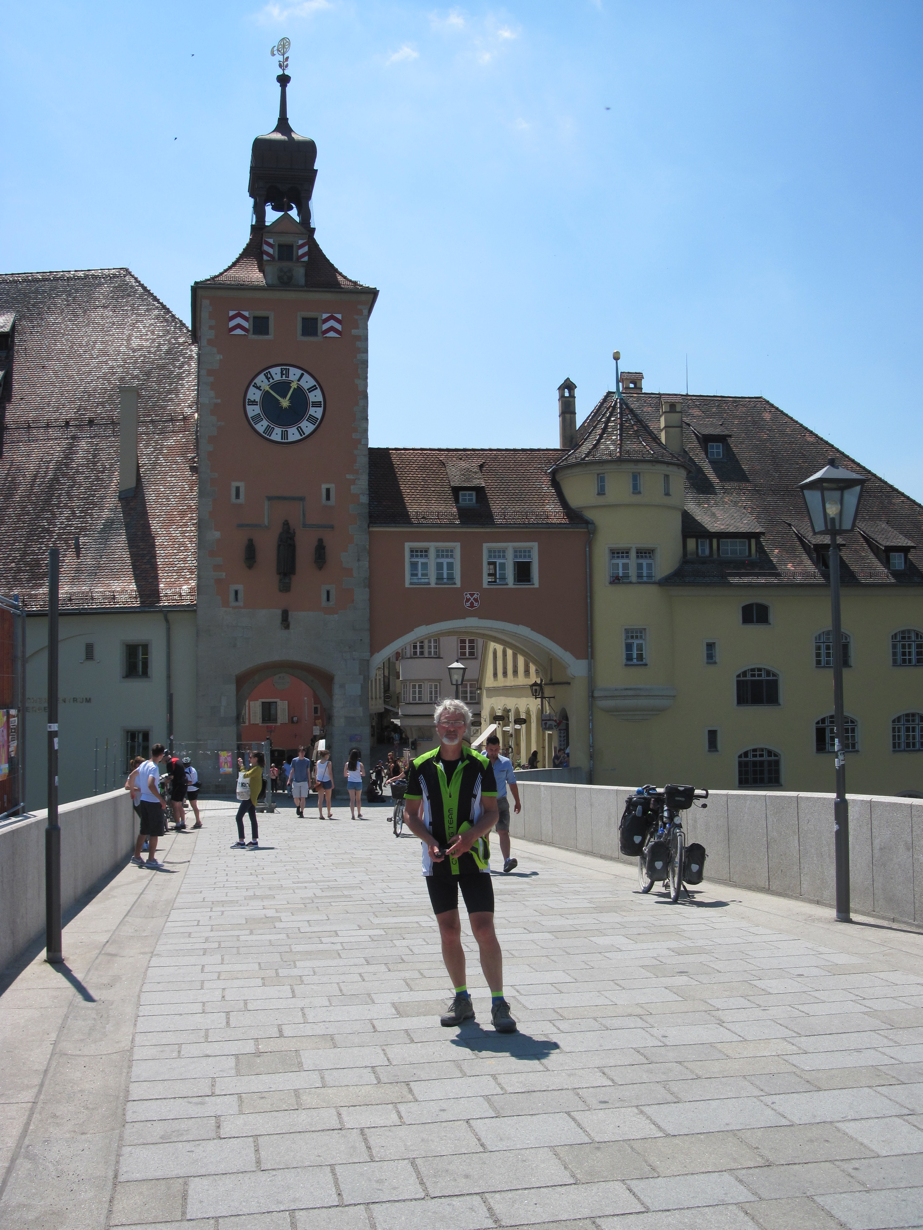 Om half 10 zijn we weer en route.Er staan voor vandaag geen beklimmingen op het programma. We fietsen langs het Main-Donau kanaal die de Altmühl met de Donau verbindt. Bij Kelheim rijden we ineens zonder het in de gaten te hebben langs de Donau die daar naar het noorden buigt en ons naar de mooie stad Regenburg brengt. Via een poort en een brug rijden we de stad in, maar de route gaat niet echt door het centrum heen. Hoewel de grote dom, die mooi boven het stadje uitsteekt er zeer uitnodigend bij staat gaan we er niet naar toe. We hebben nog te veel kilometers te gaan voor onze eindbestemming. Ook vandaag loopt de route weer over kilometerslange gravelpaden die door het gemis aan regen veel stof op doen waaien. Onze fietsen en tassen zijn helemaal grijs van het stof. We passeren wel een wasstraat maar Wytze is bang dat er water in de lagers komt dus spuiten we ze daar toch maar niet af. Na Regensburg kan deel 1 van de Limes route in de tas en gaan we verder met deel 2. Boven op een bergtop staat er een imitatie van het Griekse Parthenon uit Athene. Het wordt de Walhalla tempel genoemd en werd daar in 1820 gebouwd door ene Koning Ludwig van Beieren. Het is een groot ding dat daar eigenlijk niet thuishoort. Bij Straubing komen we op een grote camping met een groot grasveld terecht. Wat gaat de tijd snel! Vooral als je die net als ik gisteren uit m’n handen heb laten vallen. “KLETS” daar lag m’n Prismahorloge op de oranje tegeltjes van het douchehokje. Het glas splinterde alle kanten op. Zonder de tijd bij de hand vind ik ongemakkelijk dus er zal een nieuwe gekocht moeten worden. En wat hebben ze bij de Aldi in Straubing in de aanbieding? Juist een fitnesshorloge annex hartslagmeter,alarm, hoogtemeter, stappenteller en nog veel meer. Kosten : € 14,00. Maar….. hij moet nog wel op tijd gezet worden en er zitten wel 4 knoppen op. De Aldi aardappelkoeken en een mix van kip met tortellino en nog een yoghurttoetje na smaken ons goed. Daarna ben ik nog wel even zoet met het op tijdzetten van mijn nieuwe horloge dat bij het indrukken van de knopjes blijkbaar heel irritant piept. Tenminste dat zegt Wytze want ik heb geen piep gehoord!! Uiteindelijk is het als de camping al in diepe rust is gelukt om mijn nieuwe klokje op de juiste tijd te zetten, maar hoe het precies allemaal werkt weet ik eigenlijk nog niet. Nergens meer aankomen dus.