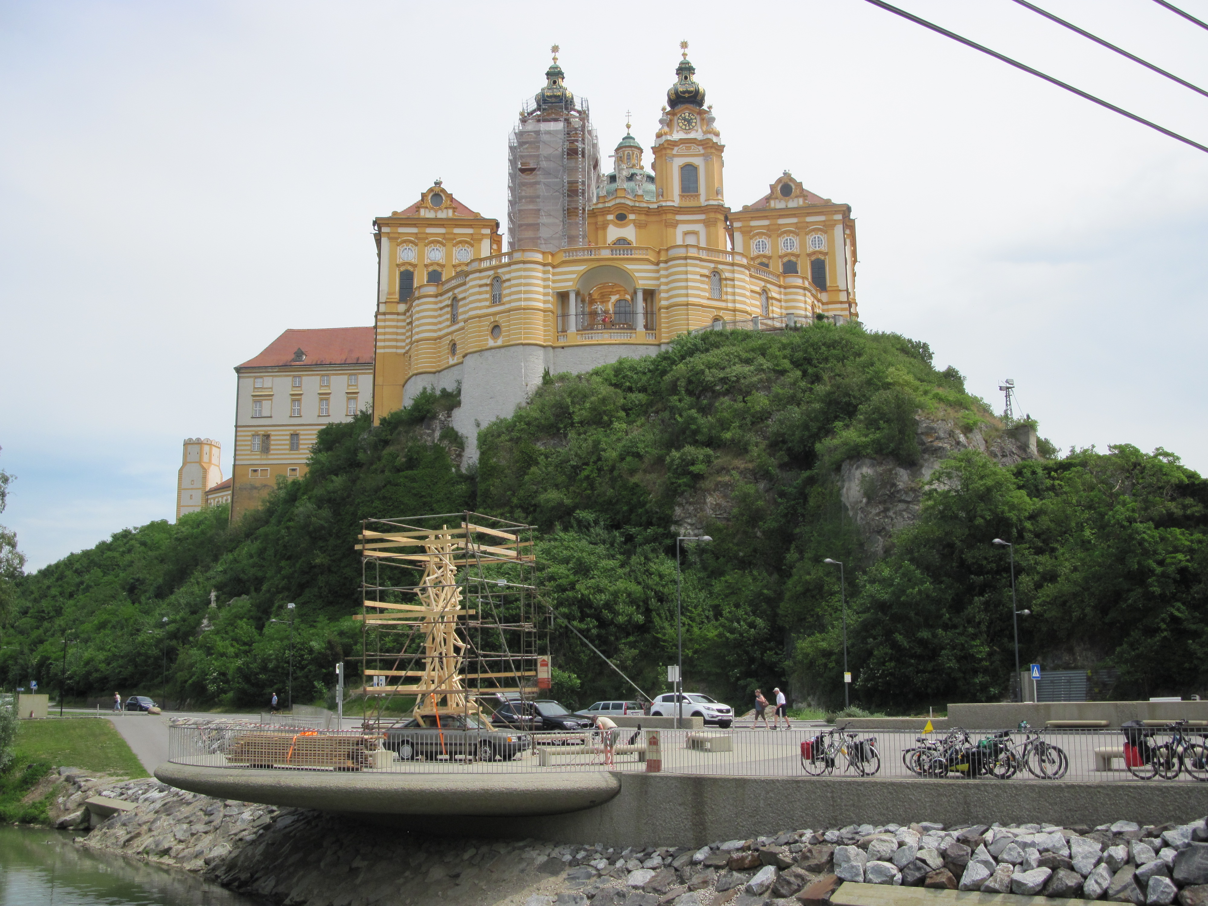 4. Nooit gebruik maken van de eerste mogelijkheid want er kan nog een betere komen. Ik neem me voor om daarop te anticiperen door tijdig en duidelijk aan te geven wat ik graag zou willen en indien we alle twee iets anders willen niet te drammerig te zijn. In Melk prijkt er een nogal protserig kasteel boven het stadje uit. Er tegenover staat op een Audi een raar kunstwerk dat opgebouwd is van houten balken. Ik stel voor om ook even het dorpje in te gaan om daar wat brood te kopen. Hoewel Wytze wat tegenpruttelt rij ik, mijn goede voornemens ten spijt, toch het stadje in en stop daar bij een bakker die zelfs honing, verkoopt. Ik ga de winkel in maar we kopen er niets. Wytze heeft een allergie voor speciaalzaken en vindt dat we voor levensmiddelen maar naar de goedkopere supermarkt moeten gaan. Er is echter geen supermarkt in het dorpje. Uiteindelijk fietsen we zo’n 10 km om om onze inkopen te kunnen doen. Op zoek naar de oorspronkelijke route komen we op een industrieterrein langs een doe-het-zelf zaak. Wytze denkt daar wel aan ‘Kochbenzin’ voor het kooktoestel te kunnen komen. Ik blijf buiten wachten. Na een kwartier komt hij zonder wasbenzine boos naar buiten. Het personeel is dom en het bedrijf deugt niet. We fietsen daarna een tijdje in een stug tempo verder. Er wordt niets gezegd en het is wel duidelijk dat er iets wringt. Ik probeer ter afleiding nog wat over mijn toneelervaringen met de Rockopera “Le Moulin Rouge” en de film “In Naam van de vader” te vertellen, maar het is door zijn koele reacties wel duidelijk dat hem dat nu niet interesseert. Wat er precies speelt weet ik niet. Ik houd het maar op de opgedane slaapachterstand want eenmaal aangekomen op de camping van Stein,vreest hij, gezien de drukte en de plaats dicht bij de ingang, voor opnieuw een slechte nachtrust. Als we zitten te eten begint het te regenen. Haastig eten we onze borden leeg en verhuizen naar het afdak bij het terras om daar ons toetje nog op te eten. Met een nootje bij de tent sluiten we deze confronterende dag van de botsende ego’s af. Hopelijk brengt een goede nachtrust ons beiden morgen een beter humeur.