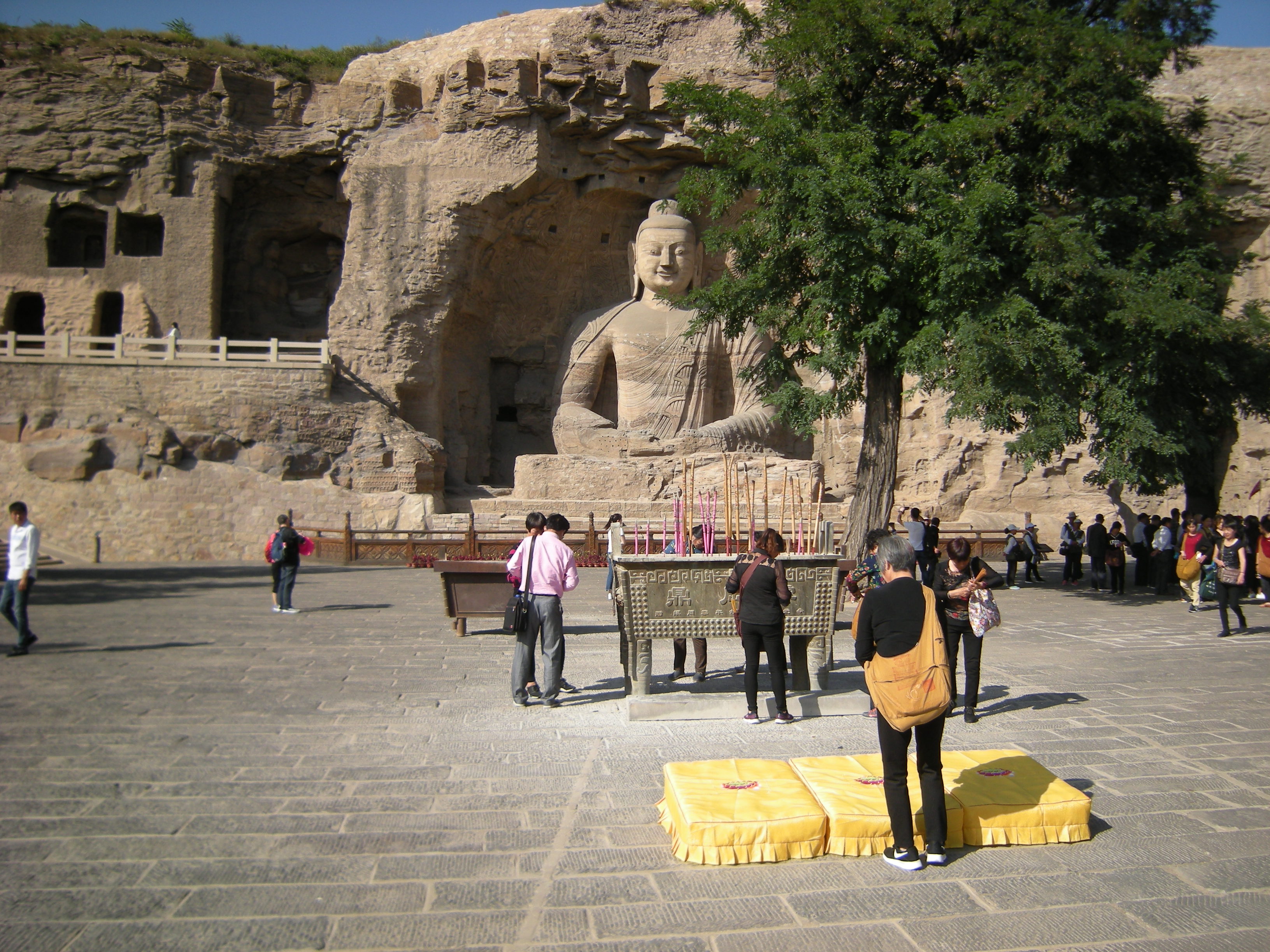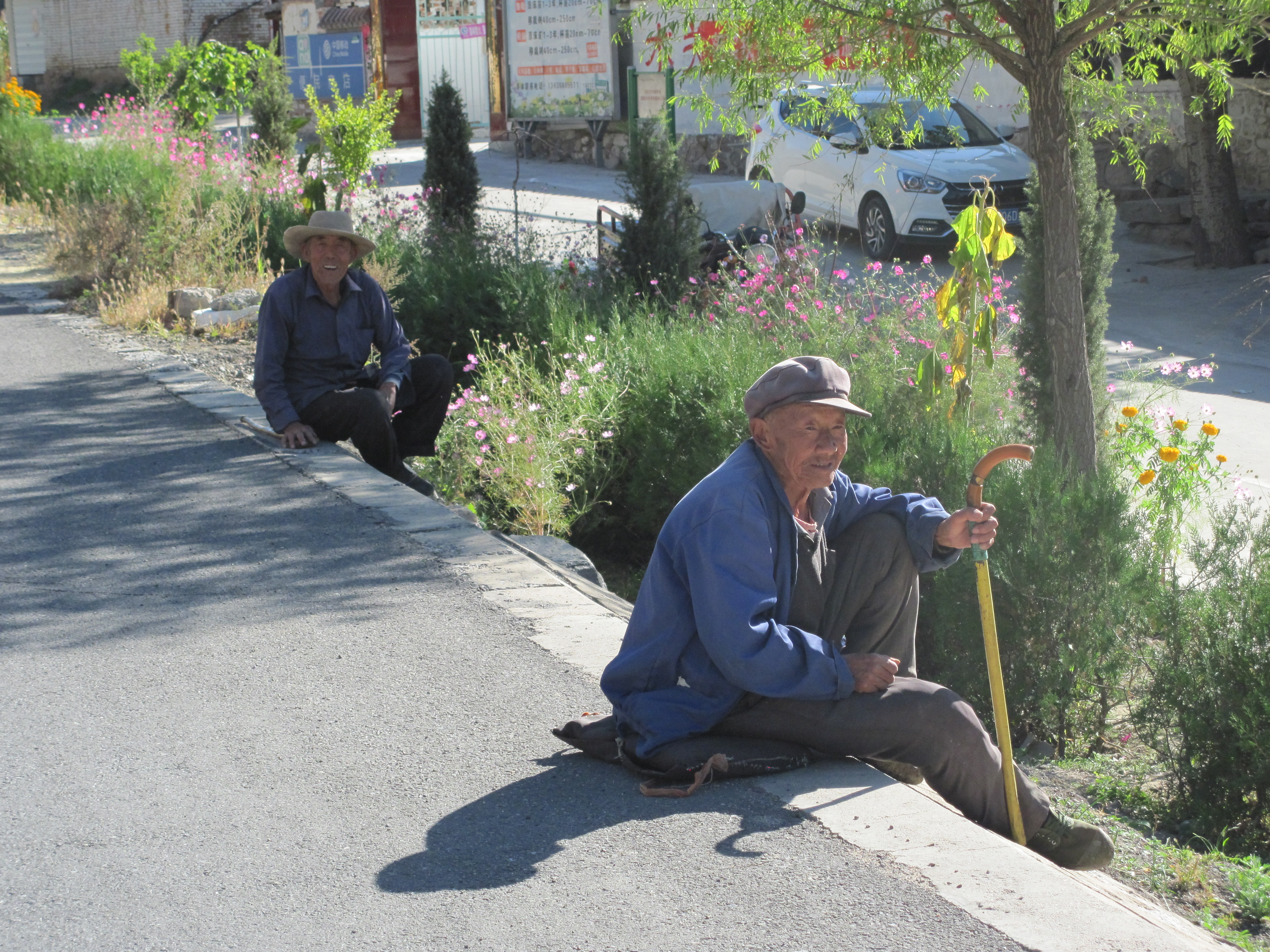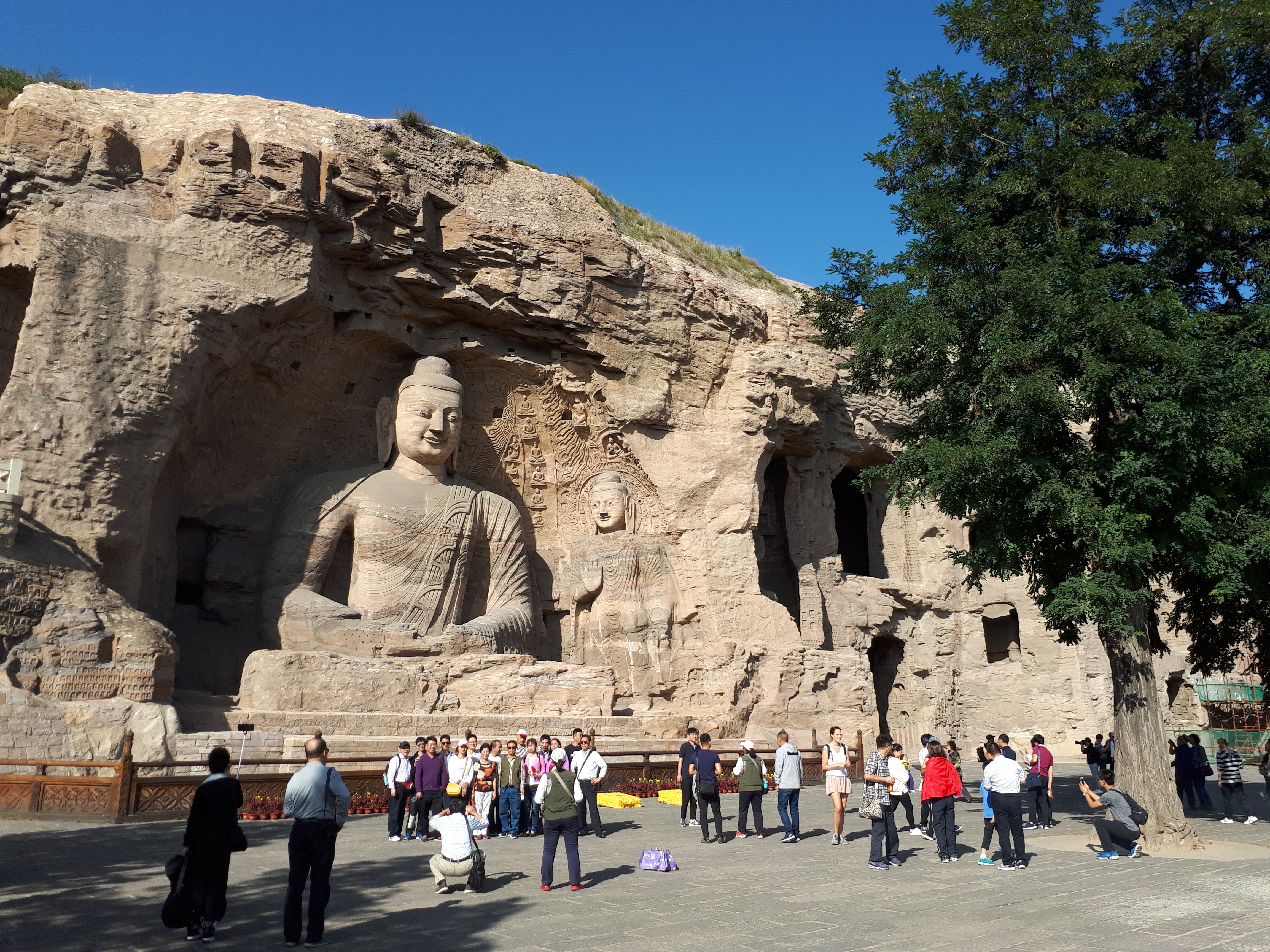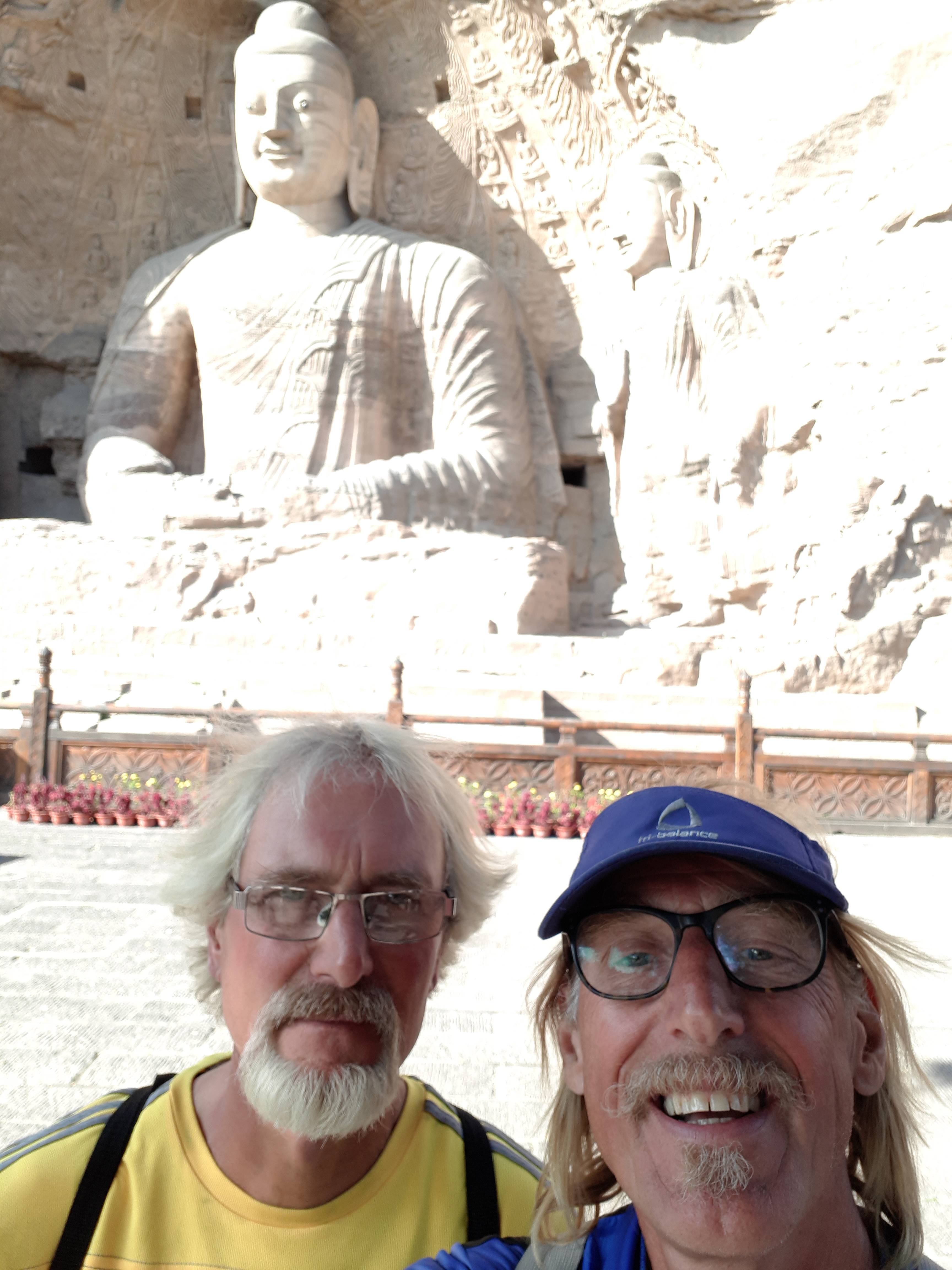Als we Zouyun uit zijn fietsen we langs veel oude kleine dorpjes die we af en toe in fietsen om wat foto’s te maken. Op de kruispunten van de 109 is het in de dorpjes heel druk en staan de oudere mensen druk met elkaar te buurten. Als we passeren vallen de gesprekken stil een krijgen wij met hun verbaasde blikken alle aandacht. Het landschap is prachtig. Op een gegeven moment denken we in een dorpje nog restanten van de Muur te zien en gaan we de ruïnes van dichterbij bekijken. We ontmoeten een man met een juk, die met een man en een vrouw staat te buurten, die zaden aan het drogen zijn en proberen bij hen de oorspronkelijke functie van de ruïnes te achterhalen. Wytze maakt een tekening van de Muur met kantelen waarop ze bevestigend antwoorden. Toch denken we dat het geen restant van De Grote Muur is maar van een oude stadsmuur. Het blijft toch een mooi ruïne die mocht hij in Nederland liggen waarschijnlijk toch wel beter onderhouden zou worden. Veel dorpjes die we later nog passeren zijn leeg of voor het grootste gedeelte gesloopt. Op een berghelling zien we al van ver een groot tempelcomplex liggen waar ik wel even wil gaan kijken. Wytze vindt het vaak lastig om te stoppen en even wat te gaan bekijken en wil dat nu ook niet! Rare is dat als ik mijn zin dan toch doordrijf hij achteraf meestal heel blij is dat we even zijn gaan kijken. Bij deze tempel hoef ik mijn zin niet door te drijven omdat het gesloten is. Even later passeren we een hek dat voor een bergwand geplaatst is en waarachter kleine grotten zichtbaar zijn. Ik stuur mijn fiets meteen naar een opening in het hek en stal mijn fiets bij een hutje waarin een bewaker ligt te slapen. In de bergwand zijn kleine grotten gemaakt met daarin Boeddha beeldjes en offergaven zoals fruit en prullaria. Mooie monumentjes maar schandelijk slecht onderhouden en allemaal onder een dikke laag stof. Met een omweg komen we in Yungang aan waar we eerst een toeristisch mijnwerkersdorp in fietsen. Dat blijkt de verkeerde afslag dus moeten we even terug. Uiteindelijk komen we dan aan op de parkeerplaats bij de Yungang Grottoes, waar het aantal souvenirkraampjes al aangeeft dat het hier om een grote attractie gaat. Eenmaal binnen overtreft het al onze verwachtingen. Prachtig!! Via een in een grote vijver gelegen tempel komen we in een wandelpark terecht waarin ons een wandelroute naar een steile bergwand brengt. In de bergwand zijn enorme grotten uitgehouwen waarin grote Boeddhabeelden staan . Sommige grotten hebben een speciale tempelachtige ingang. Voorbij de ingang mag er binnen helaas niet gefotografeerd worden. De beelden in deze grotten zijn kolossaal en kleurrijk.De schoonheid en de verrassing overdonderd ons. We nemen er alle tijd voor. Op een picknick tafel voor het grootste Boeddhabeeld eten we onze wat verlate lunch en zoeken we wat verkoeling met een fris colaatje. Na dit hoogtepunt van onze reis fietsen we door naar Datong waar volgens Maps.me een Jinjiang hotel zou moeten zijn. We kunnen het niet vinden en melden ons dan maar bij een hotel in de buurt. Ze willen ons daar op basis van ons paspoort eigenlijk niet hebben. Volgens de bedrijfsleider mogen ze alleen gasten hebben die een geldige ID-kaart kunnen laten zien. Wytze reageert daarop heel snel door zijn ID-kaart op de balie te leggen. Ja , wonder boven wonder die wordt wel geaccepteerd als een geldig identificatiemiddel. Ik ga die van mij vlug uit de portefeuille halen die onderin mijn achtertas zit. De logica ontgaat ons maar het zal ons een zorg zijn want we mogen blijven. Op de kamer werkt de Wifi helaas niet dus loop ik even naar beneden om bij de balie de inlogcode op te vragen. Een code kunnen ze me niet geven, maar wel een andere kamer!! Hoewel Wytze al onder de douche staat in de oude kamer verhuis ik ondertussen al wat spullen naar de nieuwe kamer. We gaan om de hoek eten bij een restaurant dat door 2 meiden gerund wordt. Toen we passeerden zagen ze wel dat we hongerig waren en nodigde ze ons uit om bij hen te komen eten. Ze maken voor ons rijst met ei en tomaat, verse rouwe groente met sojavlees en paddenstoelen. Als service van de zaak krijgen we nog een schoteltje met zoete iets behaarde peultjes. We hebben heerlijk gegeten. Terug op de kamer plaats ik op de Memori-site van Ad nog een foto van hem en mij als resp. Brighella en Truffaldino.