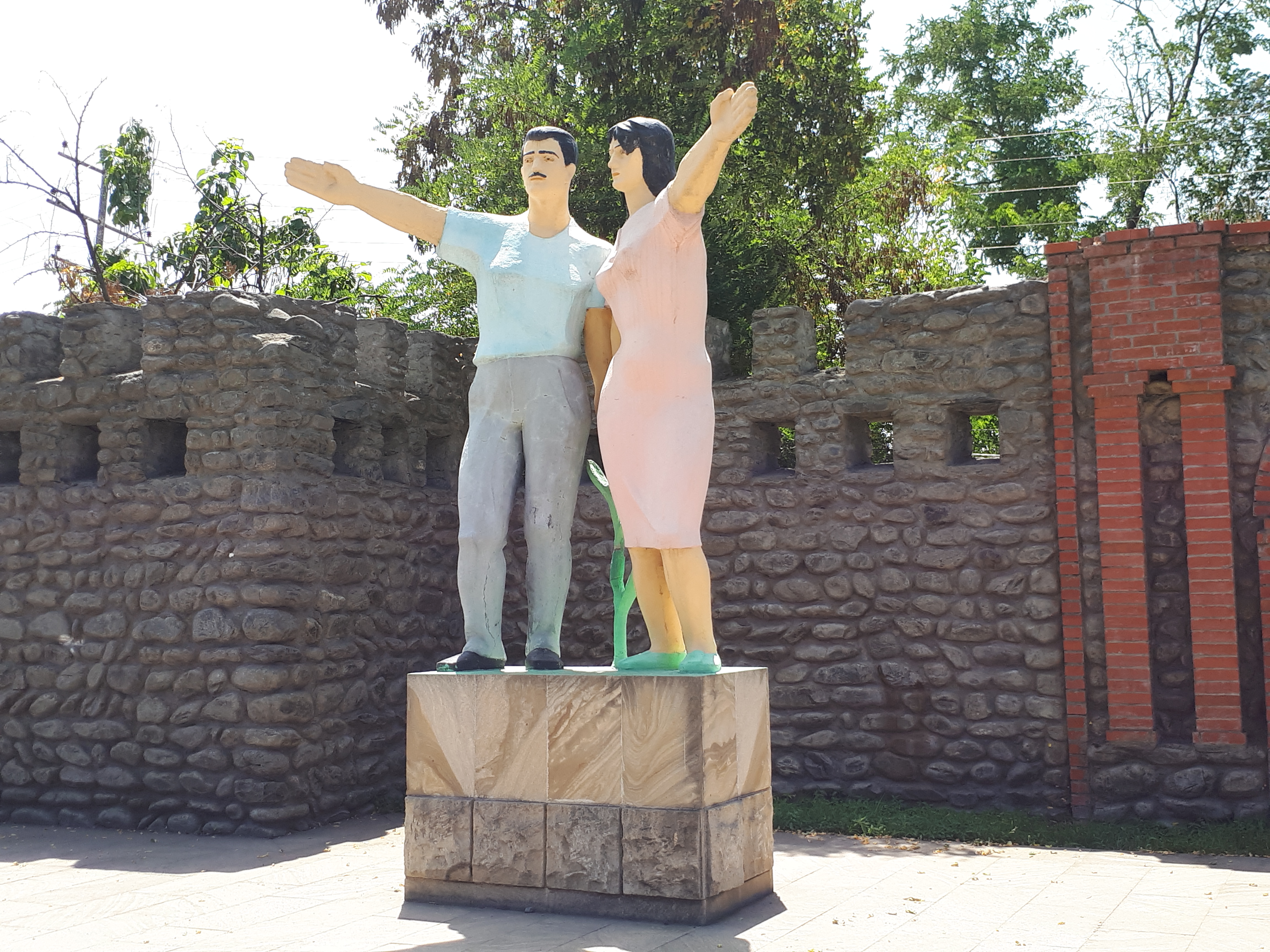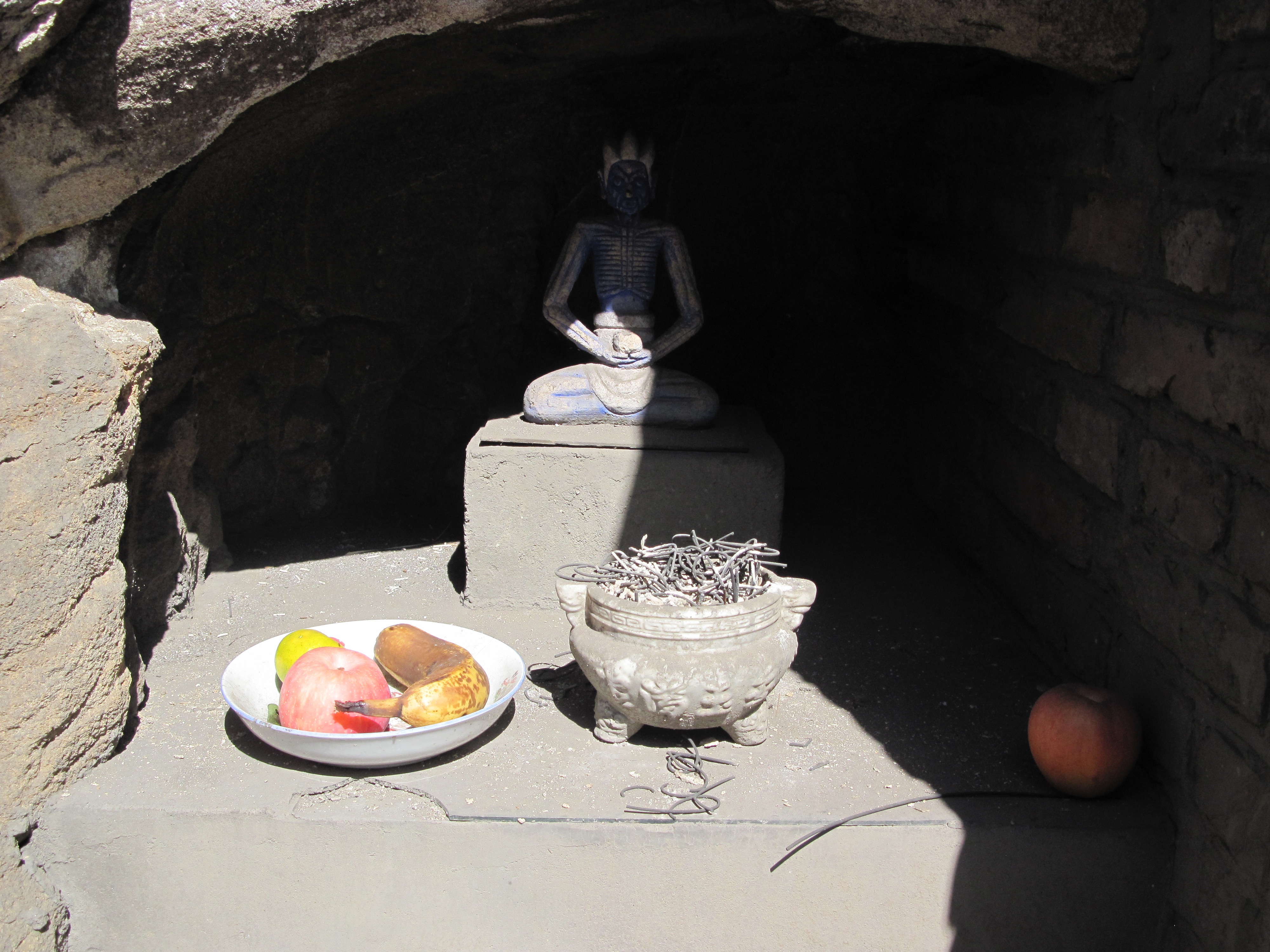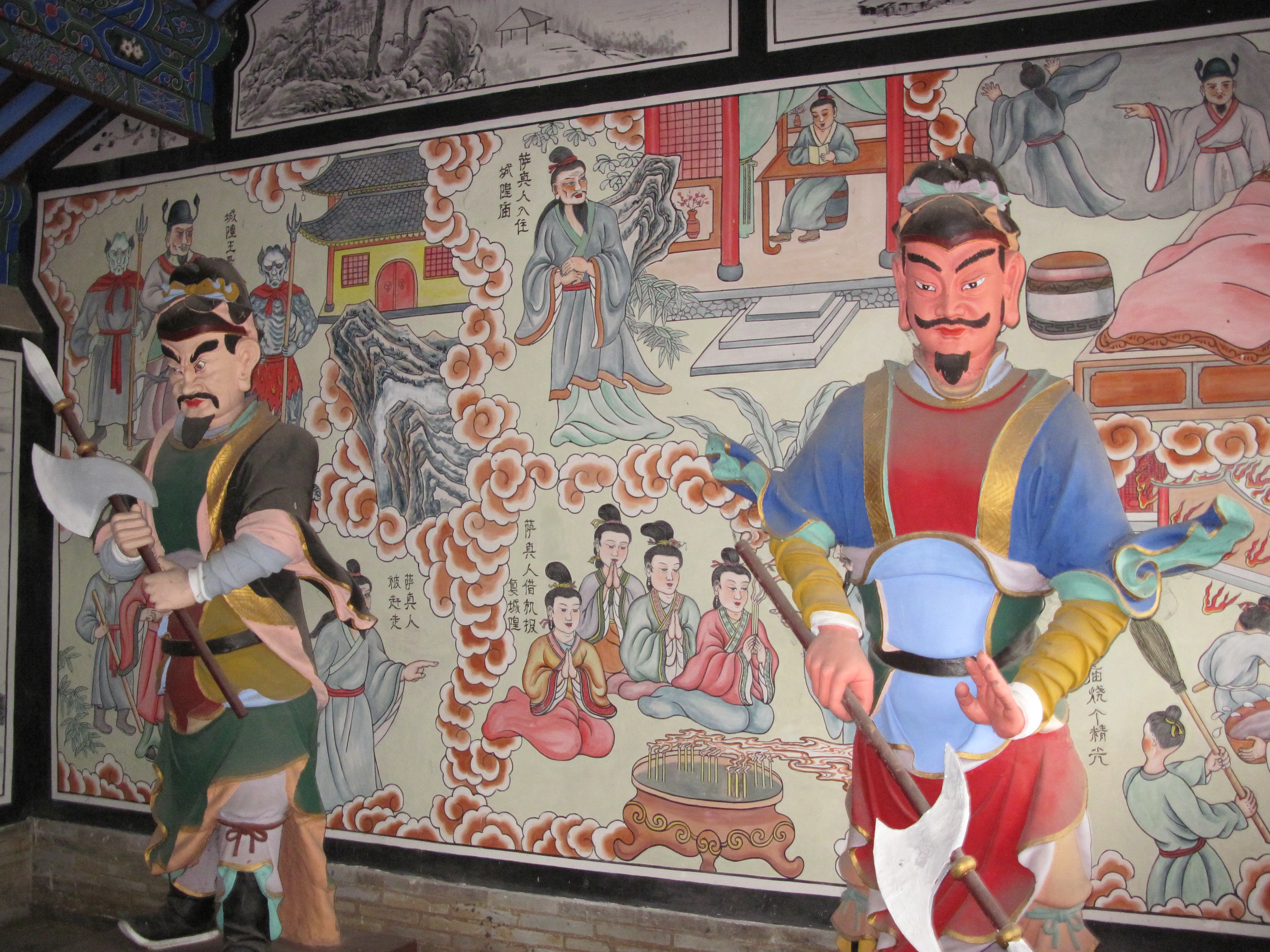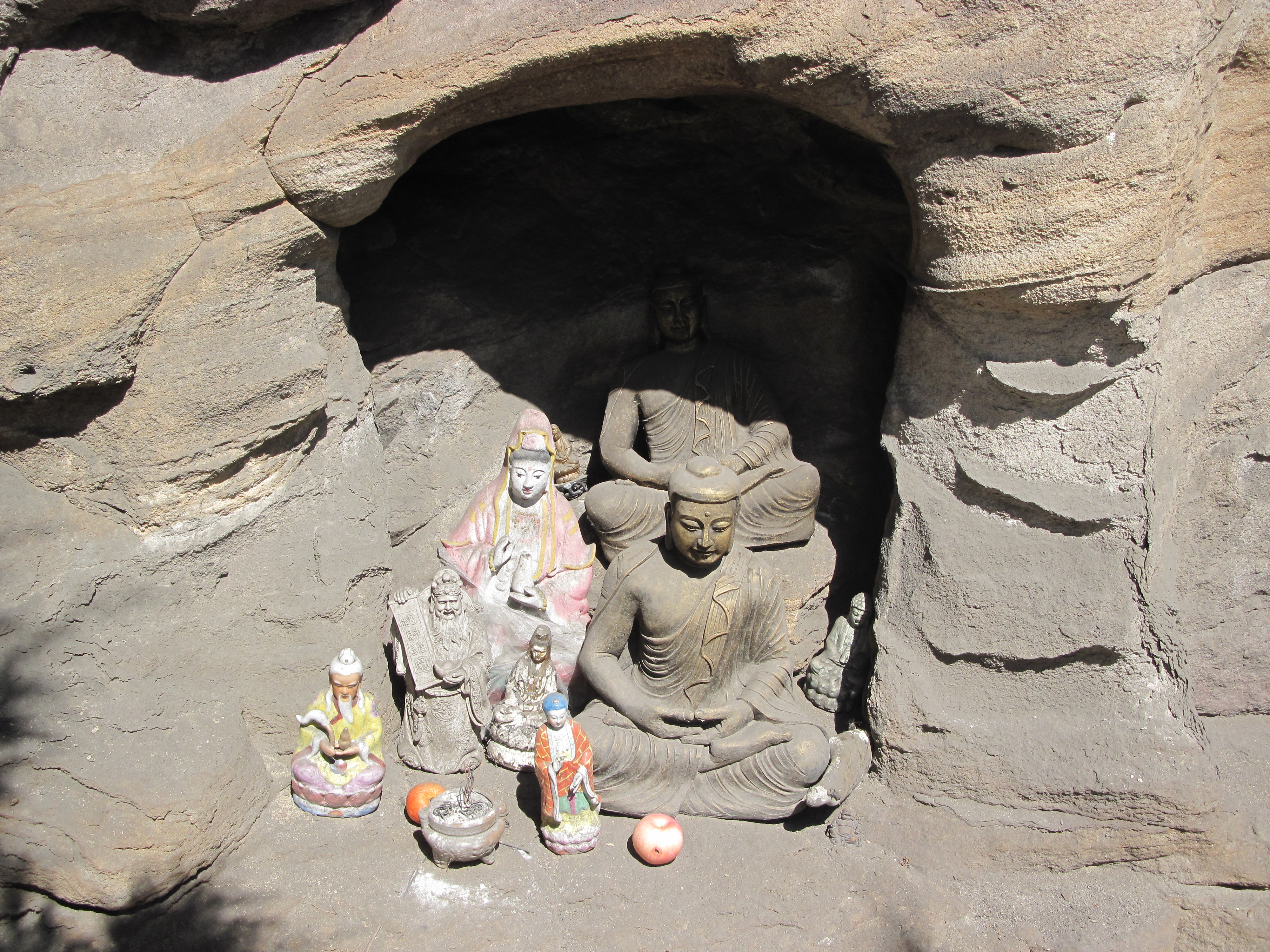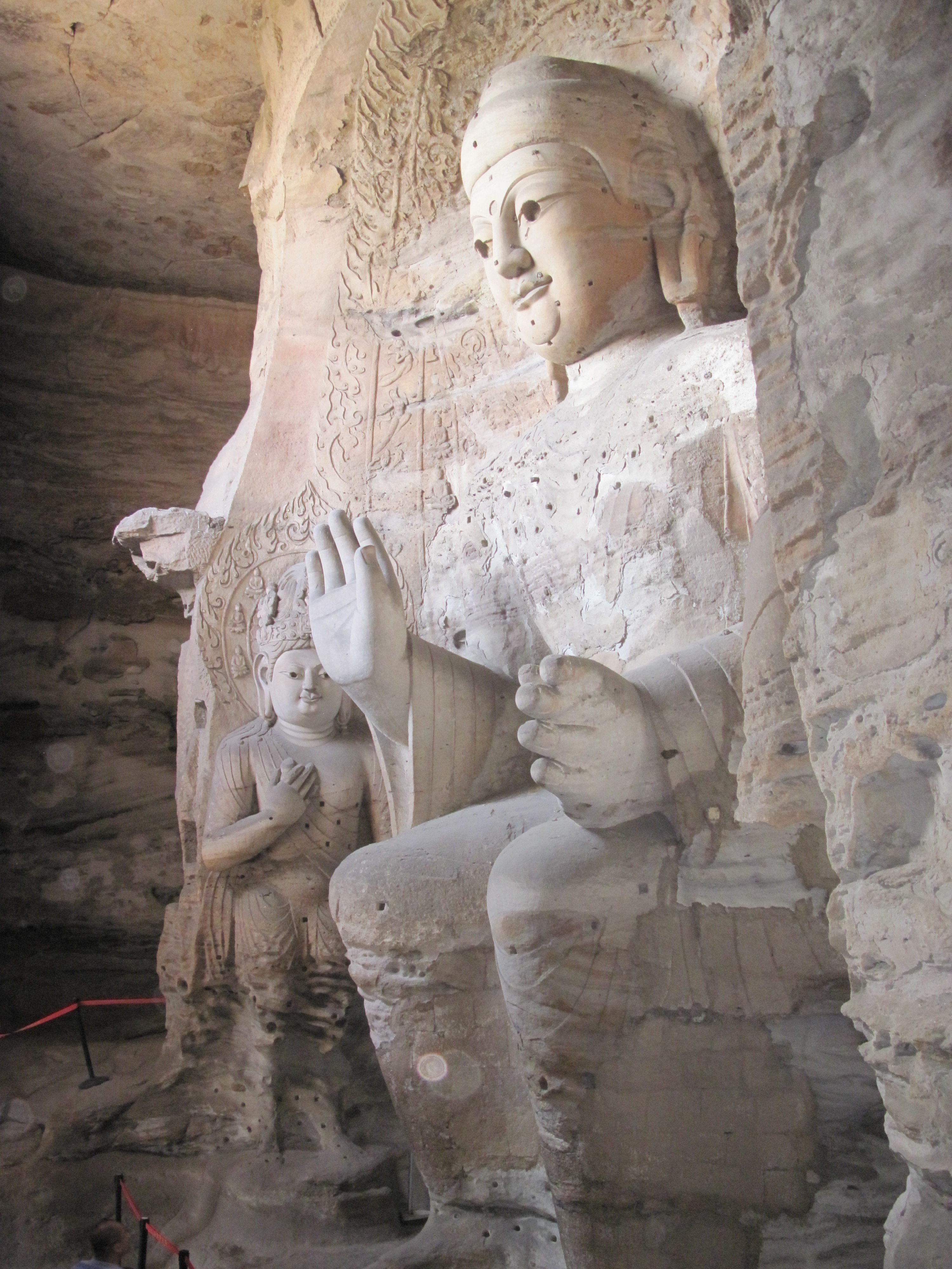 Als we Zouyun uit zijn fietsen we langs veel oude kleine dorpjes die we af en toe in fietsen om wat foto’s te maken. Op de kruispunten van de 109 is het in de dorpjes heel druk en staan de oudere mensen druk met elkaar te buurten. Als we passeren vallen de gesprekken stil een krijgen wij met hun verbaasde blikken alle aandacht. Het landschap is prachtig. Op een gegeven moment denken we in een dorpje nog restanten van de Muur te zien en gaan we de ruïnes van dichterbij bekijken. We ontmoeten een man met een juk, die met een man en een vrouw staat te buurten, die zaden aan het drogen zijn en proberen bij hen de oorspronkelijke functie van de ruïnes te achterhalen. Wytze maakt een tekening van de Muur met kantelen waarop ze bevestigend antwoorden. Toch denken we dat het geen restant van De Grote Muur is maar van een oude stadsmuur. Het blijft toch een mooi ruïne die mocht hij in Nederland liggen waarschijnlijk toch wel beter onderhouden zou worden. Veel dorpjes die we later nog passeren zijn leeg of voor het grootste gedeelte gesloopt. Op een berghelling zien we al van ver een groot tempelcomplex liggen waar ik wel even wil gaan kijken. Wytze vindt het vaak lastig om te stoppen en even wat te gaan bekijken en wil dat nu ook niet! Rare is dat als ik mijn zin dan toch doordrijf hij achteraf meestal heel blij is dat we even zijn gaan kijken. Bij deze tempel hoef ik mijn zin niet door te drijven omdat het gesloten is. Even later passeren we een hek dat voor een bergwand geplaatst is en waarachter kleine grotten zichtbaar zijn. Ik stuur mijn fiets meteen naar een opening in het hek en stal mijn fiets bij een hutje waarin een bewaker ligt te slapen. In de bergwand zijn kleine grotten gemaakt met daarin Boeddha beeldjes en offergaven zoals fruit en prullaria. Mooie monumentjes maar schandelijk slecht onderhouden en allemaal onder een dikke laag stof. Met een omweg komen we in Yungang aan waar we eerst een toeristisch mijnwerkersdorp in fietsen. Dat blijkt de verkeerde afslag dus moeten we even terug. Uiteindelijk komen we dan aan op de parkeerplaats bij de Yungang Grottoes, waar het aantal souvenirkraampjes al aangeeft dat het hier om een grote attractie gaat. Eenmaal binnen overtreft het al onze verwachtingen. Prachtig!! Via een in een grote vijver gelegen tempel komen we in een wandelpark terecht waarin ons een wandelroute naar een steile bergwand brengt. In de bergwand zijn enorme grotten uitgehouwen waarin grote Boeddhabeelden staan . Sommige grotten hebben een speciale tempelachtige ingang. Voorbij de ingang mag er binnen helaas niet gefotografeerd worden. De beelden in deze grotten zijn kolossaal en kleurrijk.De schoonheid en de verrassing overdonderd ons. We nemen er alle tijd voor. Op een picknick tafel voor het grootste Boeddhabeeld eten we onze wat verlate lunch en zoeken we wat verkoeling met een fris colaatje. Na dit hoogtepunt van onze reis fietsen we door naar Datong waar volgens Maps.me een Jinjiang hotel zou moeten zijn. We kunnen het niet vinden en melden ons dan maar bij een hotel in de buurt. Ze willen ons daar op basis van ons paspoort eigenlijk niet hebben. Volgens de bedrijfsleider mogen ze alleen gasten hebben die een geldige ID-kaart kunnen laten zien. Wytze reageert daarop heel snel door zijn ID-kaart op de balie te leggen. Ja , wonder boven wonder die wordt wel geaccepteerd als een geldig identificatiemiddel. Ik ga die van mij vlug uit de portefeuille halen die onderin mijn achtertas zit. De logica ontgaat ons maar het zal ons een zorg zijn want we mogen blijven. Op de kamer werkt de Wifi helaas niet dus loop ik even naar beneden om bij de balie de inlogcode op te vragen. Een code kunnen ze me niet geven, maar wel een andere kamer!! Hoewel Wytze al onder de douche staat in de oude kamer verhuis ik ondertussen al wat spullen naar de nieuwe kamer. We gaan om de hoek eten bij een restaurant dat door 2 meiden gerund wordt. Toen we passeerden zagen ze wel dat we hongerig waren en nodigde ze ons uit om bij hen te komen eten. Ze maken voor ons rijst met ei en tomaat, verse rouwe groente met sojavlees en paddenstoelen. Als service van de zaak krijgen we nog een schoteltje met zoete iets behaarde peultjes. We hebben heerlijk gegeten. Terug op de kamer plaats ik op de Memori-site van Ad nog een foto van hem en mij als resp. Brighella en Truffaldino.