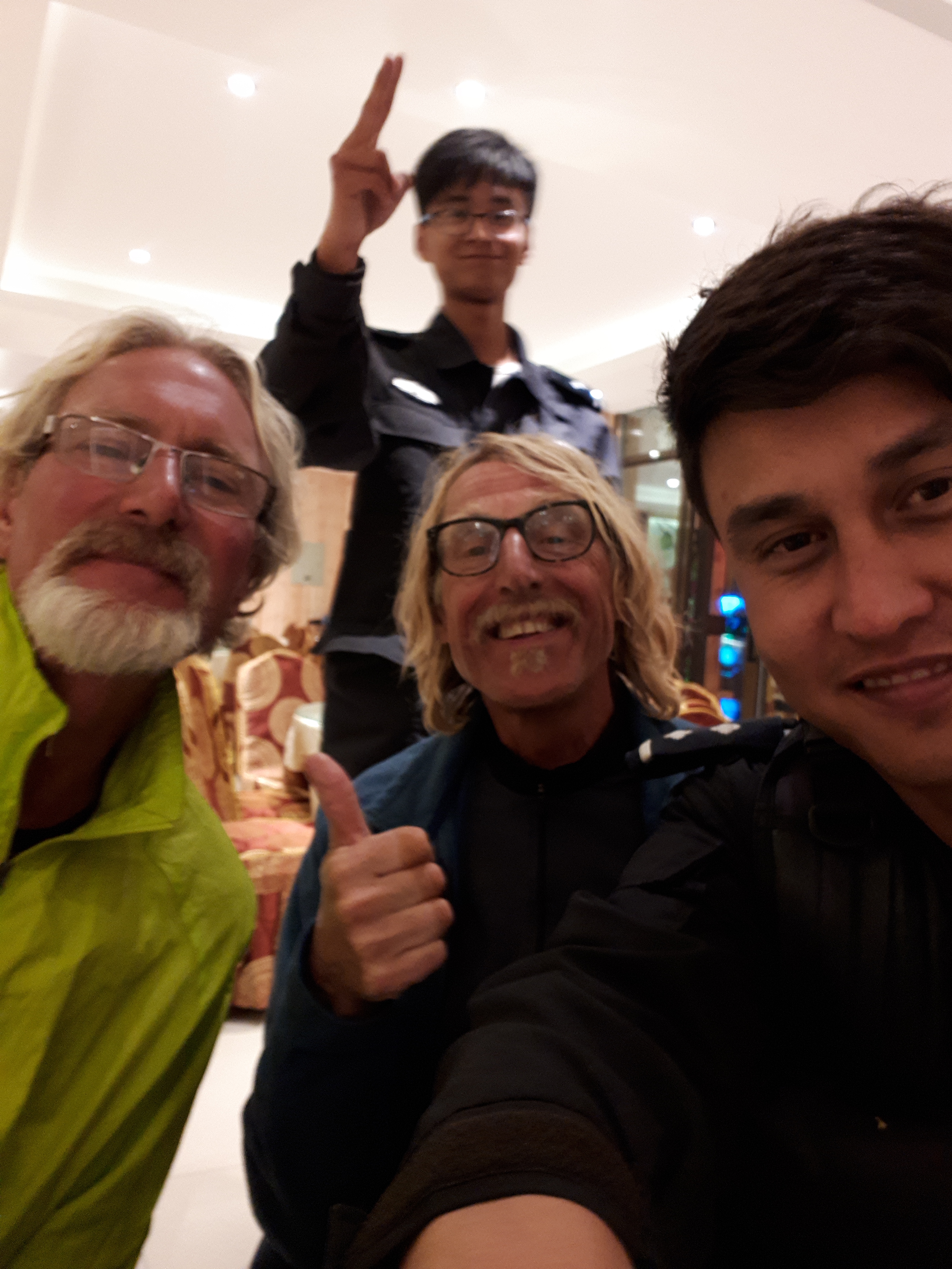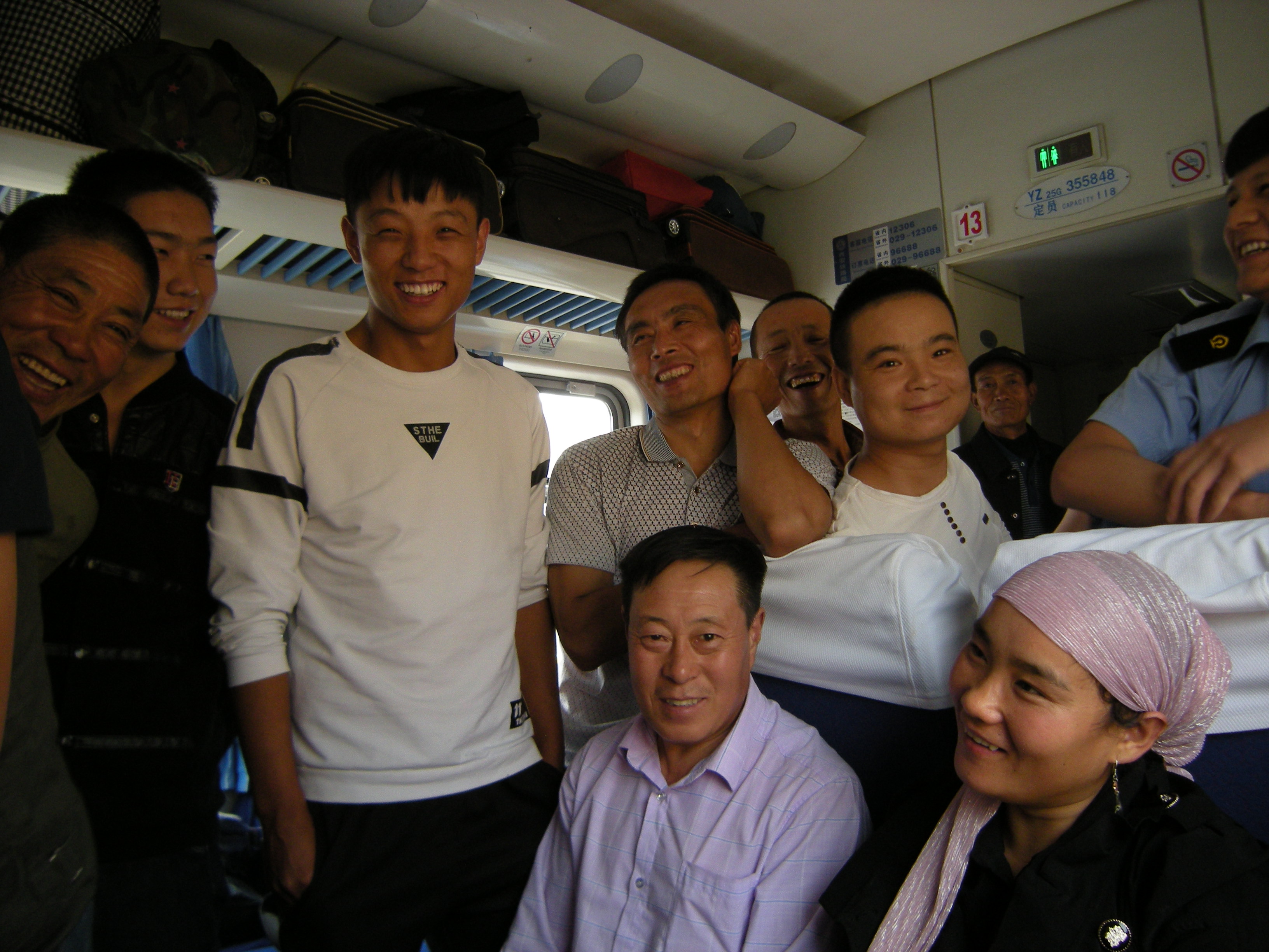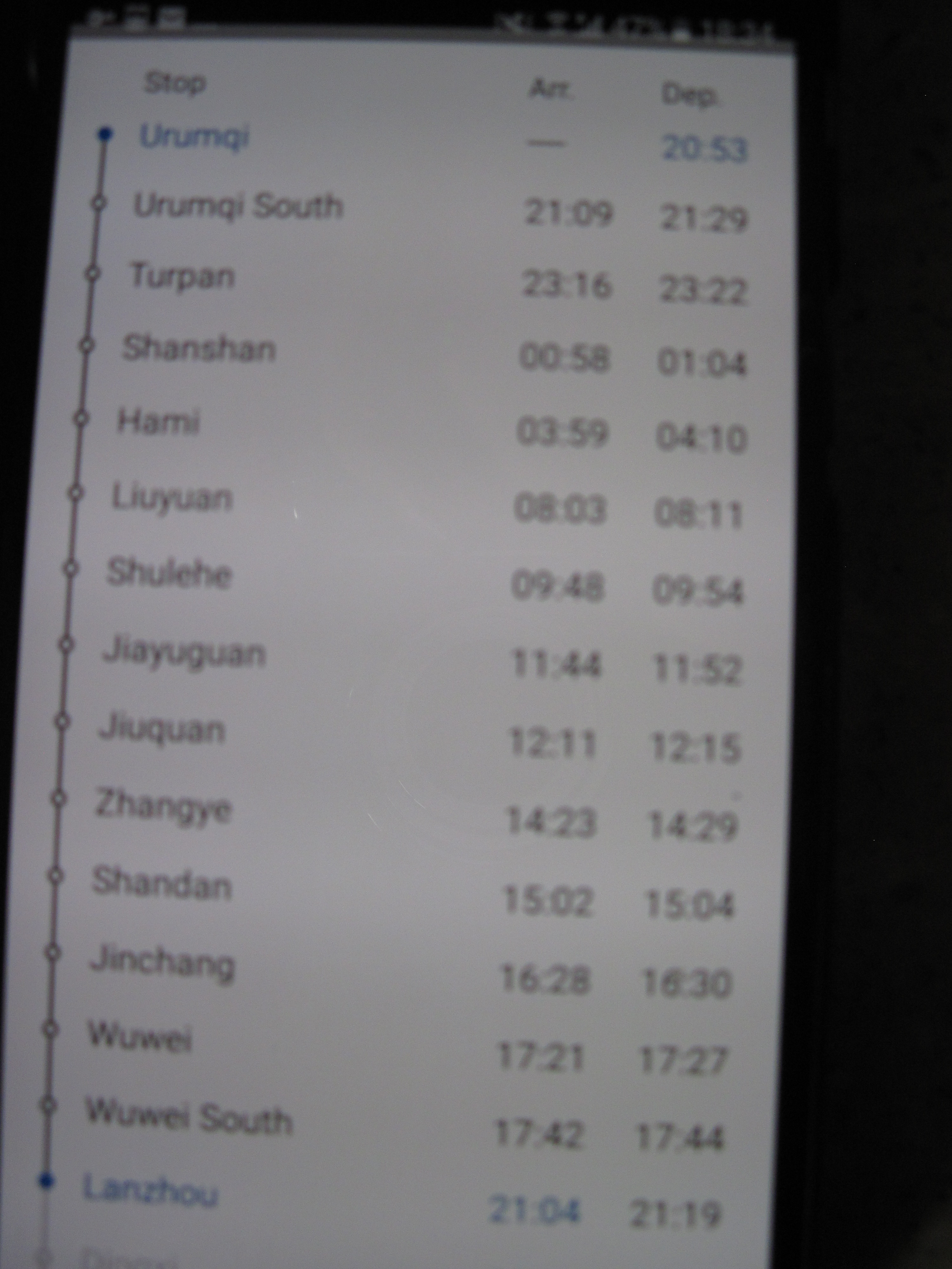 Ook na de tweede nacht in Ürümchi slapen we wat uit. We moeten een beetje tijd rekken want we hoeven pas ’s middags ergens op het station te zijn dus gaan we ook wat later naar ons uitgebreide hotelontbijt. Rond 13.00 uur checken we toch maar uit en hoewel Wytze de deposito bon kwijt geraakt is krijgen we onze 200 Yuan borg toch terug. Een uur later zijn we al bij het station en komen we via een lange ronde voor het station op de juiste vloerhoogte bij de Bagageafgifte uit. Alle tassen moeten door de scanner, de fiets kan erlangs af. De beambte ziet dat er een bezinefles op mijn frame zit en zegt dat ik er die af moet halen anders mag de fiets niet mee. Ik haal de fles, die helemaal onder de modder zit, eraf en stop die samen met een bidon waar nog een beetje water inzit in een plastic zak en dan in de plunjebaal die ik als handbagage mee ga nemen. De tassen worden in een grote zak gestopt en gelabeld en kunnen zo mee. Het versturen van fiets en bagage verloopt soepeler als gedacht dus moeten we nog veel tijd overbruggen voordat we om 20.53 uur op de trein zullen stappen. We gaan naar de vertrekhal maar voordat we daar binnen mogen moeten wij en onze handbagage natuurlijk eerst gescand worden. Ik mag door maar als mijn zak met handbagage door de scanner gaat gaan alle alarmbellen af. De scanner heeft geconstateerd dat er een fles met vloeistof in de zak zit en die moet ik er dus uithalen. Omdat ik problemen verwacht met de benzinefles haal ik de bidon eruit. De bidon heeft wat gelekt en zit helemaal onder de modder van de benzinefles. Gadver wat een troep. Ik moet uit de bidon drinken om aan te tonen dat er slechts water in zit. Ik drink en nu zitten mijn handen en mijn mond onder de modder. Dan komt er toch het verzoek om ook de tweede ‘fles’ uit mijn tas te halen. Dju, ze hebben ze dus toch alle twee gedetecteerd. Ik haal mijn vieze benzinefles uit de tas en zie al aan de gezichten van de beveiligingsbeambten dat ze beet hebben. Ik moet weer drinken maar moet dan toch echt bekennen dat er geen water maar ‘petrol’ inzit. Ze verstaan mij niet maar als ze zelf gaan ruiken begrijpen ze wel waarom ik het niet wil drinken. In een mum van tijd worden we omringd door politieagentes die allemaal vragen stellen die wij niet willen of kunnen begrijpen. Ze graaien nog een keer door mijn handbagage en komen daar alleen maar natte en met modder besmeurde spullen tegen. Meekomen!! Is nu het bevel en dan worden we onder begeleiding van 2 agenten en 4 agentes afgevoerd naar een aparte verhoorruimte in de vertrekhal, waar we meteen gezelschap krijgen van een agent met een videocamera. Als de cameraman geïnstalleerd is en onze paspoorten ingenomen zijn kan de ondervraging beginnen. Via de vertaalapp’s op de mobieltjes van de agenten worden steeds maar dezelfde vragen op ons afgevuurd. Waar komen jullie vandaan? Waar en wanneer zijn jullie China binnengekomen? Waar heb je de benzine gekocht? Wat doe je daar mee? De 2 politiemannen nemen nu ook onze treinkaartjes mee en gaan zich in een andere ruimte beraden. De 4 politiedames blijven nog even doorvragen maar gaan steeds meer op de gezellige toer. Ze vinden ons wel interessant en willen met ons op de foto. Een agente vraagt zelfs of ik zanger ben en of ik een lied wil zingen. De hele affaire die heel spannend begint en ontspannend eindigt duurt bij elkaar wel 2 uur met als uiteindelijk resultaat dat ik mijn bezinefles daar achter moet laten en dat we de tijd uiteindelijk toch wel vermakelijk zijn door gekomen. Hierna moeten we nog uren in de vertrekhal rondhangen en de tijd doden totdat om 21.00 uur onze trein arriveert. In de trein blijkt dat we niet bij elkaar zitten maar gelukkig is de jongen die tegenover Wytze zit bereid om met mij te ruilen. Tot aan station Ürümchi-zuid is er nog plaats genoeg in de trein, maar dan stroomt hij toch wel helemaal vol. Opstaan van de plaats is niet meer mogelijk. Er is nauwelijks ruimte om de benen eens even te strekken of nog wat uit het bagagerek te halen. Het wordt wat dat betreft een verschrikkelijke treinreis. Wytze en ik zitten bij het raam op 2 tegenover elkaar geplaatste 3-persoons banken. Op de 3 zitplaatsen zitten aan de kant van Wytze nog een man en een vrouw met een kind en aan de andere kant bij mij nog een vrouw met een kind en nog een man. Voor de kinderen zijn er geen zitplaatsen gereserveerd dus moeten die mensen elkaar aflossen. Het jongetje langs Wytze kan niet slapen en wordt daarom volgepropt met medicijnen. Hij moet een luier aan maar is dat duidelijk niet gewend dus krijgt hij regelmatig klappen als hij de luier uit wil doen. De vader van het kind is een lompe bruut. Als hij vindt dat zijn vrouw iets niet goed gedaan heeft geeft hij haar een stomp op het oog. De vrouw geeft geen kik en houdt haar hand even op de zere plek. Ik denk dat het niet de eerste keer is dat de man haar slaat. Het kindje naast mij heeft geen luier en ook geen onderbroek aan maar een legging zonder kruis en plast me op een gegeven moment bijna nat. De stoffen bank is echter wel zeiknat. Haar moeder slaapt zittend op een tas tussen de twee banken in en heeft haar hoofd op mijn voeten te rusten gelegd. Na verloop van tijd stinkt het verschrikkelijk in de trein. De mensen hebben bijna allemaal doosjes met noedels bij zich en op de trein is warm water beschikbaar. Er wordt dus wat afgeslurpt. Af en toe komt er een karretje met eten, drinken en fruit langs en dan weer een verkoper van speelgoed, zaklampen etc.. Als de lompe man en zijn vrouw met het jongetje de trein verlaten hebben komen er een vrouw met haar dochter bij op de vrijgekomen plaatsen zitten. De vrouw wil wel buurten en vraagt waar we vandaan komen. We proberen het met behulp van de landkaart in het plaatjesboek uit te leggen en dan ineens staan alle mensen die al uren om ons heen zitten op en komen luisteren. De mensen die wat Engelse woordjes kennen treden op als vertalers. Onze woordenboekjes gaan van hand tot hand en worden goed bekeken. Door he