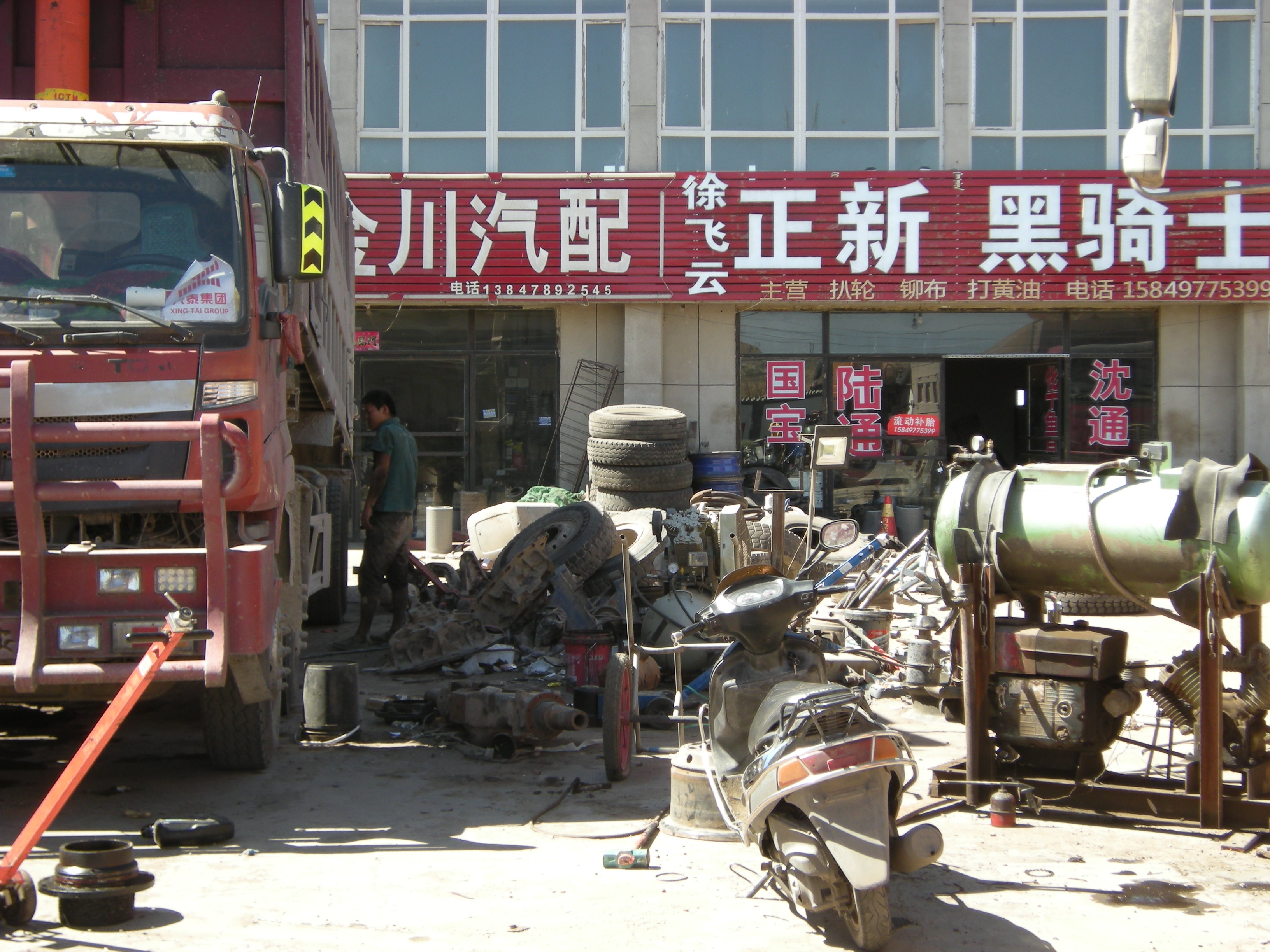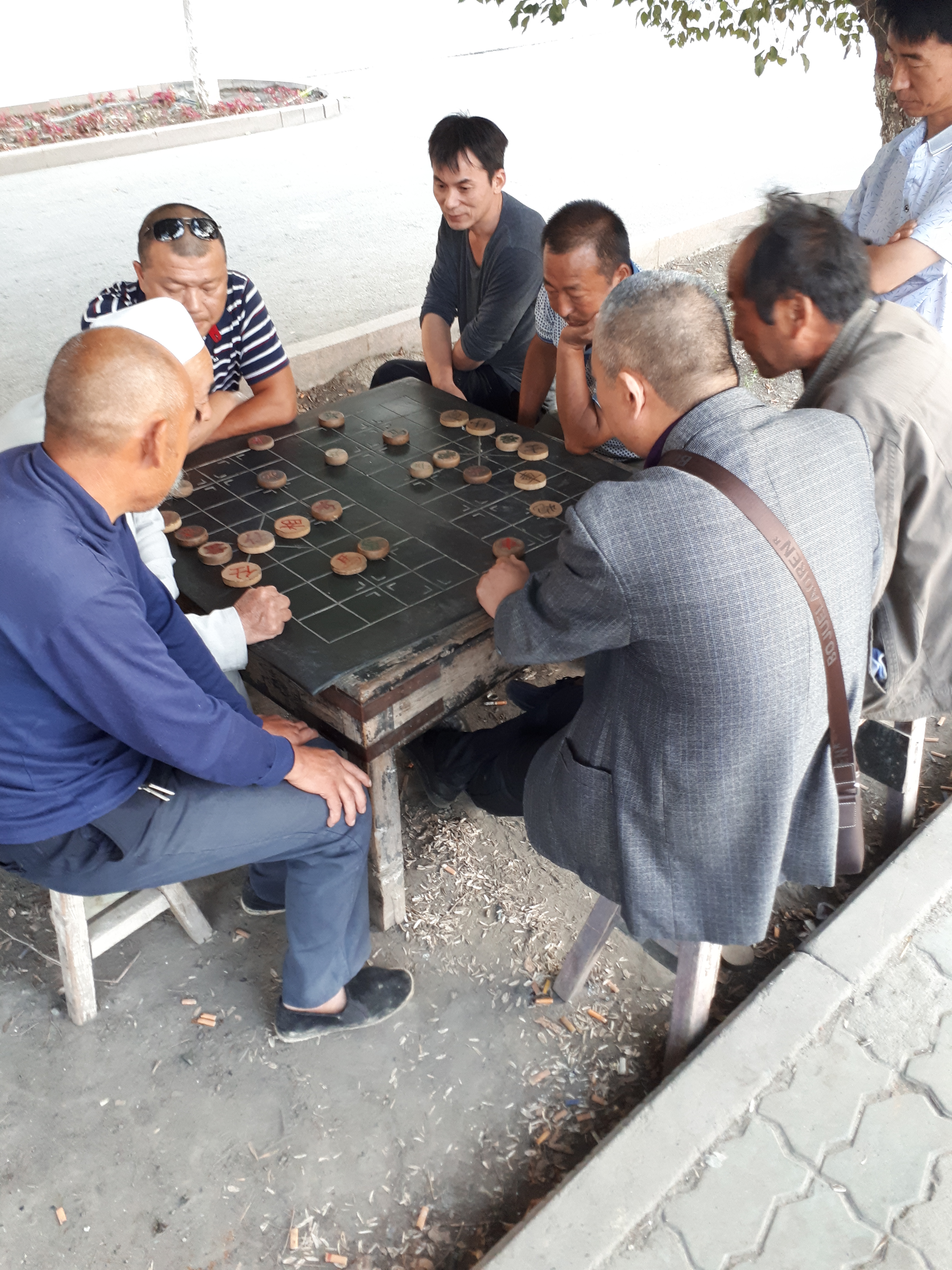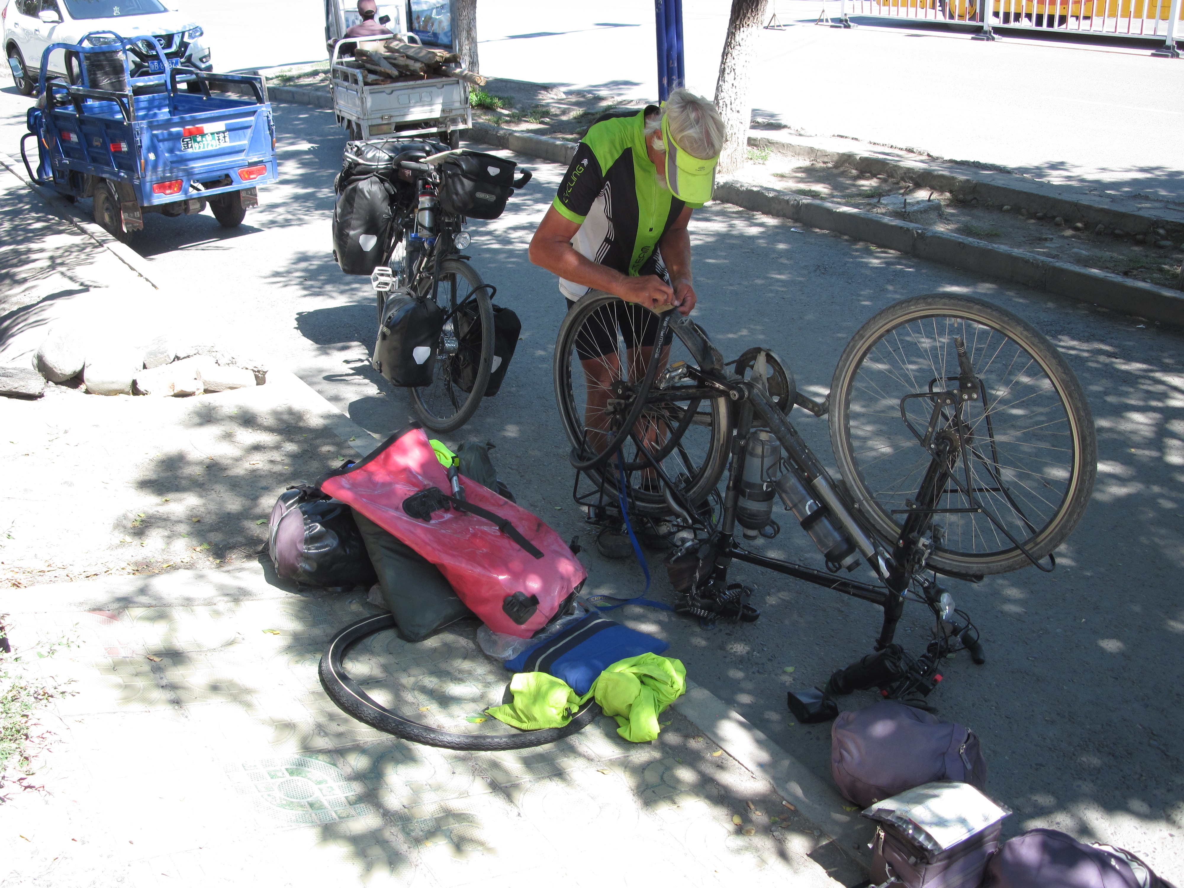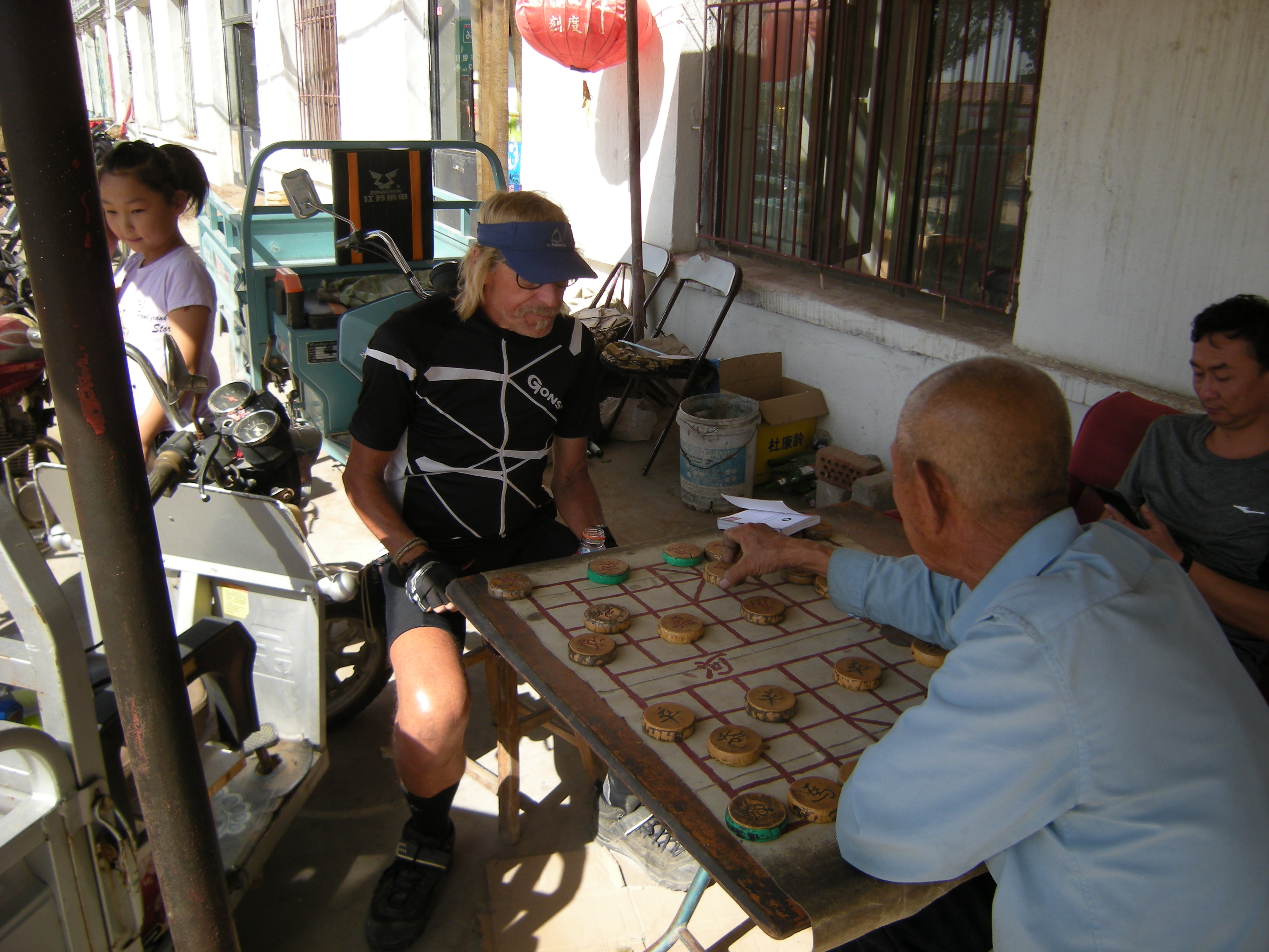 We hebben vandaag een lange rit voor de boeg. Het ontbijt hebben we gisterenavond al gekocht en eten we op de kamer op. De fietsen passen met bepakking en al in de lift dus hoeven we die niet apart naar beneden te sjouwen. Voor we het stadje uitfietsen slaan we nog wat eten en drinken in voor onderweg. Net buiten de stad komen we door een vies industriegebied te fietsen. Tegen de berghellingen liggen verlaten mijnen. De weg is hier en daar slecht en kapotgereden, maar het landschap wordt mooier en er is weer van alles te zien waar we van kunnen genieten. Tijdens de ochtendpauze schuiven we bij een winkeltje aan bij 2 mannen die bij een groot chinees schaakbord zitten. Het is een mooi spel maar we begrijpen er niets van. Het is er ook gezellig en het wordt ook steeds drukker en het draait natuurlijk weer op een fotosessie uit. Even na deze stop passeren we in de middle of nowhere een soort van Boeddhistische gedenkteken. Het ligt er zwaar verwaarloosd bij en overal ligt er geofferde kapotte prullaria. Ik kan maar niet begrijpen dat als je de Boeddha zo hoog acht dat je dan zo slordig met zo’n gedenkteken om kunt gaan. De weg naar Baotou is nog lang en er is weer veel vrachtverkeer dat veelal ladingen steenkool vervoert. Op het wegdek dus weer veel gruis en kooltjes. We zien Baotou al van ver liggen maar het is net of we maar niet dichterbij komen. Maps.ms stuurt ons in de fietsmode 2 keer een opgebroken weg in dus zet ik de app maar op de automode. Dat gaat beter. We fietsen wel met een boog om de stad naar het centrum en komen dan opnieuw bij een wegomlegging terecht en dan .. pfff loopt mijn achterband zachtjes leeg. De buitenband is aan de zijkant opengescheurd en slingert heen en weer. Met bijpompen haal ik het hotel en verwissel daar de achterband met de oude nog bewaarde voorband. Omdat de binnenband nog redelijk hard is, dacht ik dat die toch niet lek zou zijn maar die inschatting komt anders uit. Het achterwiel moet er even later dus nog een keer uit om ook de binnenband te verwisselen. Als die nou maar hard blijft. We eten bij een KFC restaurant voor de vierde keer fastfood eten. Dit is wel de laatste keer vinden we allebei.