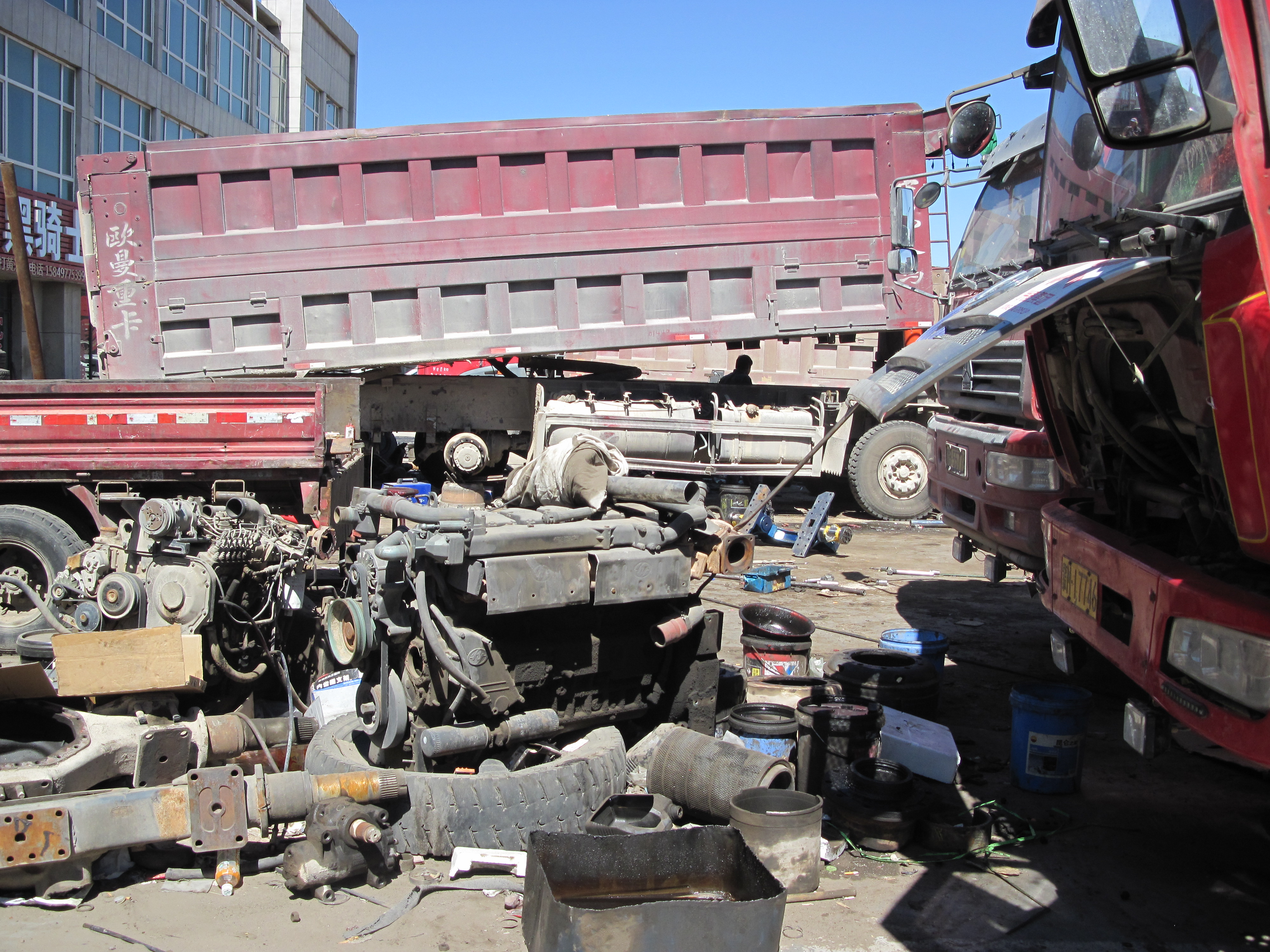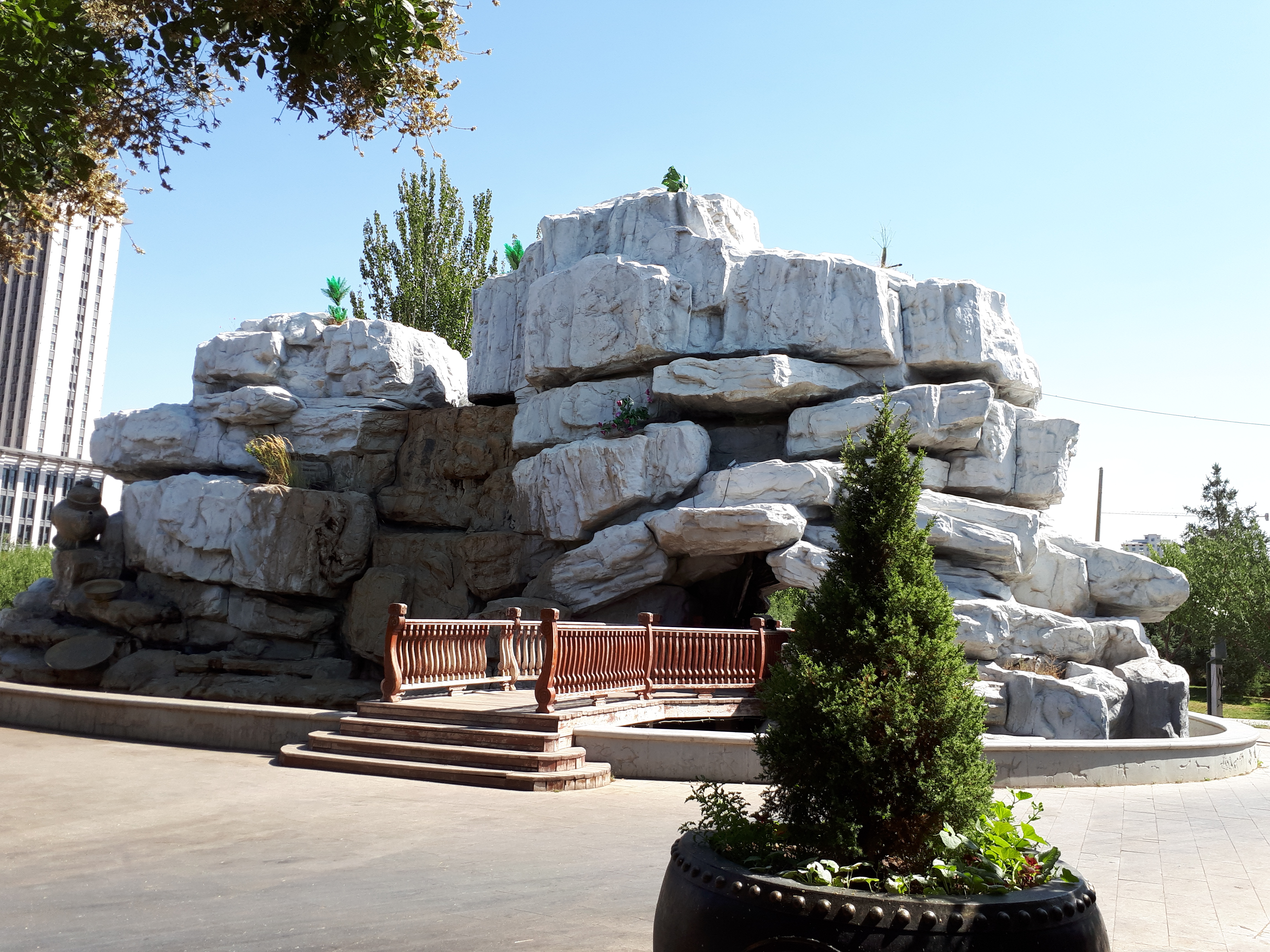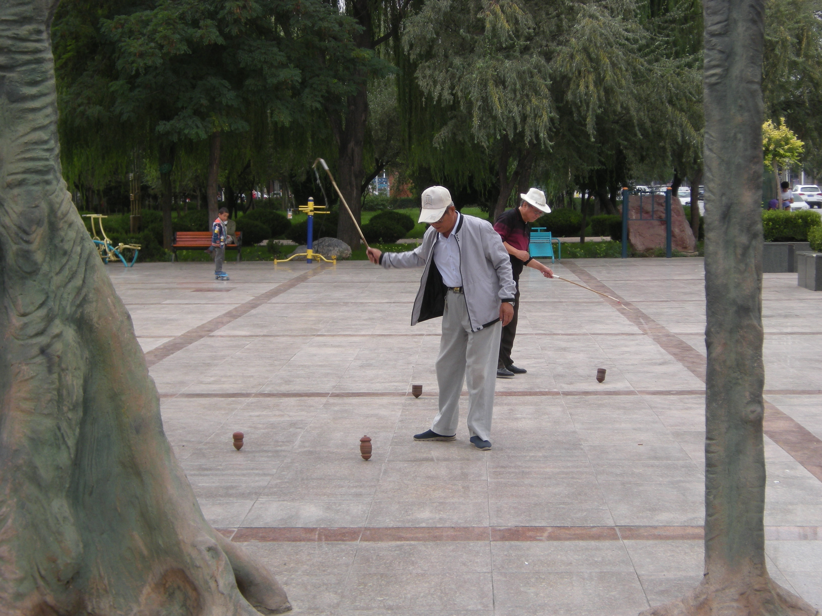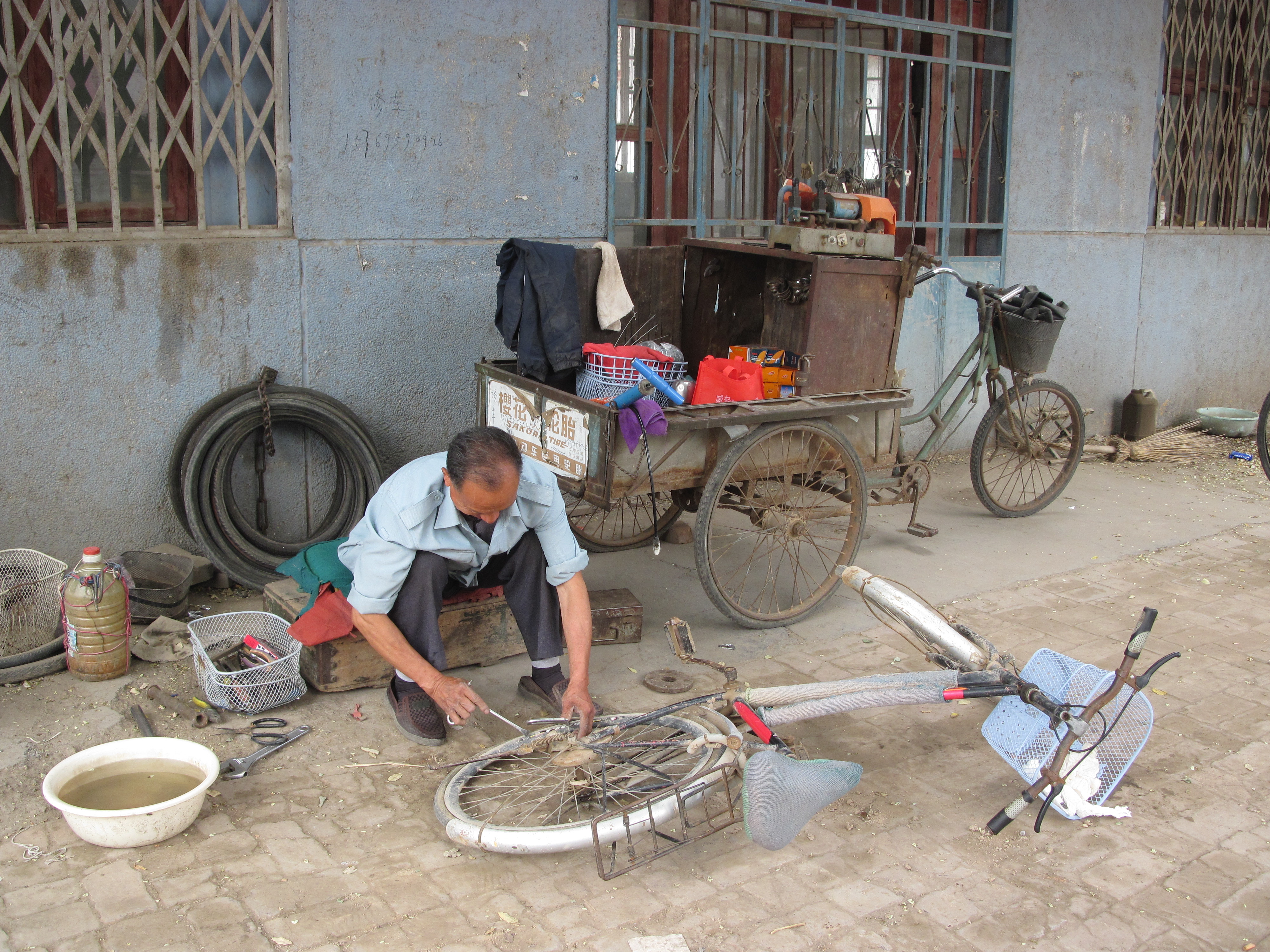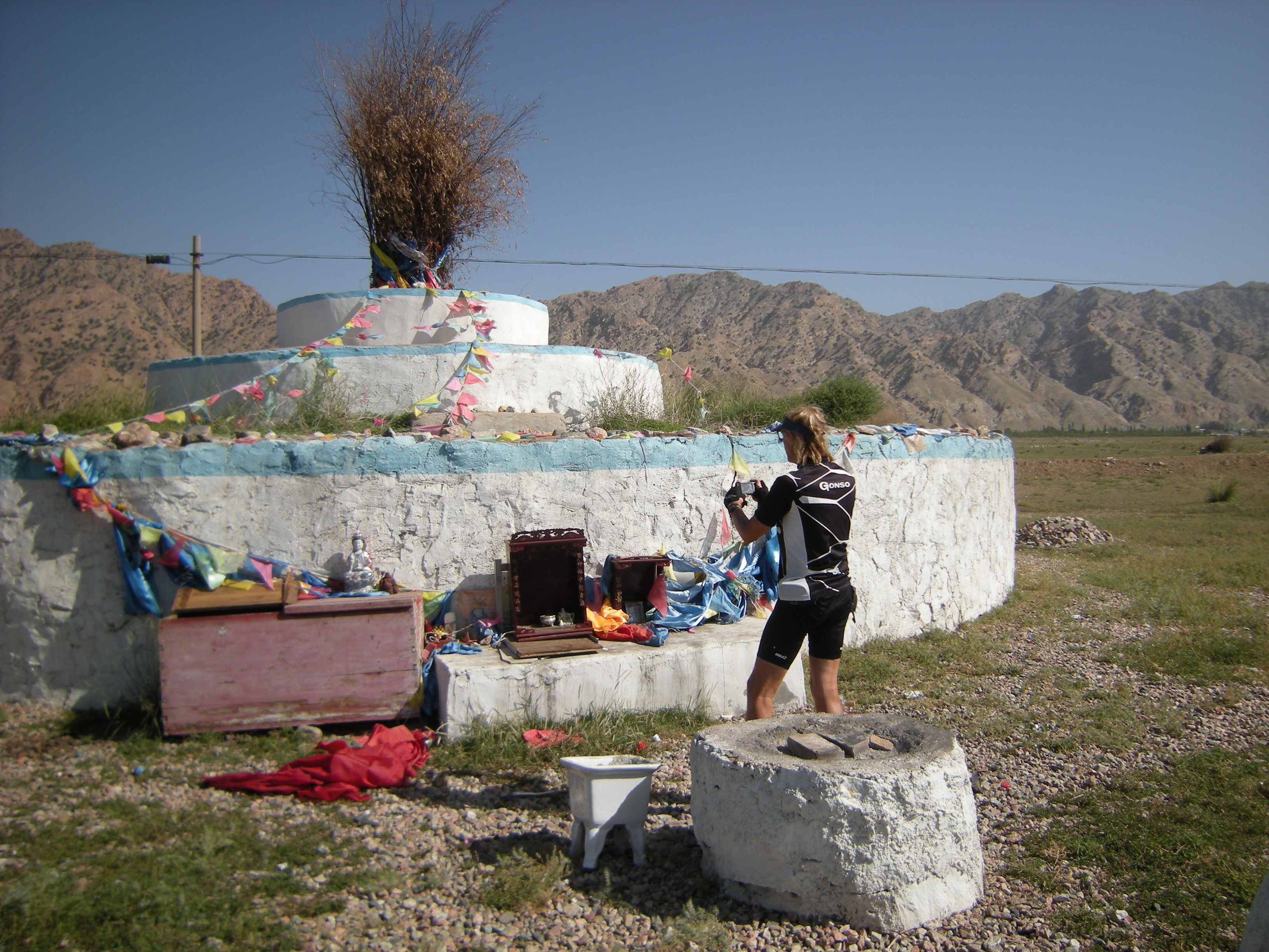 We hebben vandaag een lange rit voor de boeg. Het ontbijt hebben we gisterenavond al gekocht en eten we op de kamer op. De fietsen passen met bepakking en al in de lift dus hoeven we die niet apart naar beneden te sjouwen. Voor we het stadje uitfietsen slaan we nog wat eten en drinken in voor onderweg. Net buiten de stad komen we door een vies industriegebied te fietsen. Tegen de berghellingen liggen verlaten mijnen. De weg is hier en daar slecht en kapotgereden, maar het landschap wordt mooier en er is weer van alles te zien waar we van kunnen genieten. Tijdens de ochtendpauze schuiven we bij een winkeltje aan bij 2 mannen die bij een groot chinees schaakbord zitten. Het is een mooi spel maar we begrijpen er niets van. Het is er ook gezellig en het wordt ook steeds drukker en het draait natuurlijk weer op een fotosessie uit. Even na deze stop passeren we in de middle of nowhere een soort van Boeddhistische gedenkteken. Het ligt er zwaar verwaarloosd bij en overal ligt er geofferde kapotte prullaria. Ik kan maar niet begrijpen dat als je de Boeddha zo hoog acht dat je dan zo slordig met zo’n gedenkteken om kunt gaan. De weg naar Baotou is nog lang en er is weer veel vrachtverkeer dat veelal ladingen steenkool vervoert. Op het wegdek dus weer veel gruis en kooltjes. We zien Baotou al van ver liggen maar het is net of we maar niet dichterbij komen. Maps.ms stuurt ons in de fietsmode 2 keer een opgebroken weg in dus zet ik de app maar op de automode. Dat gaat beter. We fietsen wel met een boog om de stad naar het centrum en komen dan opnieuw bij een wegomlegging terecht en dan .. pfff loopt mijn achterband zachtjes leeg. De buitenband is aan de zijkant opengescheurd en slingert heen en weer. Met bijpompen haal ik het hotel en verwissel daar de achterband met de oude nog bewaarde voorband. Omdat de binnenband nog redelijk hard is, dacht ik dat die toch niet lek zou zijn maar die inschatting komt anders uit. Het achterwiel moet er even later dus nog een keer uit om ook de binnenband te verwisselen. Als die nou maar hard blijft. We eten bij een KFC restaurant voor de vierde keer fastfood eten. Dit is wel de laatste keer vinden we allebei.