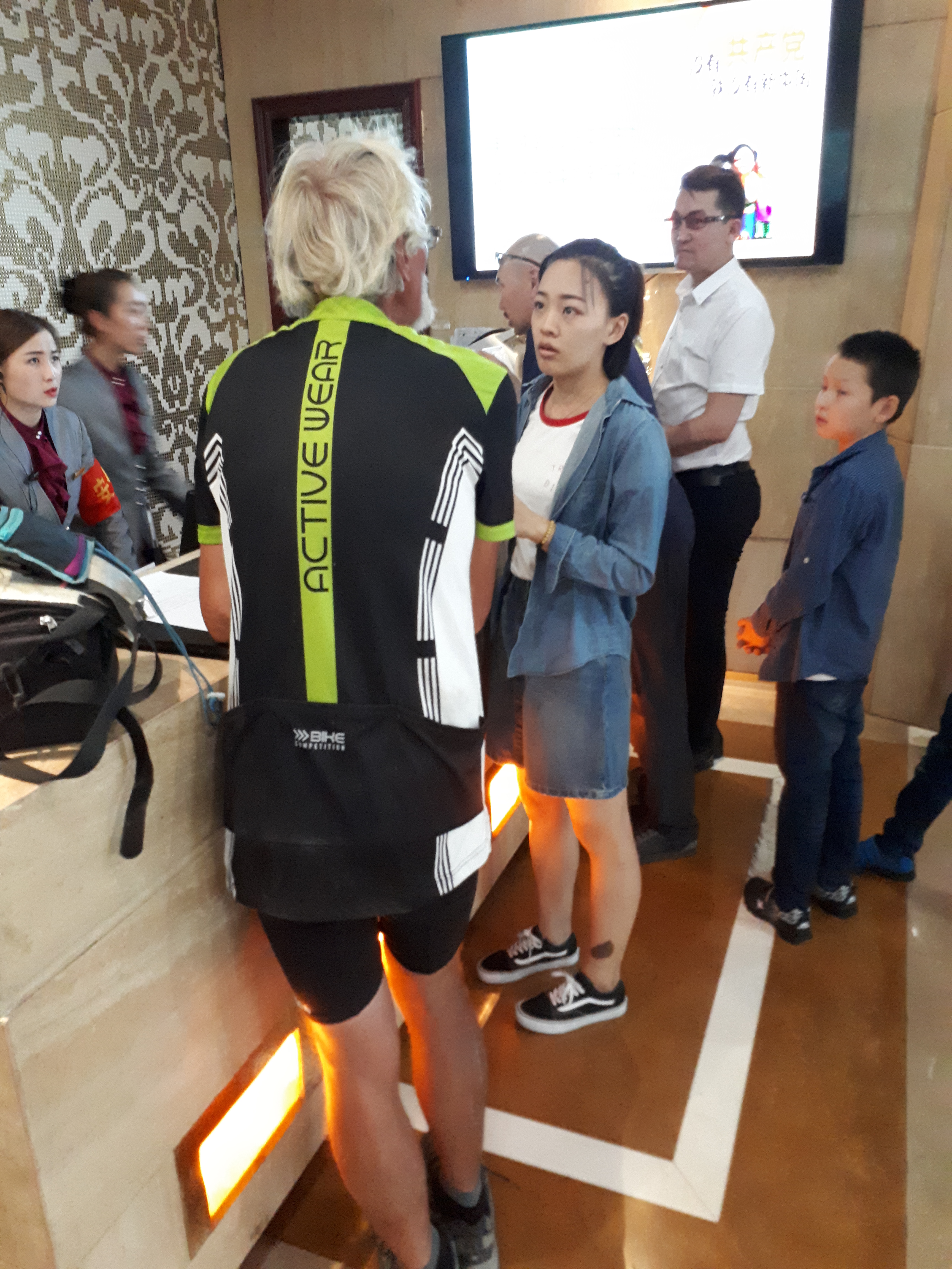 Bij het opstaan schijnt de zon al volop. Het hotelontbijt is goed verzorgd en er is zelfs koffie bij. We slaan nog wat extra water in en vervolgen onze route op de oostoever van de Gele Rivier, die we overigens maar af en toe te zien krijgen. Het landschap krijgt steeds meer een woestijnachtig karakter en ook vandaag zijn er weer veel vrachtwagens op de weg. De meeste vervoeren een soort van gravel dus stoft het weer verschrikkelijk en liggen de bermen vol met gruis en steenslag. Bij een opgebroken weg worden we door een ons tegemoet komende vrachtwagen bijna van de weg gereden en staan we in een grote stofwolk van de schrik te bekomen. We ontmoeten nog een Chinese fietser die van Peking komt en onderweg is naar Tibet. Hij spreekt een woordje Engelsen laat op onze de kaart zien hoe hij ongeveer gefietst heeft. Hij heeft de 110 niet overal gevolgd maar is over een parallelle weg langs de rivier gegaan. Alle Chinese en Japanse fietsers die we tegenkomen dragen overigens allemaal lange broeken, lange mouwen, een stofkapje en een helm. Bij het plaatsje Tost, op zo’n 9 km van Dengkou, passeren we het kilometerpaaltje 1000. We gaan er vanuit dat dat de afstand is naar Peking en maken daar dan natuurlijk een foto van. Het vinden van het gereserveerde hotel in Dengkou wordt een gedoe. Omdat we het viamaps.me niet kunnen vinden vragen we het aan een man op straat. Als we zijn aanwijzingen volgen komt de goede man ons in zijn auto achterna en biedt zijn excuses aan omdat hij ons verkeerd gestuurd heeft. Hij gaat nu met de auto voor ons rijden en we komen nu vrij vlot bij het via Ctrip gereserveerde hotel aan. Daar krijgen weer het gebruikelijke probleem dat ze geen buitenlanders mogen huisvesten. Een hoop gedoe want we hebben de kamer al betaald. Er wordt met Ctrip gebeld en die garanderen ons dat ze het geld binnen 10 dagen terug zullen storten. De baliemedewerkster adviseert ons om terug te fietsen naar het centrum en het bij het Youfi hotel te proberen. De medewerkster van het Youfihotel heeft duidelijk geen zin in ons. Ze schrijft wat op een briefje wat we natuurlijk niet kunnen lezen en negeert ons daarna volledig. We protesteren nog wel maar ze doet net of ze ons niet meer hoort. We druipen af en gaan op zoek naar een andere overnachtingsmogelijkheid. We vinden nog een hotel in het centrum. Een balie medewerkster reageert meteen met “natuurlijk hebben we een kamer voor jullie” maar wordt dan meteen door een collega gecorrigeerd. Opnieuw krijgen we het excuus “sorry maar we mogen niet aan buitenlanders verhuren” Ik zet mijn teleurgesteld gezicht op en vraag of ze geen alternatieve oplossing voor ons weten. 2 jonge meiden willen ons wel helpen en gaan met de telefoon aan de slag. Ze hebben wat gevonden zeggen ze en hebben ook al een taxi voor ons besteld!! Een taxi? Maar hoe moet dat met onze fietsen dan?? Oh ja natuurlijk daar hadden ze niet aan gedacht. De taxi wordt meteen afgebeld. De meiden overleggen even en bieden ons dan aan om ons met de brommer de weg te wijzen. Goed idee! Wij achter de meiden aan en die brengen ons … inderdaad weer terug naar het Youfi hotel waar we een halfuur geleden nog geweigerd werden. Geen zorgen zeggen de meiden, wij regelen dit voor jullie. En zo gebeurt het ook. Ineens is er geen enkel probleem meer met onze afkomst en kunnen de gebruikelijke formaliteiten opgestart worden. De fiets mag binnen en alles loopt nu vlot. Wat die meiden precies gedaan hebben weten we niet maar we hebben ze heel hartelijk bedankt voor de bemiddeling. We eten in een klein eettentje een vegetarische maaltijd. Het smaakt prima maar vult net niet genoeg dus koop ik er in een winkeltje nog maar broodje en een fles bier bij. Ik heb beloofd om vandaag nog met Sanne te chatten maar omdat dat pas kan als ze pauze heeft op de school en Wytze onderhand naar bed wil ga ik dat maar beneden doen in de grote ontvangsthal.