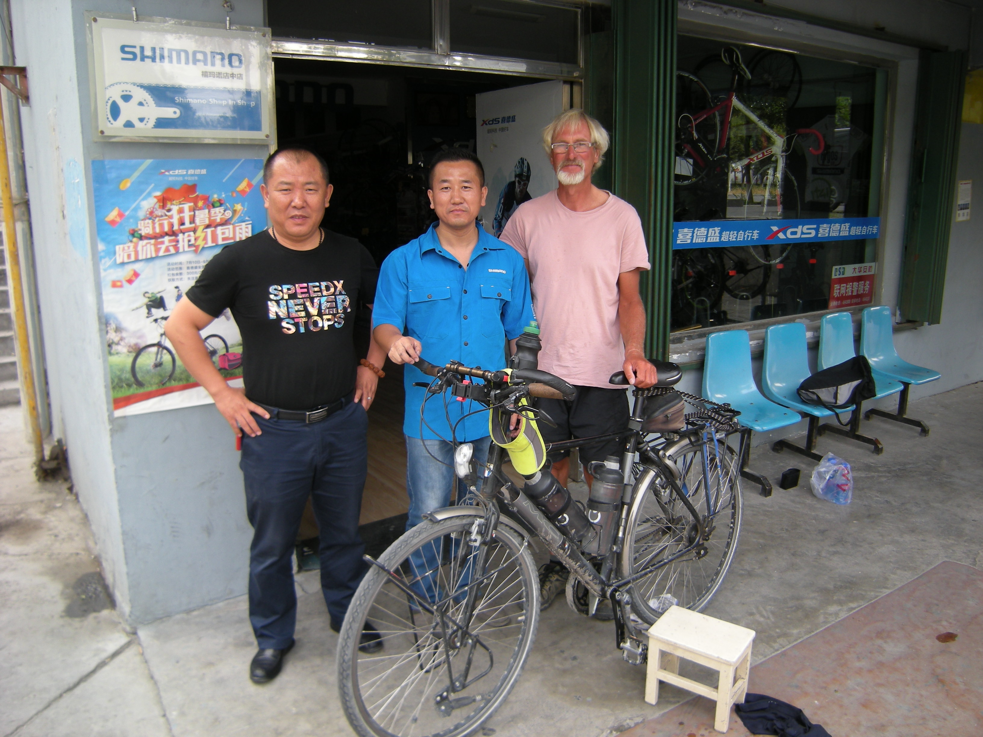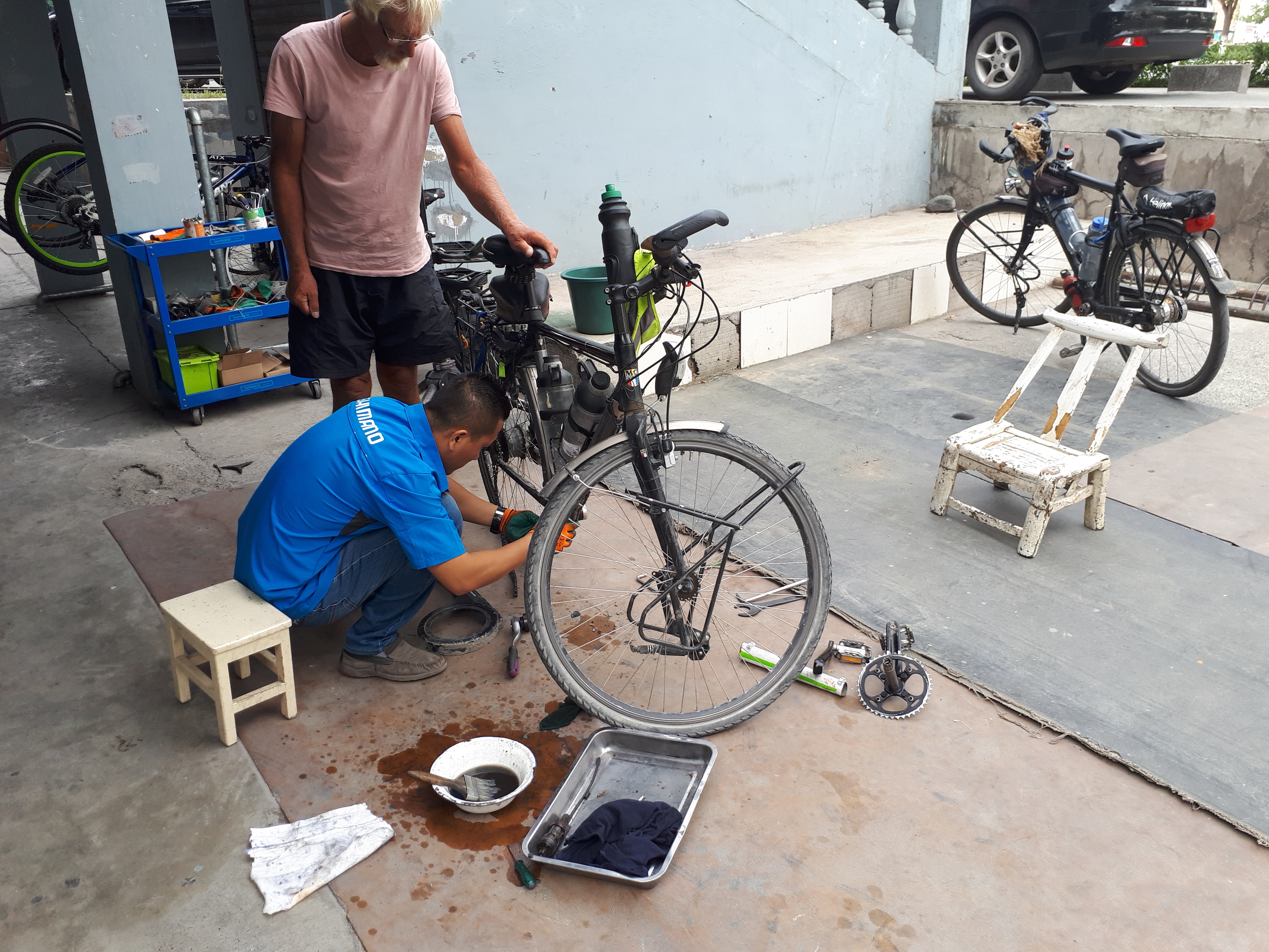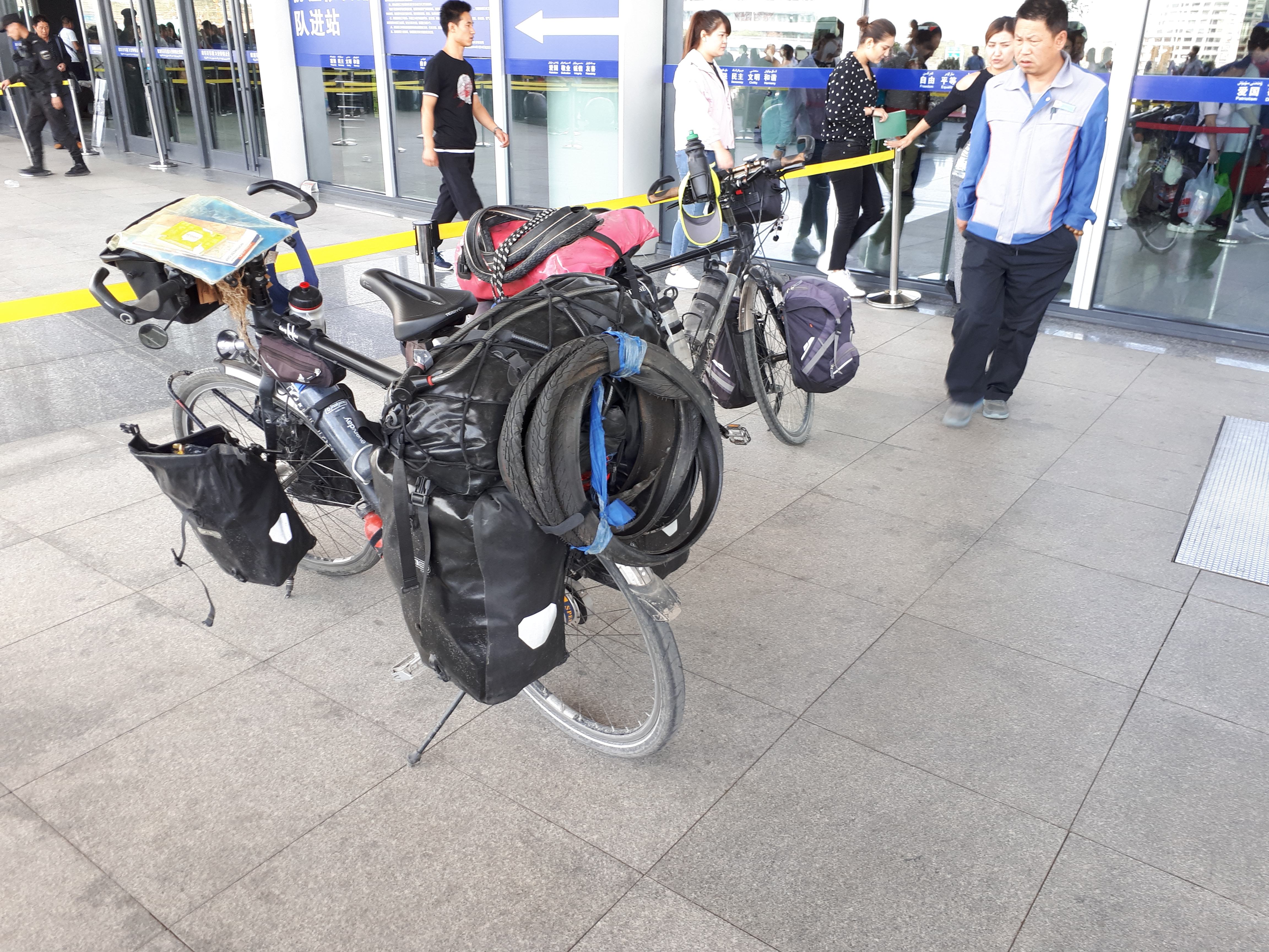 Rond 8 uur staan we op. Wytze gaat brood halen wat we even later op de binnenplaats lekker opeten. Sheng heeft al gechat en schrijft dat ze ook nog lang wakker gelegen heeft. Gisteravond heeft ze trouwens nog ‘n foto gestuurd van haar ‘terrarium’ met een heleboel jonge slakjes. Ze stuurt nog een tweede bericht met de vraag of we het goed vinden als Rex en zij ons op het vliegveld uit komen zwaaien. Wytze vindt het goed dus laat ik haar weten nog wel een keer afscheid te willen nemen. Wytze gaat dan op pad voor zijn laatste poging om toch nog iets voor Catrien te kopen en ik ga mijn fiets al wat klaar maken. Om kwart voor 12 komt Wytze blij terug. Hij is helemaal geslaagd. Hij heeft wel flink in de buidel gemoeten. Zijn strategie: Eerst zoveel geld pinnen als je uit wil geven en dan jezelf verplichten om dat bedrag ook helemaal op te kopen. Hij heeft zelfs nog een T-shirt gekocht! Als ik nog wat wil Appen blijkt dat mijn gratis VPN verlopen is. Alleen WeChatt doet het nu nog maar verder niets. Ik moet nog wel naar de jarige Sander bellen. Dan kunnen we eindelijk uitchecken en gaan we op weg naar het gereserveerde hotel op zo’n 2 km van de Airport. Met Maps.me lukt het uiteindelijk wel maar bij sommige viaducten moeten we via wat omweggetjes weer op de goede route terecht zien te komen. Wytze raakt steeds meer in paniek omdat hij nog benzine in zijn flesje heeft zitten en niet weet waar hij dat moet laten. Voor we bij het hotel vertrokken heeft hij daar in de buurt al nagevraagd of hij het ergens achter mocht laten maar niemand wilde het goedje hebben. Nu proberen we het bij benzinestations en garages maar ze willen het nergens hebben. Wytze raakt er overstuur van maar wil het toch ook niet zomaar ergens dumpen in de berm. De bermen langs de weg naar het vliegveld liggen trouwens wel vol met weggegooide huurfietsen. Er zit niets anders op dan het restant aan benzine dan maar met het kooktoestel op de branden. Hotel Hanting vinden we vrij snel en als we daar eenmaal ingekwartierd zijn gaat Wytze met zijn brander naar beneden en stookt daar in anderhalf uur de benzine op. Ik probeer ondertussen mijn bagage al te ontdoen van spullen die ik niet meer nodig zal hebben. In een lawaaierige tent in de buurt eten we onze laatste warme Chinese maaltijd. Ik ben benieuwd hoe vlot het morgen allemaal gaat verlopen met onze bagage en de fiets en hoe het opnieuw afscheid nemen van Sheng zal gaan. Wordt er voor mijn gevoel niet eenvoudiger op.