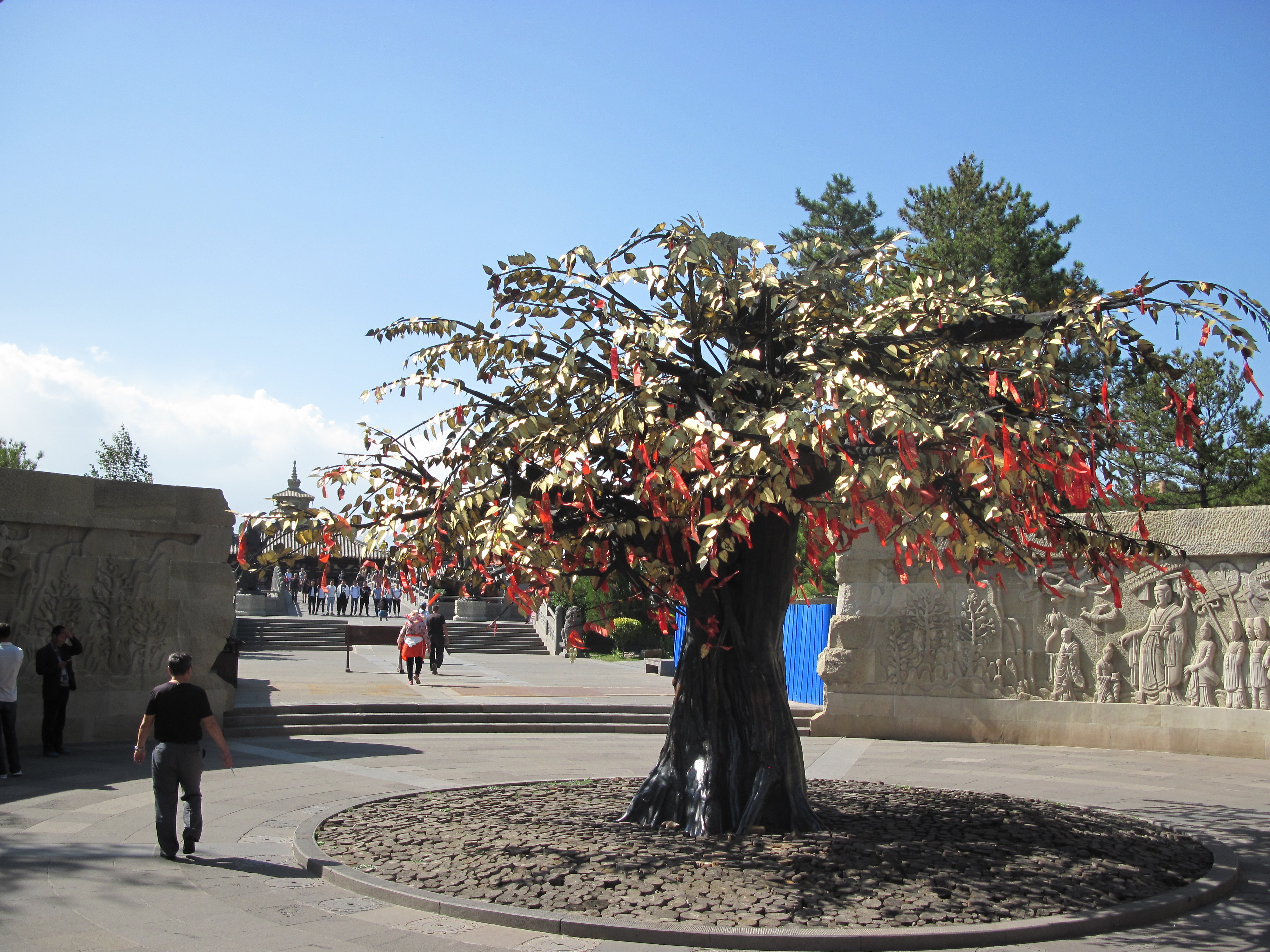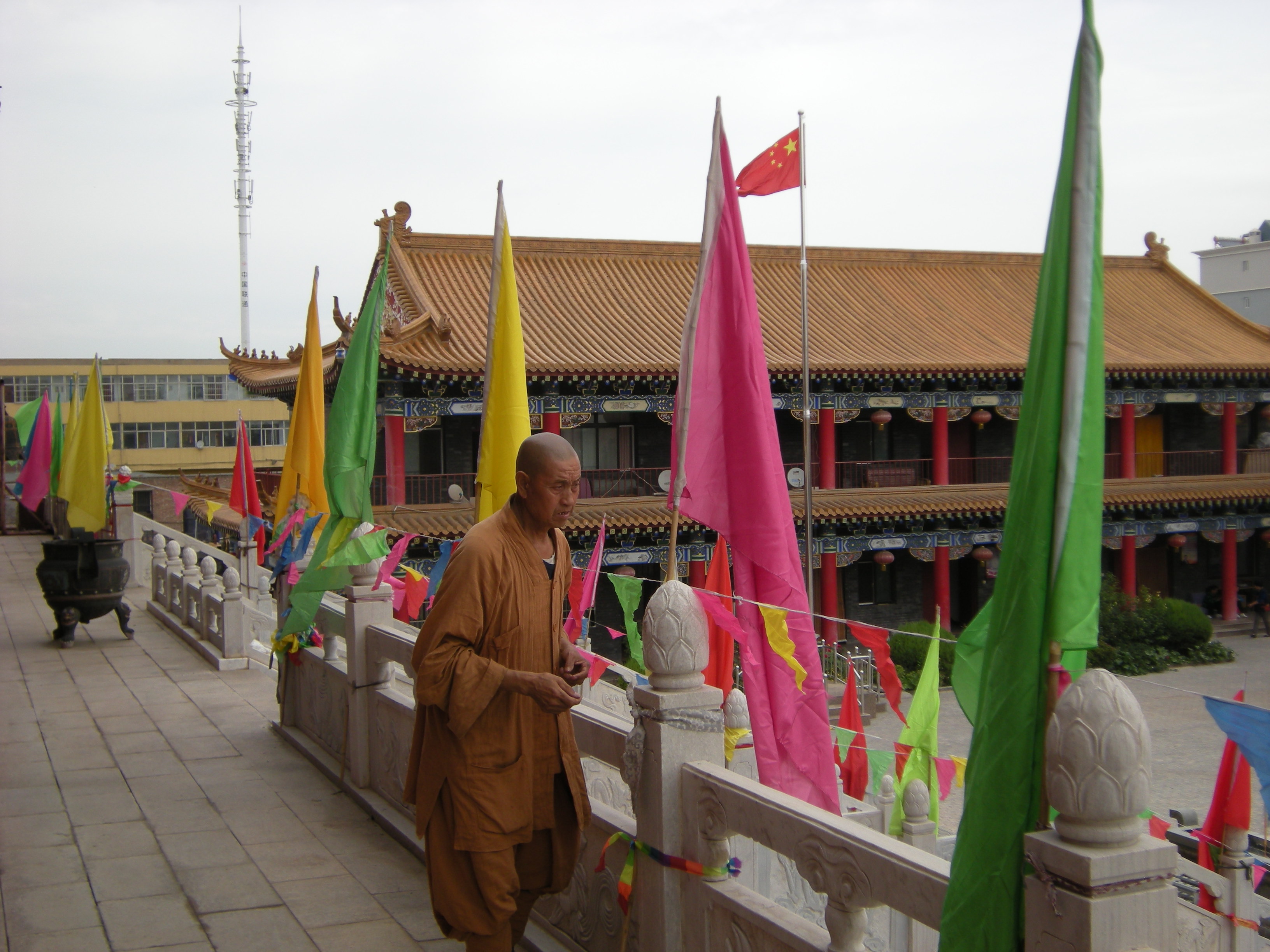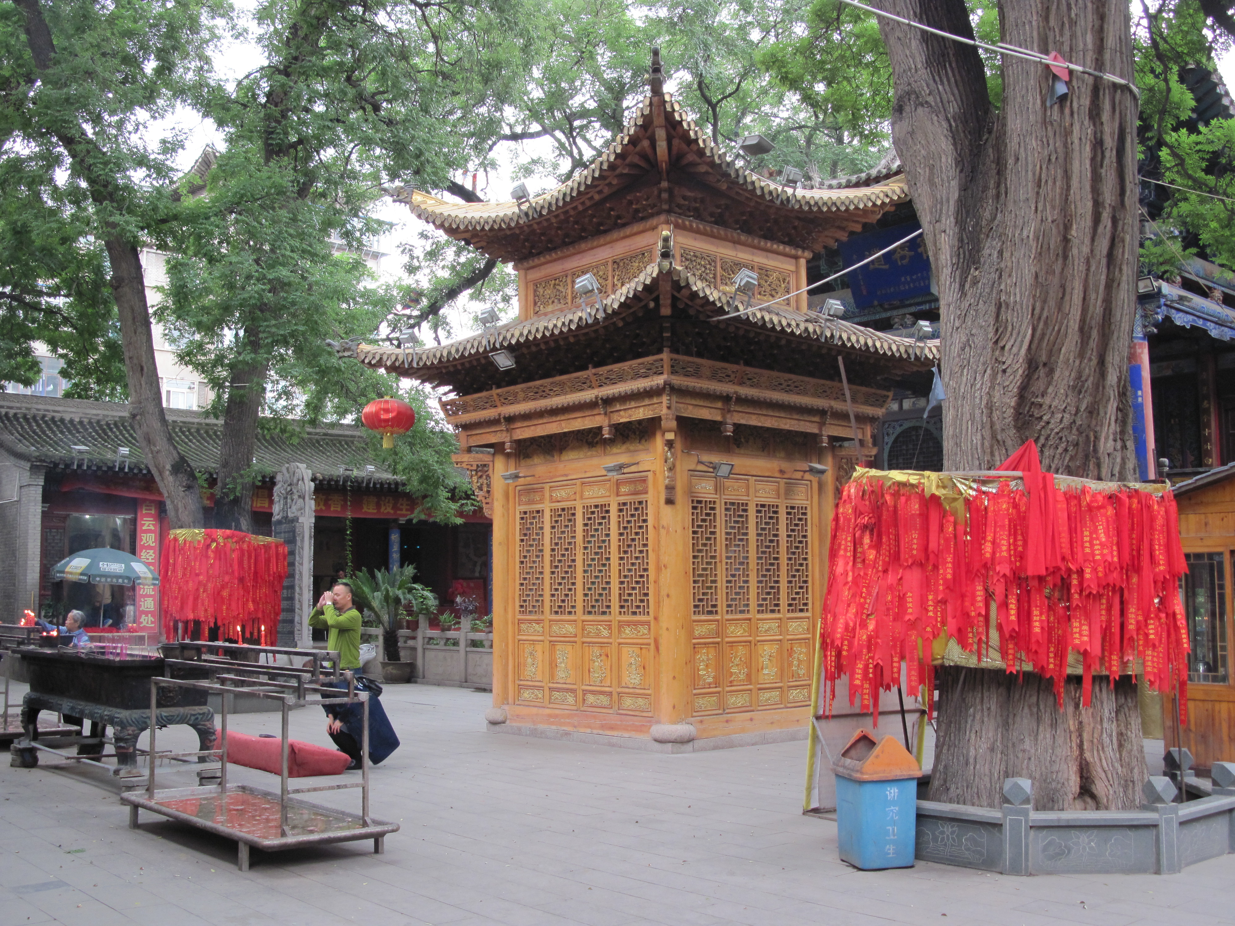 Iets voor half 10s tuurt Sheng een wechat dat de metro vertraging heeft en dat ze dus iets later komt en of het goed is dat haar vriend vandaag ook meegaat. Natuurlijk is dat goed en om goed 10 uur komen ze samen aangewandeld. Haar vriend heeft voor ons een westerse naam aangenomen en stelt zich voor als Rex. Hij komt uit noord-west China uit een plaats dichtbij de Russissche grens bij Wladiwostok. Het is een aardige jongen maar spreekt gebrekkig Engels dus praat het wat ingewikkeld met hem. Ze hebben voor elk van ons een cadeautje meegebracht! Het is een van koperdraad gemaakt fietsje. Heel mooi! Ze hebben het gekocht van een dove jongen die ze toevallig gisteren in een winkelstraat bezig zagen. Ik ben er blij mee maar voel me ook steeds lulliger omdat ik nog steeds geen idee heb over hoe ik dit allemaal goed kan maken. Maar wordt me verzekerd ik mag me niet schuldig voelen want wij zijn hun gasten en zij moeten dus voor ons zorgen. We drinken nog een kop Nescafe in de hoteltuin en gaan dan met de metro in noord-oostelijke richting naar een echte oude volkswijk. Terwijl we door de straatjes langs de kleine grijze terracotta huisjes lopen legt Sheng van alles uit over de betekenis van gebruikte kleuren, versieringen. Volksgebruiken, de manier van leven, de beleving van het geloof etc.. Zo weet ik nu dat de voordeur rood is omdat die kleur boze geesten buiten houdt. Dat sommige affiche en versieringen over nieuwjaarsspreuken gaan. Dat er badhuizen en sauna’s zijn en openbare toiletten. Het leven speelt zich op straat af en niet in het huis. We vragen of ze weet waarom mensen zoals we ergens gezien hebben nepgeld kopen en dat dan verbranden. Blijkbaar doen veel mensen dat en heeft dat te maken met wensen van de mensen voor zichzelf of voor een ander. Het lijkt wel wat op wat wij wel doen met het aansteken van een kaarsje als we bijv. een examen moeten doen of als iemand ziek is. Als je wenst dat het jou of iemand anders financieel beter zal gaan dan zou je dus nepgeld kunnen offeren of een kartonnen auto of een huis van karton. De moeder van Sheng houdt echt geld even tegen een ander leeg papiertje en drukt dan de waarde als het ware over en maakt zo haar eigen nepgeld om de offeren. Voor de lunch gaan we met vieren in een restaurant uiteten en als ik wil betalen is Rex me al weer voor geweest. Hij moet om half 2 gaan werken en heeft meteen maar alles afgerekend. Ik bedank hem bij het afscheid nemen en spreek hem dan nog wat vaderlijk toe door te zeggen dat hij goed voor Sheng moet zorgen en dat hij een goede keuze gemaakt heeft. Na het eten brengt Sheng ons naar een Tibetaanse Lama tempel. Het is een groot complex met veel verschillende tempels. Het hoogtepunt is hier toch wel de zangsessie van een grote groep Tibetaanse monniken, die gezamenlijk met een monotone stem uit een boek lezen en daarbij af en toe onderbroken worden door een belletje en een trommeltje. Sheng zoekt met haar mobieltje razendsnel informatie voor ons op en praat ons constant bij. Mooi! Na het bezoek aan de tempel nemen we de metro naar de winkelstraten ten zuiden van de Zuidpoort van het Plein van de Hemelse Vrede. Het is een drukke naar grote mooie winkelstraat. Wytze is nog naarstig op zoek naar een cadeautje voor Catrien en loopt winkel in en winkel uit, maar komt maar niet tot een keuze. Dan gaan we eerst maar met z’n drietjes in een simpel restaurantje wat eten. Het smaakt er goed en deze keer mogen we gelukkig wel betalen. Na het eten gaan we met de metro weer terug naar het hotel . Ik haal nog wat bier voor Sheng en mij, Wytze viert zijn laatste avond in Beijing met een kopje thee. Hoewel we gezellig in de hoteltuin zitten te babbelen is het duidelijk dat iedereen toch wel moe is van dit dagje Beijing. Het afscheid nemen nadert en het is voor mij wel duidelijk dat Sheng daar een beetje tegen op ziet en geen goed moment kan vinden om naar huis te gaan. Als de gesprekjes ook nog wat stil gaan vallen merk ik maar op dat we op tijd naar bed willen omdat we morgenvroeg alles op tijd ingepakt willen hebben. Sheng begrijpt de hint en is blij als ik voorstel om met haar mee te lopen naar het metrostation. Ik vind dat trouwens ook wel prettiger dan om bij het hotel afscheid te nemen. Al babbelend lopen we naar het metrostation op de hoek van de straat en voelen beiden aan dat er een moeilijk moment aan zit te komen. Voor de metrotrap kijken we elkaar aan en houden elkaar even stevig vast. Sheng moet nu huilen en dan houd ik het ook niet meer droog. Onze afscheidswoorden weet ik niet meer precies maar wel dat ik haar duidelijk heb proberen te maken dat ik haar graag nog een keer in Nederland zou willen ontmoeten en dat ze dan bij ons in huis mag logeren. Ze knikt, en met een laatste ferme afscheidskus zeggen we elkaar vaarwel en dan gaat Sheng de kelder in en ik weer terug naar het hotel. Onderweg kijk ik nog een paar keer om te checken of ze me toch niet achter na komt. Het was een moeilijk en ook een heel fijn moment. We voelden volgens mij beiden dat we hoewel we elkaar maar heel oppervlakkig kennen toch een fijne band met elkaar hebben en dat die nu waarschijnlijk alleen op afstand nog wat onderhouden kan worden. Terug op het hotel kan ik de slaap niet pakken en vraag ik me af hoe Sheng het afscheid ervaart en wat het toch is wat ons bindt. Zij is de enige student waar ik nog contact mee heb en de enige die mij kerstkaartjes en emailtjes is blijven sturen . Is het uit dankbaarheid omdat ik haar als mentor toen haar vader ziek was wat geholpen heb? Ze heeft het trouwens helemaal niet over haar vader gehad, wel over haar moeder en haar grootouders waar ze een goede band mee heeft en trots over vertelt. De toevallige ontmoeting in Parijs? Haar interesse voor film en theater. De voldoende waardoor ze haar P-diploma haalde??? Mijn belofte om op de fiets naar Beijing te komen nagekomen ben??? Eens zal ik het haar vragen.
