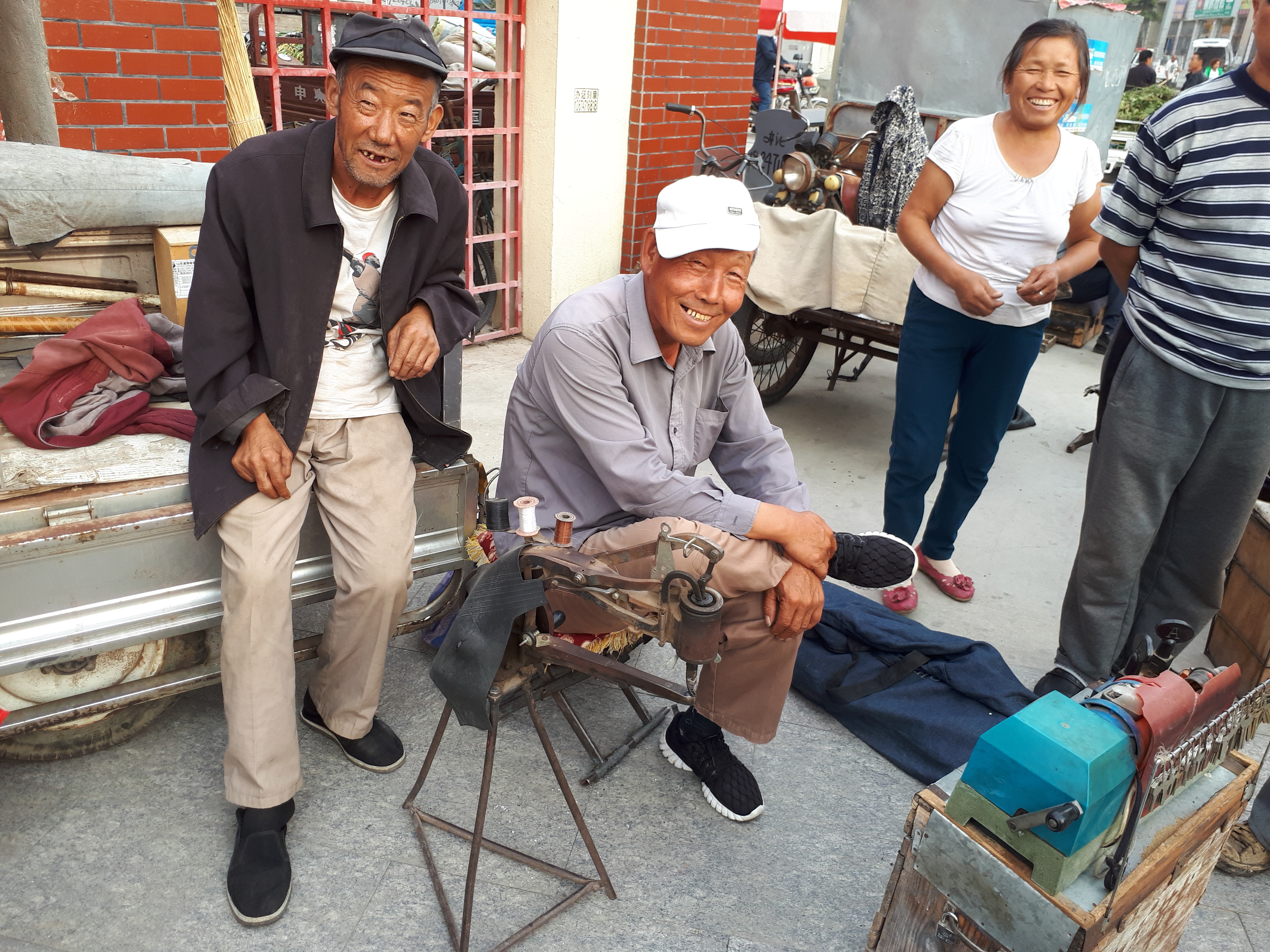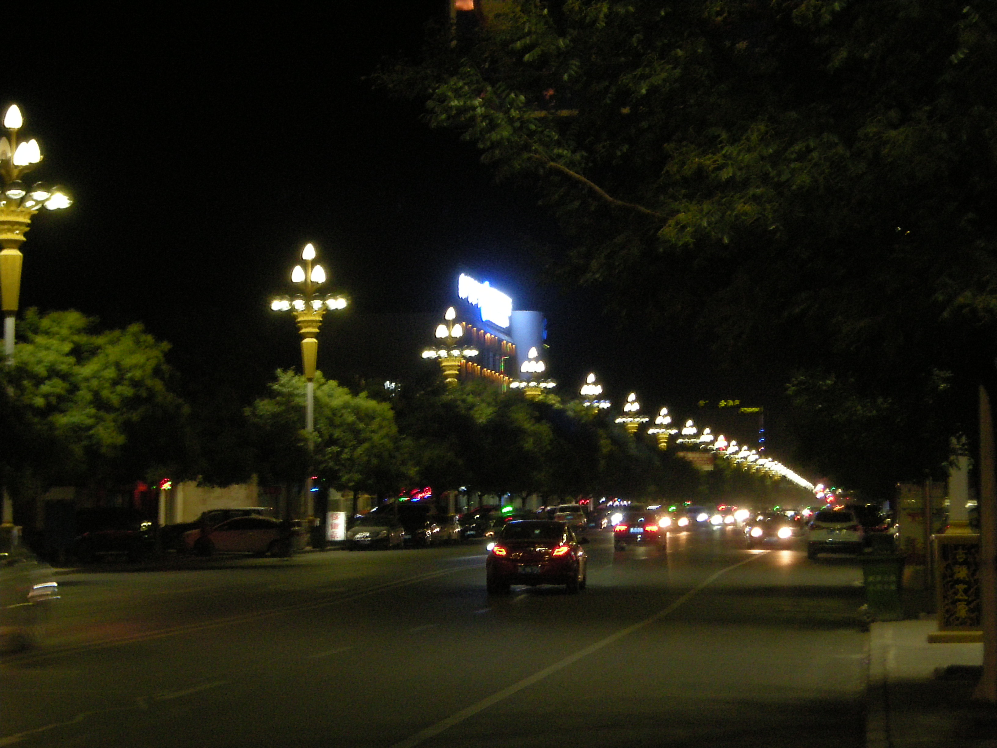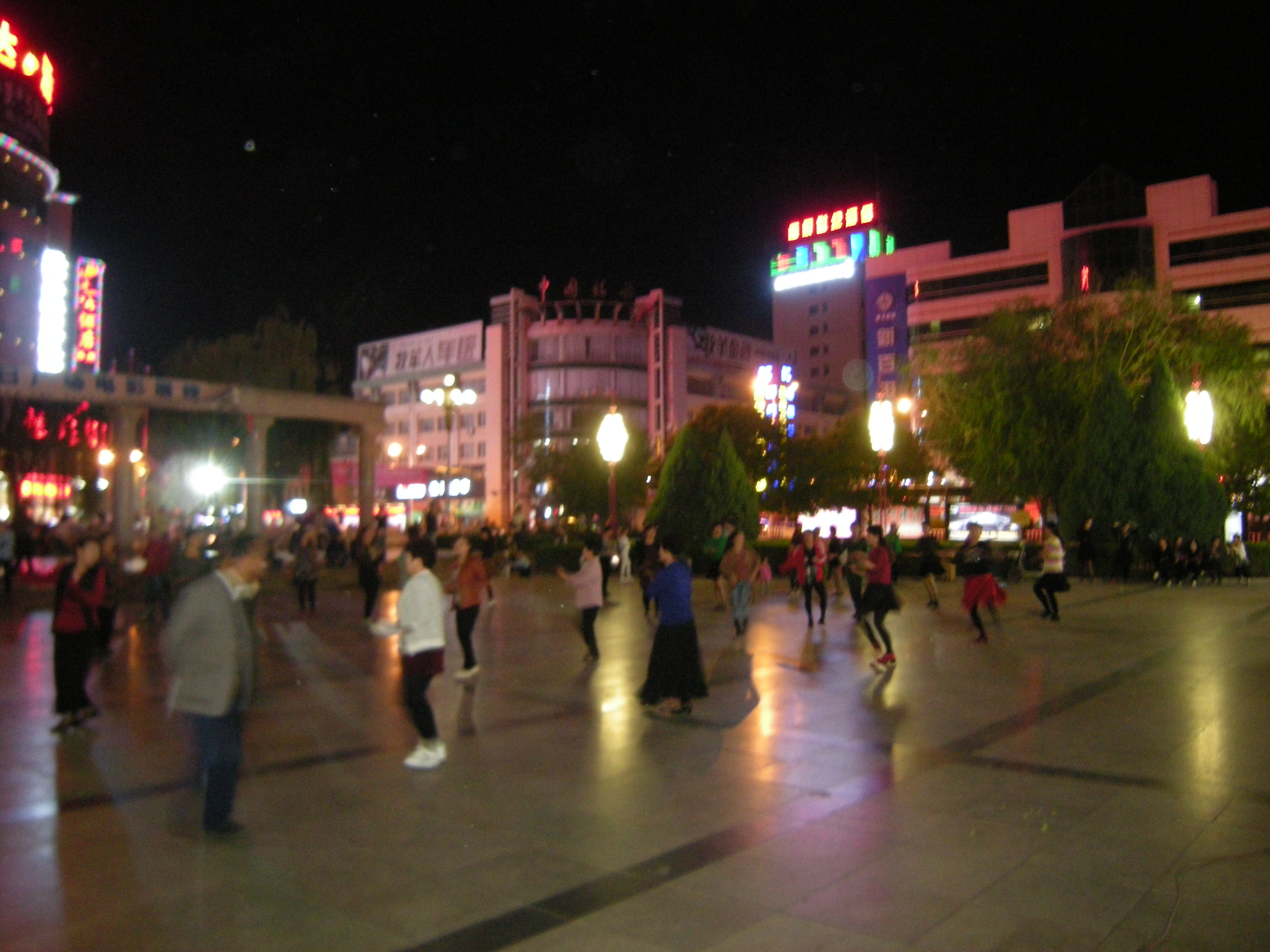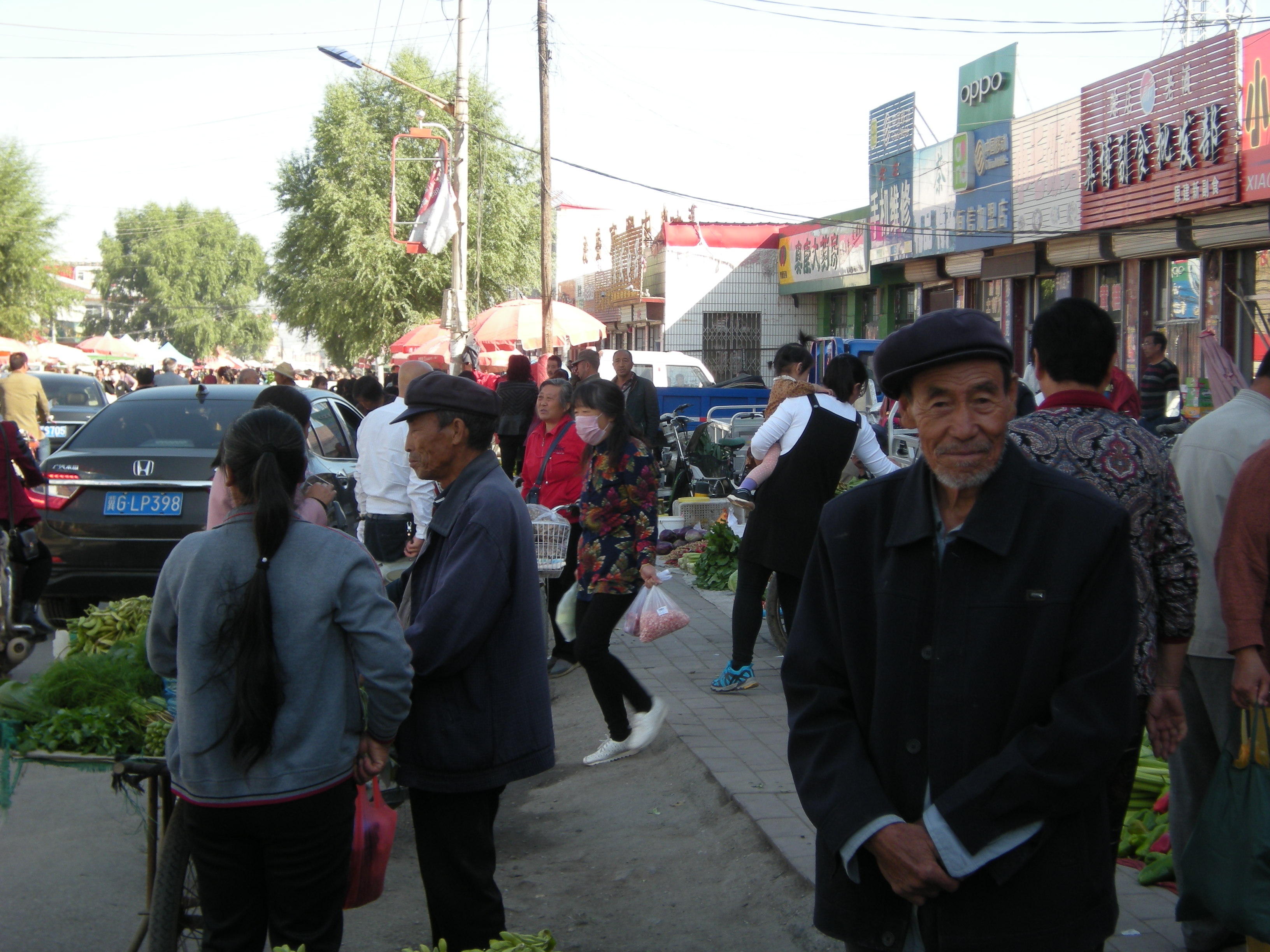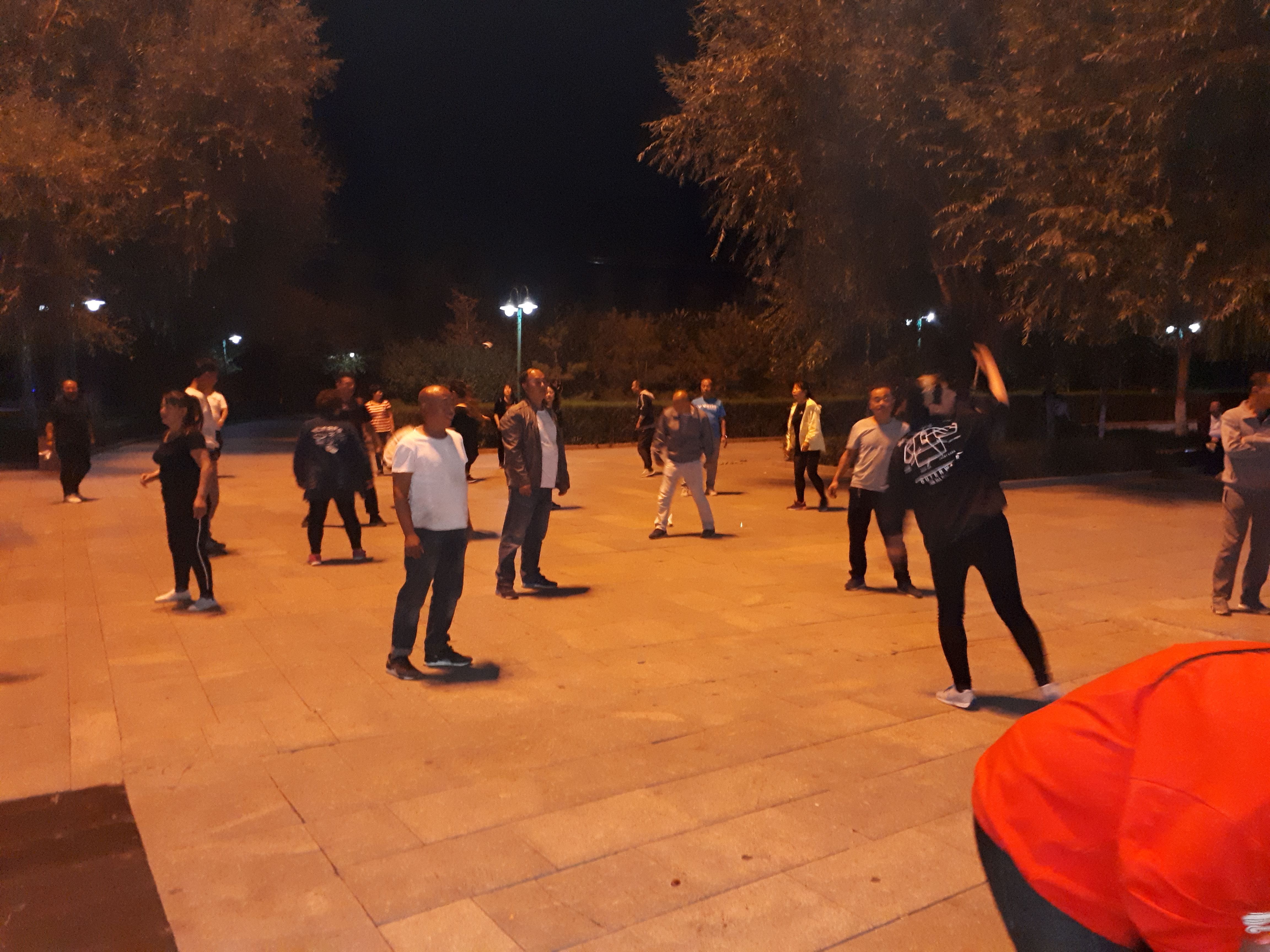 We gaan vandaag proberen om in Zhongning uit te komen. Dat is een vrij grote plaats dus boeken we er nog geen hotel. De route gaat vandaag opnieuw langs vele steenfabrieken en steenkoolopslag en het landschap heeft door de vele afgravingen grillige vormen gekregen waar de houten elektriciteitspalen op een soort van eiland op de oorspronkelijke hoogte zijn blijven staan. Het is ook een gebied met weer veel meloenenteelt. De planten staan op akkers met heel veel steenslag. Voor de huizen worden vandaag opvallend veel schapen en zelfs een koe geslacht. Iedereen is op zijn ’s zondags gekleed. Alle mannen hebben vandaag witte gebedscaps op en de vrouwen dragen paarse ‘hoedjes’. Het duurt even maar dan krijgen we in de gaten dat het vandaag offerfeest is en dan begrijpen we ook waarom er zoveel winkels dicht zijn. Als we bij een gesloten winkel voor de deur staan wordt die toch heel klantvriendelijk voor ons open gemaakt. De dorpjes die we passeren zijn vies. Het miezert de hele ochtend en daardoor ligt er veel modder op en langs de weg en overal ligt er afval van groente en ander handelswaar. We horen de hele dag vuurwerk afgaan. De fietsen, de tassen alles zit onder de modder. In de loop van de middag klaart het op. Wytze heeft vandaag een slechte dag. Hij is al weer een paar dagen weer flink aan de diarree en is behoorlijk uitgepierd. Normaal rijdt hij voorop maar vandaag is dat meestal mijn positie en moet ik opletten dat ik het tempo niet te hoog maak. Bij de eerste twee hotels in Zhongning worden we geweigerd maar bij de derde mogen we dan toch blijven. Onze tassen zijn zo smerig dat we ze eerst maar eens onder de douche zetten en afspoelen. Hoewel Wytze geen honger heeft wil hij toch mee gaan eten. Na wat op en neer geloop door een straat komen we per toeval in een hotpot restaurant terecht. We willen weg gaan maar worden dan aangesproken door een vriendelijke bedrijfsleidster die voor ons wel wat vegetarische gerechten klaar wil zetten. We krijgen een hotpot met een pittige heldere fondue en een nog pittigere bruine. Veel sojavlees in allerlei vormen, een grote schaal vol met verschillende soorten bladgroenten en een schaal vol met diverse paddenstoelen. Echt geweldig vinden we het niet maar we eten toch maar zoveel als we maar kunnen. Ook Wytze. Op het grote plein voor ons hotel zijn veel mensen aan het stijldansen. Het is er gezellig en we lopen daar wat rond. De toeschouwers hebben even geen belangstelling meer voor de dansers maar meer voor die 2 rare grote westerse mannen. Foto en selfie-tijd dus!! Wytze moet even later rennen om op tijd in het hotel te zijn omdat de hotpot maaltijd zijn weg naar onderen al gevonden heeft. Buiten stijldansen wordt er op het plein ook opgetreden door muziekgroepjes en zangeressen die een vreselijk vals en hard geluid voortbrengen. De zanginstallatie staat zo hard dat al het geluid verschrikkelijk vervormd de boxen uit komt. Het publiek applaudisseert toch enthousiast. Het zal zo dus wel moeten. In een warenhuis kopen we nog een ijsje en ook nog wat anti-diarreepillen voor Wytze. Nu maar hopen dat ze werken.