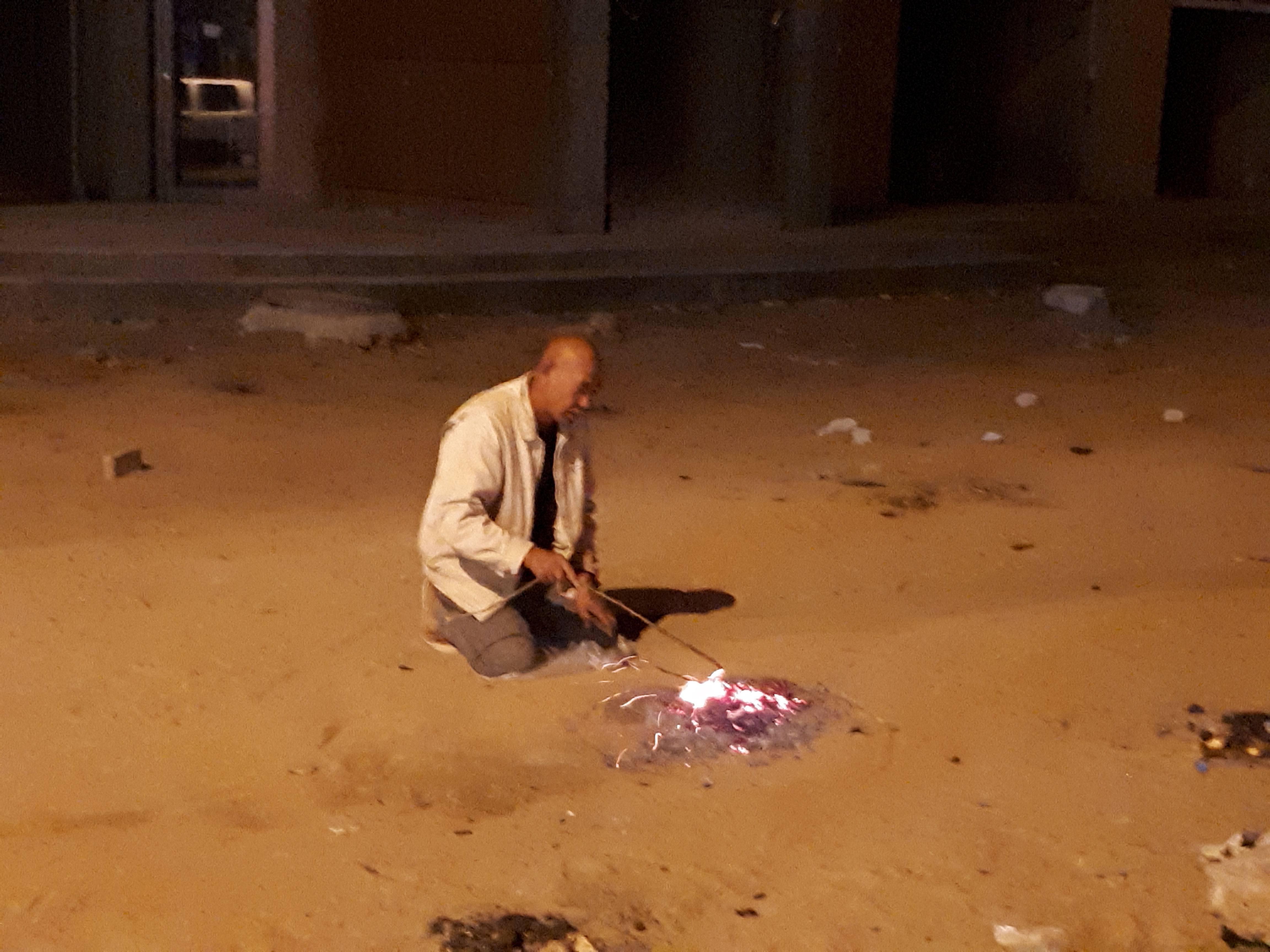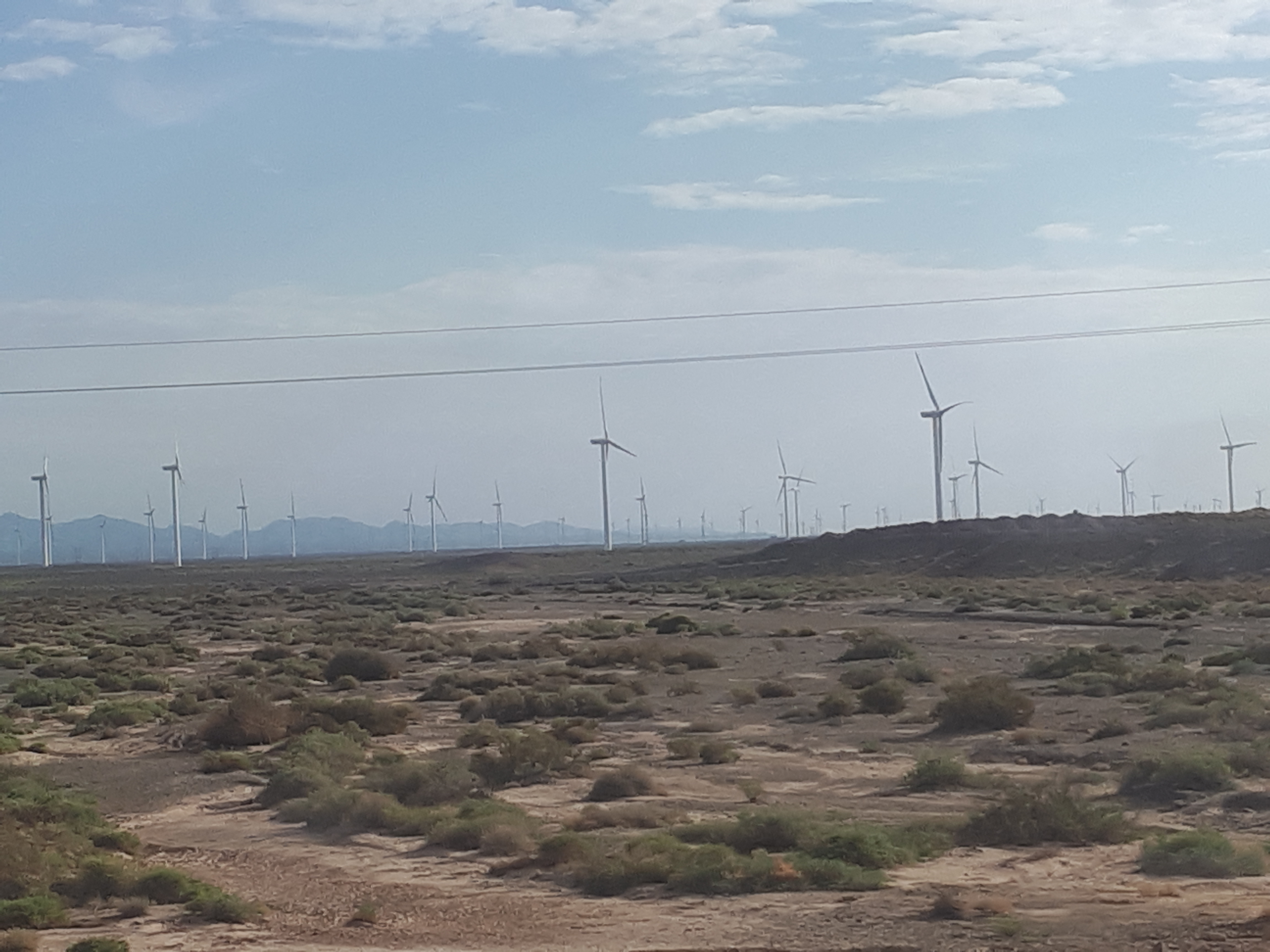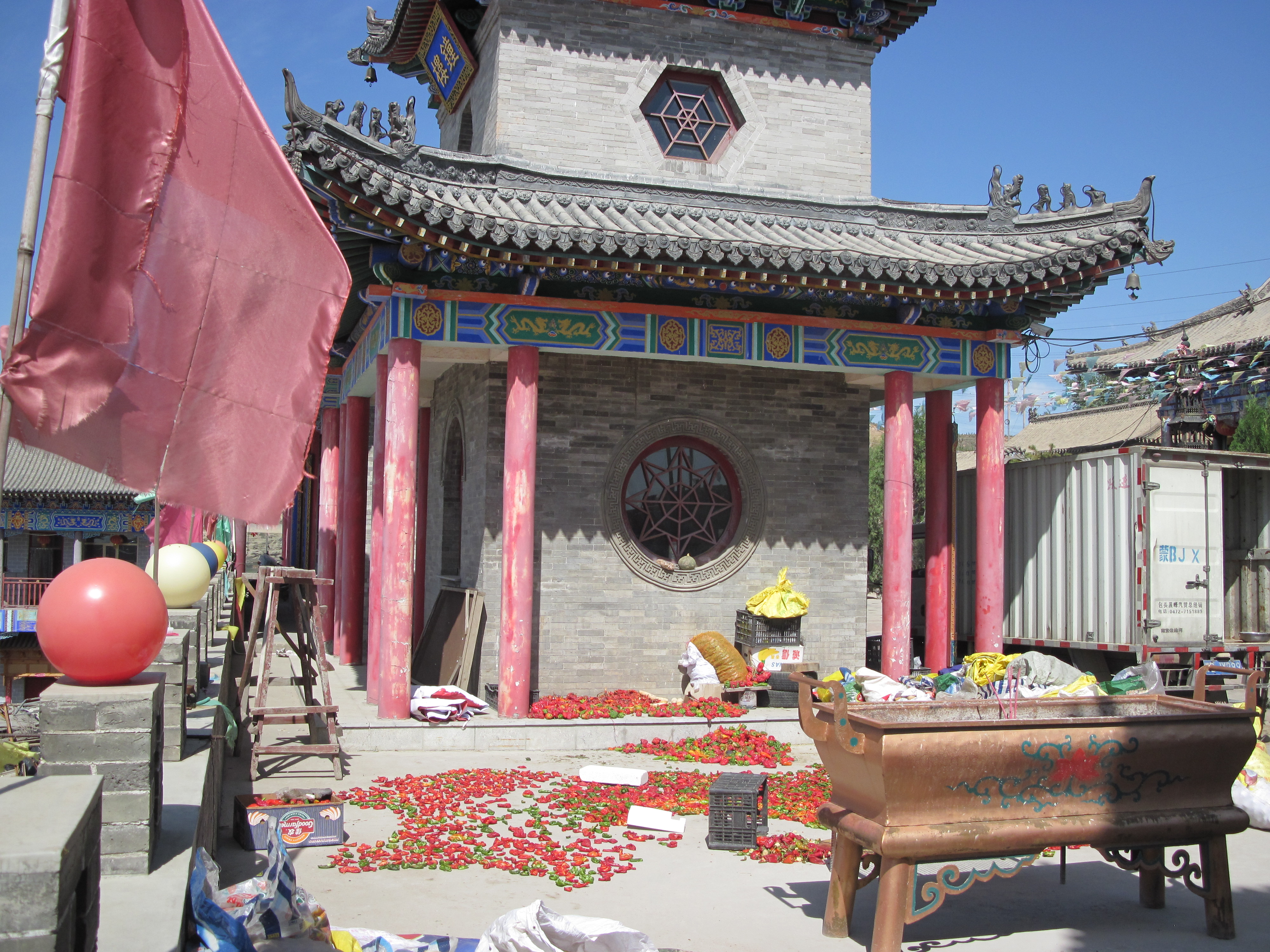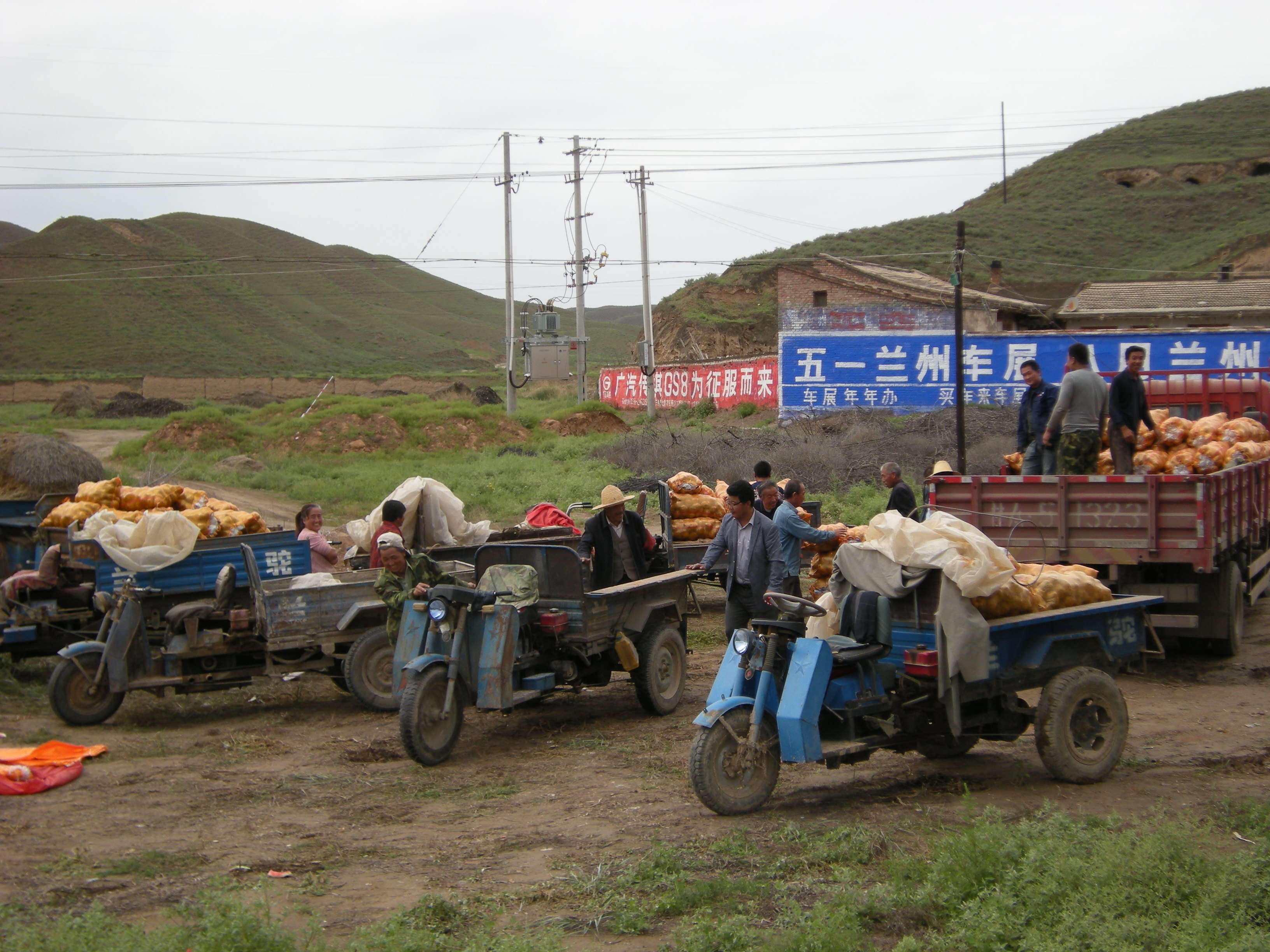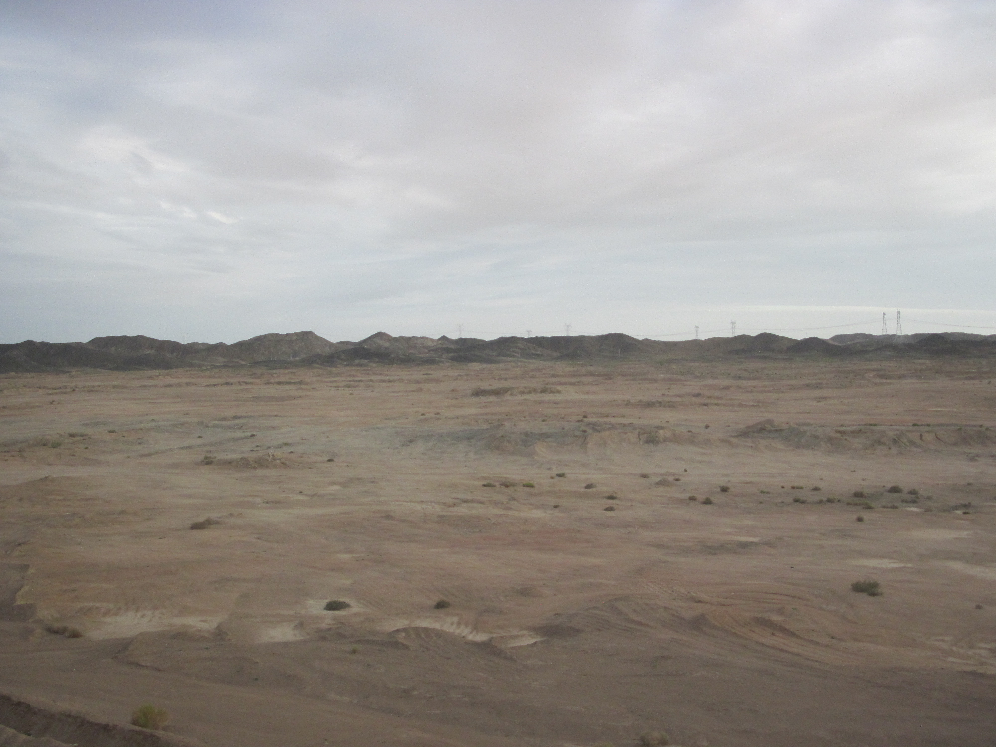 We gaan vandaag proberen om in Zhongning uit te komen. Dat is een vrij grote plaats dus boeken we er nog geen hotel. De route gaat vandaag opnieuw langs vele steenfabrieken en steenkoolopslag en het landschap heeft door de vele afgravingen grillige vormen gekregen waar de houten elektriciteitspalen op een soort van eiland op de oorspronkelijke hoogte zijn blijven staan. Het is ook een gebied met weer veel meloenenteelt. De planten staan op akkers met heel veel steenslag. Voor de huizen worden vandaag opvallend veel schapen en zelfs een koe geslacht. Iedereen is op zijn ’s zondags gekleed. Alle mannen hebben vandaag witte gebedscaps op en de vrouwen dragen paarse ‘hoedjes’. Het duurt even maar dan krijgen we in de gaten dat het vandaag offerfeest is en dan begrijpen we ook waarom er zoveel winkels dicht zijn. Als we bij een gesloten winkel voor de deur staan wordt die toch heel klantvriendelijk voor ons open gemaakt. De dorpjes die we passeren zijn vies. Het miezert de hele ochtend en daardoor ligt er veel modder op en langs de weg en overal ligt er afval van groente en ander handelswaar. We horen de hele dag vuurwerk afgaan. De fietsen, de tassen alles zit onder de modder. In de loop van de middag klaart het op. Wytze heeft vandaag een slechte dag. Hij is al weer een paar dagen weer flink aan de diarree en is behoorlijk uitgepierd. Normaal rijdt hij voorop maar vandaag is dat meestal mijn positie en moet ik opletten dat ik het tempo niet te hoog maak. Bij de eerste twee hotels in Zhongning worden we geweigerd maar bij de derde mogen we dan toch blijven. Onze tassen zijn zo smerig dat we ze eerst maar eens onder de douche zetten en afspoelen. Hoewel Wytze geen honger heeft wil hij toch mee gaan eten. Na wat op en neer geloop door een straat komen we per toeval in een hotpot restaurant terecht. We willen weg gaan maar worden dan aangesproken door een vriendelijke bedrijfsleidster die voor ons wel wat vegetarische gerechten klaar wil zetten. We krijgen een hotpot met een pittige heldere fondue en een nog pittigere bruine. Veel sojavlees in allerlei vormen, een grote schaal vol met verschillende soorten bladgroenten en een schaal vol met diverse paddenstoelen. Echt geweldig vinden we het niet maar we eten toch maar zoveel als we maar kunnen. Ook Wytze. Op het grote plein voor ons hotel zijn veel mensen aan het stijldansen. Het is er gezellig en we lopen daar wat rond. De toeschouwers hebben even geen belangstelling meer voor de dansers maar meer voor die 2 rare grote westerse mannen. Foto en selfie-tijd dus!! Wytze moet even later rennen om op tijd in het hotel te zijn omdat de hotpot maaltijd zijn weg naar onderen al gevonden heeft. Buiten stijldansen wordt er op het plein ook opgetreden door muziekgroepjes en zangeressen die een vreselijk vals en hard geluid voortbrengen. De zanginstallatie staat zo hard dat al het geluid verschrikkelijk vervormd de boxen uit komt. Het publiek applaudisseert toch enthousiast. Het zal zo dus wel moeten. In een warenhuis kopen we nog een ijsje en ook nog wat anti-diarreepillen voor Wytze. Nu maar hopen dat ze werken.