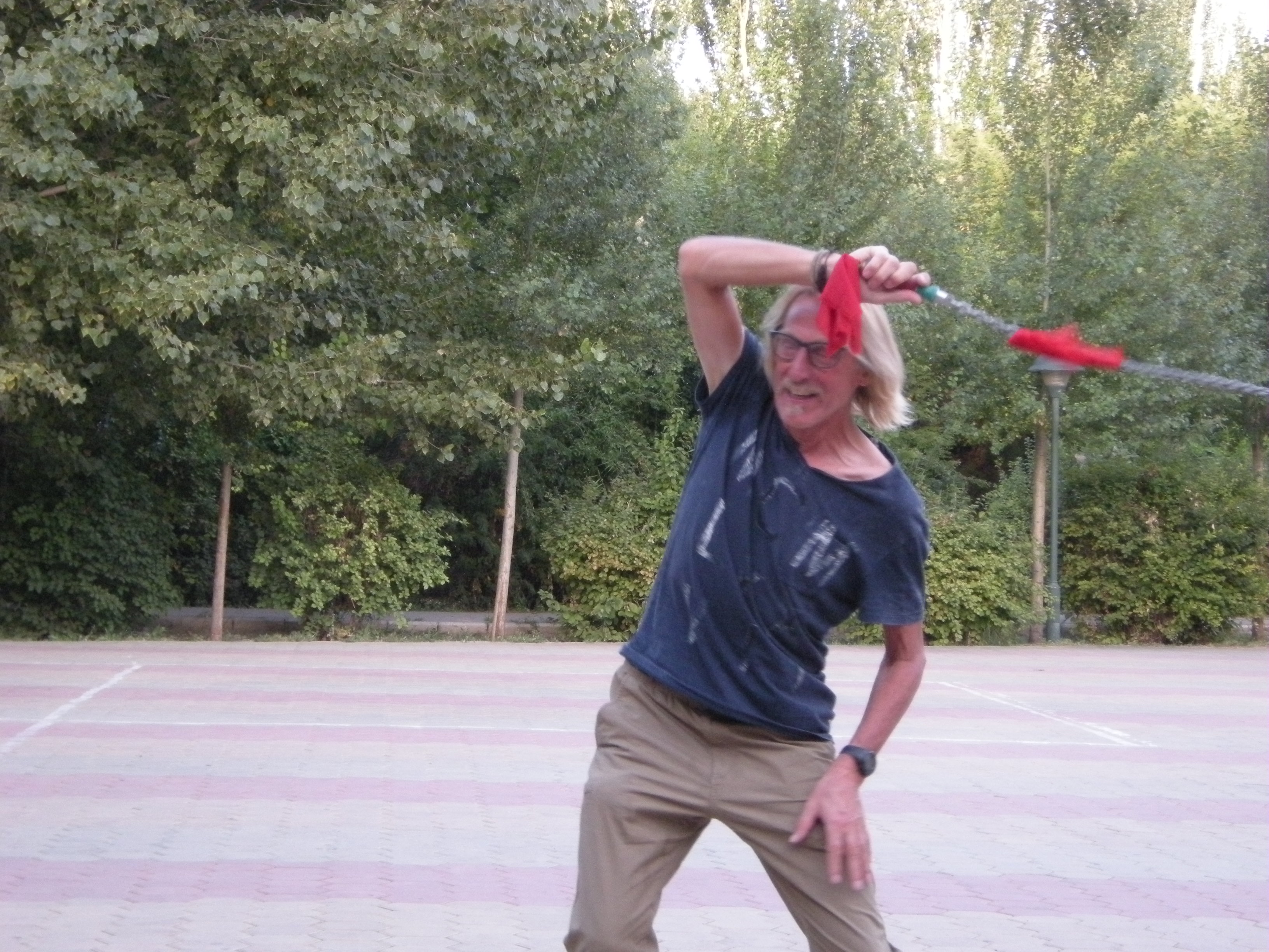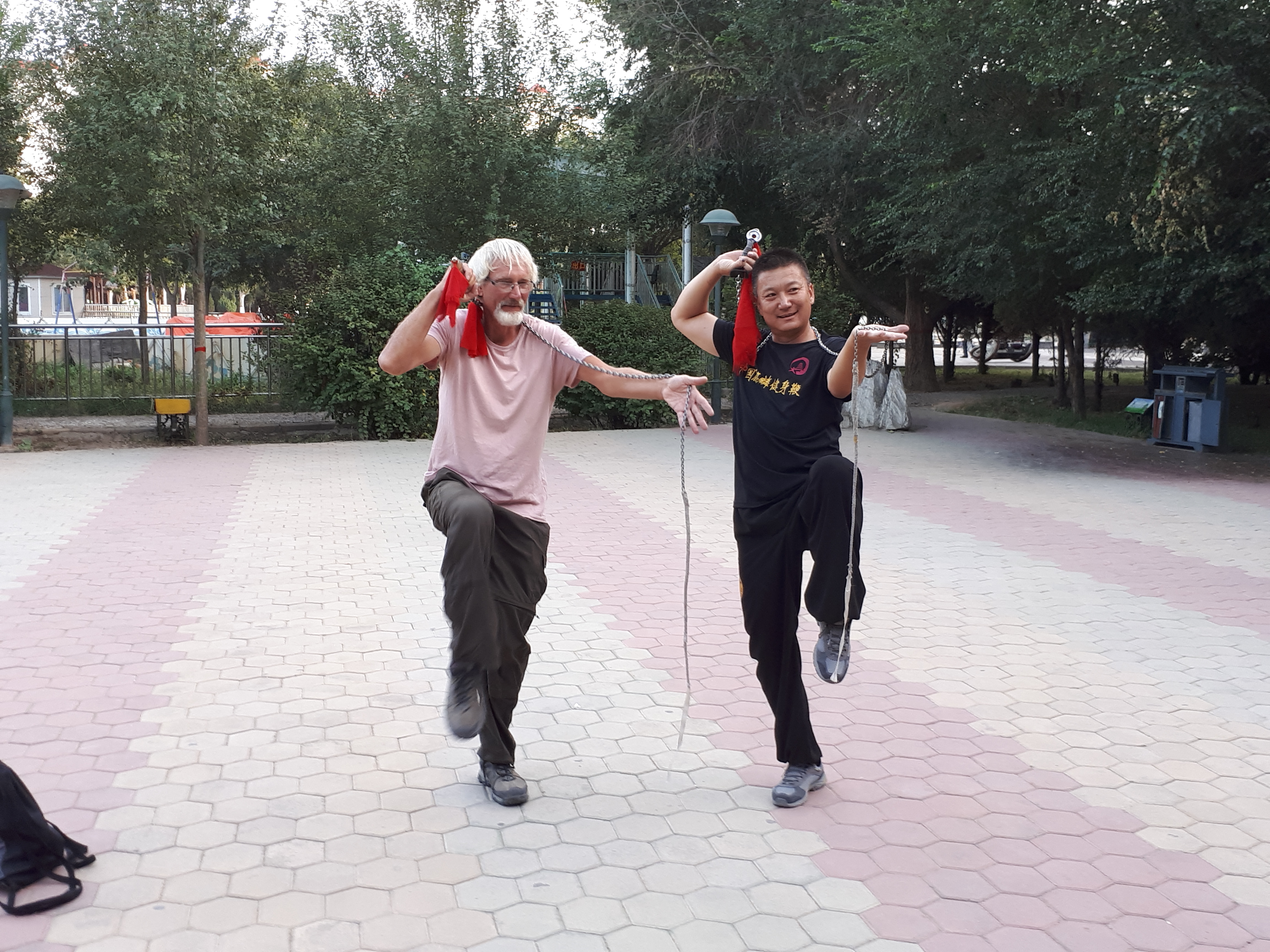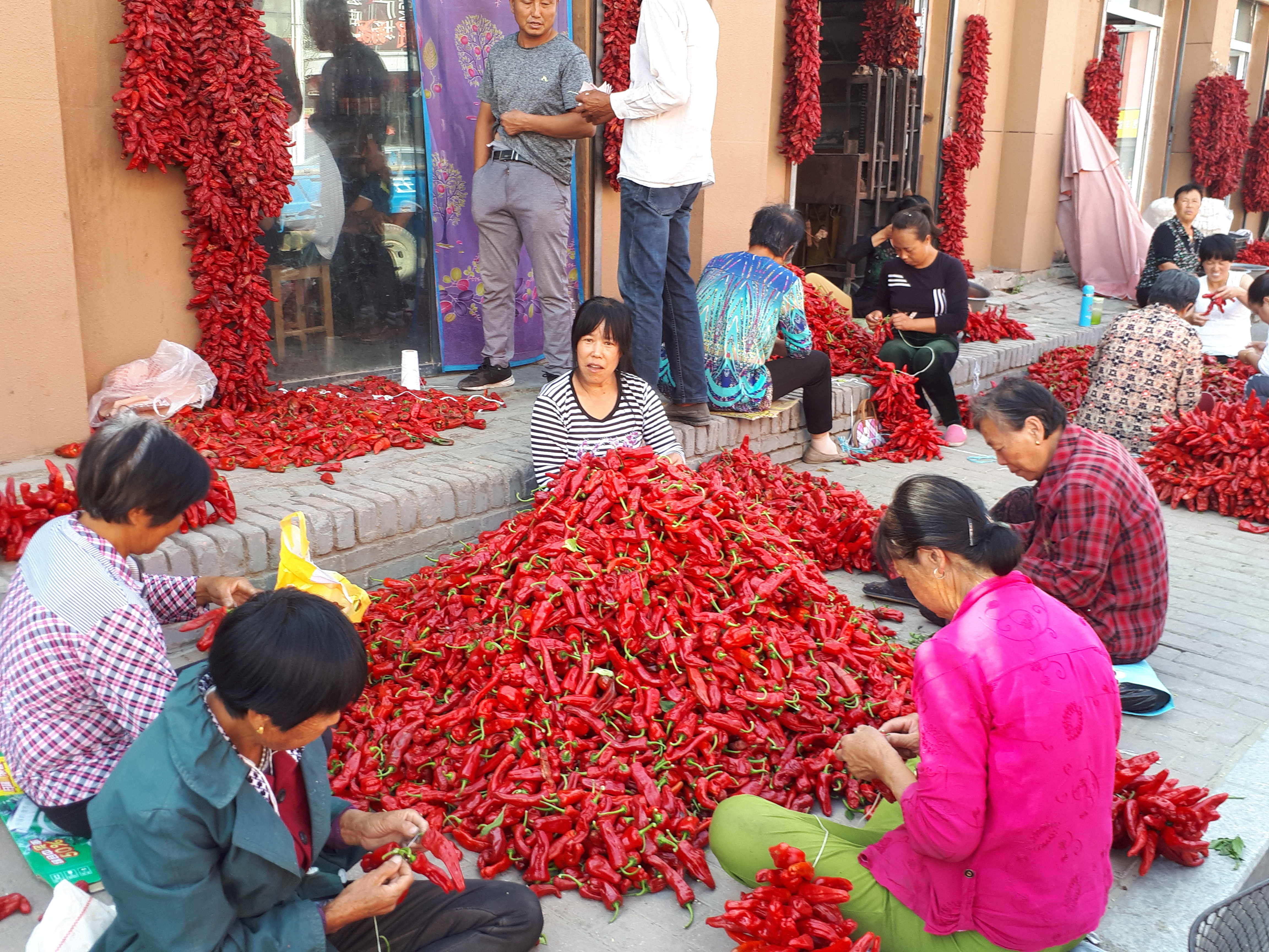 Ook vandaag starten we weer met een uitgebreid hotelontbijt. We hoeven ons niet te haasten want er staat maar een korte rit op het programma. We fietsen de hele dag in de warme zon door een niet echt boeiend landschap. Het is vlak en er is veel tuinbouw. De hele dag door worden we gepasseerd door vrachtwagens en tractoren vol met tomaten en paprika’s. Bij een tuinder waar ze bezig zijn om met een transportband een vrachtwagen vol met paprika te laden stoppen we even voor een foto. Op betonnen stoepen liggen er ook veel maiskolven te drogen. Linghe is een grote stad. De entree is weer groots aangelegd. Brede boulevards met veel plantsoenen er langs en parken met grote kitscherige rotspartijen en watervallen. Ons hotel vinden we snel maar er is in hun administratie geen reservering terug te vinden. We mogen gelukkig toch blijven. We zijn vroeg in Linghe dus hebben we tijd om de stad wat beter te bekijken. We wandelen door wat drukke straten waar de stoepen vol staan met geparkeerde E-scooters naar een sport- wandelpark. We komen in het park uit bijeen groepje muzikanten die mensen begeleiden die denken dat ze goed kunnen zingen. Nou het is niet om aan te horen. Wij worden ook uitgenodigd om een liedje mee te zingen maar slaan dat aanbod toch maar af. Onze aandacht gaat uit naar het geluid van knallende zwepen en lopen op het geluid af. We verwachten er weer tollende mensen te zien maar er is een groep bezig met zwepen zoals die wel door dompteurs gebruikt worden en die ze laten knallen. Er wordt zelfs geoefend in synchroon knallen en daarbij van formatie te veranderen zoals vendelzwaaiers dat bij ons wel doen. We proberen het ook. Ik kan er niets van, krijg de zweep niet aan het klappen en verongeluk er bijna bij. Wytze doet het iets beter en komt zelfs tot een paar ferme klappen maar verongelukt er daarna ook bijna bij. We hebben van ons gestuntel mooie foto’s en filmpjes gemaakt. Eten doen we bij fastfoodrestaurant Dicon. Het wordt kipburger met frites. Voor ons gebruikelijke ijsje lopen we een rondje door de stad, maar als we nergens een winkel met ijskast kunnen vinden gaan we toch maar weer terug naar de Dicon. Ik heb daarna wel genoeg door de stad geslenterd en heb zoals bij elke stadswandeling veel last van mijn linker enkel. Wytze blijft nog wel door de stad struinen om op zoek te gaan naar een T-shirt zegt hij, maar ik denk dat hij nog ergens een yoghurtje wil scoren. Terug bij het hotel videochat ik in de hal nog even met Reinou.