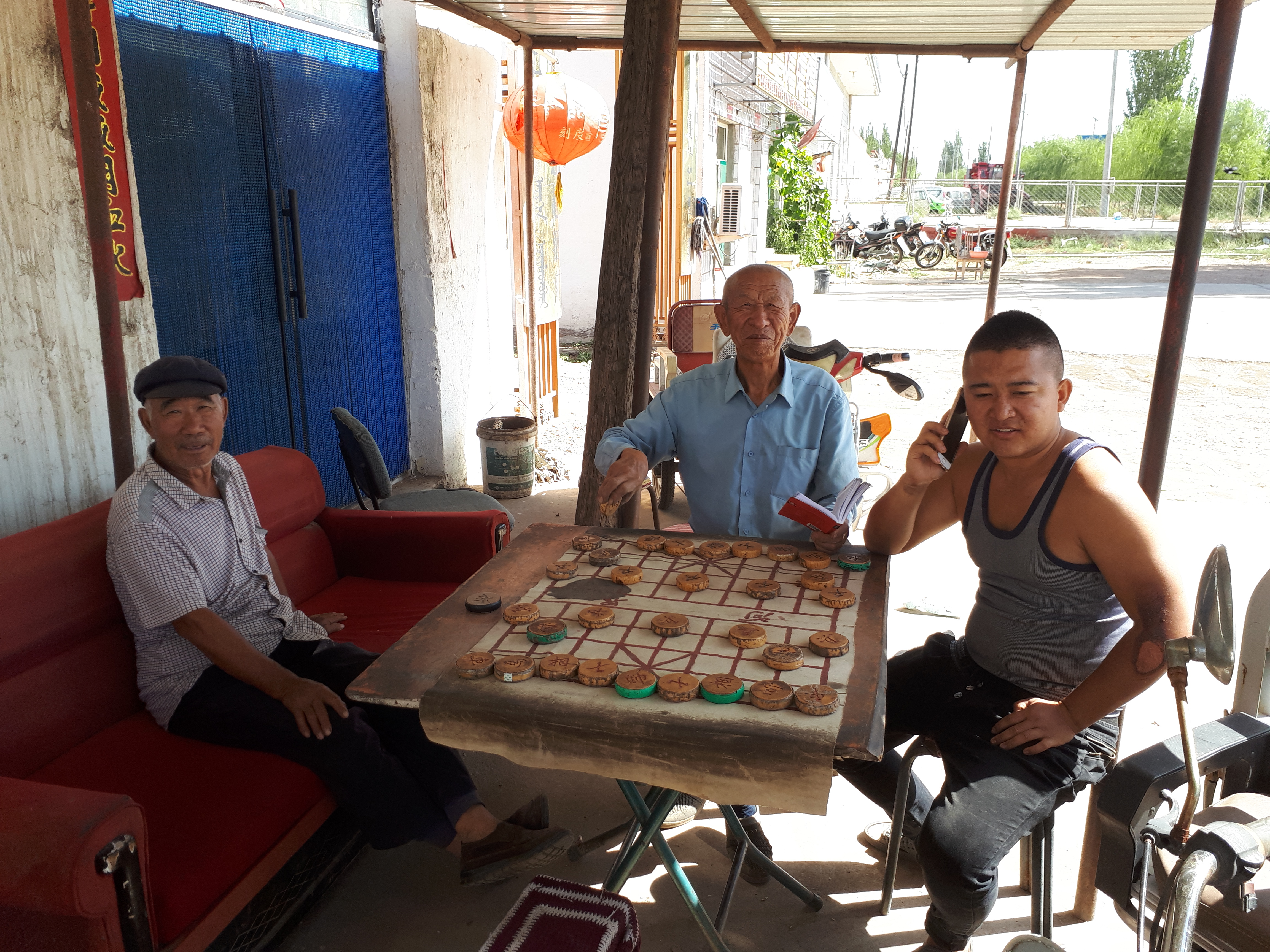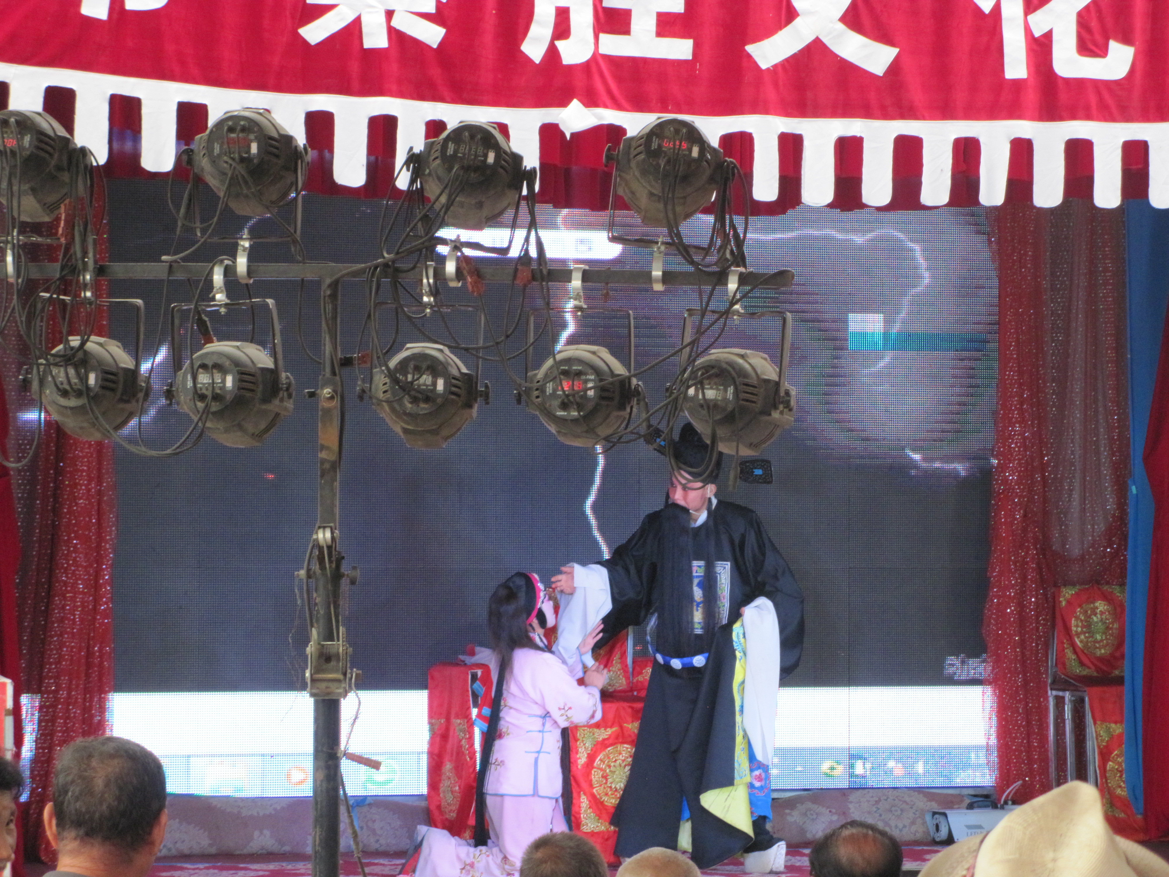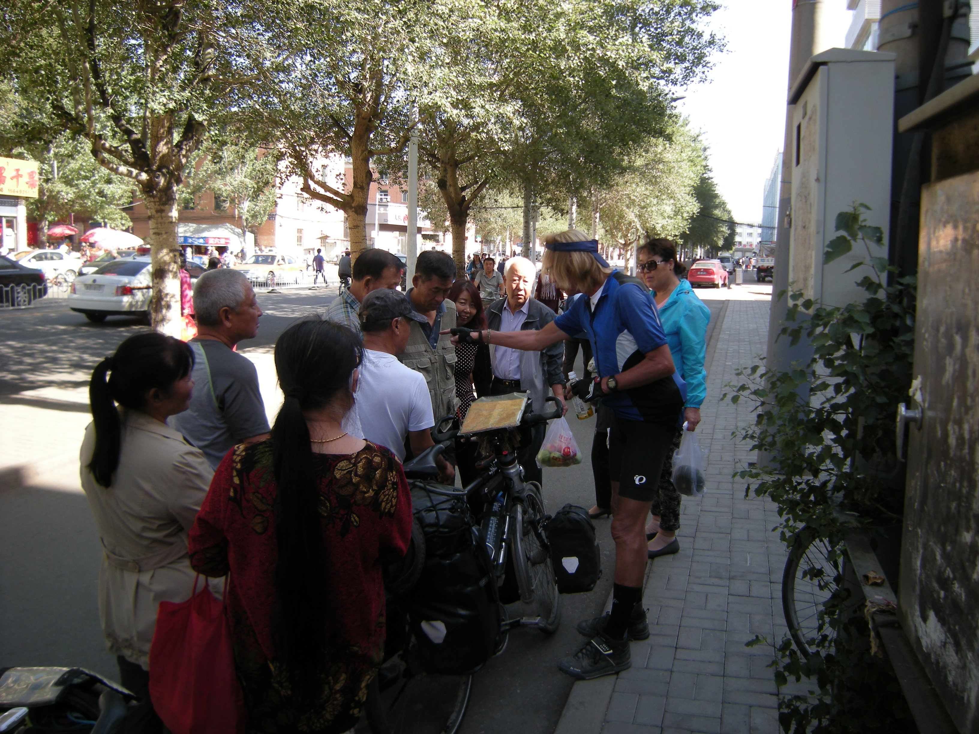 Wytze geeft bij het opstaan opnieuw aan dat hij de 115 km naar Huinong wellicht niet aan zal kunnen. Als het te zwaar wordt denkt hij er over om de bus te nemen. Ik stel opnieuw voor om nog een dag in Yingchuan te blijven en daar naar een dokter te gaan of naar zijn huisarts te bellen, maar hij blijft er bij dat dat toch niet gaat helpen. Hij zou het liefst zo snel mogelijk naar Peking willen reizen. Voor hem is de lol er al een tijdje van af. Na al die weken van diarree voelt hij zich zo slap als wat en heeft nu het gevoel dat zijn hele lijf protesteert. Hoewel zijn rug beter voelt heeft hij nu last van zijn been, wat lijkt op een klapvoet, en hij heeft een tintelend gevoel in zijn vingertoppen. Ik zeg dat ik het heel jammer zou vinden als we niet fietsend van de laatste 1000 km zouden kunnen genieten en dat ik liever minder kilometers per dag fiets in plaats van zoveel mogelijk om daardoor maar eerder in Peking te zijn. Wytze zit er volgens mij voor de zoveelste keer helemaal doorheen. Er speelt zich van alles door zijn hoofd maar nu maakt hij zich volgens mij terecht grote zorgen over zijn gezondheid. Sinds een paar dagen is er namelijk ook nog eens een vervelende verkoudheid bijgekomen. Als ik suggereer dat het wellicht niet zo slim was om een paar nachten geleden zonder tent in die tochtige bogentent te gaan slapen, wuift hij dat weg en wil daar niet over horen. Nee, dat moet door de trein gekomen zijn en ..bovendien kreeg ik de eerste verkoudheidsklachten en heb ik hem wellicht besmet. Aangezien deze opmerking bij mij een beetje als een verwijt overkomt voel ik me er niet lekker bij. Er is geen ontbijt bij het hotel dus gaan we maar zonder op pad. Ik heb wel honger dus speur ik op zoek naar een bakker de winkels af die we passeren. Om de hoek is er een bakker die ook ontbijt serveert. Prima lijkt me en hoewel Wytze al aan de portemonnee denkt weet ik hem toch naar binnen te loodsen. We kopen ieder 3 lekkere koeken die ik me met een bakje koffie erbij in ieder geval goed laat smaken. We kunnen goed gevuld op stap en fietsen daarna vrij snel terug naar de 109. Omdat die weg al een paar dagen een beetje saai is stel ik voor om af en toe een alternatief traject via de GPS te fietsen maar omdat we niet weten hoe de kwaliteit van het wegdek daar is wil Wytze daar niets van weten. Het is wel mooi fietsweer, beetje bewolkt, niet te warm en vrij vlak. Om Wytze wat uit de wind te houden doe ik vandaag het kopwerk. Na zo’n 25 km stoppen we voor een drankje en een stuk koek. In een dorpje verder staat er langs de weg een tentoverkapping bij een heel armoedig ogend tempeltje. Er lijkt een soort van dorpsfeest aan de gang. Er is een optreden bezig in de tent. 3 Dames voeren op een podium voor een hypermodern led scherm dat als achterdecor dient een soort van opera op. Mooi om te zien. De bezoekers zijn over het algemeen wat oudere mensen die als ze ons zien staan meer aandacht voor ons hebben dan voor de artiesten. Verder zijn er wat kramen met etenswaar en een soort van barbecue en zitten er mensen te mahjongen. Dit is voor ons toch wel het hoogtepunt van de dag want verder fietsen we wat door rijstvelden en groententuinen maar is er niets boeiends te beleven. Er valt soms een druppel maar dat zet gelukkig niet door. Om half 5 zijn we in ons gereserveerde hotel in Huinong. De fietsen mogen in een gangetje achterom de bar. We gaan eten in een klein restaurantje en bestellen daar ieder een portie nasi en een portie bami. Veel te veel natuurlijk dus krijgen we het niet allemaal op. Er moeten natuurlijk wel weer veel foto’s gemaakt worden met kinderen op onze schoot.