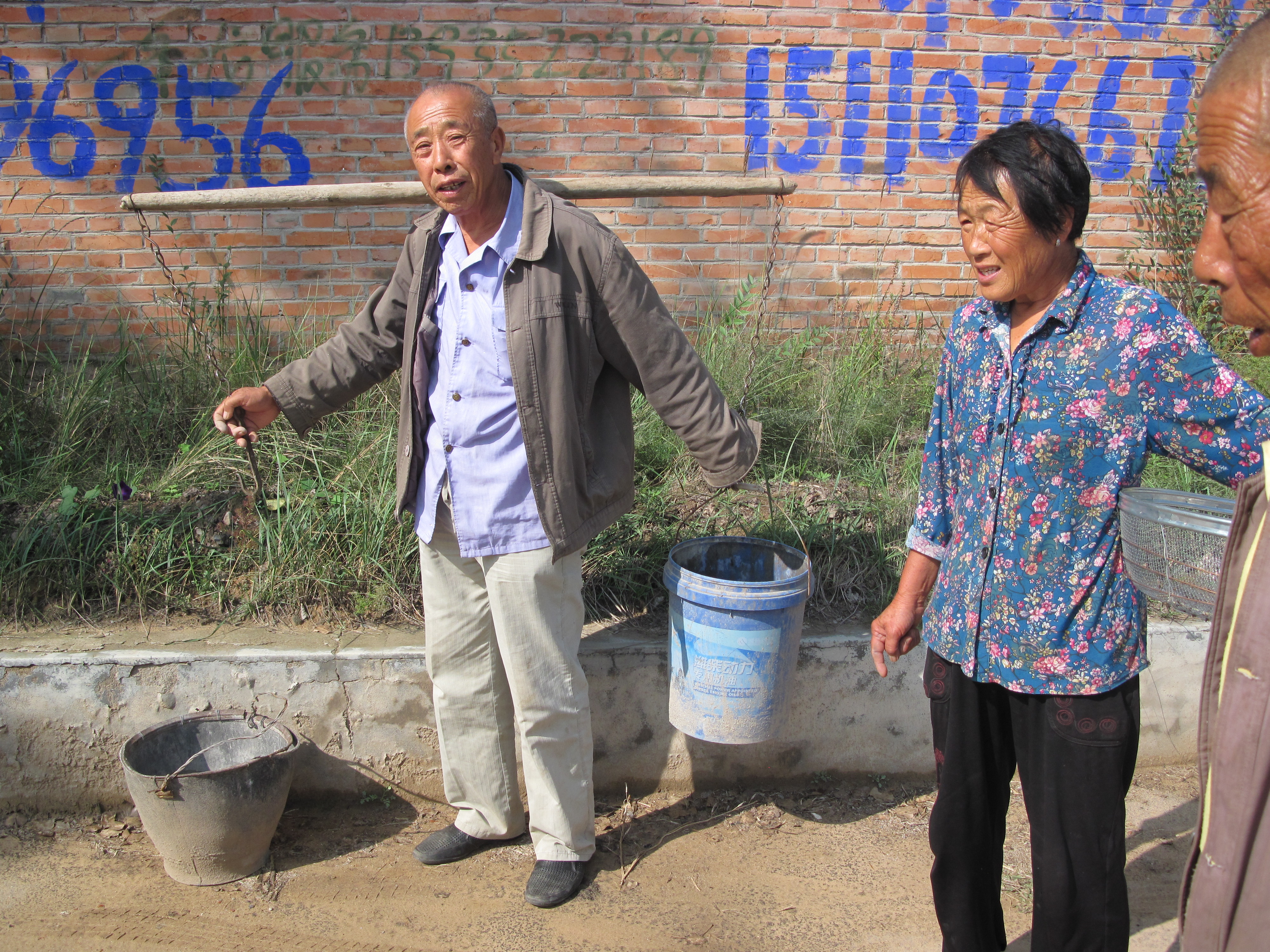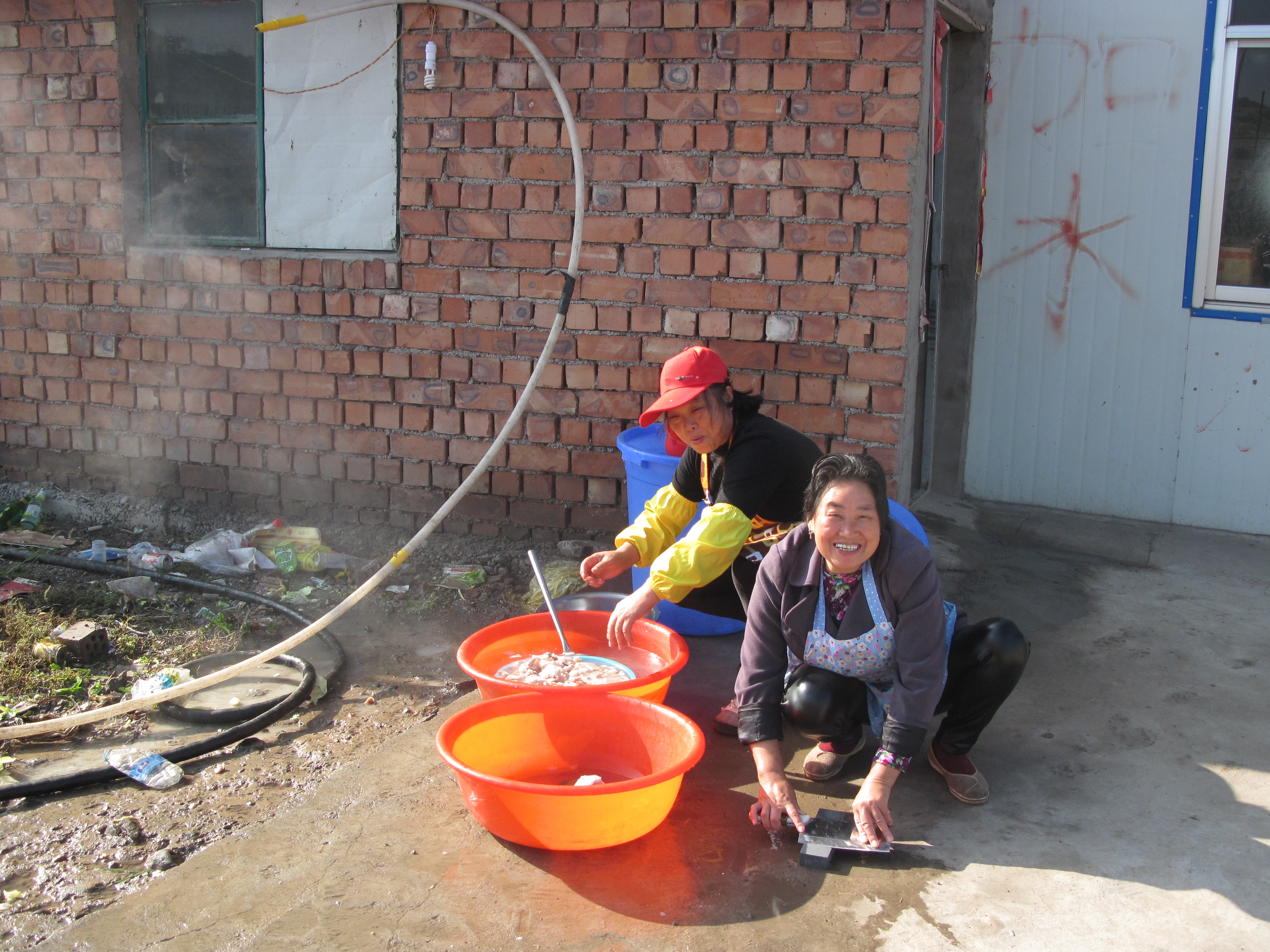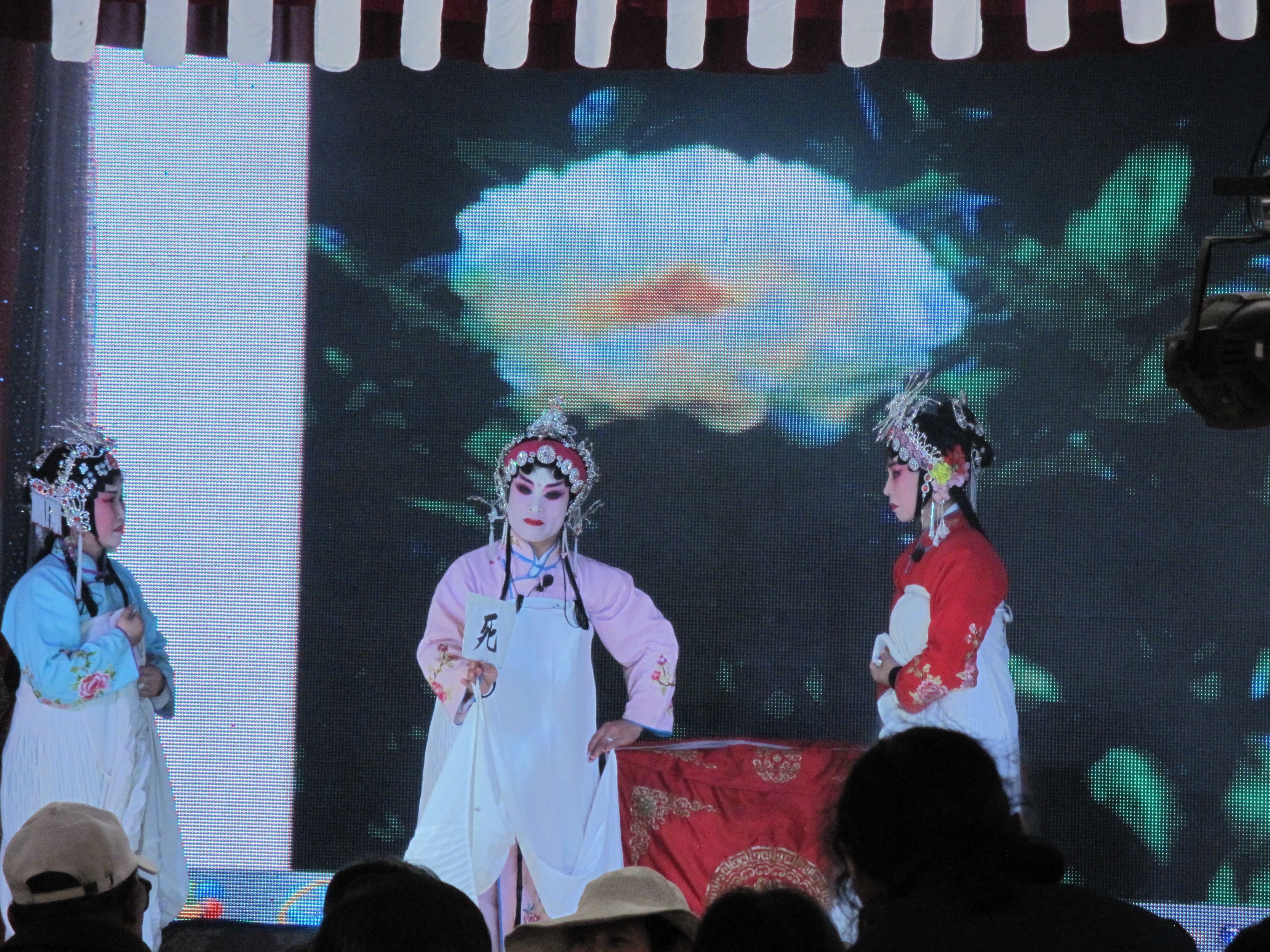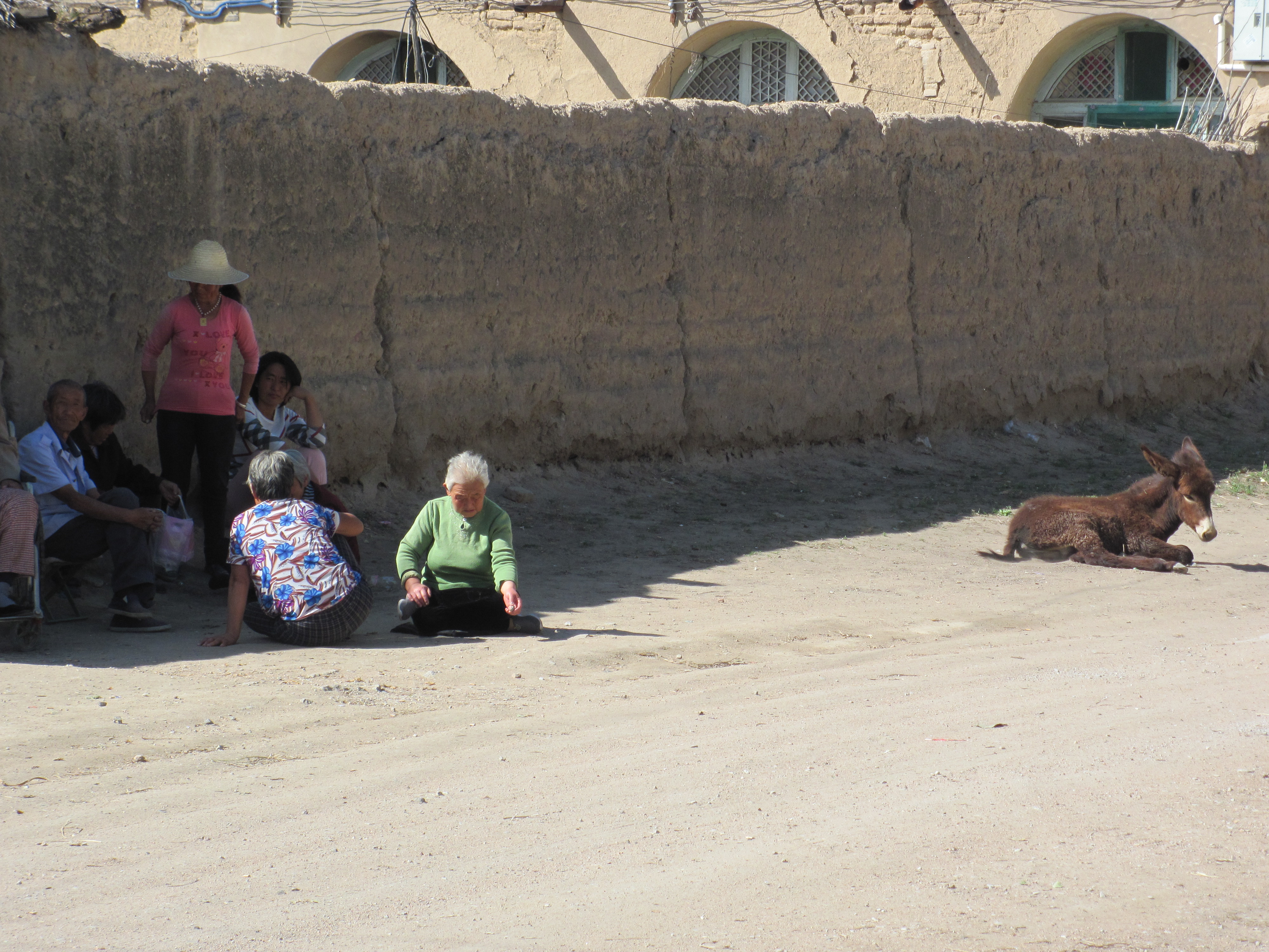 Wytze geeft bij het opstaan opnieuw aan dat hij de 115 km naar Huinong wellicht niet aan zal kunnen. Als het te zwaar wordt denkt hij er over om de bus te nemen. Ik stel opnieuw voor om nog een dag in Yingchuan te blijven en daar naar een dokter te gaan of naar zijn huisarts te bellen, maar hij blijft er bij dat dat toch niet gaat helpen. Hij zou het liefst zo snel mogelijk naar Peking willen reizen. Voor hem is de lol er al een tijdje van af. Na al die weken van diarree voelt hij zich zo slap als wat en heeft nu het gevoel dat zijn hele lijf protesteert. Hoewel zijn rug beter voelt heeft hij nu last van zijn been, wat lijkt op een klapvoet, en hij heeft een tintelend gevoel in zijn vingertoppen. Ik zeg dat ik het heel jammer zou vinden als we niet fietsend van de laatste 1000 km zouden kunnen genieten en dat ik liever minder kilometers per dag fiets in plaats van zoveel mogelijk om daardoor maar eerder in Peking te zijn. Wytze zit er volgens mij voor de zoveelste keer helemaal doorheen. Er speelt zich van alles door zijn hoofd maar nu maakt hij zich volgens mij terecht grote zorgen over zijn gezondheid. Sinds een paar dagen is er namelijk ook nog eens een vervelende verkoudheid bijgekomen. Als ik suggereer dat het wellicht niet zo slim was om een paar nachten geleden zonder tent in die tochtige bogentent te gaan slapen, wuift hij dat weg en wil daar niet over horen. Nee, dat moet door de trein gekomen zijn en ..bovendien kreeg ik de eerste verkoudheidsklachten en heb ik hem wellicht besmet. Aangezien deze opmerking bij mij een beetje als een verwijt overkomt voel ik me er niet lekker bij. Er is geen ontbijt bij het hotel dus gaan we maar zonder op pad. Ik heb wel honger dus speur ik op zoek naar een bakker de winkels af die we passeren. Om de hoek is er een bakker die ook ontbijt serveert. Prima lijkt me en hoewel Wytze al aan de portemonnee denkt weet ik hem toch naar binnen te loodsen. We kopen ieder 3 lekkere koeken die ik me met een bakje koffie erbij in ieder geval goed laat smaken. We kunnen goed gevuld op stap en fietsen daarna vrij snel terug naar de 109. Omdat die weg al een paar dagen een beetje saai is stel ik voor om af en toe een alternatief traject via de GPS te fietsen maar omdat we niet weten hoe de kwaliteit van het wegdek daar is wil Wytze daar niets van weten. Het is wel mooi fietsweer, beetje bewolkt, niet te warm en vrij vlak. Om Wytze wat uit de wind te houden doe ik vandaag het kopwerk. Na zo’n 25 km stoppen we voor een drankje en een stuk koek. In een dorpje verder staat er langs de weg een tentoverkapping bij een heel armoedig ogend tempeltje. Er lijkt een soort van dorpsfeest aan de gang. Er is een optreden bezig in de tent. 3 Dames voeren op een podium voor een hypermodern led scherm dat als achterdecor dient een soort van opera op. Mooi om te zien. De bezoekers zijn over het algemeen wat oudere mensen die als ze ons zien staan meer aandacht voor ons hebben dan voor de artiesten. Verder zijn er wat kramen met etenswaar en een soort van barbecue en zitten er mensen te mahjongen. Dit is voor ons toch wel het hoogtepunt van de dag want verder fietsen we wat door rijstvelden en groententuinen maar is er niets boeiends te beleven. Er valt soms een druppel maar dat zet gelukkig niet door. Om half 5 zijn we in ons gereserveerde hotel in Huinong. De fietsen mogen in een gangetje achterom de bar. We gaan eten in een klein restaurantje en bestellen daar ieder een portie nasi en een portie bami. Veel te veel natuurlijk dus krijgen we het niet allemaal op. Er moeten natuurlijk wel weer veel foto’s gemaakt worden met kinderen op onze schoot.