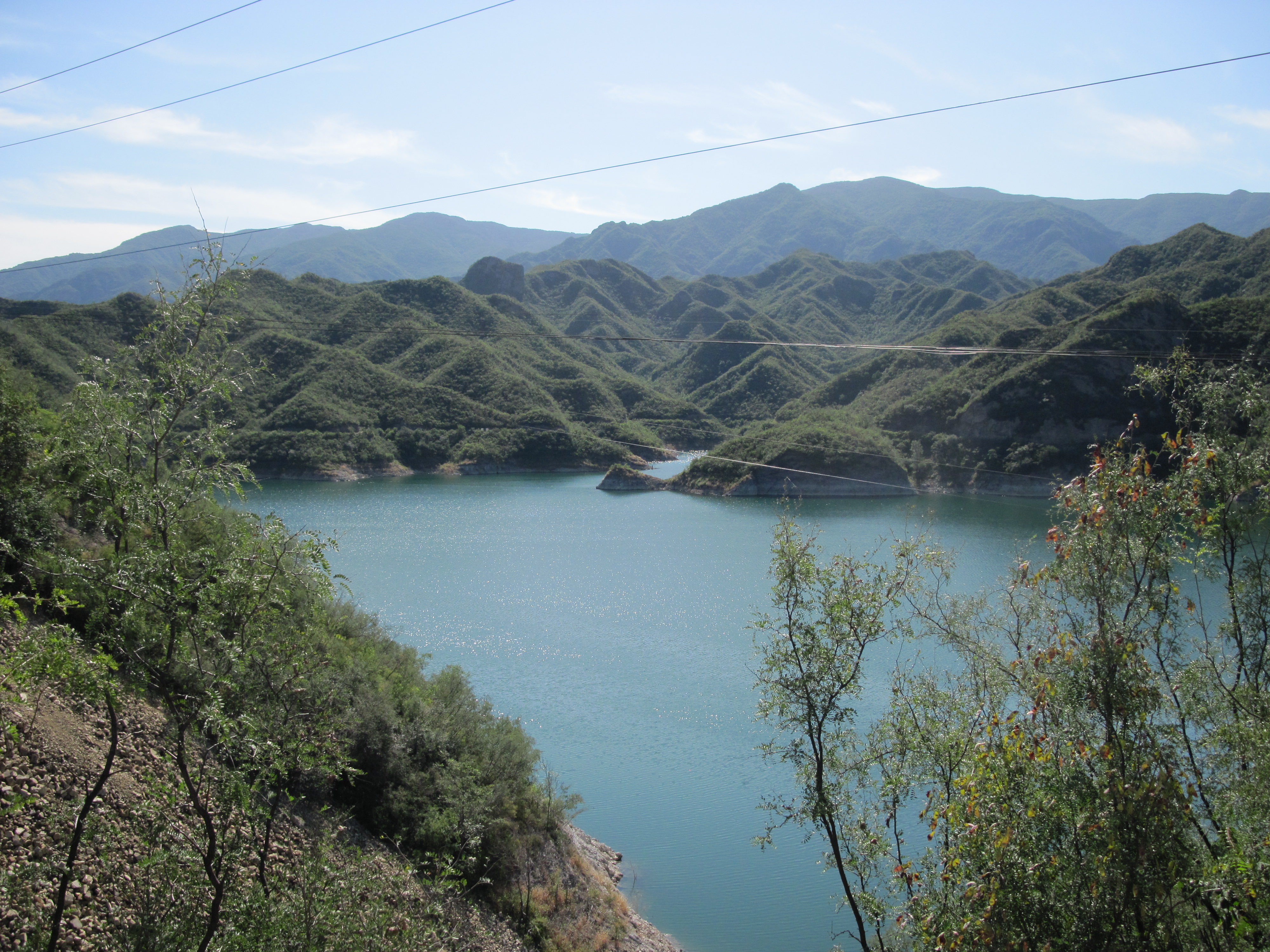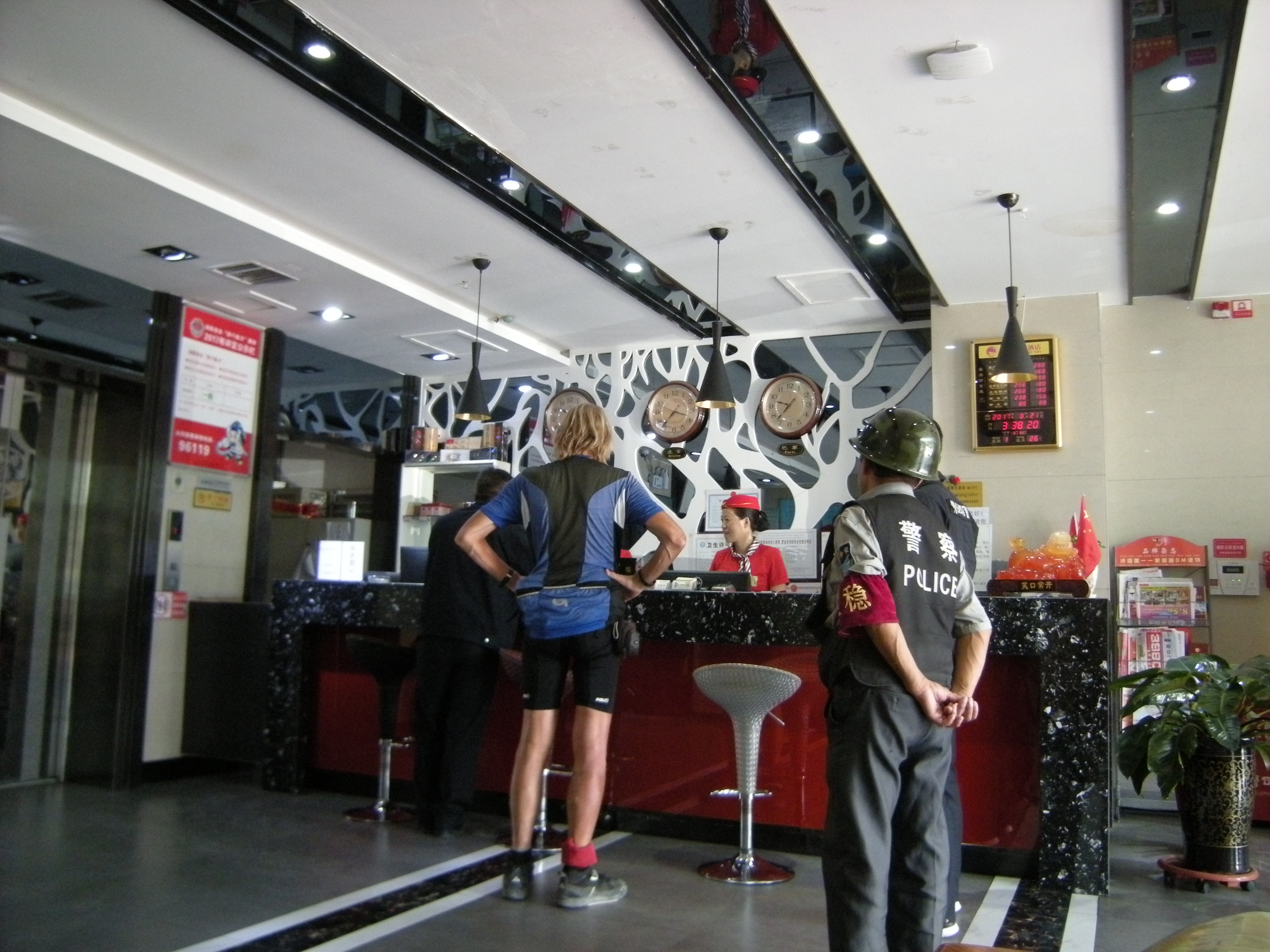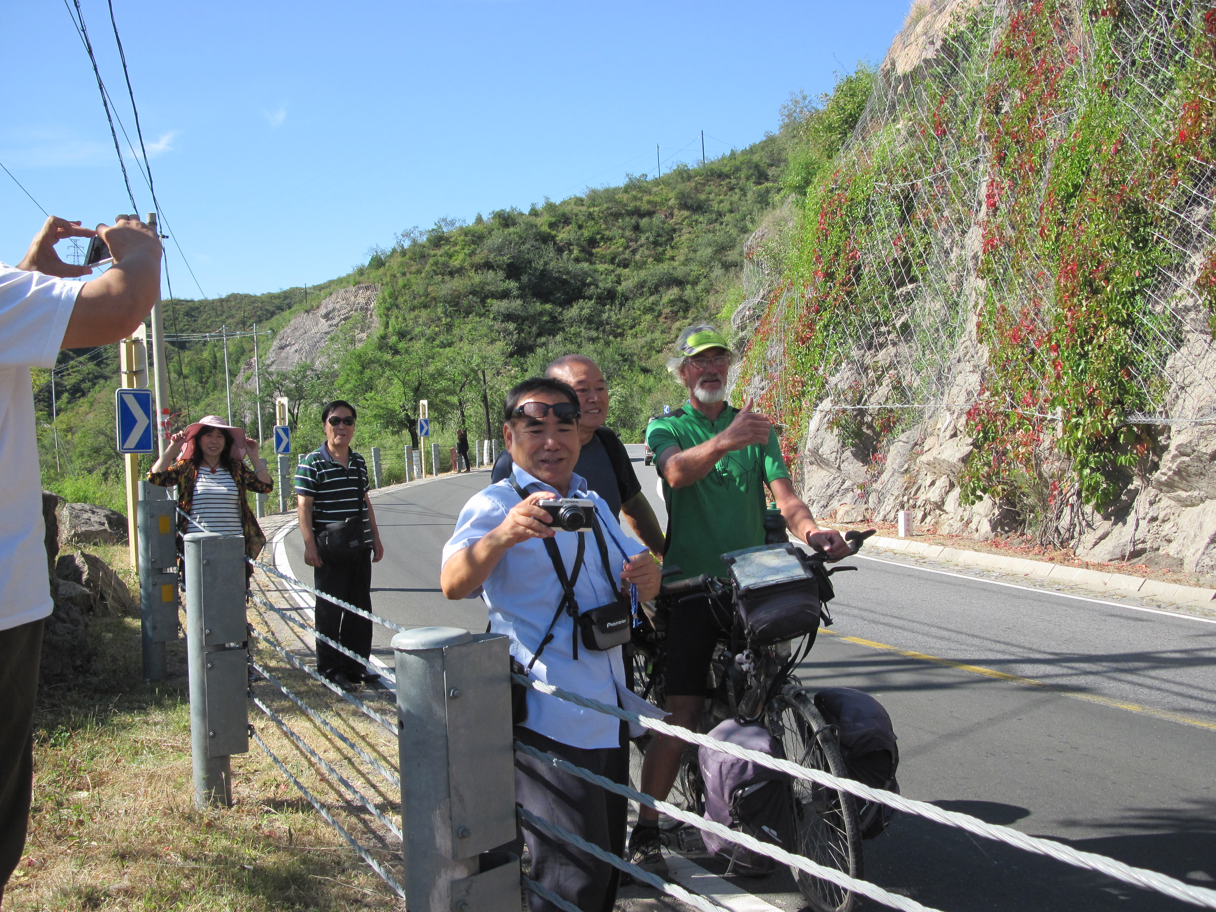 De dag begint met het plakken van mijn vijfde lekke band! Als ik mijn fiets uit de opslagruimte van het hotel haal staat mijn voorband leeg. Er zitten een paar staaldraadjes in die waarschijnlijk van kapotte vrachtwagenbanden afkomstig zijn. Met een teiltje water dat ik van uit de keuken aangereikt krijg is het lek snel opgespoord. Plakkertje er op en met een half uur vertraging kunnen we vertrekken. De rommel waar we ons gisteren zo aan stoorden is ’s nachts toch enigszins opgeruimd maar wordt na de opbouw van de marktkramen weer net zo snel aangevuld. Het stinkt dus nog steeds in het stadje. Ik koop nog wat te eten en te drinken voor de lunch. Ons ontbijt hebben we al op de kamer opgegeten. Via de smerige toegangsweg naar het stadje verlaten we dat vandaag ook weer en trappen verder over de 109. We moeten meteen klimmen en Wytze blijft meteen opvallend een heel eind achter. Ik laat me wat terug zakken zodat we weer samen naar boven klimmen maar even later lost hij opnieuw. Dan heeft hij waarschijnlijk ergens een knop omgezet en passeert hij me zonder iets te zeggen. Is hij niet fit of speelt er weer iets anders? Ik kan er geen hoogte van krijgen. We passeren een kameel en even later fietsen we onder 4 mannen door die hoog boven ons over de draden van een hoogspanningsmast lopen. Ik stop om foto’s te maken. Wytze niet. Hij vindt het niet interessant genoeg en roept met enige irritatie dat dit toch niets bijzonders is en dat je dat op zoveel plaatsen op de wereld kunt zien. Nou ik heb dit nog nooit ergens gezien. Het landschap is zoals de voorbije dagen weer mooi met veel steile zandkloven. Als de 109 meer naar het zuiden buigt gaan we ook meer de bergen in. Na zo’n 60 km fietsen we een dorpje binnen en vraag ik aan een bouwvakker of er misschien een hotel is. Oh ja hoor, zegt hij, er zijn er hier wel twee. Loop maar mee dan breng ik jullie. Wytze vindt het waarschijnlijk nog te vroeg om te stoppen en zegt dat ik het hotel maar moet gaan keuren. Ik ga dus naar binnen en kom de eigenaresse tegen die ons wel een kamer wil verhuren. Ik loop met haar mee naar de kamer wat een kamertje blijkt te zijn waar wel 6 bedden op staan. Op de niet opgemaakte bedden liggen wat vieze dekentjes. We mogen er zo in, zegt ze. Maar waar kunnen we ons dan wassen, vraag ik, alsof dat mijn keuze nog zal beïnvloeden. Ze loopt naar buiten en wijst me een emmer aan en een pomp. Ik bedank toch maar voor het aanbod. Naar het tweede ‘hotel’ dat er in het dorpje moet zijn gaan we maar niet meer op zoek. We fietsen verder en moeten een flinke klim op. Halverwege de klim verandert het wegdek van asfalt in grote stenen. Ook de vrachtwagens hebben moeite om boven te komen. Eentje stopt er zelfs omdat de chauffeur met mij op de foto wil. Op mijn GPS zie ik dat er ons na de afdaling nog een pittige klimstaat te wachten en ik stel daarom voor om daar niet meer aan te beginnen maar daarvoor al naar een slaapplek te gaan zoeken. We proberen het bij een gebouw dat op een hotel lijkt maar daar worden we weggestuurd. Er lijkt niets anders op te zitten dan te gaan kamperen. We fietsen daarom even terug naar het dorp waar we een winkeltje gezien hebben. Aan de kruidenier vragen we of hij in de buurt nog een hotel weet. Oh jawel zegt de man kom maar mee. Achter zijn winkel is namelijk een pension. Er is zelfs een douche bij en het ziet er best goed uit dus we zijn weer gered. Als we onze spullen naar binnen willen brengen komt de eigenaar van het pension ons vertellen dat het niet doorgaat omdat de kamer al verhuurd is. Hij verwijst ons naar een ander adres iets verder terug. De man die over dat pension gaat verstaan we echter niet maar we mogen wel even naar de kamer gaan kijken. Het betreft nu een hok met 2 bedden er in en er is helaas geen water op de kamer. Als we ons willen wassen dan kan dat bij een kraantje voor aan de straat waar hij net zijn aardappelen aan het wassen is. We bedanken de man voor het aanbod want dan gaan we toch nog liever in ons tentje slapen. Mijn idee is om te vragen waar we in het dorp ons tentje ergens neer zouden mogen zetten maar daar voelt Wytze blijkbaar niets voor want hij fietst het dorp al uit en begint al aan de klim. Ik zie nog wel wat mogelijkheden maar Wytze denkt zoals gewoonlijk dat er nog wel een betere plek zal komen. Ik raak daar na een tijdje weer behoorlijk geïrriteerd van en rijdt ‘m voorbij. Voor mij is het wel duidelijk dat we tijdens de klim geen kampeerplek meer zullen vinden en hoen hoger we komen hoe kouder het zal zijn. We zullen pas kunnen kamperen als we over de top zijn en weer een heel stuk gedaald zijn. Doortrappen dus want de zon staat al behoorlijk laag. Die laagstaande zon geeft nu echter wel een betoverende oranje gloed aan het berglandschap. Het wordt zelfs een van onze mooiste routes van de hele reis. Veel planten en bomen zijn al getooid met rode herfstbladeren en de weg kronkelt van de ene bergflank naar de andere. Prachtig!! Als we boven aankomen is het al 18.00 uur geweest en fietsen we volgens een bord Beijing Regio in. In de afdaling is het al flink koud. We passeren een natuurpark waar een Turist Office is. De eerste reactie op onze vraag of we er mogen blijven slapen is positief maar als er meer mensen bij betrokken raken mag het ineens toch weer niet. Jammer het is een mooi plekje. We worden doorverwezen naar een dorpje dat zo’n 7 km verderop ligt en waar een Farm Hotel zou zijn. Het is al flink donker als we verder naar het dorpje afdalen. In het dorp vraag ik aan een flink naar alcohol ruikende man of er een hotel is in het dorp. Hij knikt en gaat bellen. Hij wijst in de richting van de afdaling, steekt 5 vingers op en zegt iets dat klinkt als ‘holiday’. We vragen nog of hij 5 km bedoelt maar hij blijft maar ‘holiday’ herhalen. Wytze is alweer vertrokken als ik nog met de man aan het praten ben. Ik fiets vlug achter hem aan en vraag waar hij naar toe fietst. Wytze heeft begrepen dat we nog 5 km door moeten fietsen en ik weet het nie