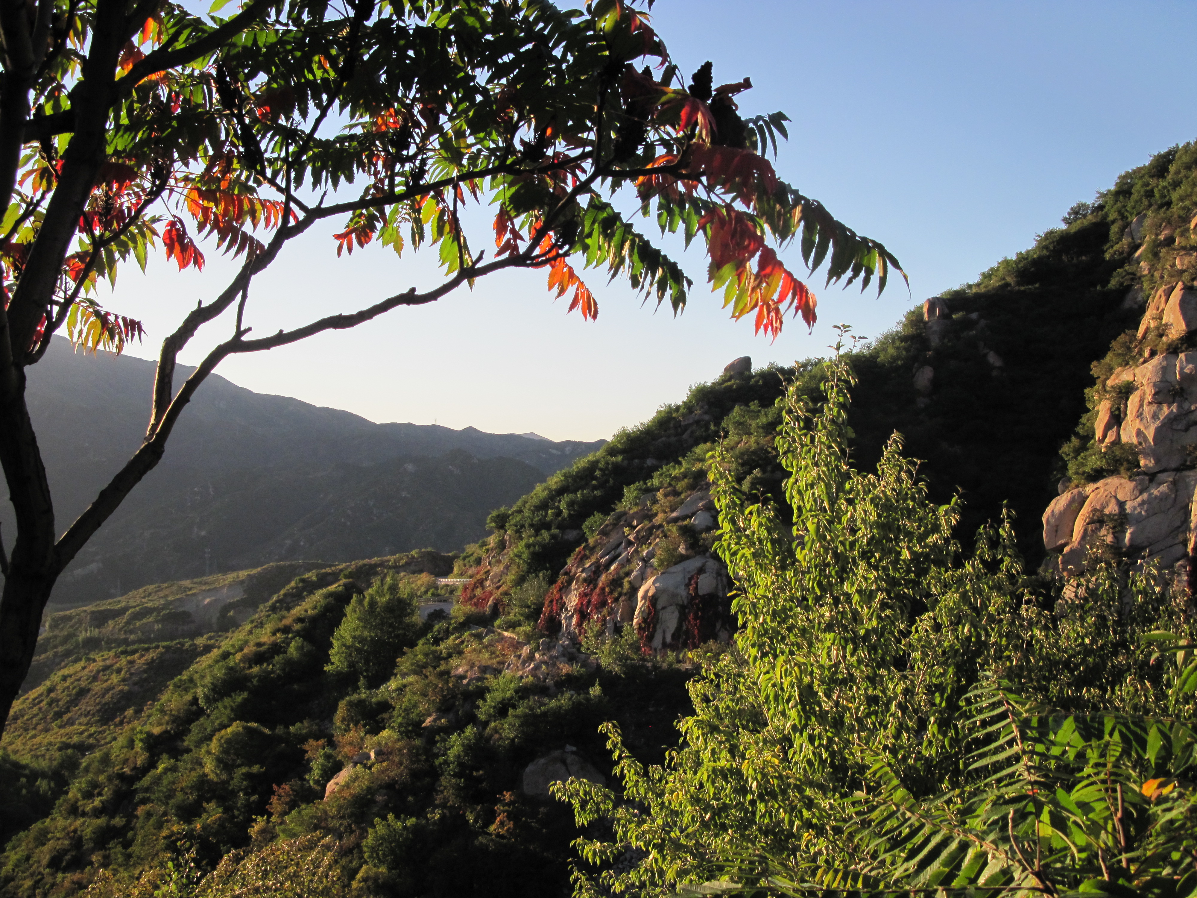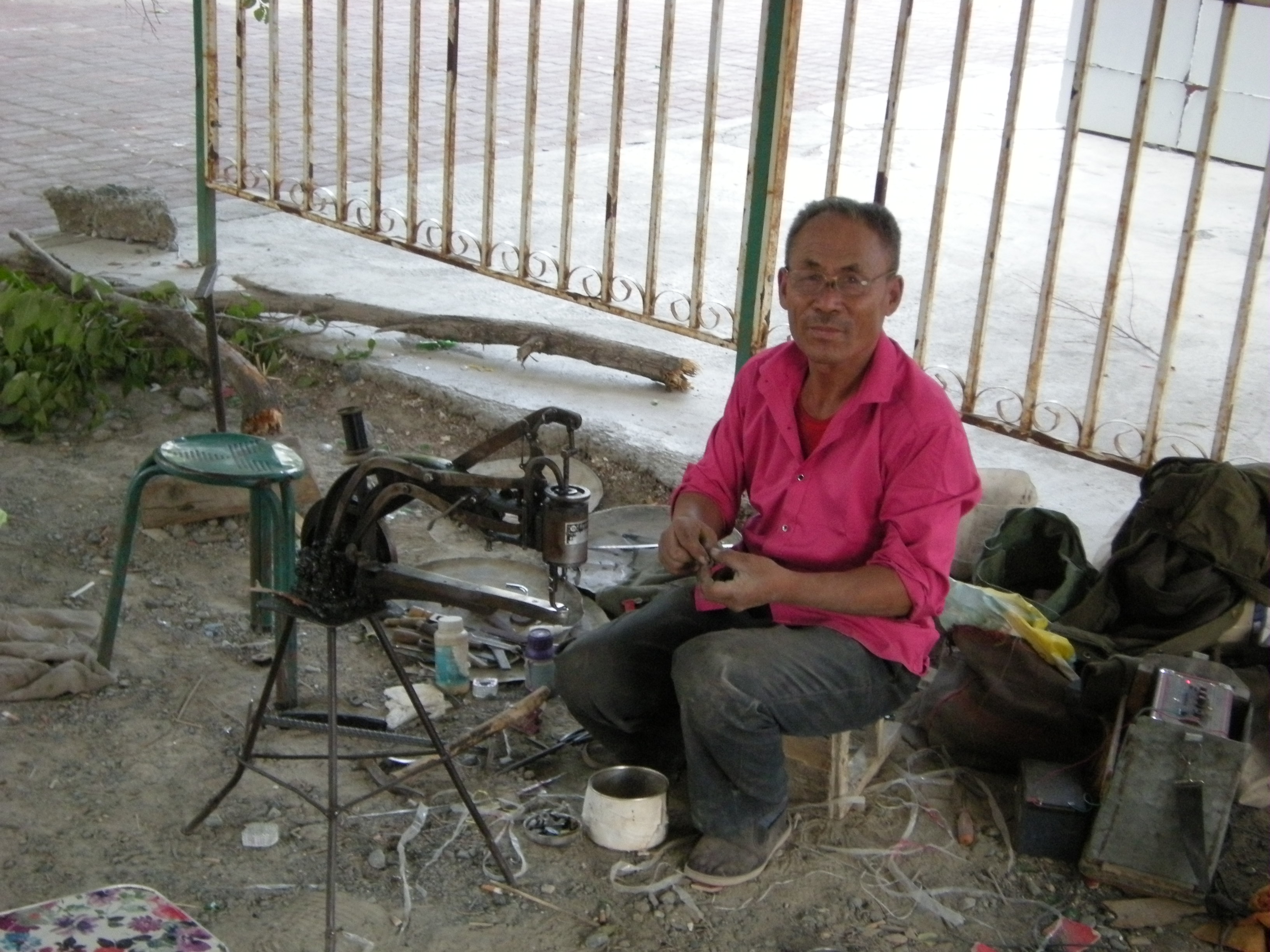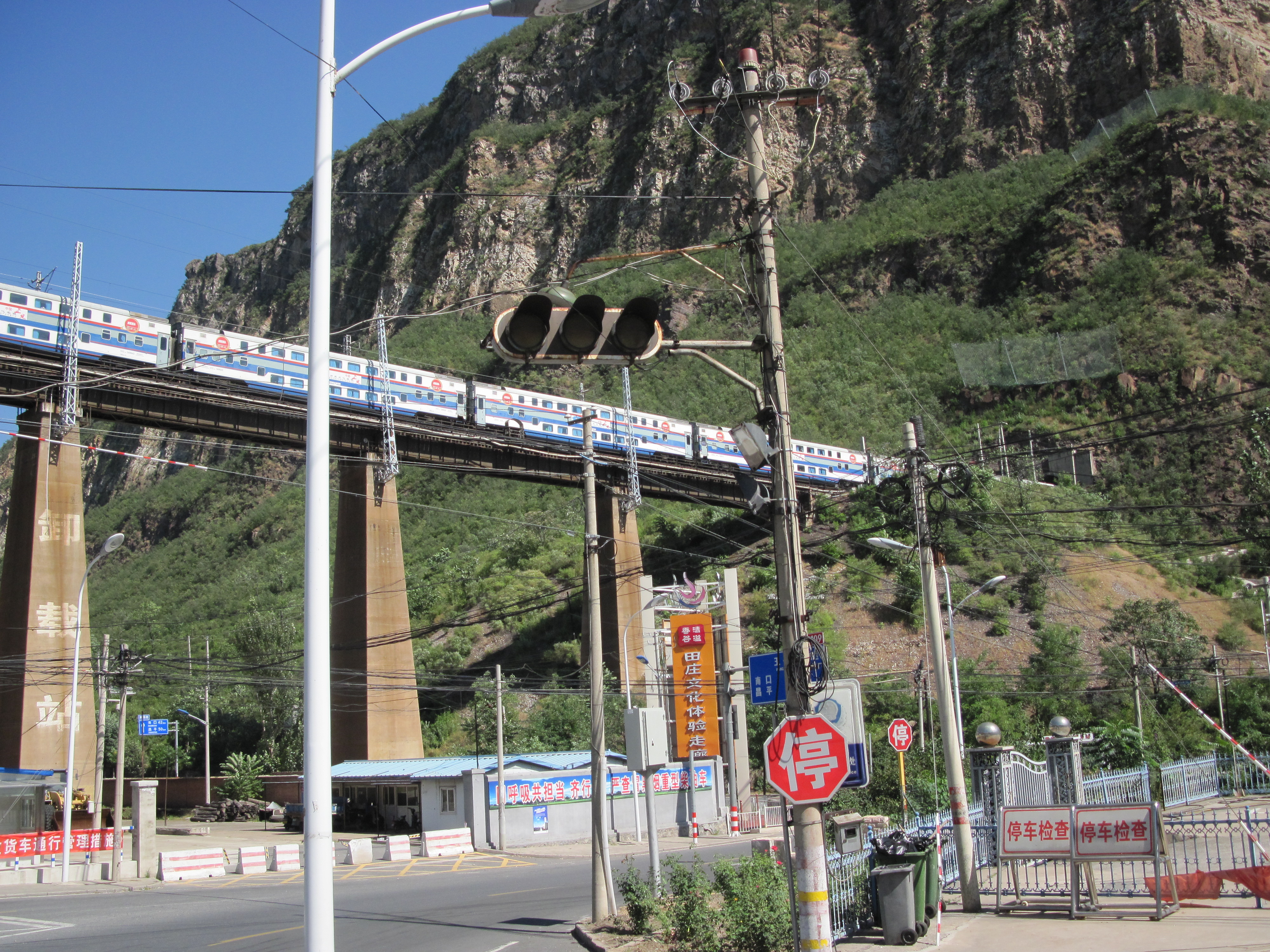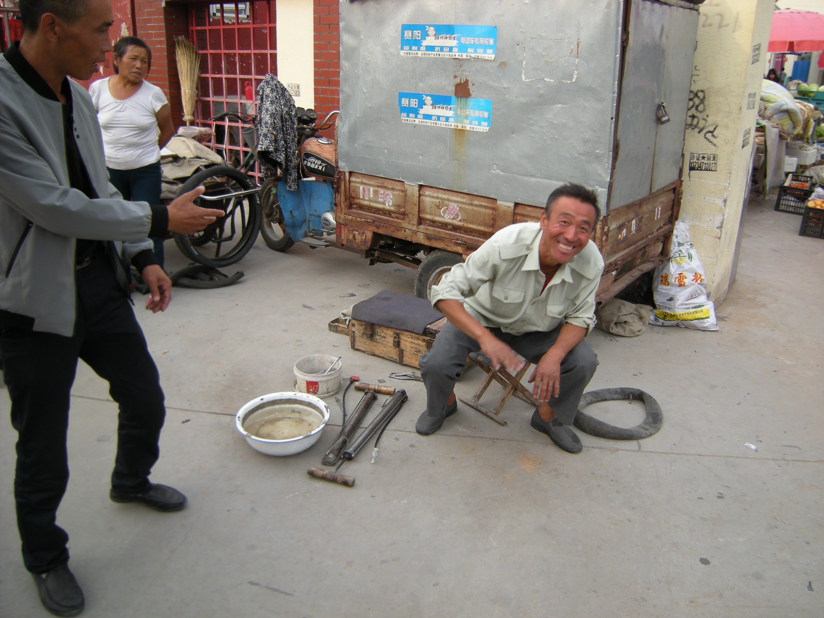 De dag begint met het plakken van mijn vijfde lekke band! Als ik mijn fiets uit de opslagruimte van het hotel haal staat mijn voorband leeg. Er zitten een paar staaldraadjes in die waarschijnlijk van kapotte vrachtwagenbanden afkomstig zijn. Met een teiltje water dat ik van uit de keuken aangereikt krijg is het lek snel opgespoord. Plakkertje er op en met een half uur vertraging kunnen we vertrekken. De rommel waar we ons gisteren zo aan stoorden is ’s nachts toch enigszins opgeruimd maar wordt na de opbouw van de marktkramen weer net zo snel aangevuld. Het stinkt dus nog steeds in het stadje. Ik koop nog wat te eten en te drinken voor de lunch. Ons ontbijt hebben we al op de kamer opgegeten. Via de smerige toegangsweg naar het stadje verlaten we dat vandaag ook weer en trappen verder over de 109. We moeten meteen klimmen en Wytze blijft meteen opvallend een heel eind achter. Ik laat me wat terug zakken zodat we weer samen naar boven klimmen maar even later lost hij opnieuw. Dan heeft hij waarschijnlijk ergens een knop omgezet en passeert hij me zonder iets te zeggen. Is hij niet fit of speelt er weer iets anders? Ik kan er geen hoogte van krijgen. We passeren een kameel en even later fietsen we onder 4 mannen door die hoog boven ons over de draden van een hoogspanningsmast lopen. Ik stop om foto’s te maken. Wytze niet. Hij vindt het niet interessant genoeg en roept met enige irritatie dat dit toch niets bijzonders is en dat je dat op zoveel plaatsen op de wereld kunt zien. Nou ik heb dit nog nooit ergens gezien. Het landschap is zoals de voorbije dagen weer mooi met veel steile zandkloven. Als de 109 meer naar het zuiden buigt gaan we ook meer de bergen in. Na zo’n 60 km fietsen we een dorpje binnen en vraag ik aan een bouwvakker of er misschien een hotel is. Oh ja hoor, zegt hij, er zijn er hier wel twee. Loop maar mee dan breng ik jullie. Wytze vindt het waarschijnlijk nog te vroeg om te stoppen en zegt dat ik het hotel maar moet gaan keuren. Ik ga dus naar binnen en kom de eigenaresse tegen die ons wel een kamer wil verhuren. Ik loop met haar mee naar de kamer wat een kamertje blijkt te zijn waar wel 6 bedden op staan. Op de niet opgemaakte bedden liggen wat vieze dekentjes. We mogen er zo in, zegt ze. Maar waar kunnen we ons dan wassen, vraag ik, alsof dat mijn keuze nog zal beïnvloeden. Ze loopt naar buiten en wijst me een emmer aan en een pomp. Ik bedank toch maar voor het aanbod. Naar het tweede ‘hotel’ dat er in het dorpje moet zijn gaan we maar niet meer op zoek. We fietsen verder en moeten een flinke klim op. Halverwege de klim verandert het wegdek van asfalt in grote stenen. Ook de vrachtwagens hebben moeite om boven te komen. Eentje stopt er zelfs omdat de chauffeur met mij op de foto wil. Op mijn GPS zie ik dat er ons na de afdaling nog een pittige klimstaat te wachten en ik stel daarom voor om daar niet meer aan te beginnen maar daarvoor al naar een slaapplek te gaan zoeken. We proberen het bij een gebouw dat op een hotel lijkt maar daar worden we weggestuurd. Er lijkt niets anders op te zitten dan te gaan kamperen. We fietsen daarom even terug naar het dorp waar we een winkeltje gezien hebben. Aan de kruidenier vragen we of hij in de buurt nog een hotel weet. Oh jawel zegt de man kom maar mee. Achter zijn winkel is namelijk een pension. Er is zelfs een douche bij en het ziet er best goed uit dus we zijn weer gered. Als we onze spullen naar binnen willen brengen komt de eigenaar van het pension ons vertellen dat het niet doorgaat omdat de kamer al verhuurd is. Hij verwijst ons naar een ander adres iets verder terug. De man die over dat pension gaat verstaan we echter niet maar we mogen wel even naar de kamer gaan kijken. Het betreft nu een hok met 2 bedden er in en er is helaas geen water op de kamer. Als we ons willen wassen dan kan dat bij een kraantje voor aan de straat waar hij net zijn aardappelen aan het wassen is. We bedanken de man voor het aanbod want dan gaan we toch nog liever in ons tentje slapen. Mijn idee is om te vragen waar we in het dorp ons tentje ergens neer zouden mogen zetten maar daar voelt Wytze blijkbaar niets voor want hij fietst het dorp al uit en begint al aan de klim. Ik zie nog wel wat mogelijkheden maar Wytze denkt zoals gewoonlijk dat er nog wel een betere plek zal komen. Ik raak daar na een tijdje weer behoorlijk geïrriteerd van en rijdt ‘m voorbij. Voor mij is het wel duidelijk dat we tijdens de klim geen kampeerplek meer zullen vinden en hoen hoger we komen hoe kouder het zal zijn. We zullen pas kunnen kamperen als we over de top zijn en weer een heel stuk gedaald zijn. Doortrappen dus want de zon staat al behoorlijk laag. Die laagstaande zon geeft nu echter wel een betoverende oranje gloed aan het berglandschap. Het wordt zelfs een van onze mooiste routes van de hele reis. Veel planten en bomen zijn al getooid met rode herfstbladeren en de weg kronkelt van de ene bergflank naar de andere. Prachtig!! Als we boven aankomen is het al 18.00 uur geweest en fietsen we volgens een bord Beijing Regio in. In de afdaling is het al flink koud. We passeren een natuurpark waar een Turist Office is. De eerste reactie op onze vraag of we er mogen blijven slapen is positief maar als er meer mensen bij betrokken raken mag het ineens toch weer niet. Jammer het is een mooi plekje. We worden doorverwezen naar een dorpje dat zo’n 7 km verderop ligt en waar een Farm Hotel zou zijn. Het is al flink donker als we verder naar het dorpje afdalen. In het dorp vraag ik aan een flink naar alcohol ruikende man of er een hotel is in het dorp. Hij knikt en gaat bellen. Hij wijst in de richting van de afdaling, steekt 5 vingers op en zegt iets dat klinkt als ‘holiday’. We vragen nog of hij 5 km bedoelt maar hij blijft maar ‘holiday’ herhalen. Wytze is alweer vertrokken als ik nog met de man aan het praten ben. Ik fiets vlug achter hem aan en vraag waar hij naar toe fietst. Wytze heeft begrepen dat we nog 5 km door moeten fietsen en ik weet het nie