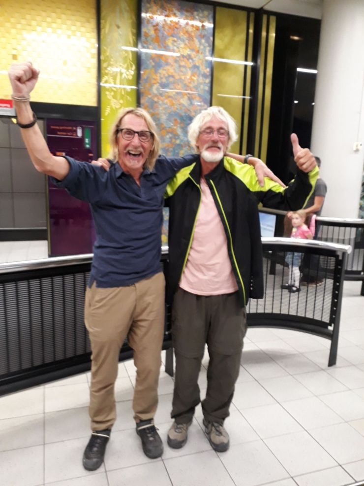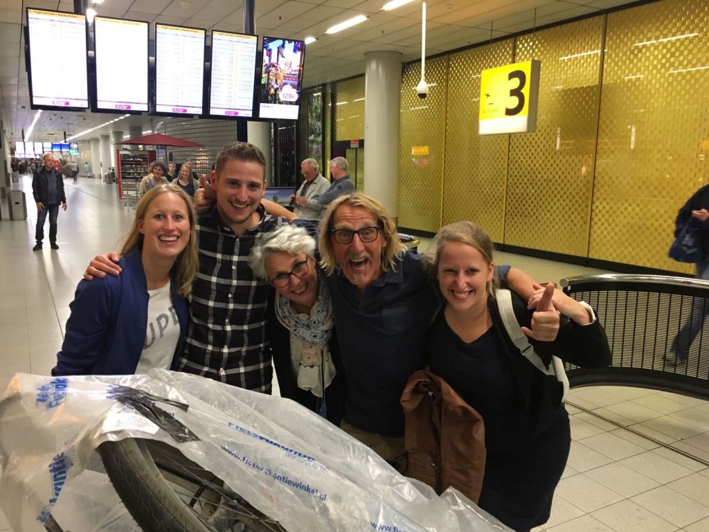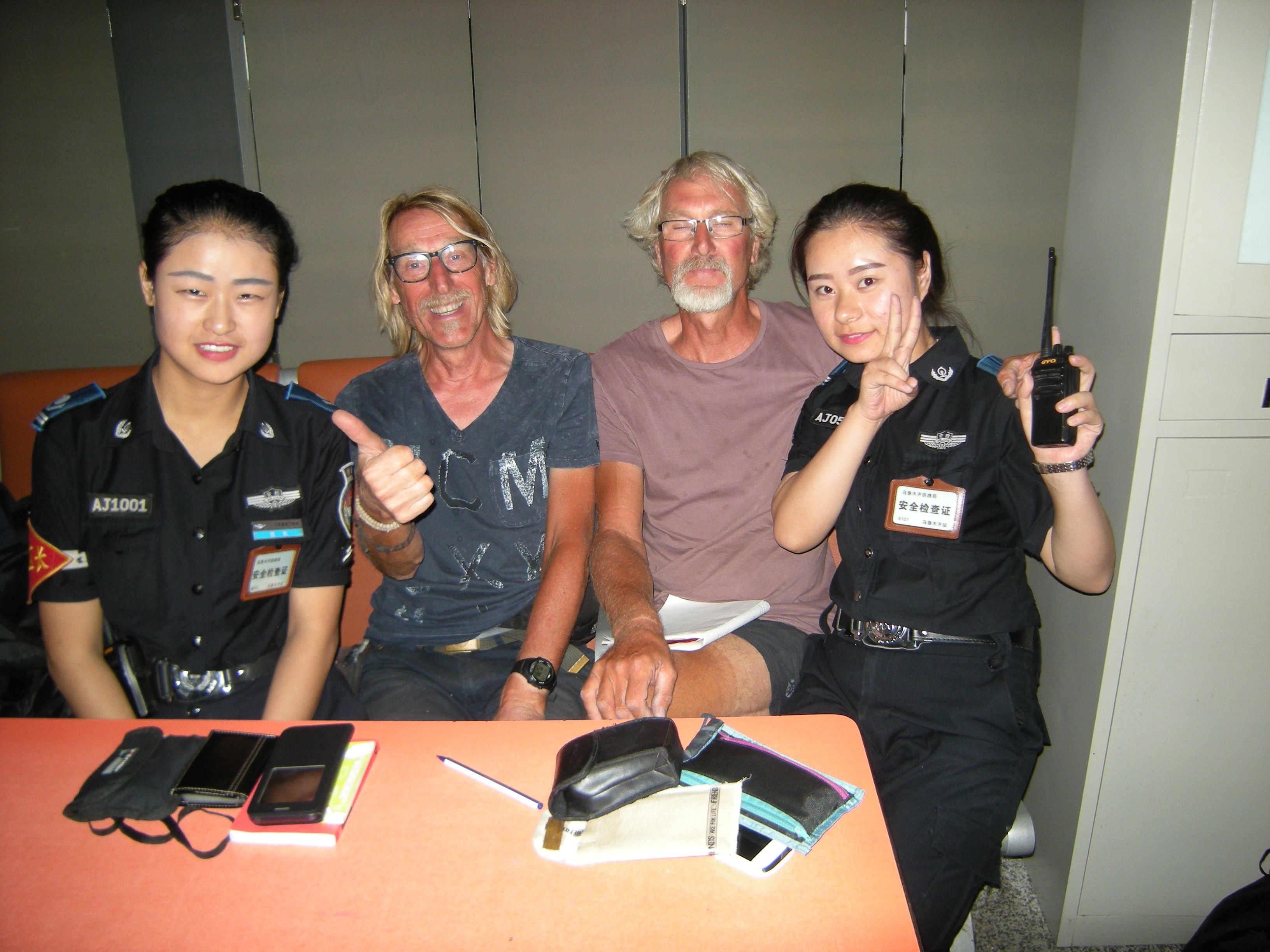Deze dag heb ik pas veel later aan mijn dagboek toegevoegd. Wat ik me herinner is dat het uitchecken bij ons hotel meer tijd vergde dan we gepland hadden. De sleutel van het fietsenhok was niet te vinden en niemand scheen te begrijpen dat we haast hadden. Het vliegveld hadden we vrij snel gevonden maar er was geen Engelstalige bewegwijzering dus verspeelden we veel tijd voordat we eindelijk de toegang naar de incheckbalie van de buitenlandse vluchten gevonden hadden. Toen we uiteindelijk bij de toegang aankwamen stonden Sheng en Rex daar al te wachten. Ze hebben zelfs nog wat presentjes voor ons gekocht. Ik ben de hal ingegaan en ben de incheckbalie van onze vliegmaatschappij gaan zoeken. Die was snel gevonden en gelukkig sprak de baliemedewerkster wel een woordje Engels en kon ze me verwijzen naar de balie waar we onze fietsen in moesten checken. Ik spoed me terug naar de ingang om Wytze en onze fietsen op te gaan halen. Afscheid nemen van Sheng en Rex zouden we doen als we ingechecked waren. Hup alle fietstassen in de verzamelzak en de fietsen ingepakt in onze meegenomen zeiltjes. En toen begonnen de problemen. De fietsen werden niet geaccepteerd. Wat er precies allemaal mee mis was was ons niet duidelijk. Er wordt gebeld, op de computer wordt van alles ingetikt en de hoofden worden geschud. We moeten de rij uit en wachten. Maar waarop? Er gebeurt helemaal niets meer hebben we het idee. Wytze is ten einde raad. De tijd dringt en dan plotseling schijnt alles toch goed te zijn. Als we onze fietsen afgeven komt er een juffrouw van de vliegmaatschappij naar ons toegerend en zegt dat we onmiddellijk onze bagage aan moeten bieden want de incheckbalie wordt bijna gesloten. Wytze gooit zijn plunjebaal op de weegschaal. Het alarm gaat af hij moet nog iets met batterijen uit zijn tassen halen wat er niet in mag zitten. Dan bied ik mijn grote tas aan en ook bij mij alarm!! Mijn tas is veel te zwaar. Als ik ‘m zo meeneem moet ik 250 Dollar bijbetalen. Vlug alles weer open en een hoop spullen eruit en in de prullenbak. Tijd om goed te kijken wat ik weggooi heb ik niet dat zien we straks thuis wel. Als uiteindelijk onze bagage via de lopende band naar ons vliegtuig vertrekt worden we omgeroepen om ons onmiddellijk bij de gate te melden want de boardingtime is bijna verstreken. Oh jee.. Sheng en Rex staan nog bij de ingang te wachten om afscheid van ons te nemen ons de cadeautjes mee te geven. Ik twijfel maar durf toch niet meer terug te gaan .. we rennen zo hard we kunnen naar de gate en pffff.. we mogen nog mee. Onze medepassagiers kijken ons aan met een blik van ‘hebben we daar zo lang op moeten wachten’ . Bekaf zakken we in onze stoelen en stuur ik een berichtje naar Sheng met de excuses dat we geen afscheid meer konden nemen maar dat we het wel gehaald hebben. Nog even evalueer ik met Wytze de hectische ochtend en de paniek die zich van ons beiden meester maakte . En dan worden we stil en komt het gevoel naar boven dat ons avontuur ten einde begint te geraken. Het was niet altijd makkelijk maar we kijken toch voldaan en trots terug op wat we de voorbije maanden samen volbracht hebben. In Moskou moeten we overstappen en een paar uur wachten op onze aansluitende vlucht. Vanuit de wachtruimte zien we onze fietsen in het klaarstaande KLM vliegtuig geladen worden. Gelukkig .. onze bagage lijkt ook met ons mee te rijzen. We rijzen met een een groot Nederlands reisgezelschap naar Amsterdam en horen sinds lange tijd hoe meer mensen onze taal spreken. De aankomst op Schiphol is zoals gepland en daar worden we allerhartelijkst verwelkomt door onze partners en kinderen die daar met blije gezichten klaar staan met bloemen en spandoeken. Hierna gaan onze wegen scheiden, Wytze met zijn familie naar het Friese en ik met mijn familie naar het Brabantse land waar we nog lang heel veel te vertellen hebben. Wat een prachtige ervaring!