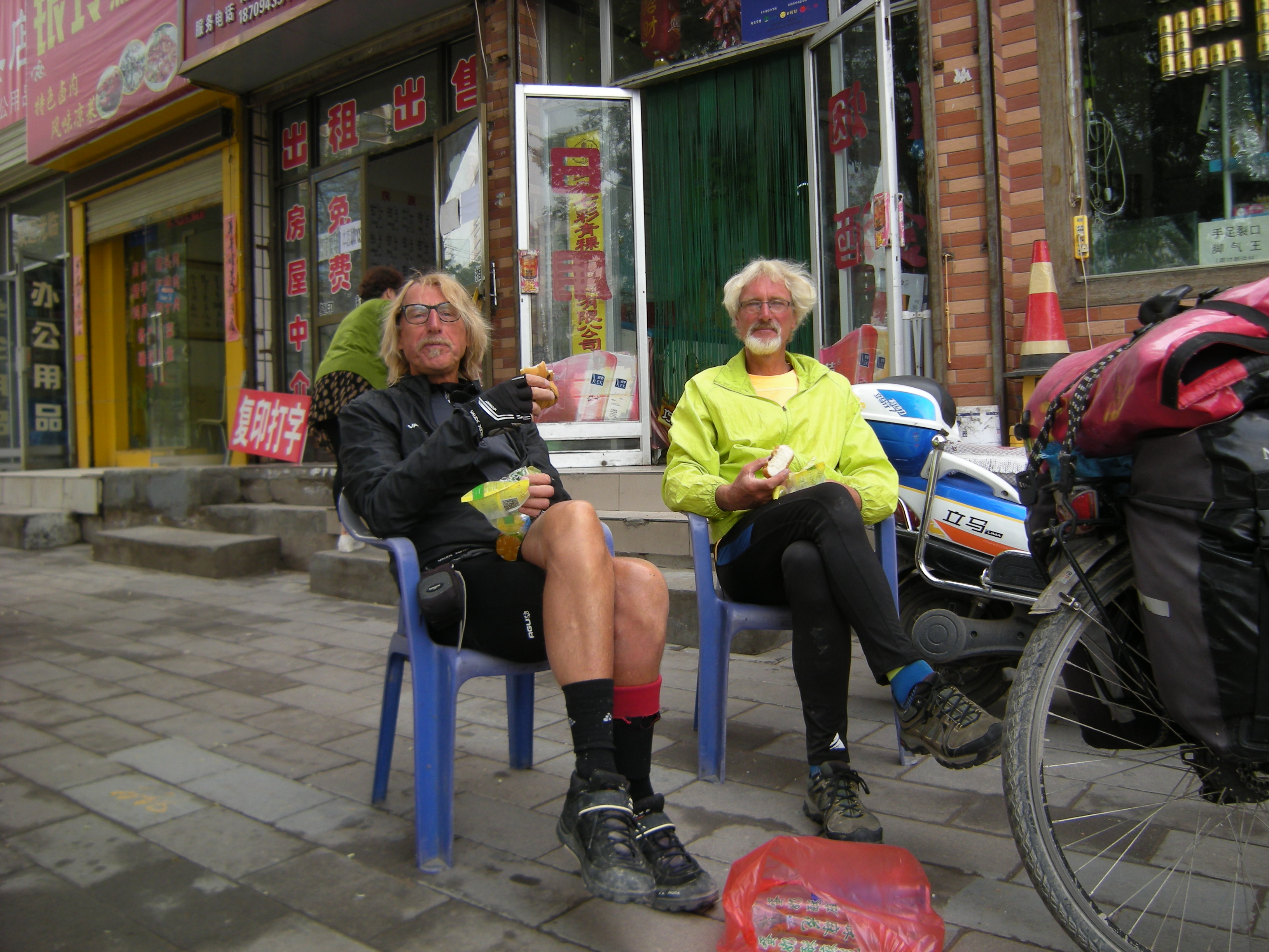 We hebben een all-inclusive kamer dus staat er ook ontbijt voor ons klaar. Als ik uit de hotelkamer kijk zie ik de grote groep Chinese toeristen die gisteren de rust bij ons avondeten verstoorde al in de bus klimmen. Die hebben het ontbijt dus al op!! Als er nog maar iets over is. Nou, … niet genoeg dus! De meeste bakken zijn al leeg en de frites (ja ja) zijn al koud. Gelukkig bakken ze op mijn verzoek nog 2 eitjes voor me. We zetten de route uit met Maps.me die we vandaag wel met de GPS kunnen volgen. Het is helaas weer een saaie rit. Ergens iets gaan drinken wordt steeds vaker het hoogtepunt van de dag, zeker als er dan voor ons weer een heleboel belangstelling is. Onze middagpauze met brood en water brengen we door op een trapje bij een leegstaand gebouw waar continu zwaar vrachtverkeer voorbij komt. Er valt weinig te genieten en het overlijden van Ad speelt de hele dag maar door mijn hoofd. Ook Wytze is lijkt me niet in zijn normale doen. Vanmorgen zat hij weer in diep gepeins verzonken op de rand van zijn bed. Ik vroeg hem daarom of er iets niet goed was waarop hij antwoordde dat dit zijn manier van ontspannen was. Ik vergat toen te vragen waarom hij voelde dat er een noodzaak voor die ontspanningsoefening was. De hele dag heeft hij achter mij aangefietst en dat is niet normaal want in zijn goede doen wil hij niets liever dan op kop fietsen. De route die we vandaag fietsen vindt hij een van de slechtste tot nu toe terwijl hij die van gisteren, die qua landschap en zwaarte eigenlijk niets verschilt, de meest ideale route vond. Kortom, ik blijf me verbazen en heb geen idee van wat er speelt. In Horinger vinden we weer een hotel en gaan we in het centrum op zoek naar een eettentje. Het is weer een heel gedoe voor we iets naar onze zin kunnen vinden en onder het lopen krijg ik steeds vaker en sneller last van mijn enkel. Bij thuiskomst zal ik daar toch maar eens door een orthopeed naar moeten laten kijken. We komen uiteindelijk terecht bij een klein restaurantje met een vitrine waaruit we de ingrediënten mogen kiezen die we klaar gemaakt willen hebben. Een methode die we in Nederland kennen van de wokrestaurants. Als de spullen klaar zijn krijgen we ze in een pan opgediend. Smaakt prima! Na het eten wil Wytze weer door het stadje gaan lopen maar ik kan met mijn pijnlijke enkel zijn tempo niet meer bijbenen en wil terug naar het hotel. Wytze wil om kwart voor 10 toch nog even de stad in om een ijsje te gaan kopen. Om Wytzes gevoel ‘het derde wiel’ te zijn niet aan te wakkeren ga ik toch maar met hem mee. Helaas is de winkel al dicht en zullen we het zonder ijsje moeten doen vandaag. Wytze wil nog wel verder zoeken maar daar pas ik vanwege mijn enkel voor. We gaan terug naar het hotel en ga Peet bellen om te horen hoe het gisterenavond bij Keskenaote gegaan is bij de bijeenkomst vanwege het overlijden van Ad. Het is blijkbaar een bijzondere, emotionele en nuttige bijeenkomst geweest. Daarna ook nog een bericht gestuurd naar Sheng Ding in Peking met de vraag of ze ons daar zou willen rondleiden en of ze nog goede tips voor ons heeft. Zullen we morgen iets van de ‘Muur’ gaan zien? Spannend! Ik ben benieuwd.