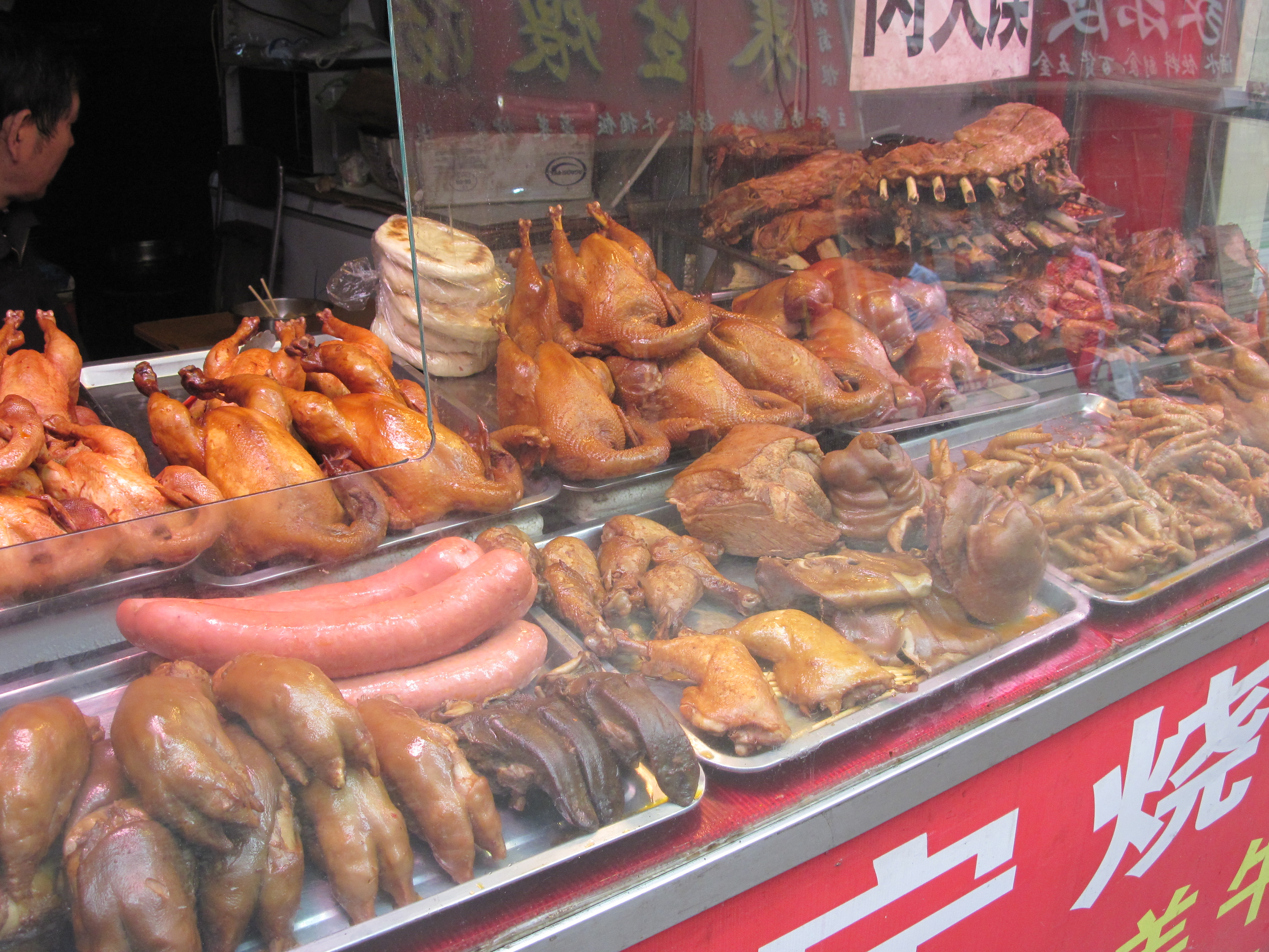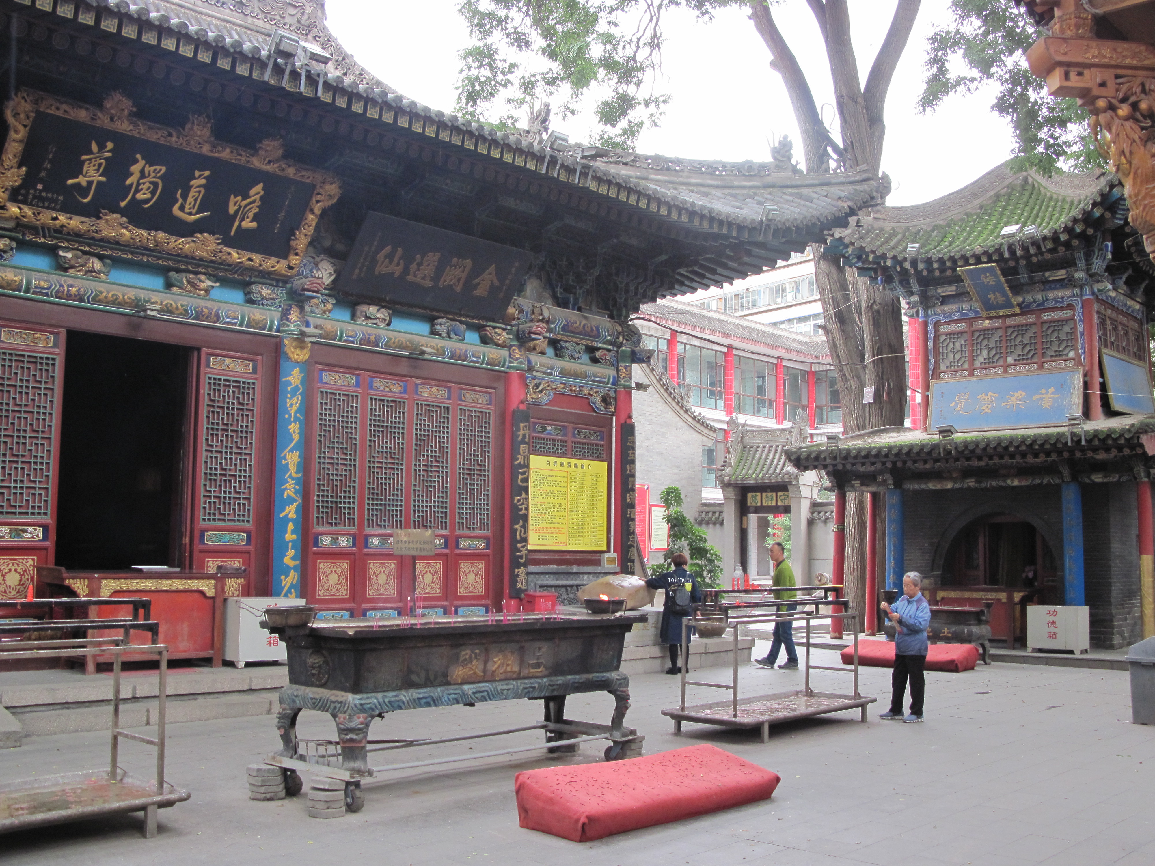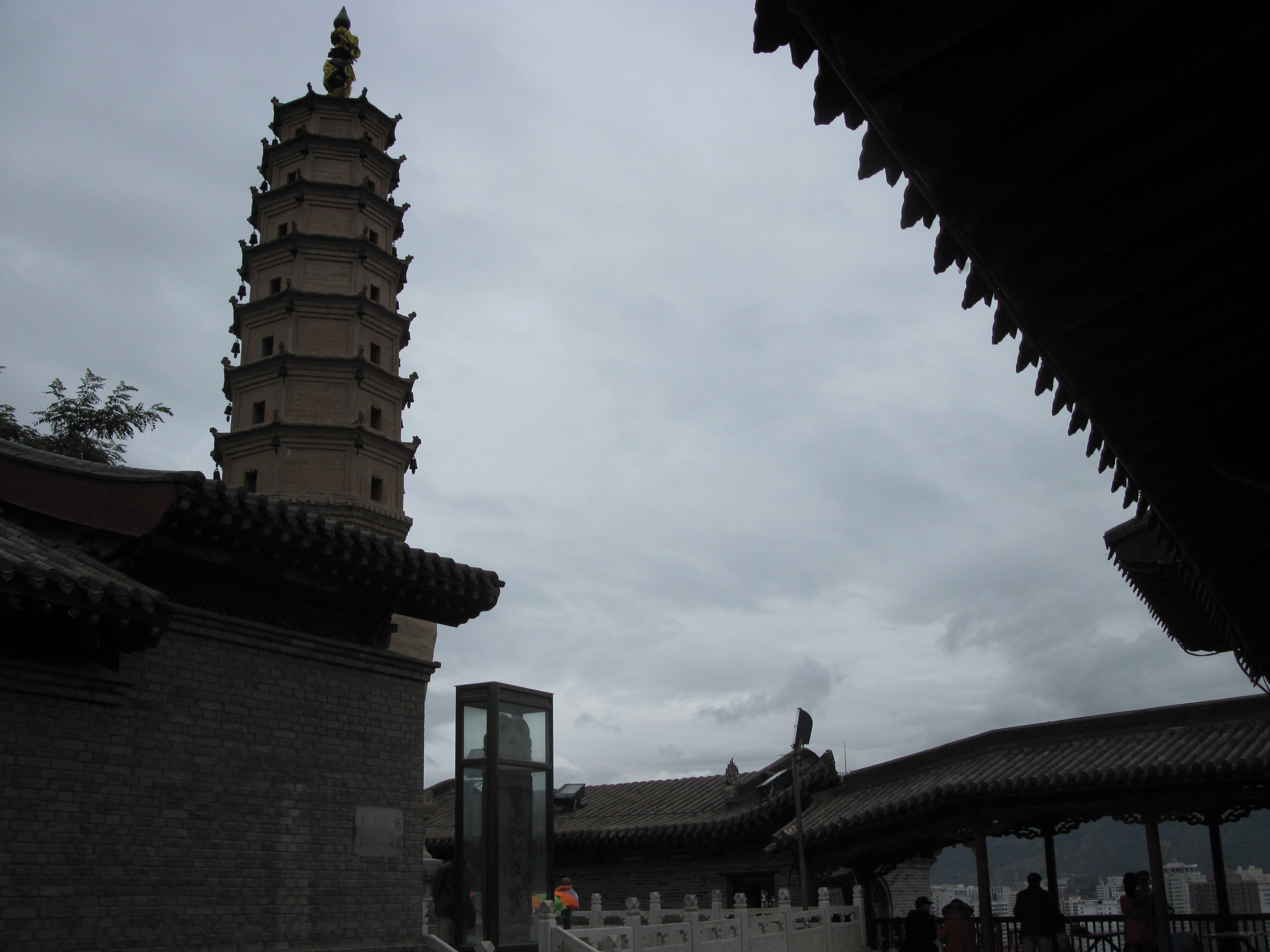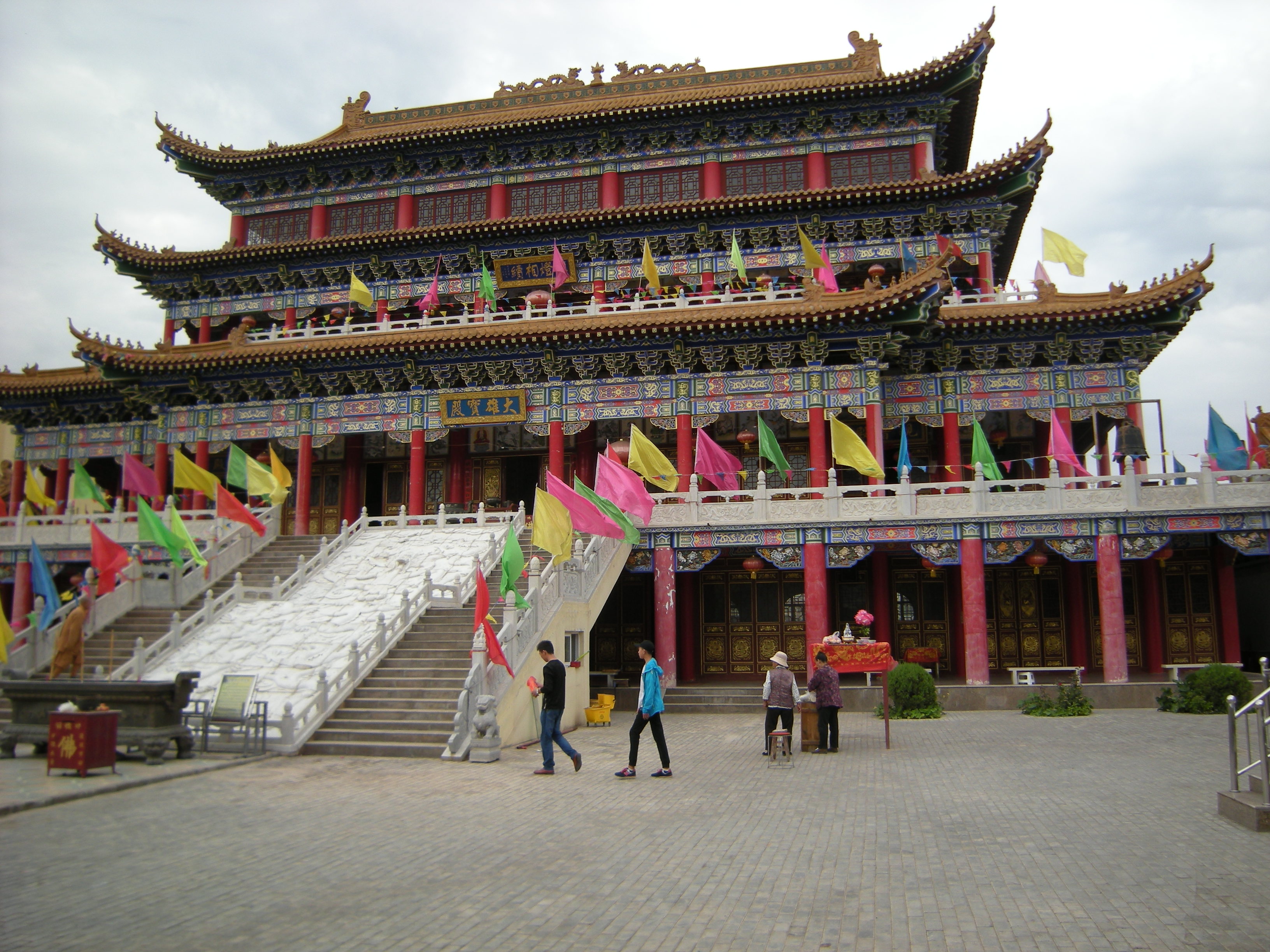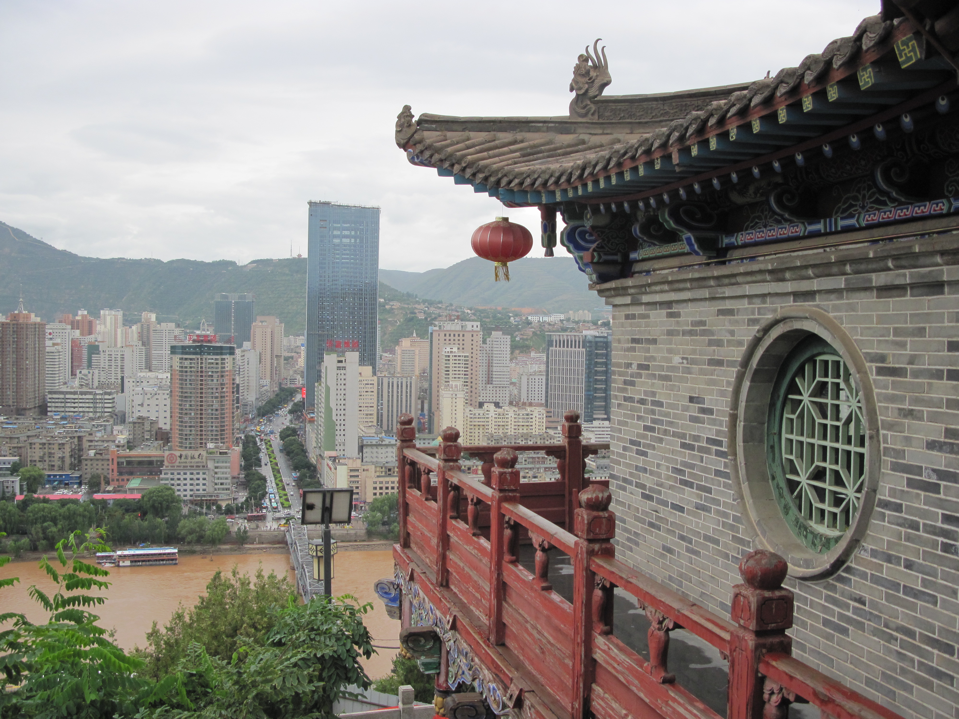 Opnieuw mogen we een beetje uitslapen. Na het ontbijt lopen we naar het station om daar onze fietsen op te halen. We geven onze bonnetjes bij de deur af en even later komen onze fietsen en de zakken met bagage op een kar de hal uit gereden. Alles is nog tiptop in orde. Terug bij het hotel mogen we de fietsen binnen bij de entree stallen. We lopen daarna nog even langs het hotel een druk zijstraatje in waar in kleine winkeltjes van alles te koop is. In de vitrines wordt het koopwaar open en bloot uitgestald.Varkens- en kippenpootjes, kippen en eenden met lange nekken. Er ligt van alles wat wij niet lusten maar wat daar als lekkernij gegeten wordt. We kopen bij een bakker een paar warme koeken en eten die al verder lopend op. Als we op het einde van de straat zijn wil ik een paar foto’s maken van de met glas dichtgemaakte dakterrassen en de wirwar van elektriciteitsdraden en merk dan dat ik mijn rugzak niet meer om heb. Oei paniek!!! Waar heb ik dat ding gelaten?Alles heb ik er in zitten. Geld, paspoort, woordenboekjes, fototoestel, … etc. Ineens herinner ik me dat ik de blauwe rugzak bij de bakkerskraam aan een spijker gehangen heb. Rennen dus. Yes, hij hangt er nog, de hartslag kan weer naar beneden. Op Google gaan we op zoek naar een bezienswaardigheid in Lanzhou. Op 6 km is er een Boeddhistische tempel. Dat lijkt ons wel wat. Met maps.me zetten we de route uit. De route gaat via kleine straatjes door volksbuurten waar de mensen duidelijk niet gewend zijn aan passerende Europese vakantiefietsers. De Boeddhistische tempel ligt op een heuvel aan de overkant van de Gele Rivier maar voor we met de brug het water oversteken bezoeken we aan deze kant nog de Taoïstische Tempel Bai Jun. Een aardig complex omdat het de eerste tempel is die we bezoeken maar toch niet overdonderend verrassend. Het dreigt te gaan regenen dus twijfelen we nog even of we wel naar de tempel aan de overkant zullen wandelen. We doen het toch maar en parkeren de fietsen bij een kiosk onder de trappen van de brug. Vandaar wandelen we overeen lange de trap te heuvel op en passeren daarbij tempels en pagodes. Heel mooi! Vooral ook het steeds grootser wordende uitzicht over de miljoenenstad Lanzhou en de Gele Rivier. Op de terugweg naar het hotel zien we verkeersborden die verwijzen naar weg 109 die we morgen moeten hebben. Even onthouden dus! We hebben we nog een stop bij een moderne koffiezaak met lekker gebak. Wytze gaat daarna nog wat winkels af om batterijen voor zijn fototoestel te kopen en ik ga alvast terug naar het hotel. ’s Avonds eten we bij een Chinese fastfoodzaak. Het eten valt tegen maar onze magen zijn toch weer gevuld. Wytze heeft geen batterijen kunnen kopen maar heeft eerder op de dag aan het einde van de straat wel een Nikon fotozaak gezien en wil het daar gaan proberen. De winkel blijkt verder weg dan gedacht dus als die ook nog dicht is als we daar aankomen is het even balen. Op de terugweg passeren we een groot warenhuis en slagen daar gelukkig wel. Er kan weer geknipt worden.