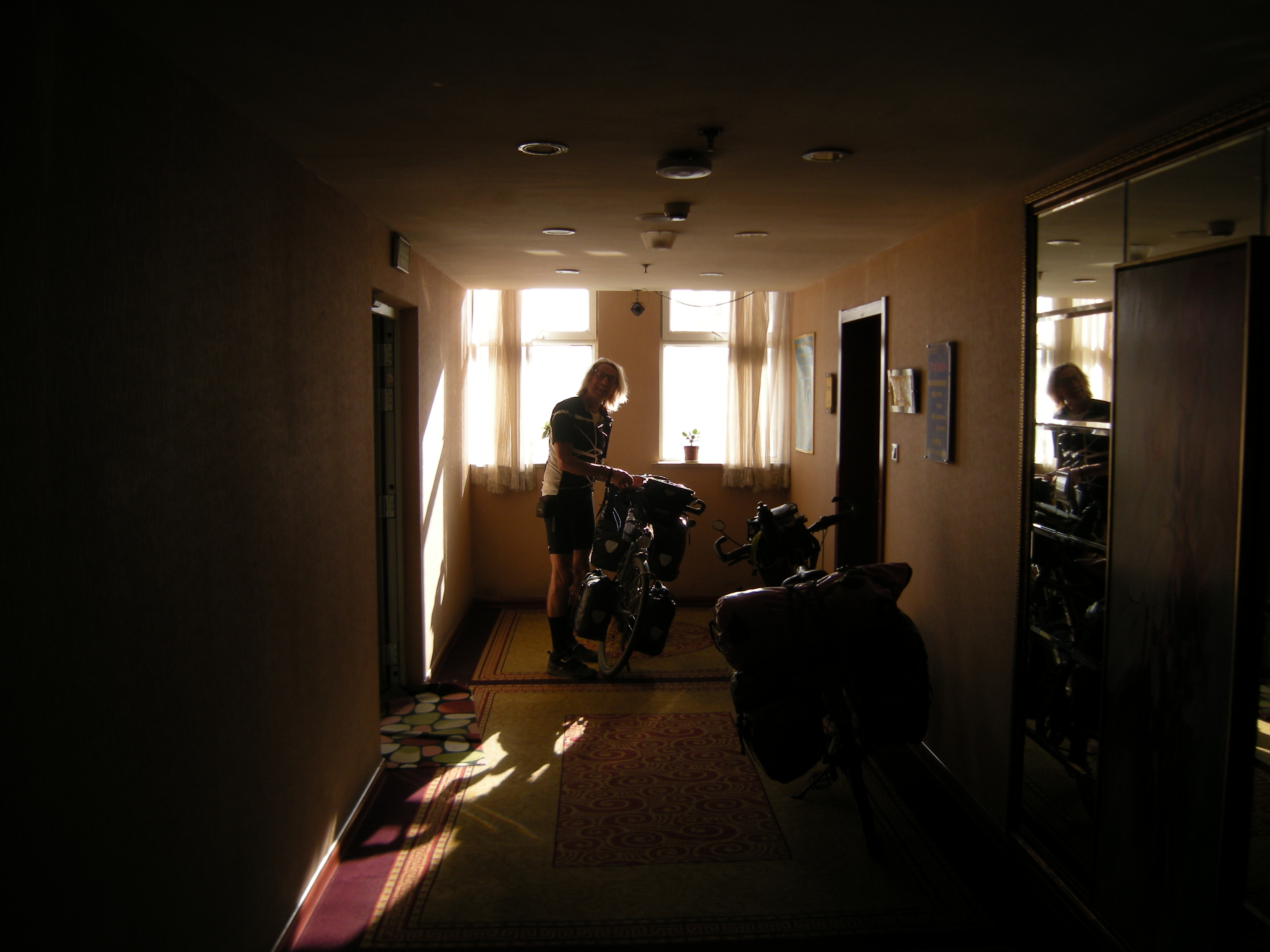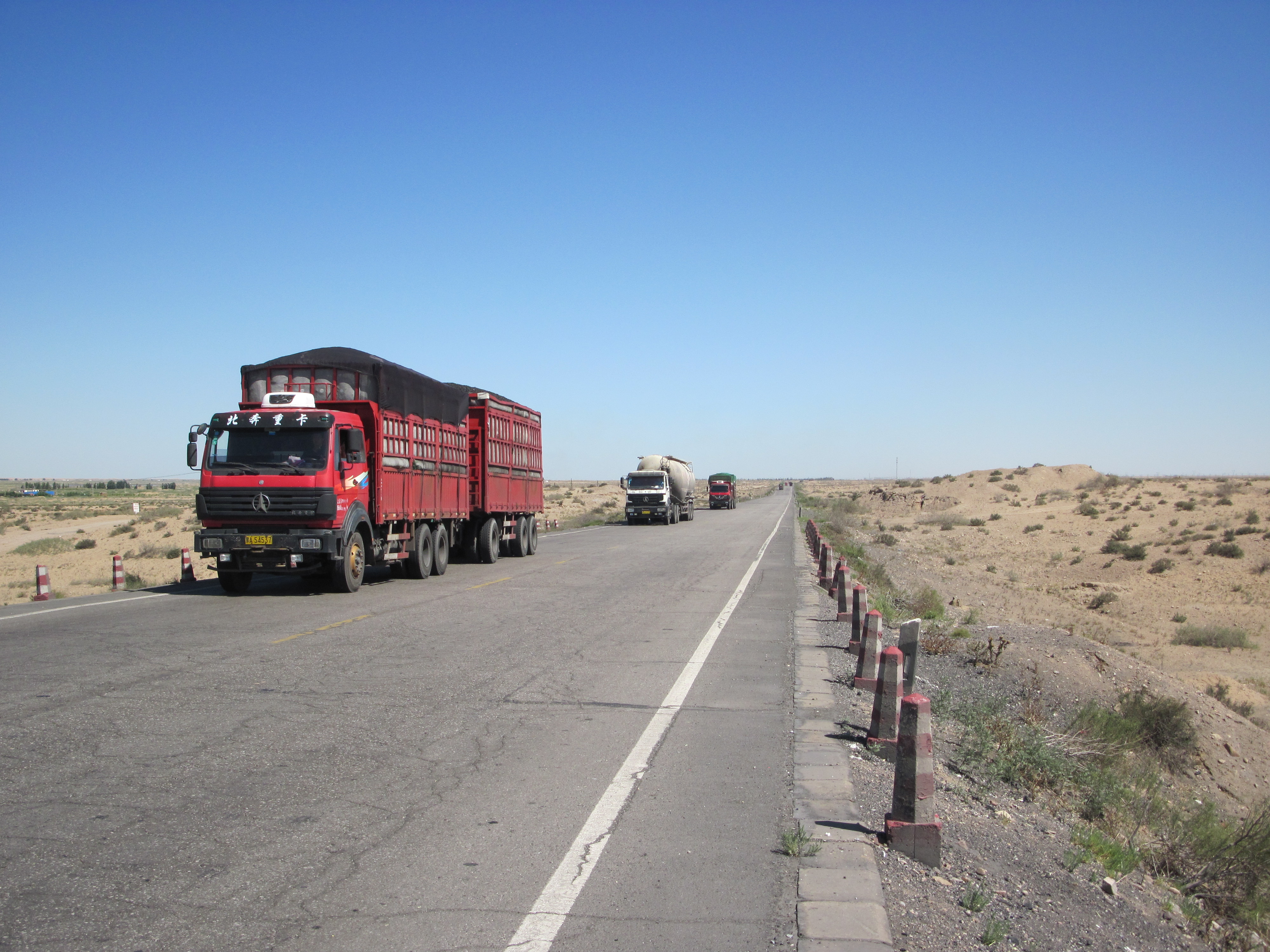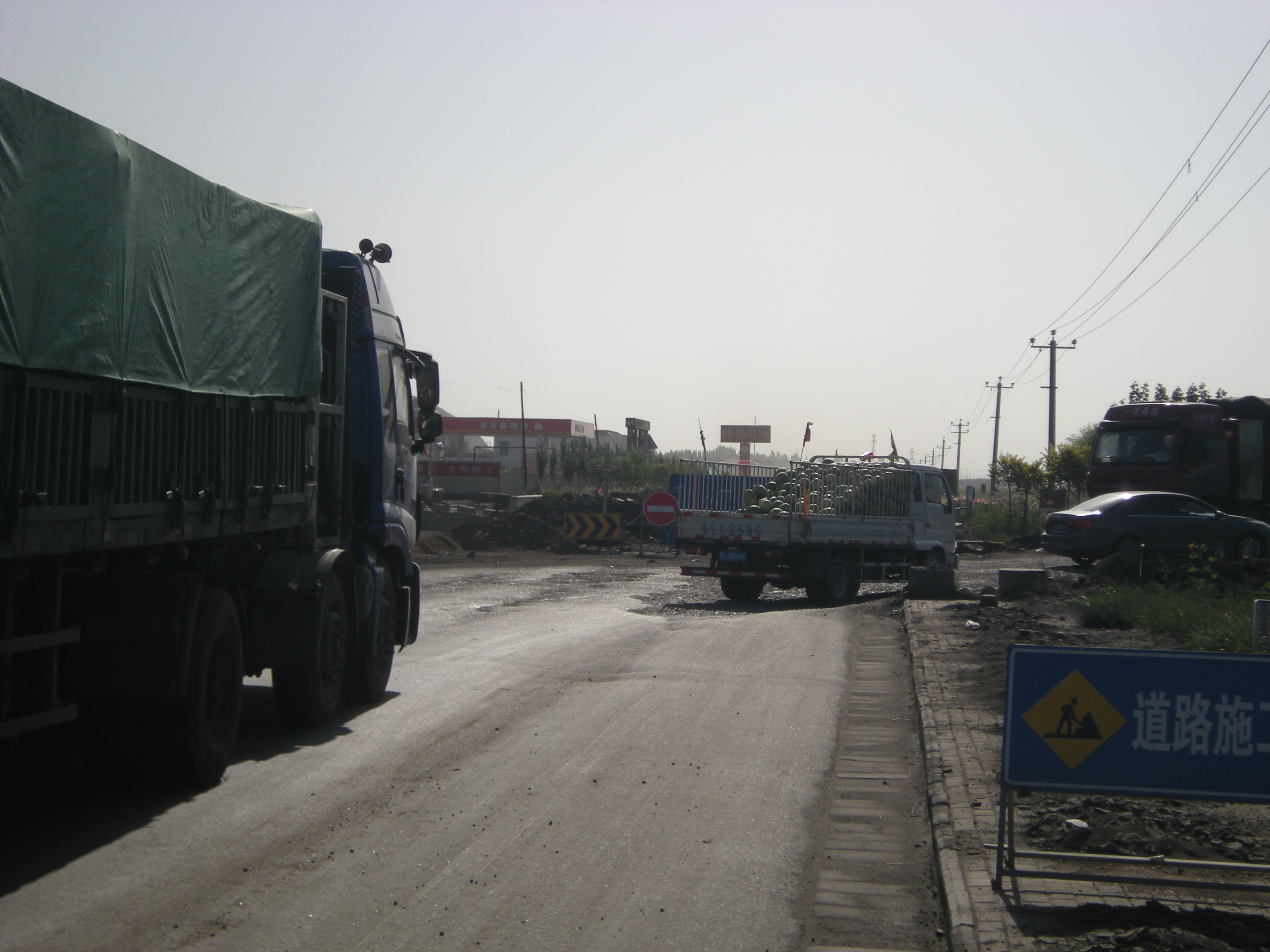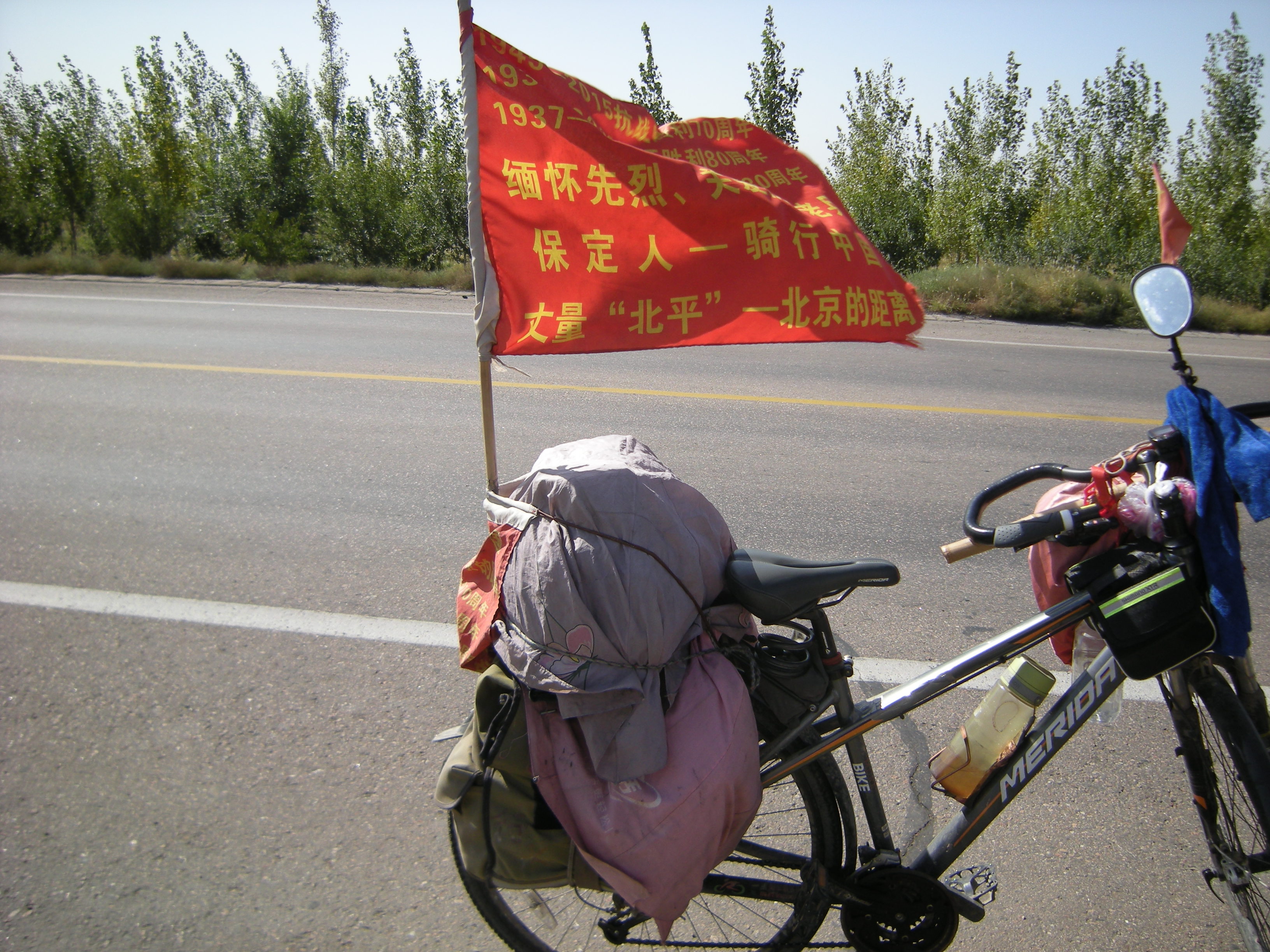 Ondanks de trubbels van gisteren hebben we alle twee toch goed geslapen. We plannen een korte etappe omdat in een keer door naar Baotou toch wat te ver is. Opnieuw beleven we een saaie vlakke etappe met veel vrachtauto’s die steenkool vervoeren, met veel wilgenbomen in de bermen en veel mais en zonnebloemen op de akkers. We passeren weinig dorpjes. Hier en daar op parkeerplaatsen worden er in tentjes meloenen en pompoenen verkocht. Het meest opmerkelijke van de dag is misschien wel dat we in Urad Qianqi meteen, zij het met behulp van een meisje op een brommer die ons voorrijdt, een hotel kunnen vinden waar we welkom zijn. Eerst stopt ze echter bij zo’n vies oud gebouw dat we haar vragen of ze het wel zeker weet dat dat een hotel is. Ze roept even wat naar binnen en dan komt er een man naar buiten die naar de overkant van de straat wijst. Dat ziet er inderdaad meer uit als een hotel. Met het woordenboekje in de hand vragen we of ze een kamer vrij hebben. Oh jawel hoor! We laten ze onze paspoorten zien maar daar bladeren ze maar een beetje oppervlakkig doorheen en geven ze weer terug. Er wordt hier niets gekopieerd of overgetypt. We moeten 200 Yuan betalen en krijgen nog een depositobriefje van 98 Yuan en een pasje voor de kamer voor terug. De fietsen gaan mee de lift in naar boven. Mijn fiets blijft op de gang, Wytze stalt hem op de kamer. Zo vlot heeft het administratieve gedeelte van een hotelovernachting nog niet geduurd. Zijn we hier misschien illegaal? We nemen even de tijd om het vervolg van de route te bespreken. Wytze is de drukke 110 beu en stelt voor om na Baotou niet naar Hohhot te fietsen maar om over een gele weg naar het symbool op de kaart te fietsten dat aangeeft dat daar nog restanten van de Great Wall staan. Ik ben de 110 ook wel wat beu en kan me wel vinden in zijn voorstel maar geef gezien het voorval van gisteren wel aan dat die gele weg misschien wel niet overal verhard is. Bovendien is het maar de vraag of de muur direct aan de route ligt. Misschien moeten we er wel met een excursie of onder begeleiding van een gids naar toe. We hakken de knoop door en gaan het avontuur van de gele weg aan. Het is ook nog wel een paar honderd kilometer fietsen voordat we in de buurt van die muur zullen zijn. Op zoek naar eten komen we ook vandaag weer uit bij een Chinees fastfood restaurant. Die zijn er hier in deze regio veel meer dan in het westen. Het is nog ongeveer 800 km tot aan Peking. Vandaag heb ik geen foto’s gemaakt en dat zegt genoeg over de beleving van deze dag.