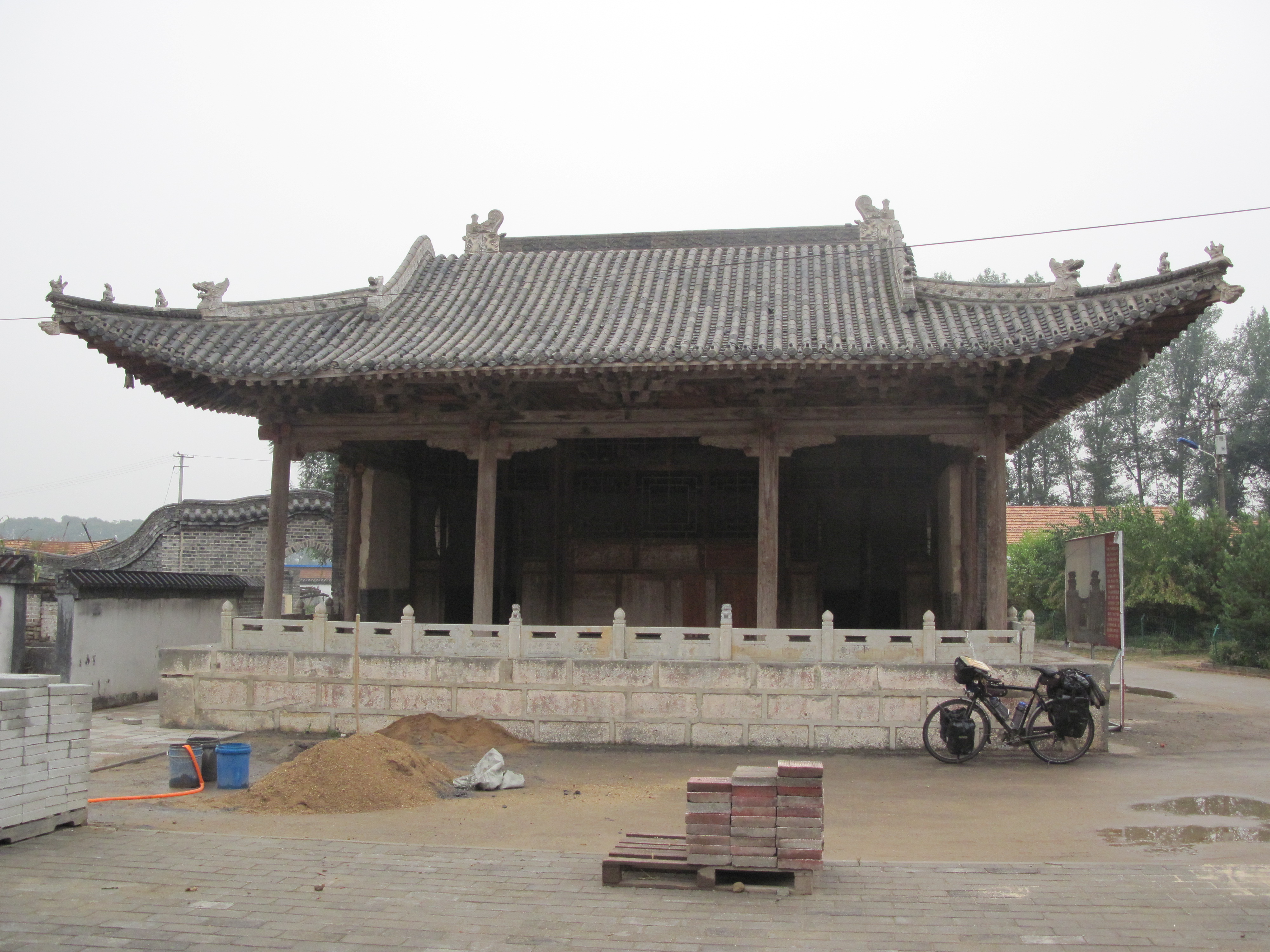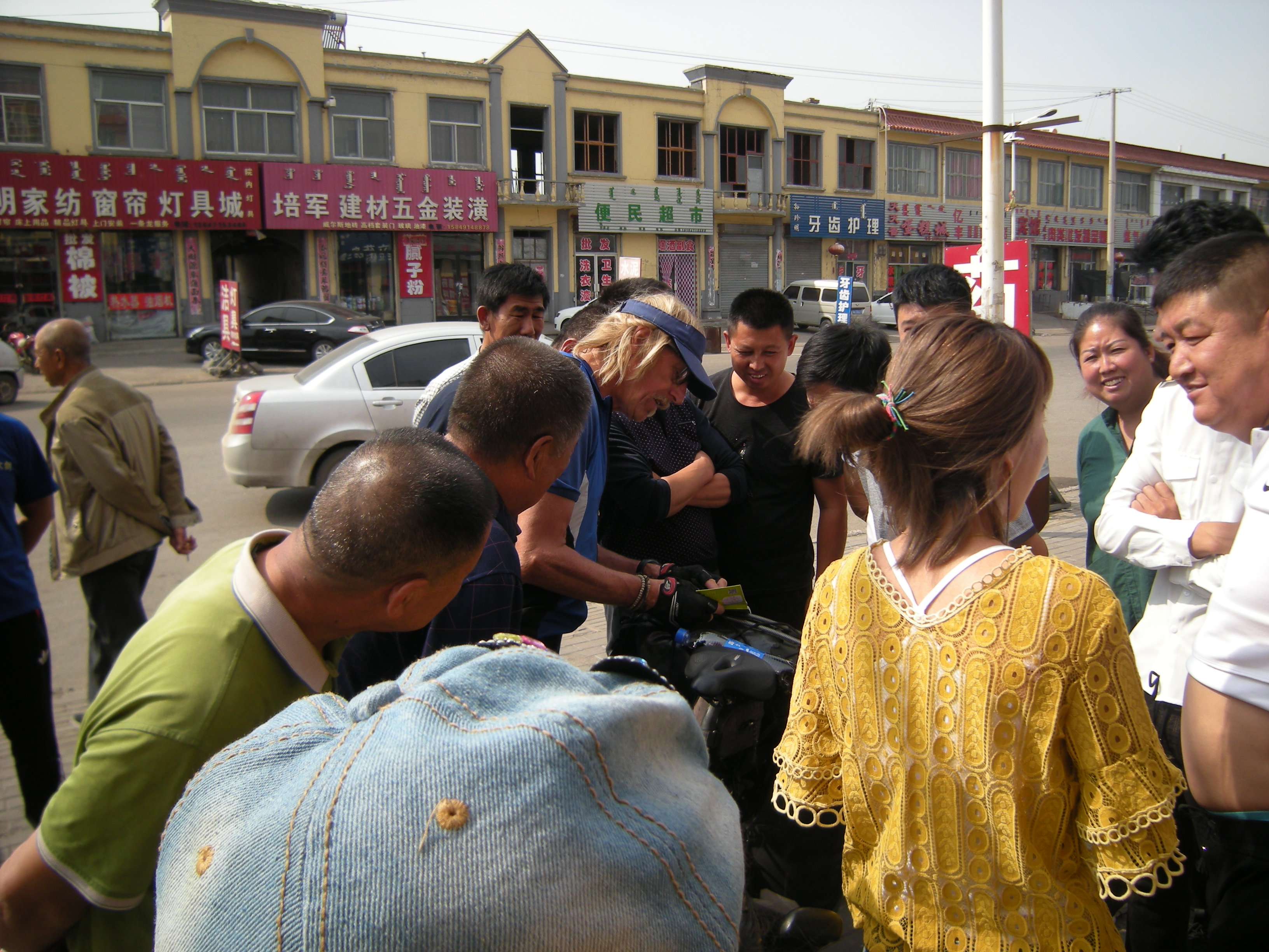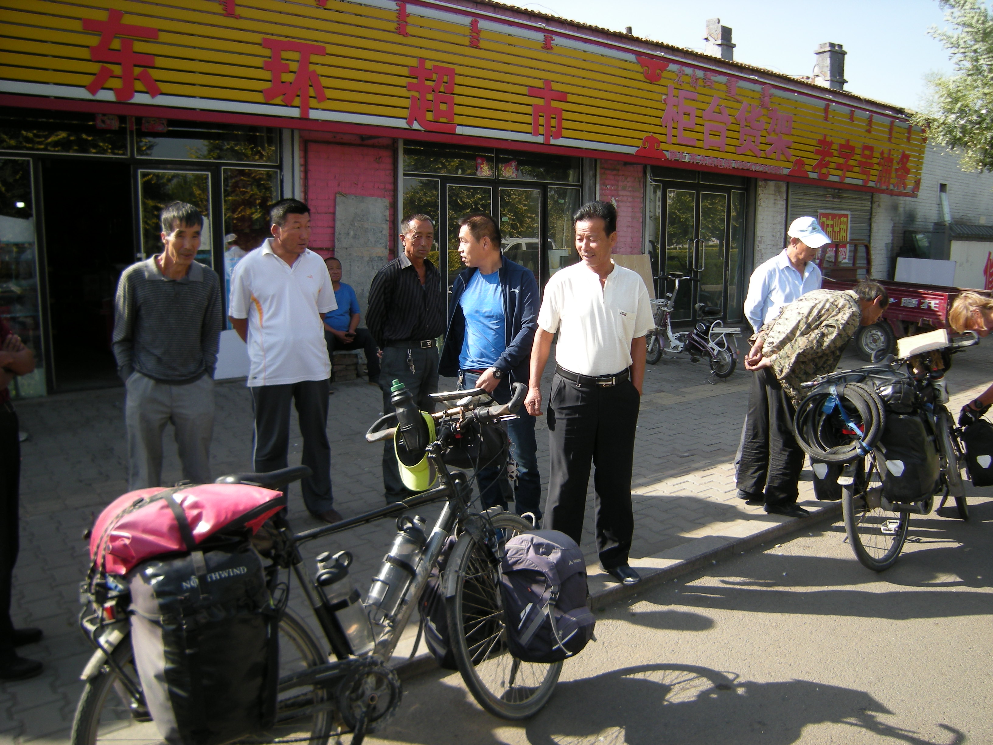 We laten het hotel deze morgen al vroeg weer alleen achter. Er is geen ontbijt inbegrepen en we hebben ook niets meer bij ons. Met slechts een kopje Nescafe op fietsen we Shahukou uit. Het eerste winkeltje is pas in het ‘kleine’ Youyu en het is er heel vies. We eten er wat verpakte cakes en drinken er een flesje sinas bij. Het is opnieuw een bewolkte dag met op de weg weer veel vrachtverkeer. We klimmen nog steeds. Het mooiste moment van de dag ligt bij het dorpje Mayinga waar we op een bruin bord lezen dat er een toren te zien zou zijn. Wytze heeft niet zo’n zin in om er naar toe te fietsen maar ik eigenlijk wel. Met het argument dat we maar een korte etappe gepland hebben en we dus tijd genoeg hebben weet ik hem toch om te praten en nemen we de afslag die het bruine bord aangeeft. We komen bij een klein dorpje waar een grote parkeerplaats is aangelegd. Er staat een groot kunstwerk bij maar dat kan de attractie toch niet zijn dus fietsen we nog een stukje verder en komen dan in het dorpje uit waar veel vooral oudere bewoners langs de straat met elkaar aan het buurten zijn. De gesprekken verstommen en we worden door iedereen aangestaard alsof we van Mars komen. We vragen waar de toren staat, maar dan gaan ze alleen maar met meer verbazing naar ons kijken. We wijzen in het rode woordenboekje het woord ‘toren‘ aan. Toren? Er is hier helemaal geen toren, maar wel een oude tempel. En dan wijzen ze allemaal naar de weg die we in moeten. Met het hele dorp achter ons aan fietsen we de aangegeven weg in. Een van de bewoners werpt zich op als woordvoerder en leidt ons even later door het nog in aanbouw zijnde museum. Er staan grote poppen van de boze mannen van Boeddha en in de gevels zijn oude gedenkstenen met Chinese teksten ingemetseld die er heel oud en origineel uit zien maar die we helaas niet kunnen lezen. Het enthousiasme van de dorpsbewoners maakt er een mooie ontmoeting van. In het ‘grote’ Youyu eten we nog een broodje en gaan wede 109 op die we tot Beijing zullen gaan volgen. Het weer is ondertussen aardig opgeklaard en rond 2 uur zijn we al in Zuoyu. We overleggen even over doorfietsen naar Datong of nu al stoppen. We kiezen voor het laatste. We willen namelijk toch wel wat tijd nemen om een bezoek te brengen aan de grotten van Yungang en als we doorfietsen hebben we daar te weinig tijd voor. Het hotel dat we in Zuoyu uitgekozen hebben blijkt gesloten te zijn. We vragen bij een kraampje met wat jonge mensen of ze een alternatief weten. Ze gaan allemaal aan de slag met hun mobieltjes en dan blijkt dat er een hotel moet zijn bij de afslag naar het stadje. We zijn er dus al een keer langs gereden en moeten nu weer terug. Het is een groot luxe hotel, in een wijk vol met leegstaande flats, dat helaas ook nog heel ver van het centrum af ligt. Na het inkwartieren moeten we dus weer op de fiets terug naar het centrum en op zoek naar een restaurant. Na opnieuw het hele centrum doorgefietst te zijn vinden we er uiteindelijk een waar we uit een vitrine kunnen kiezen wat we willen eten. Smaakt goed!