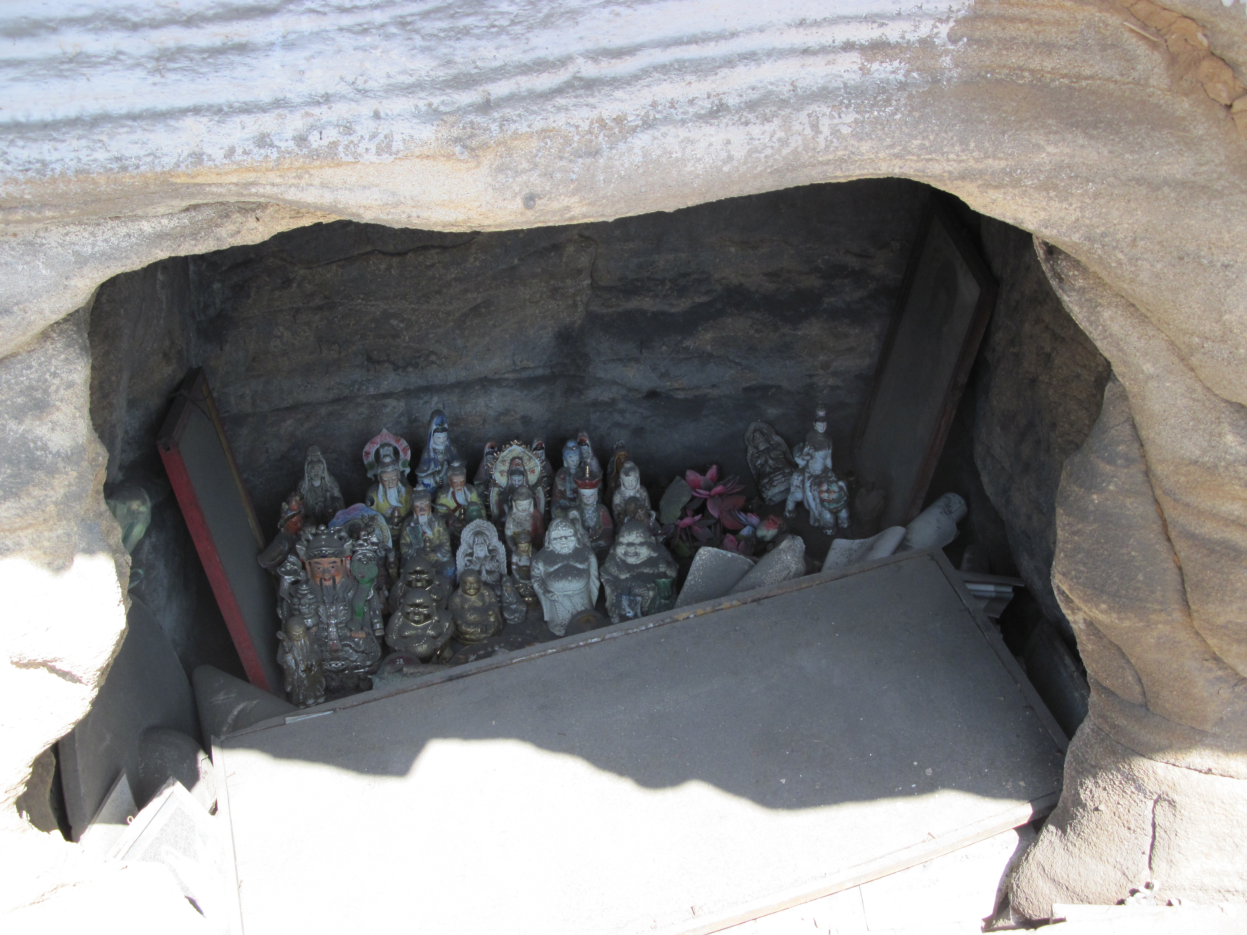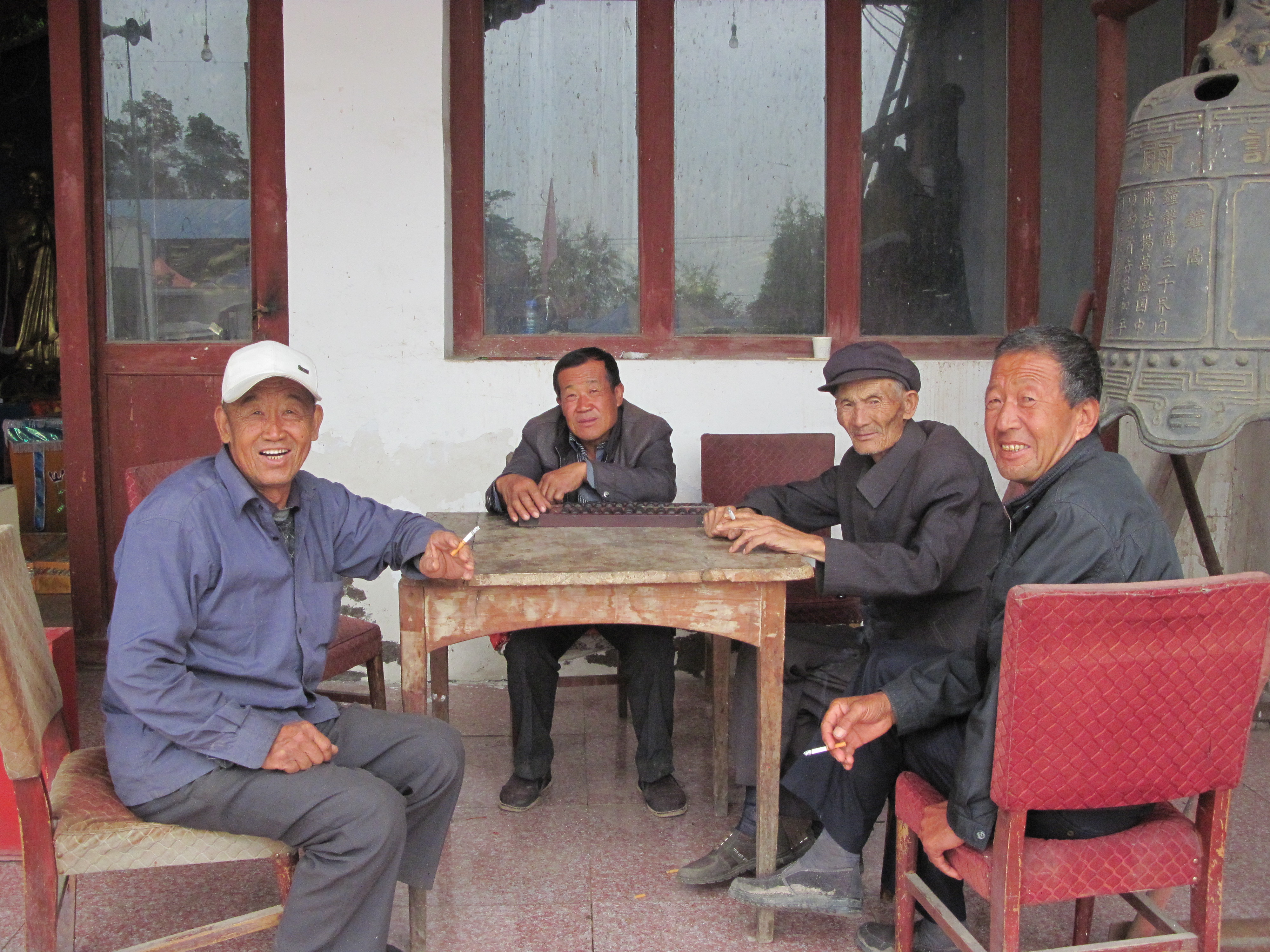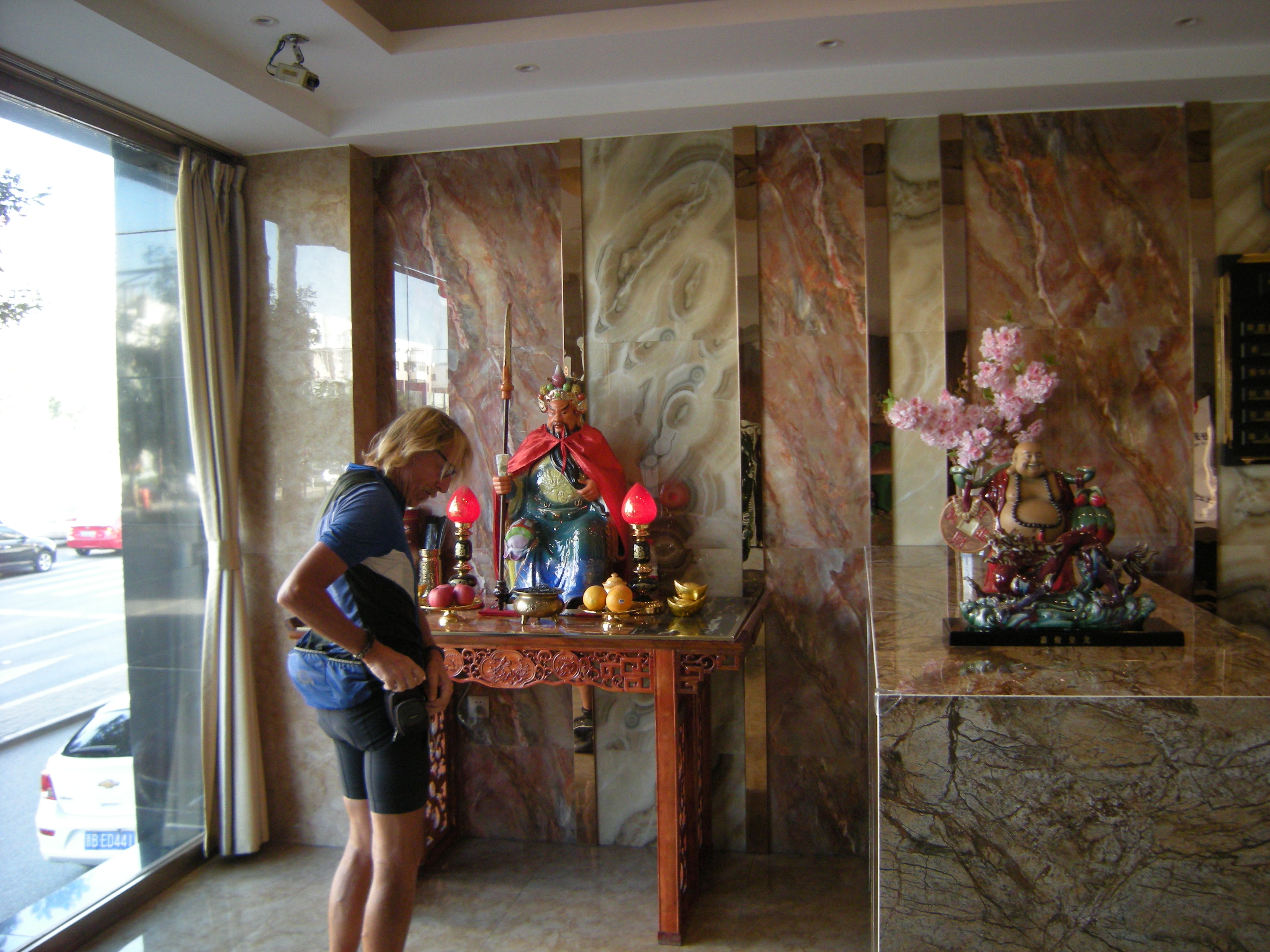 We laten het hotel deze morgen al vroeg weer alleen achter. Er is geen ontbijt inbegrepen en we hebben ook niets meer bij ons. Met slechts een kopje Nescafe op fietsen we Shahukou uit. Het eerste winkeltje is pas in het ‘kleine’ Youyu en het is er heel vies. We eten er wat verpakte cakes en drinken er een flesje sinas bij. Het is opnieuw een bewolkte dag met op de weg weer veel vrachtverkeer. We klimmen nog steeds. Het mooiste moment van de dag ligt bij het dorpje Mayinga waar we op een bruin bord lezen dat er een toren te zien zou zijn. Wytze heeft niet zo’n zin in om er naar toe te fietsen maar ik eigenlijk wel. Met het argument dat we maar een korte etappe gepland hebben en we dus tijd genoeg hebben weet ik hem toch om te praten en nemen we de afslag die het bruine bord aangeeft. We komen bij een klein dorpje waar een grote parkeerplaats is aangelegd. Er staat een groot kunstwerk bij maar dat kan de attractie toch niet zijn dus fietsen we nog een stukje verder en komen dan in het dorpje uit waar veel vooral oudere bewoners langs de straat met elkaar aan het buurten zijn. De gesprekken verstommen en we worden door iedereen aangestaard alsof we van Mars komen. We vragen waar de toren staat, maar dan gaan ze alleen maar met meer verbazing naar ons kijken. We wijzen in het rode woordenboekje het woord ‘toren‘ aan. Toren? Er is hier helemaal geen toren, maar wel een oude tempel. En dan wijzen ze allemaal naar de weg die we in moeten. Met het hele dorp achter ons aan fietsen we de aangegeven weg in. Een van de bewoners werpt zich op als woordvoerder en leidt ons even later door het nog in aanbouw zijnde museum. Er staan grote poppen van de boze mannen van Boeddha en in de gevels zijn oude gedenkstenen met Chinese teksten ingemetseld die er heel oud en origineel uit zien maar die we helaas niet kunnen lezen. Het enthousiasme van de dorpsbewoners maakt er een mooie ontmoeting van. In het ‘grote’ Youyu eten we nog een broodje en gaan wede 109 op die we tot Beijing zullen gaan volgen. Het weer is ondertussen aardig opgeklaard en rond 2 uur zijn we al in Zuoyu. We overleggen even over doorfietsen naar Datong of nu al stoppen. We kiezen voor het laatste. We willen namelijk toch wel wat tijd nemen om een bezoek te brengen aan de grotten van Yungang en als we doorfietsen hebben we daar te weinig tijd voor. Het hotel dat we in Zuoyu uitgekozen hebben blijkt gesloten te zijn. We vragen bij een kraampje met wat jonge mensen of ze een alternatief weten. Ze gaan allemaal aan de slag met hun mobieltjes en dan blijkt dat er een hotel moet zijn bij de afslag naar het stadje. We zijn er dus al een keer langs gereden en moeten nu weer terug. Het is een groot luxe hotel, in een wijk vol met leegstaande flats, dat helaas ook nog heel ver van het centrum af ligt. Na het inkwartieren moeten we dus weer op de fiets terug naar het centrum en op zoek naar een restaurant. Na opnieuw het hele centrum doorgefietst te zijn vinden we er uiteindelijk een waar we uit een vitrine kunnen kiezen wat we willen eten. Smaakt goed!