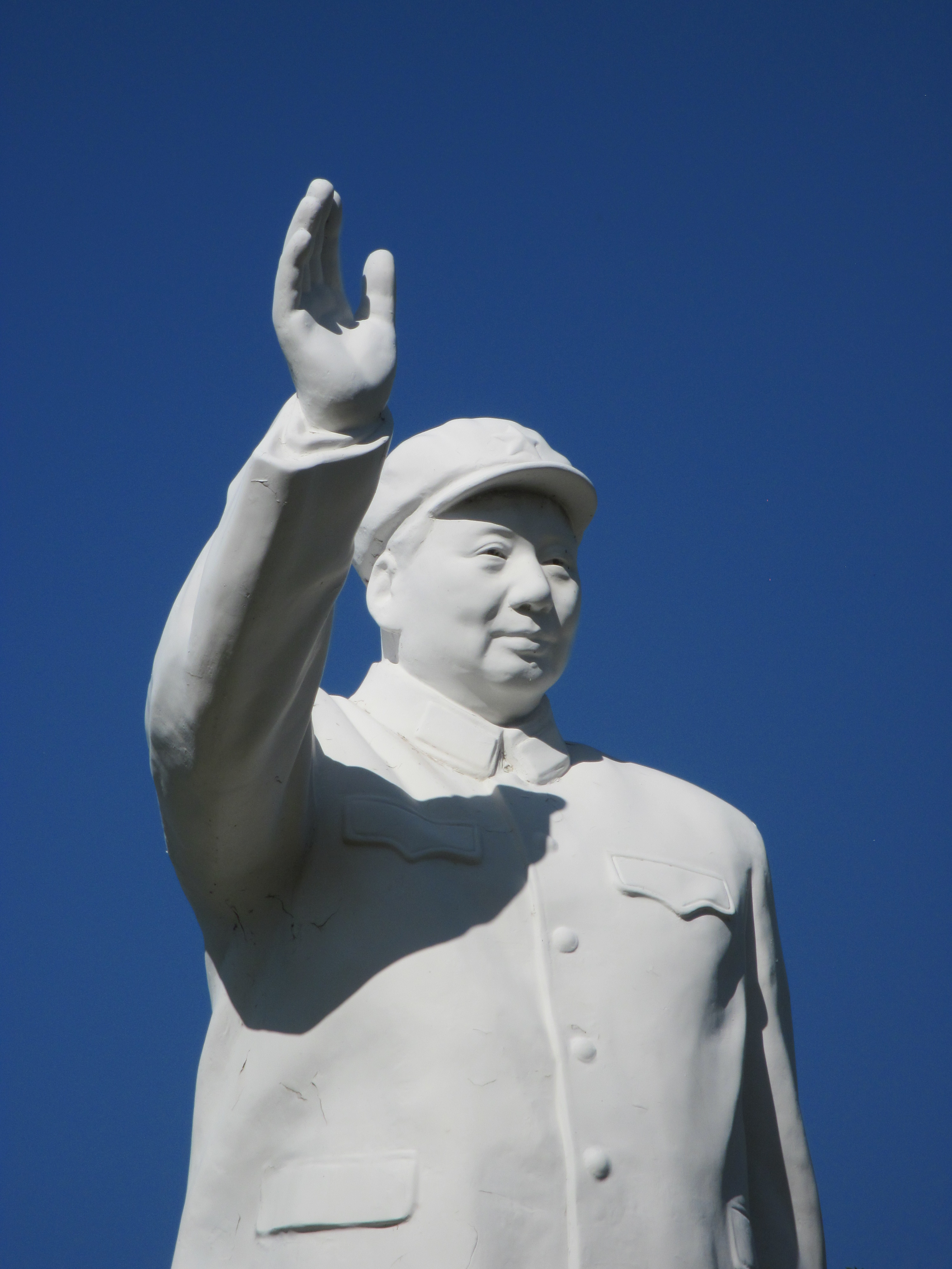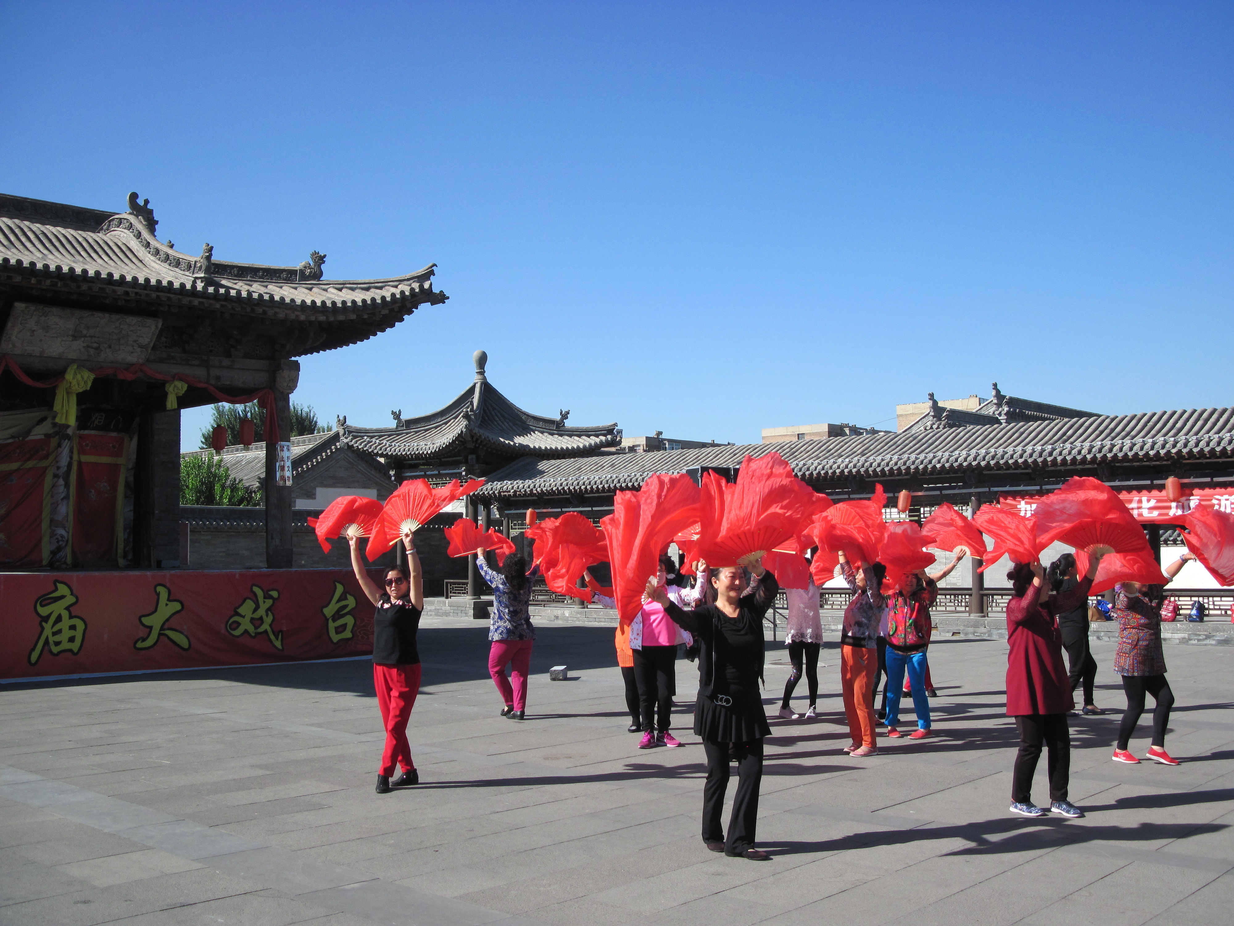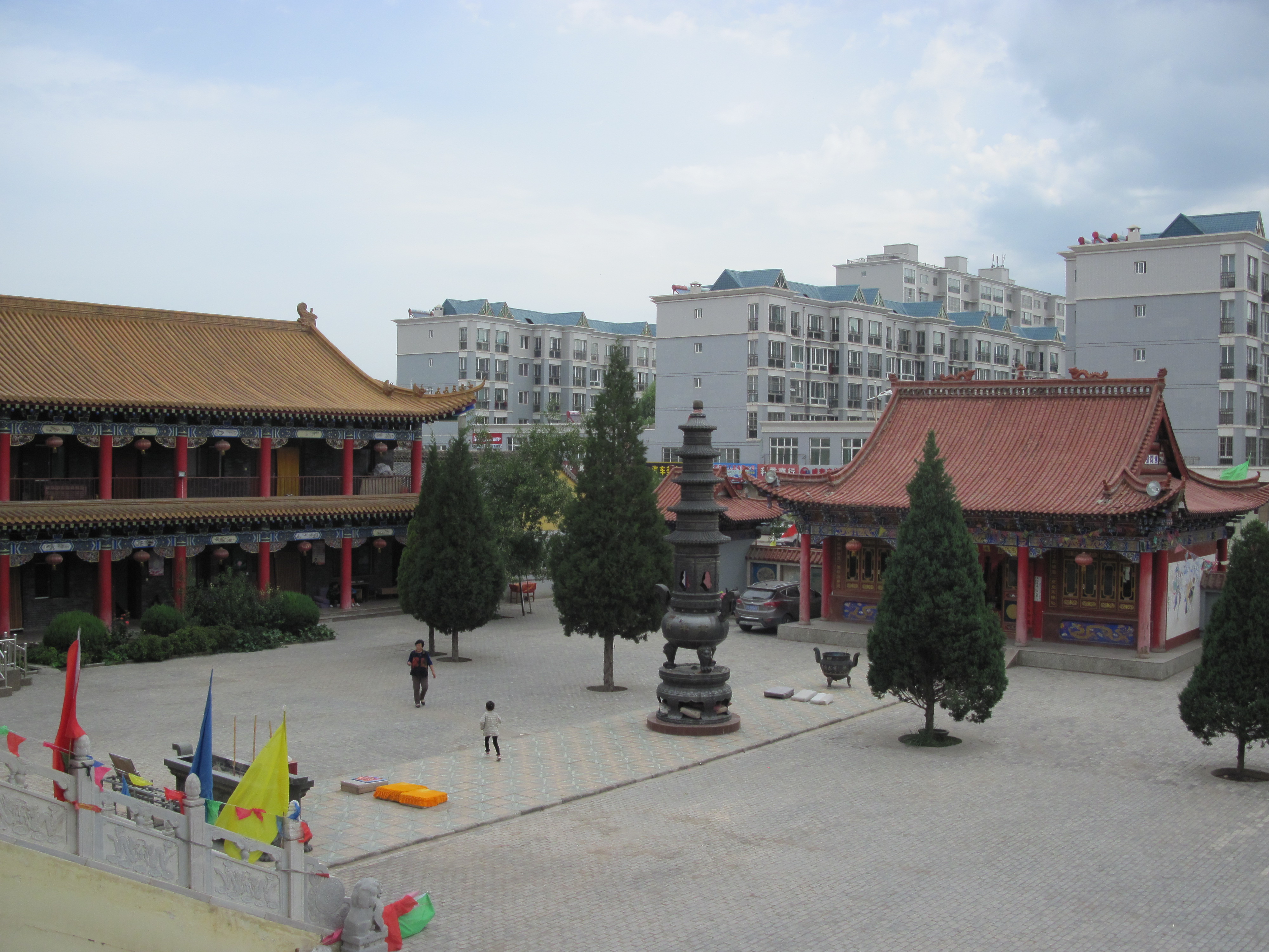 Ons ontbijt hebben we gisterenavond al in een buurtwinkeltje gekocht. We starten de dag dus op de kamer met koffie en een fruitbread. Nog even pinnen en dan gaan we opzoek naar een oude wijk van Datong waar we nog een oude tempel zouden moeten kunnen vinden. De oude wijk is helemaal omgeven door een hoge stadsmuur. Via een poort in de muur komen we waar we willen zijn. Langs de weg naar de oude tempel staan kleine monumentale huisjes die opgetrokken zijn uit donkergrijze bakstenen. Tegenover de tempel wordt op een plein weer flink gedanst. Daarna gaan we naar de tempel waar we op vertoon van onze ID-kaarten vanwege onze leeftijd gratis in mogen. Het bezoek aan de mooie tempel levert ons niets verrassends op dus is ons verblijf maar kort van duur. Voor we Datong definitief uit fietsen willen we ook nog een bezoek brengen aan een standbeeld van Mao dat in een park langs onze route naar de 109 zou moeten staan. We moeten er nog wel naar vragen maar vinden het daarna wel. De grote kleine leider staat er maar wat verwaarloosd bij. Er ligt nog wel een bosje plastic bloemen aan zijn voeten maar er groeit ook al wel heel veel onkruid rond zijn sokkel. Met veel moeite komen we daarna uiteindelijk op de 109 uit. De GPS stuurt ons namelijk over niet meer bestaande wegen door een groot uitbreidingsplan van Datong waardoor we een beetje op het gevoel de goede kant op hopen te fietsen. Door in-en uit- te zoomen op de GPS kan ik dat wel een beetje in de gaten houden maar Wytze gunt me er de tijd niet voor en fietst maar door. Mijn aanwijzingen van de GPS om op een kruising rechtsaf te gaan gelooft hij niet en dus vraagt hij het liever bij een benzinestation. Uit de aanwijzingen van de man begrijpt hij dat we pas bij de volgende kruising rechtsaf moeten. Hoewel ik dat niet geloof fiets ik dan toch maar achter hem aan tot we inderdaad blijkt dat we op een doodlopende weg aan het fietsen zijn. Al klunend en over ’n vangrail klimmend kunnen we toch nog terug komen op de weg die mijn GPS eerder aangegeven heeft. Het blijft me frustreren dat Wytze mijn aanwijzingen maar niet serieus kan nemen. Ook vandaag fietsen we weer langs mooie oude dorpjes door een mooi landschap. Langs de weg ook wel weer veel goed onderhouden bermperken met wilgjes en heesters die overal met pompen en slangen voorzien worden van voldoende water. Om half 5 zijn we in Yangyuan waar het eerste hotel dat we aandoen ons niet wil hebben, het tweede en derde wegens een verbouwing dicht zijn en we uiteindelijk terecht kunnen in het vierde. Maar ook daar loopt niet alles vanwege wat communicatieproblemen niet helemaal vlekkeloos. Er ontstaat een misverstand waardoor we op een gegeven moment twee deurpasjes krijgen voor 2 kamers. Het duurt even voor we dat we dat weer rechtgezet hebben. Eten doen we ’s avonds bij een fastfood Chinees met frites, rijst met vlees en een kipburger. Op de weg terug naar het hotel scoren we nog een ijsje en een lekker blikje bier.