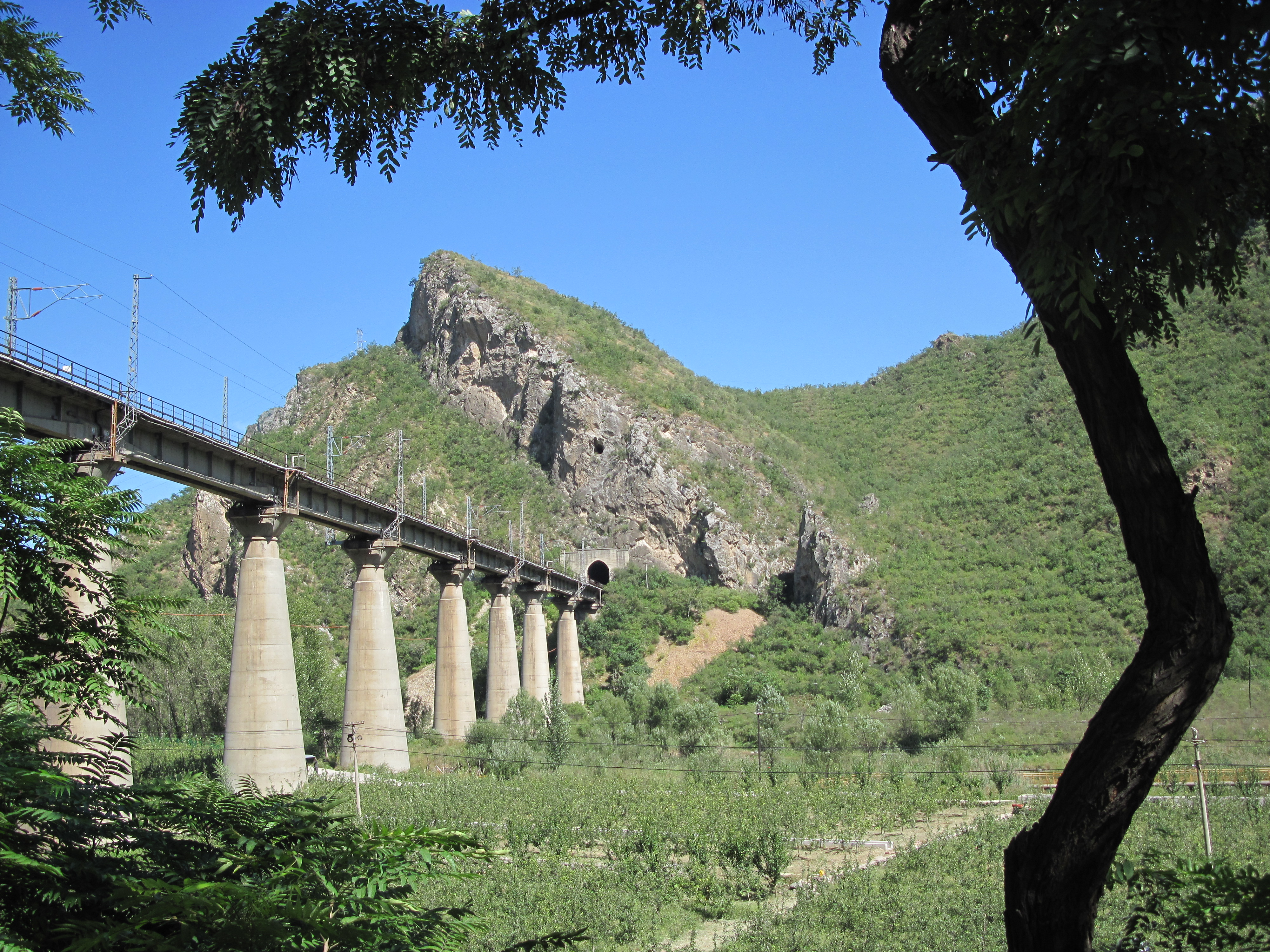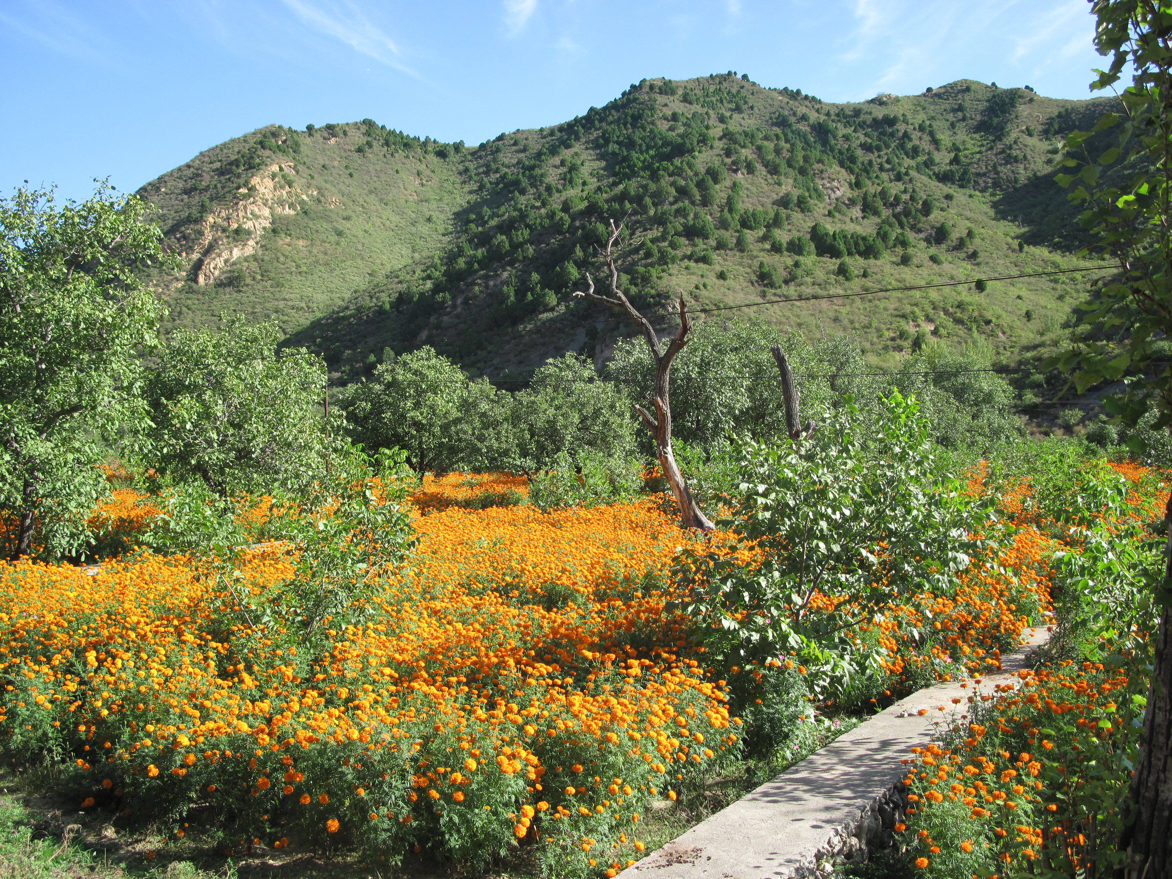 Ik heb niet goed geslapen. Ben vaak wakker geweest en om 5 uur begonnen er al weer mensen in de buurt met hun dagelijkse bezigheden. Er was zelfs om 6 uur al geknal van vuurwerk. Als ontbijt eten we op de kamer onze cakebroodjes op en drinken we een kop Nescafe. Als we willen gaan vertrekken komt de gastvrouw ons uitnodigen voor het ontbijt. Dat is blijkbaar inclusief. Oma maakt ook al eetgebaren naar ons maar omdat we al gegeten hebben bedanken we er toch maar voor. Hopelijk hebben ze er niet al te veel moeite in gestoken. Ik wil mijn wat slappe achterband nog wat bijpompen en zie dan dat er scheurtjes in de zijwand van de band zitten. Geen wonder dat ik gisteren tijdens het afdalen voelde dat mijn achterwiel wat wiebelde. Ik durf de band niet harder op te pompen omdat ik bang ben dat de binnenband er dan uit zal puilen. Ik heb ook geen reserve binnenband meer dus de kapotte zal ik vanavond eerst maar eens gaan repareren. Net buiten het dorp passeren we een boomgaard vol met oranje afrikaantjes. Mooi plaatje! Van enkele aardige dames krijgen we een paar smakelijke koekjes. Het blijken later mooncakes te zijn die alleen in September en Oktober gegeten worden wat weer te maken heeft met de midherfstfestivals. De omgeving is weer prachtig. De hele dag rijden we weer door de bergen. Als ik in een dorpje een stenen picknicktafel zie stel ik voor om er even wat te gaan drinken. Hoewel Wytze duidelijk geen trek heeft in een stop fiets ik er toch naar toe en drink er een colaatje en ook nog een broodje. Wytze zegt niets, eet niets en het is wel duidelijk dat hij door wil. Er zit ‘m weer iets dwars maar ik kan er niet achter komen wat dat dan is. Als we verder fietsen blijft hij ver achter mij aan fietsen en komt pas na een paar dorpjes weer voorop fietsen. Hoewel er van alles te zien is geeft hij zich geen tijd meer om er van te genieten en foto’s te maken. Er lopen veel spoorlijnen in tunnels dwars door de bergen heen. Wytze fietst gewoon door, maar ik vind het prachtig en neem er alle tijd voor. Even buiten een dorp, als we de winkeltjes voor bij zijn, is hij gestopt en stelt hij voor om even een ‘happie’ te eten. Omdat ik geen drinken meer heb en op m’n GPS zie dat we over 2 km weer in een dorpje zullen zijn, zeg ik dat we beter nog een stukje door kunnen fietsen en doe dat dan ook meteen. Wytze volgt wel maar laat wel heel bewust een groot vallen. Als ik vlak voor het dorpje bij een oude hangbrug over de rivier kom stop ik even om te gaan kijken en foto’s te maken. Wytze stopt even later ook maar komt niet naar de brug maar blijft bij zijn fiets staan. Als ik weer terug loop naar mijn fiets en verder wil fietsen gaat hij met zijn brood en blikje drinken toch naar de rivier om daar te gaan lunchen. Ik begrijp niet waarom hij niet even kan wachten tot we in het dorpje zijn zodat ik ook wat te drinken kan kopen. Het kan niet ver meer zijn want we zijn zojuist verkeersborden gepasseerd waarop de verkrijgbaarheid van koffie aangekondigd werd en die moet hij toch ook gezien hebben. Ik heb er nu genoeg van en zeg dat ik toch door rij naar het dorp om wat te drinken en te eten te kopen en fiets zonder te wachten aan. Om de hoek kom ik al in het dorpje en parkeer ik mijn fiets dichtbij de weg zodat Wytze kan zien waar ik gestopt ben. In het winkeltje koop ik een flesje cola, fruit brood en 2 bananen. Als ik aan het afrekenen ben komt Wytze ook binnen. Hij zegt niets maar koopt toch ook nog wat etenswaar. Langs de winkel is een bushalte met een bankje dus loop ik daar naar toe. Maar dat vindt Wytze natuurlijk geen goede plek. Hij wil aan de overkant op een pleintje gaan zitten en fietst er meteen naar toe. Het pleintje ligt echter flink wat hoger dan de weg dus kun je er zonder de fiets op te tillen niet komen. Ik laat mijn fiets bij de bushalte staan en wil naar de overkant lopen maar dan komt Wytze weer terug gefietst en gaat stilzwijgend toch maar op het bankje van de bushalte zitten. De stilte wordt enigszins doorbroken door belangstellende dorpsbewoners maar die druipen snel af als wij wat ongemakkelijk op ze reageren. In stilte eten we de lunch op. Het grauw-grijze hoofd van Wytze geeft aan dat er een grote irritatie is maar ik durf ‘m toch niet te vragen wat er al een hele tijd zo dwars zit. Als we verder fietsen dwing ik hem een beetje de kop op maar hij gaat dan zo langzaam fietsen dat ik hem toch maar voorbij fiets. Hij laat dan weer een heel groot gat vallen. Op een parkeerplaats stop ik om een foto te maken. Er is daar ook een grote groep fietsers bezig om een groepsfoto te maken. Ze willen dat ik ook op de groepsfoto kom te staan en dus meng ik me in de groep. Op het moment dat Wytze er ook aankomt hebben we veel lol en wordt er geroepen dat hij ook op de foto moet, maar hij keurt ons geen blik waardig en doet dan net of hij weer doorfietst. Hoewel de groep nog van alles van me wil weten moet ik ze overhaast verlaten om achter Wytze aan te gaan. We trappen nu goed door en mede door de mooie omgeving lijkt het dat het ijs een beetje gedooid is. Op Maps.me kijk ik nog even naar de route en dan blijkt dat we nog een heel eind te gaan hebben. Als we bij een splitsing twijfelen worden we ingehaald door een van fietsers van de fotogroep. Hij vraagt waar we naar toe willen en biedt aan om met ons mee te fietsen. Vanaf de afslag is het dan nog 10 km naar Mentougou. In een hoog tempo fietsen we ernaar toe. Op maps.me zien we dat er een super 8 hotel is en de man fietst ons voor. Terwijl wij bij de receptie een kamer proberen te huren past hij buiten op de fietsen. Helaas we mogen er weer eens niet in. Hij belt een ander hotel en brengt ons er even later naar toe. Helaas dit hotel is ‘vol’ . Hij gaat weer bellen maar ook het derde hotel zit ‘vol’. Ik vraag aan een man op straat of hij nog een hotel weet. De communicatie loopt nu even met onze ‘gids’ en die gaat opnieuw bellen. Het lijkt er op dat we beet hebben. We moeten weer helemaal terug naar het begin van de stad en 